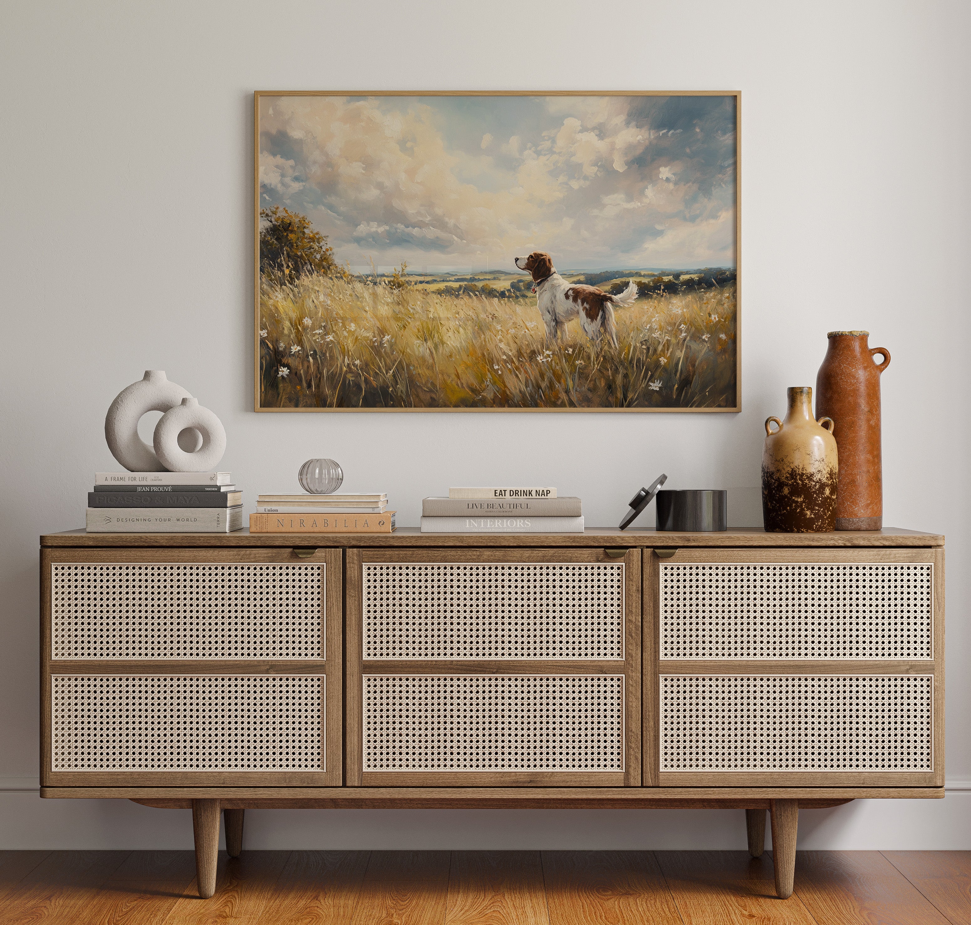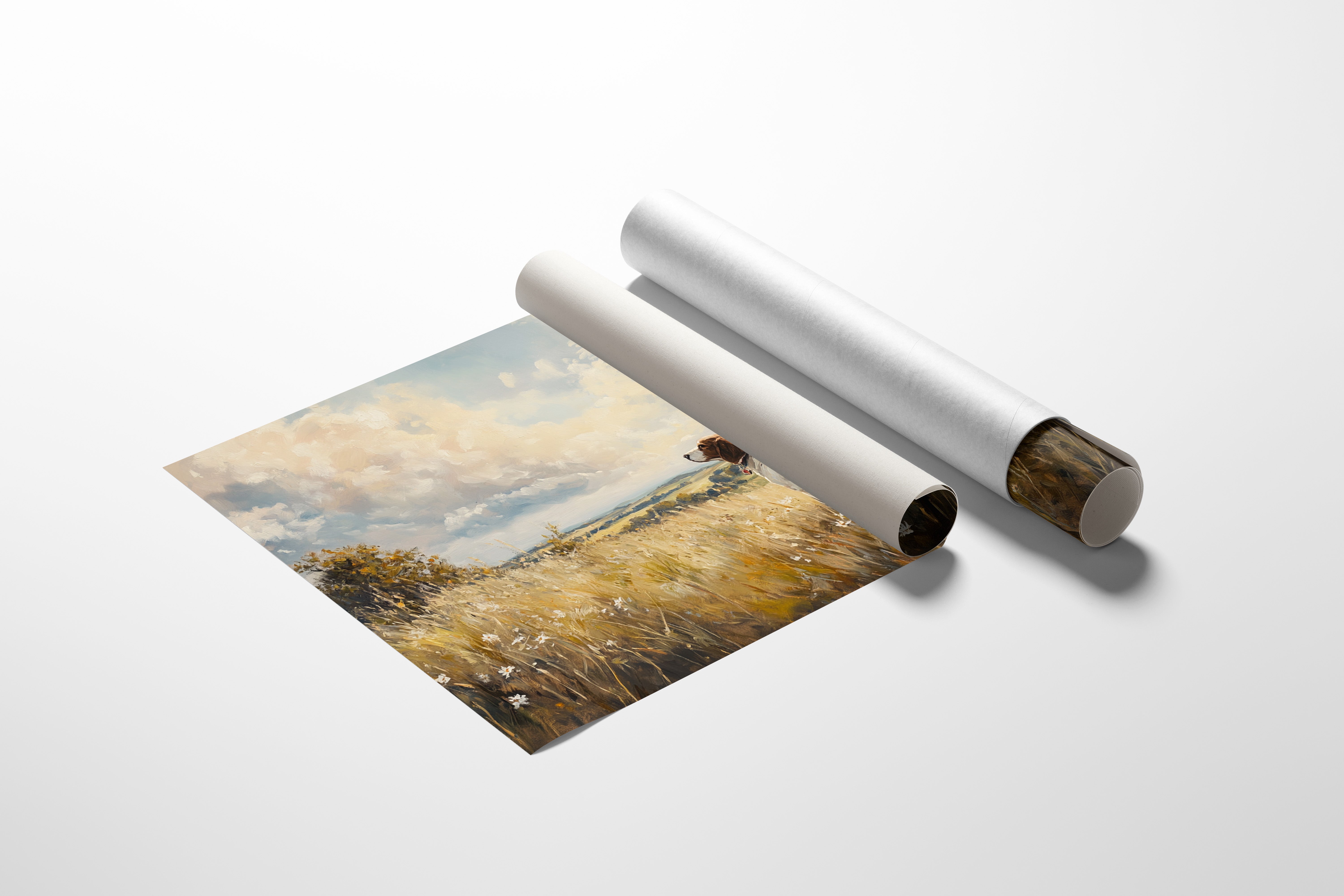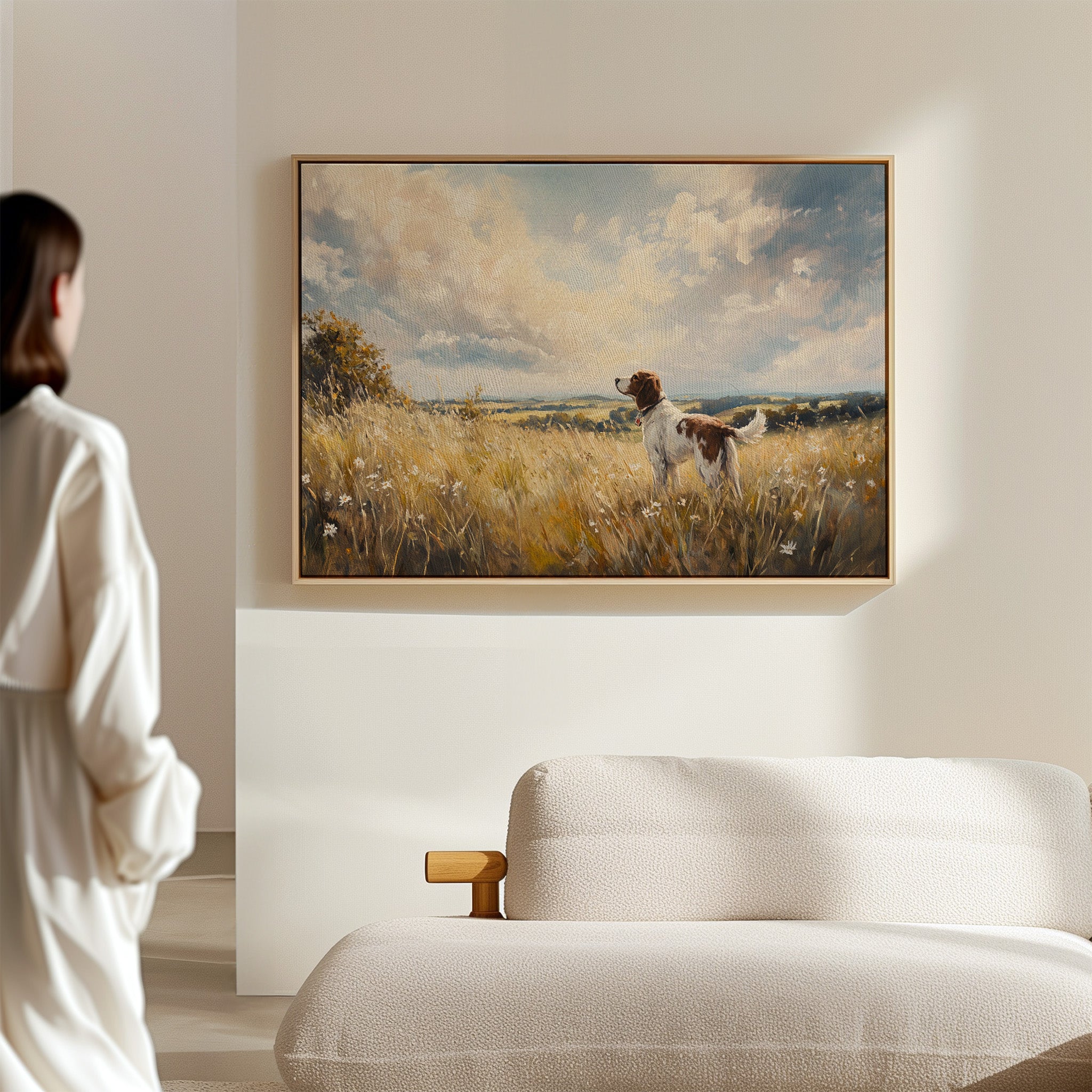 A gentle breeze carries stories across golden meadows where a faithful hunting dog stands alert, scanning distant horizons. Daisies dance among amber wheat stalks, creating a tapestry of white and gold beneath billowing clouds painted in soft peach and azure hues. The Brittany Spaniel's white and russet coat catches the warm light, its noble profile a testament to generations of companionship in these rolling countryside vistas. This pastoral scene brings the timeless bond between human and hound into the modern home, offering a window into simpler moments of pure joy and purpose.