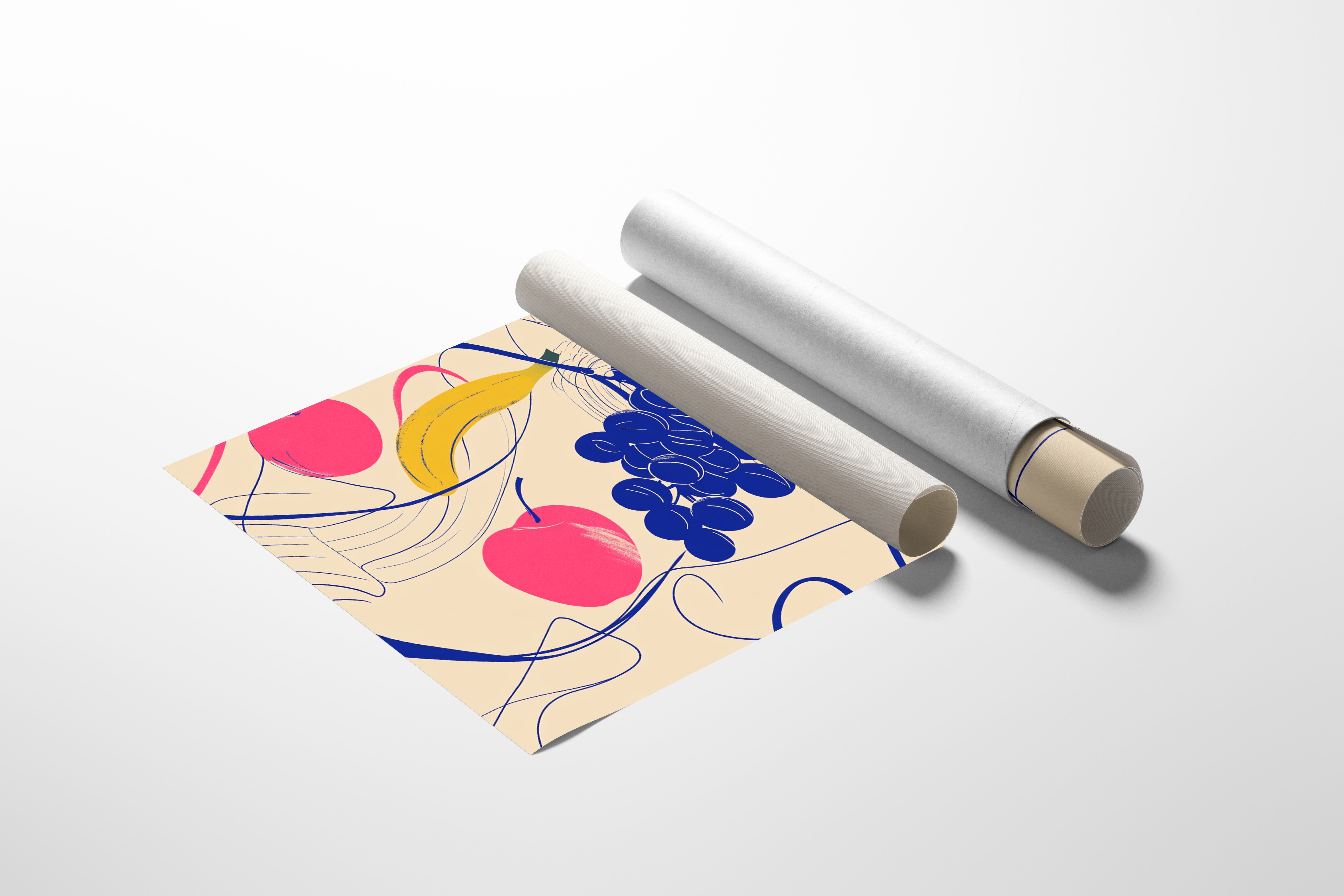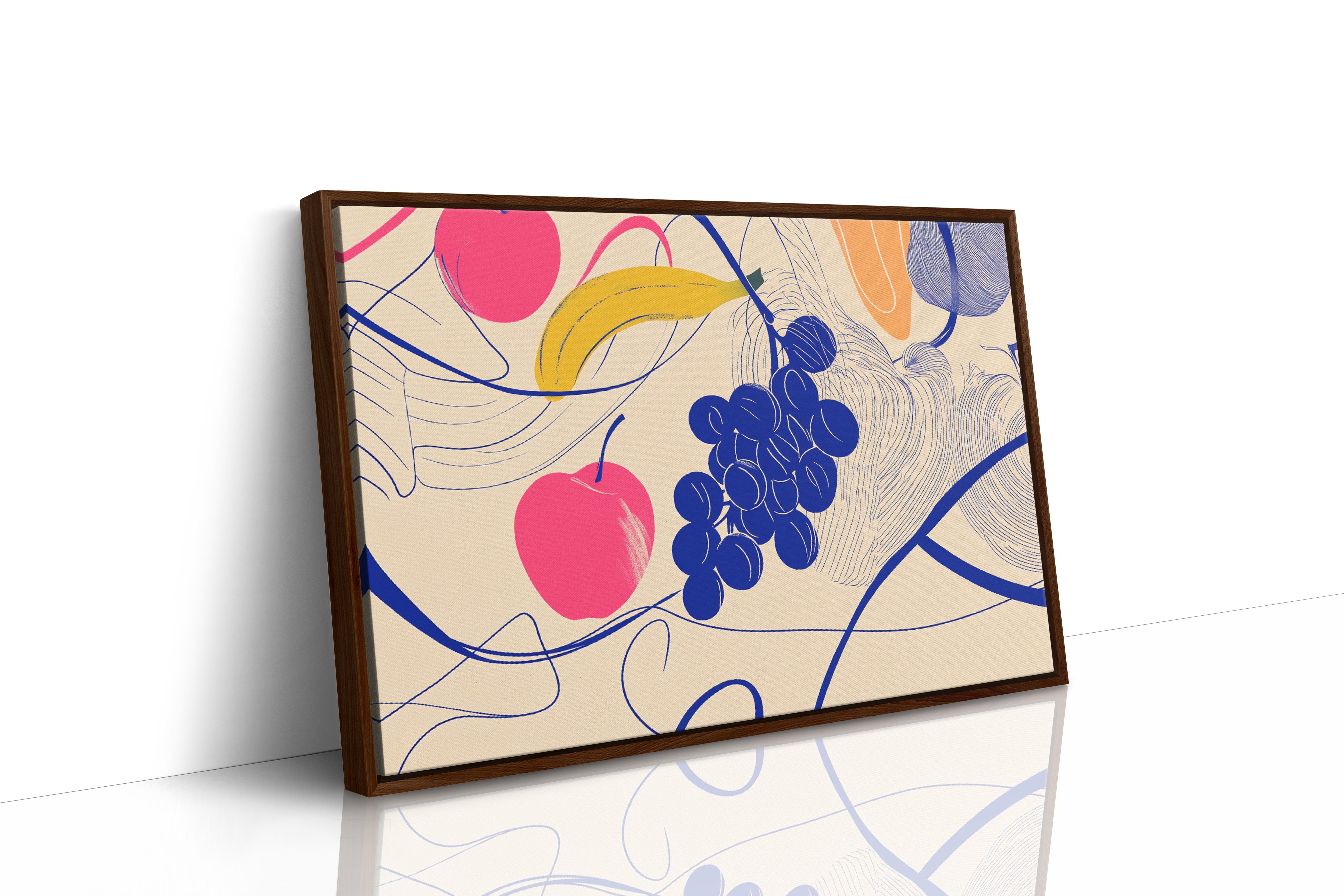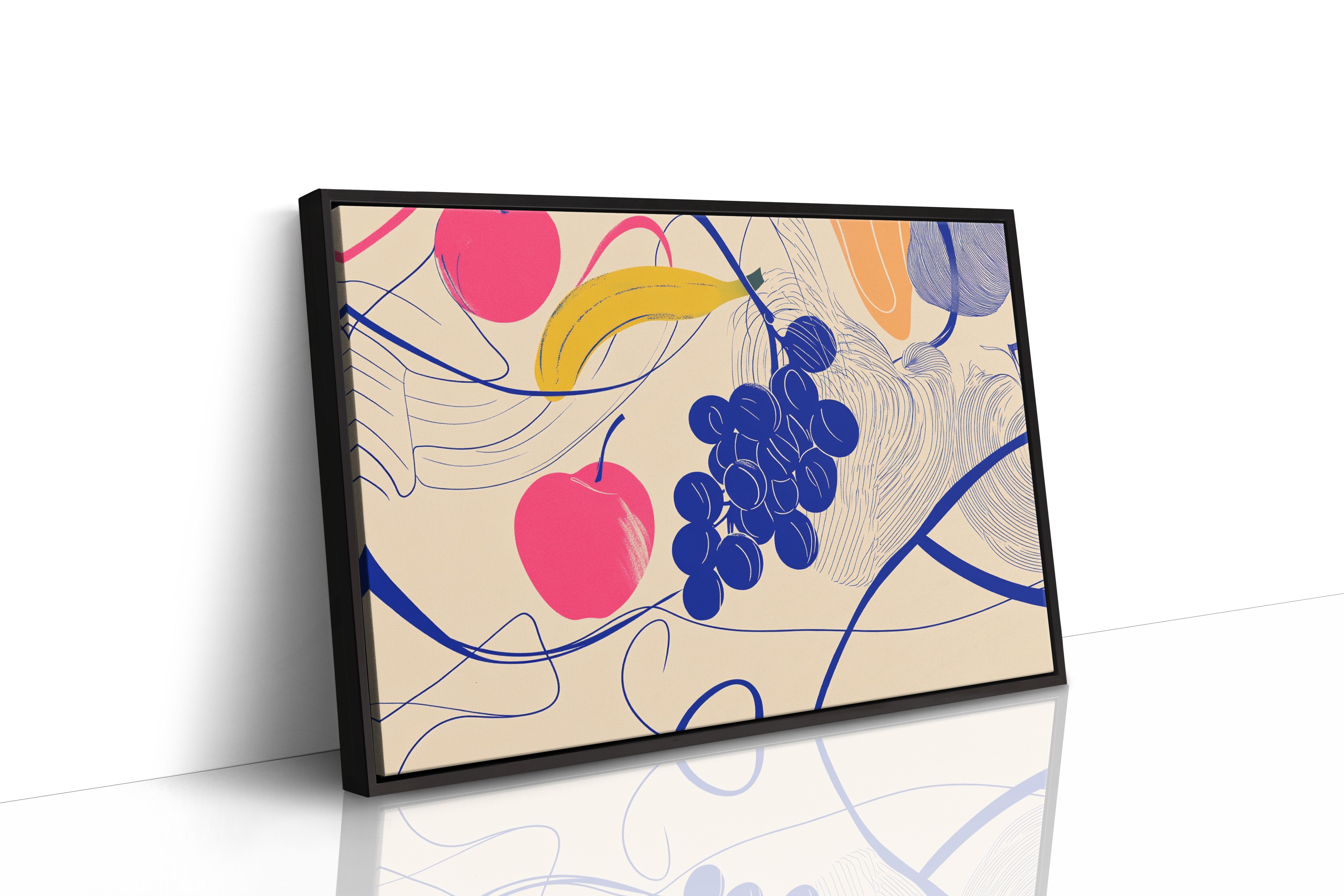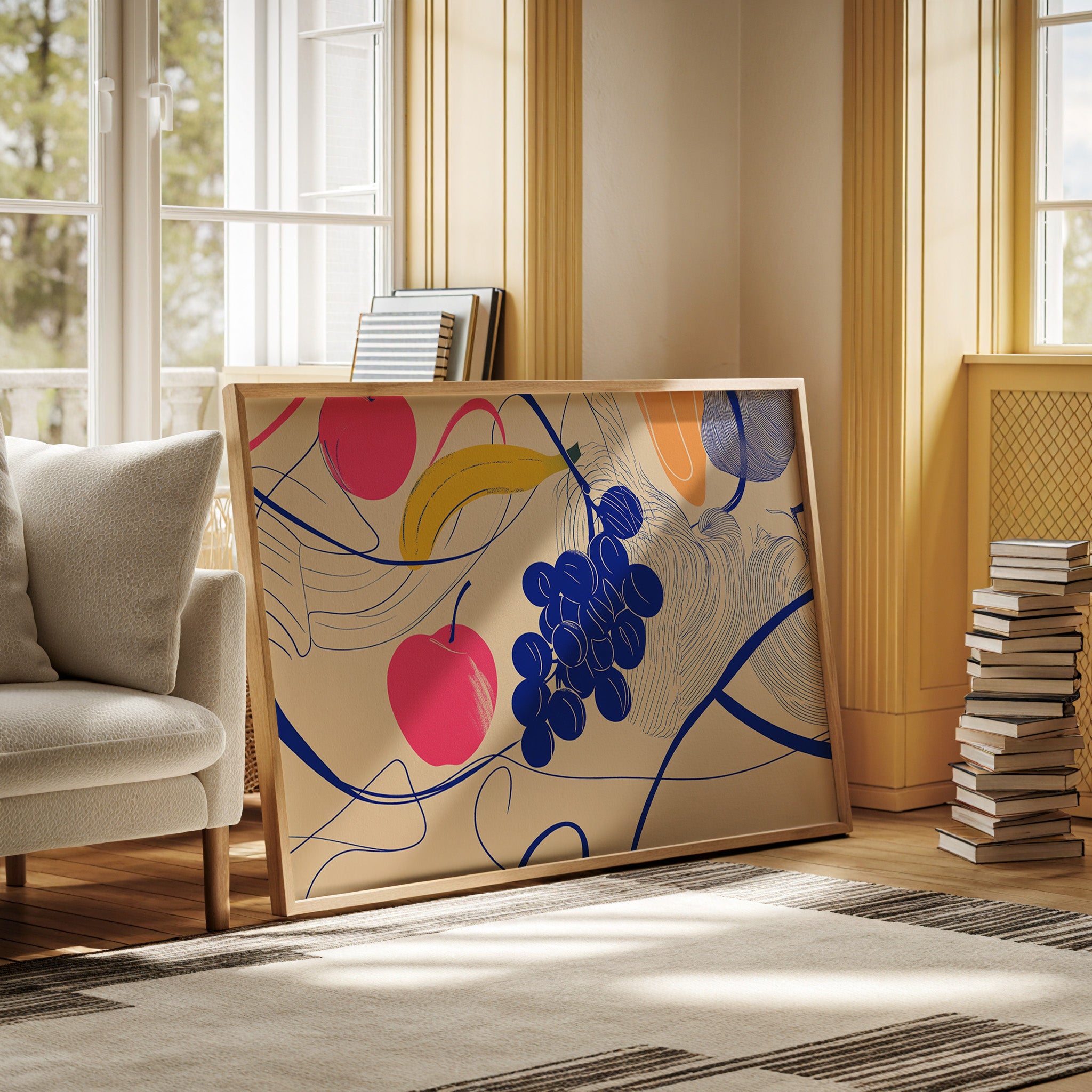 A playful composition where fruits float in a dreamy cream-colored space, their forms rendered in bold, contemporary strokes. Navy blue grapes cluster together in perfect rhythm with coral apples and a golden banana, creating a modern still life that pulses with graphic energy. The flowing lines weave through the composition like musical notes, while delicate textures add depth to this celebration of form and color. This piece would bring a fresh, contemporary energy to a modern kitchen or dining space, its clean lines and bold palette creating a sophisticated yet whimsical focal point.