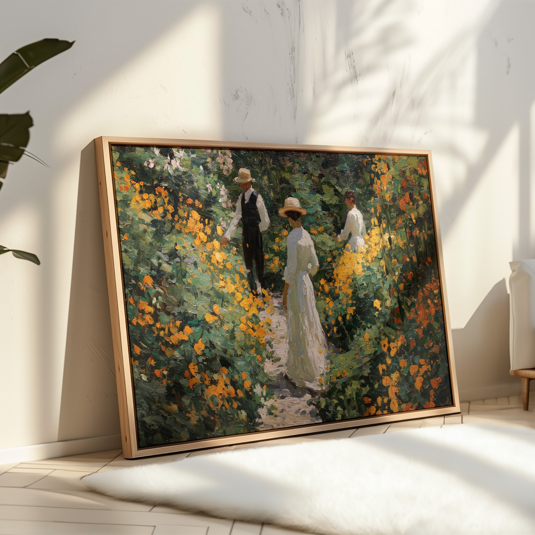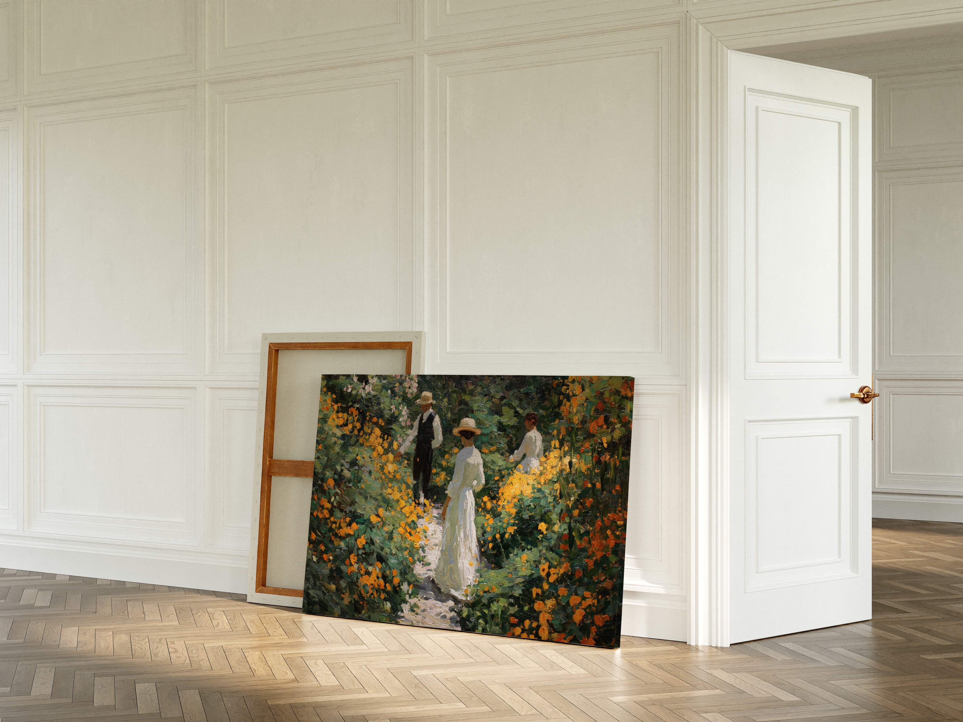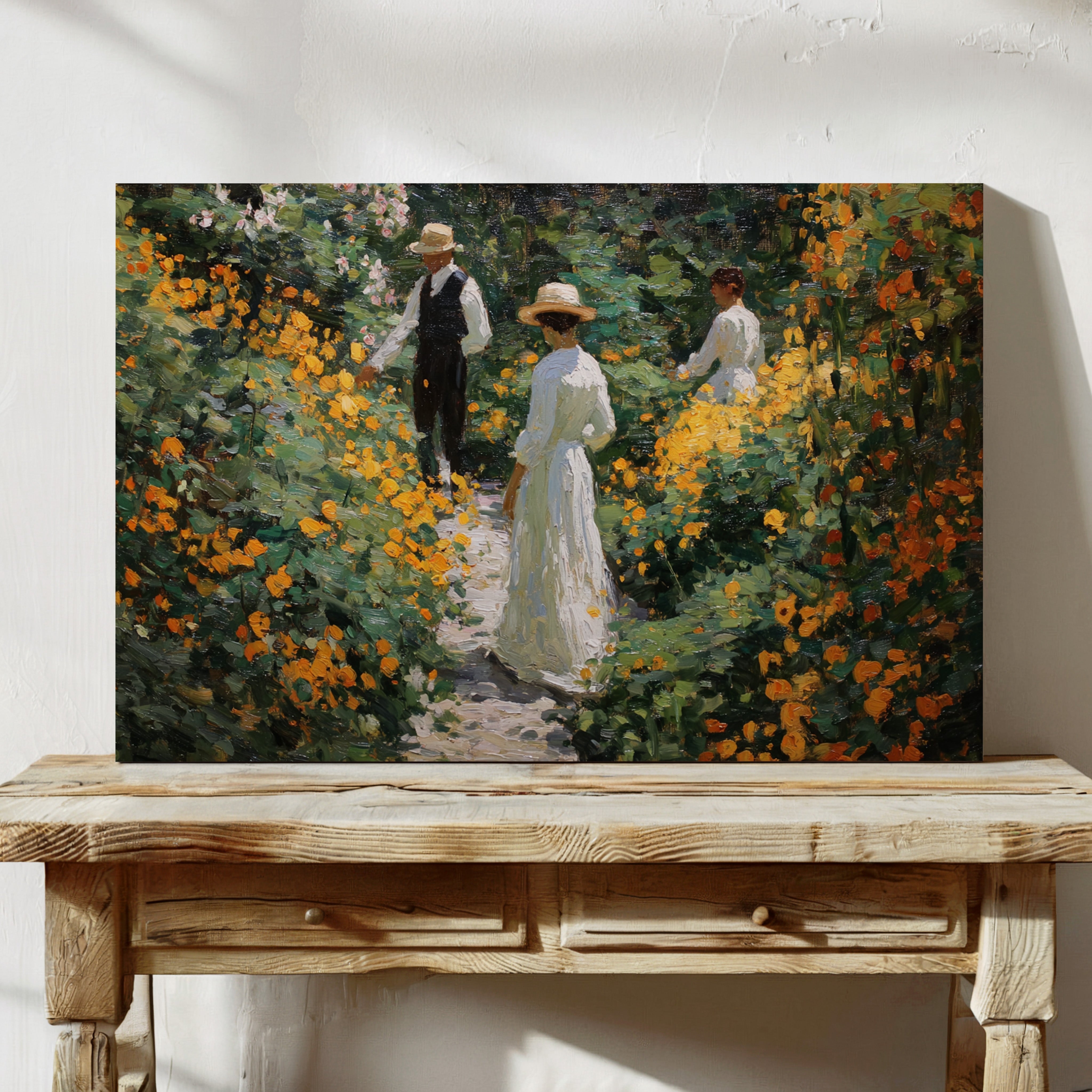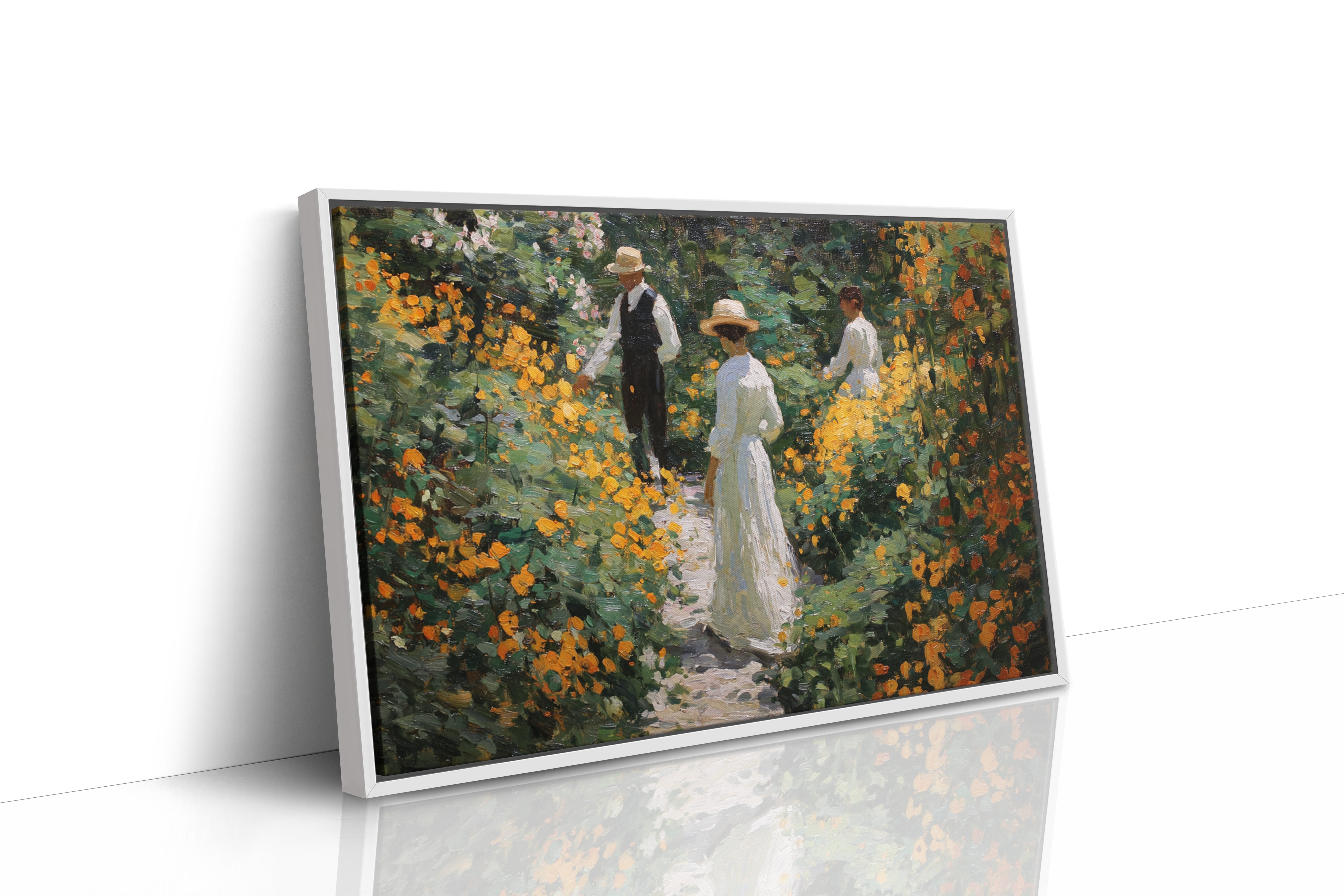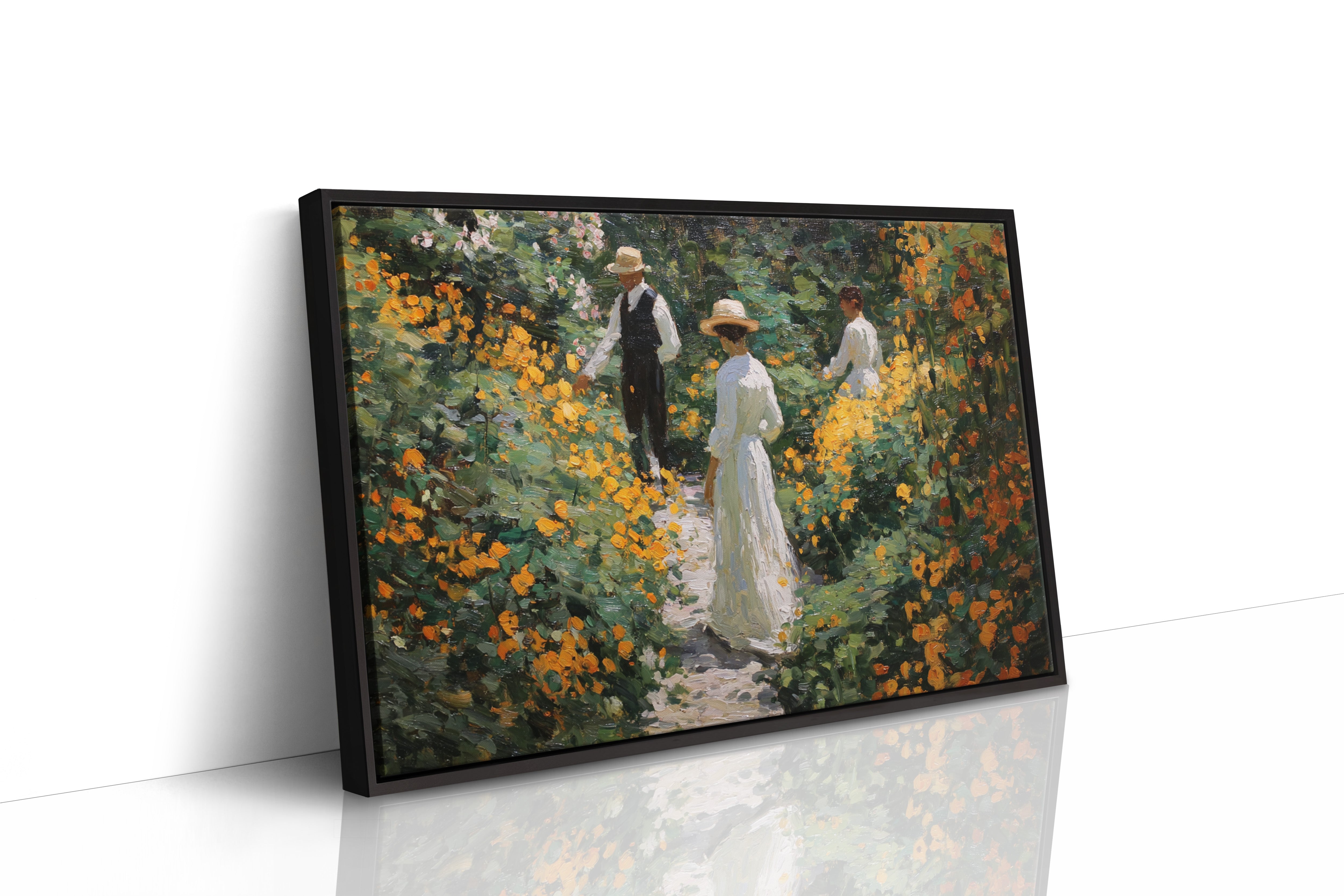 Golden light filters through a lush garden, where marigolds and wildflowers dance along a winding path. Thick brushstrokes capture the warmth of a summer afternoon, with vibrant orange blooms creating a natural corridor through deep green foliage. The textured painting style evokes the impressionist era, where every dab of paint builds a scene rich with seasonal abundance and elegant leisure. This piece brings the tranquility of a Victorian garden moment into contemporary spaces.