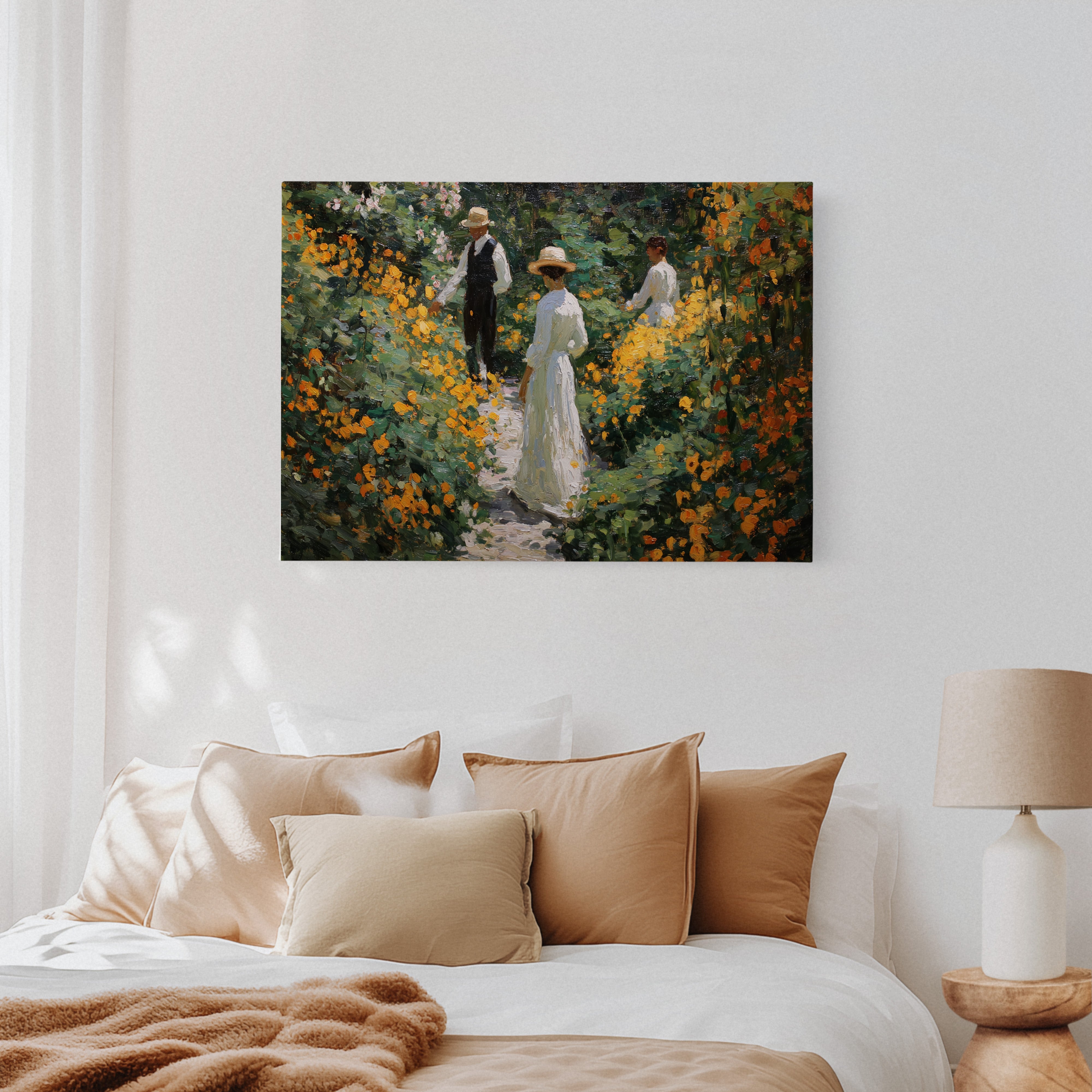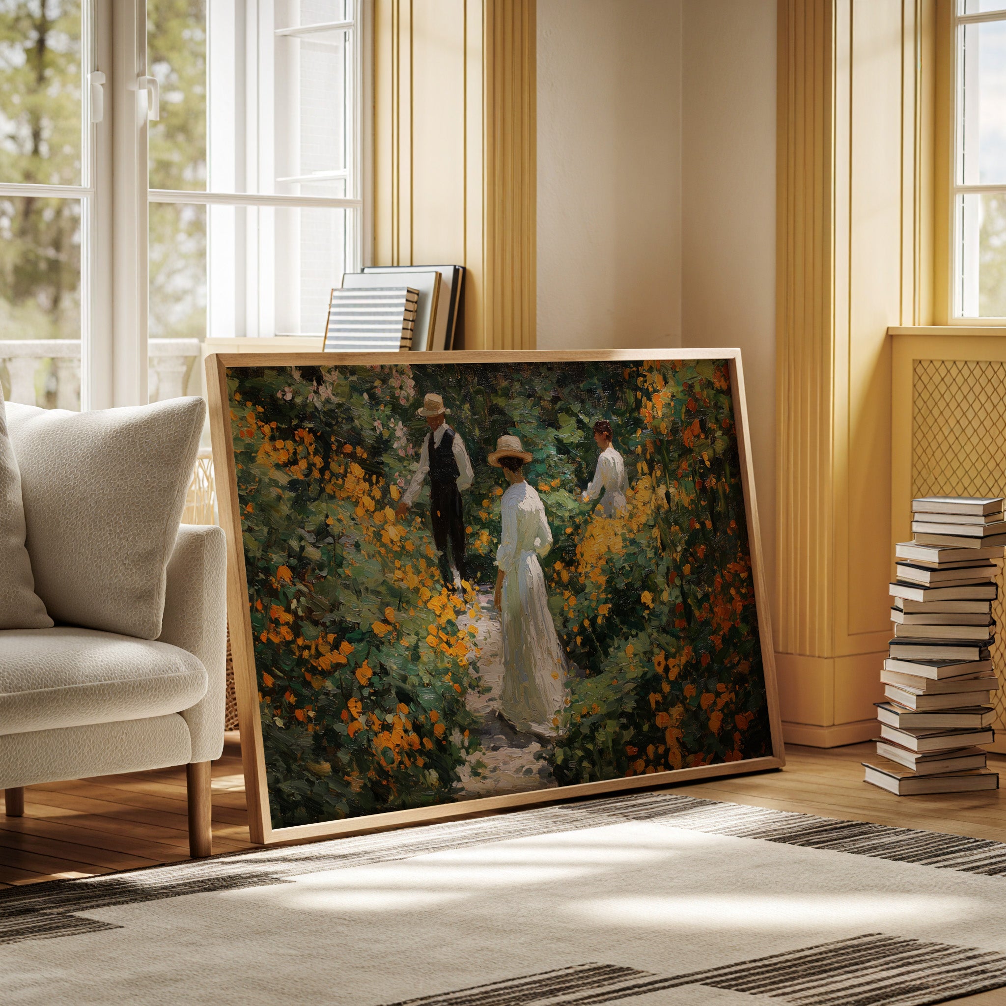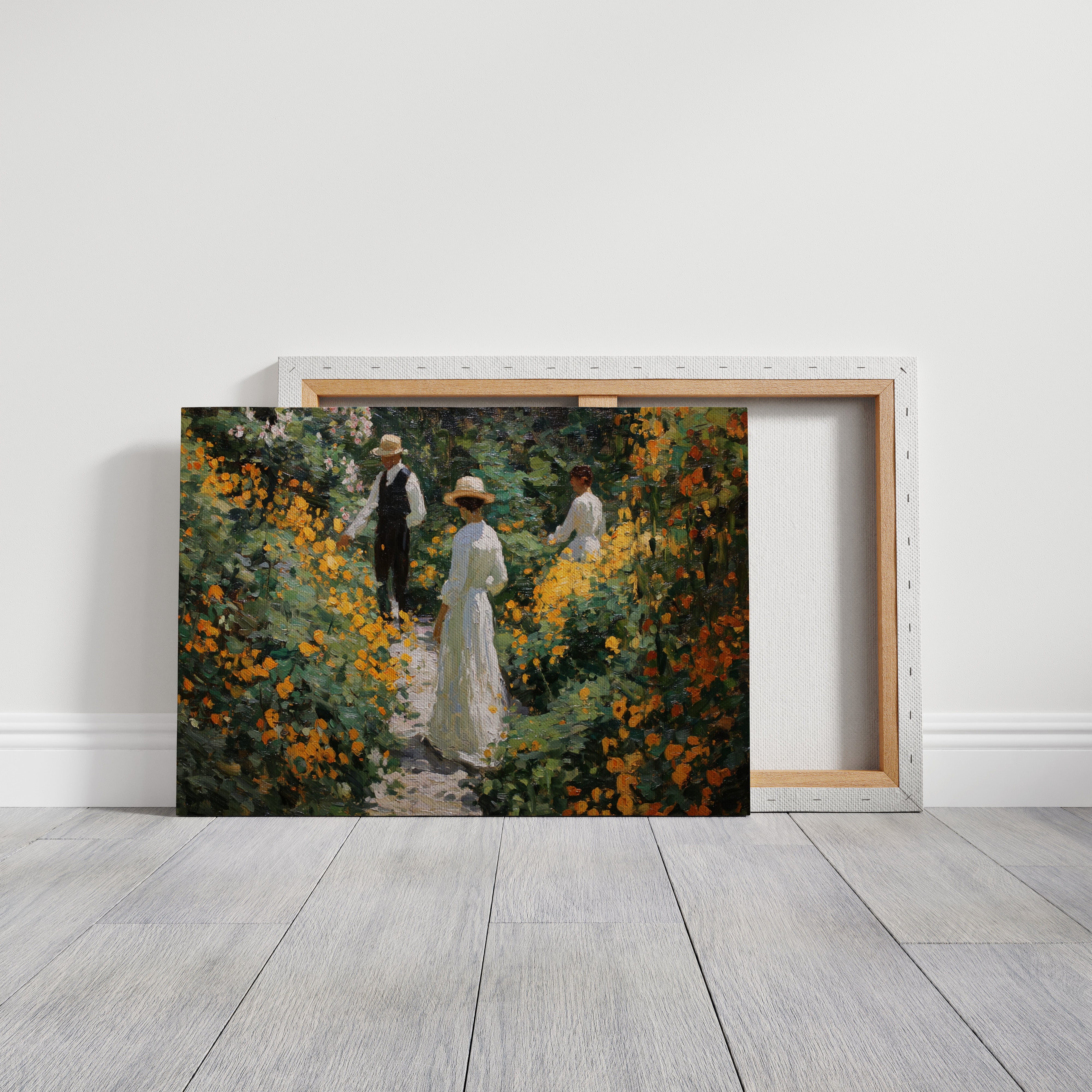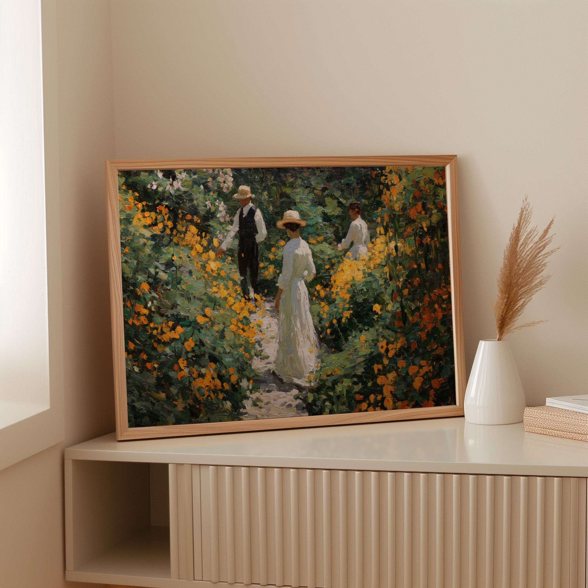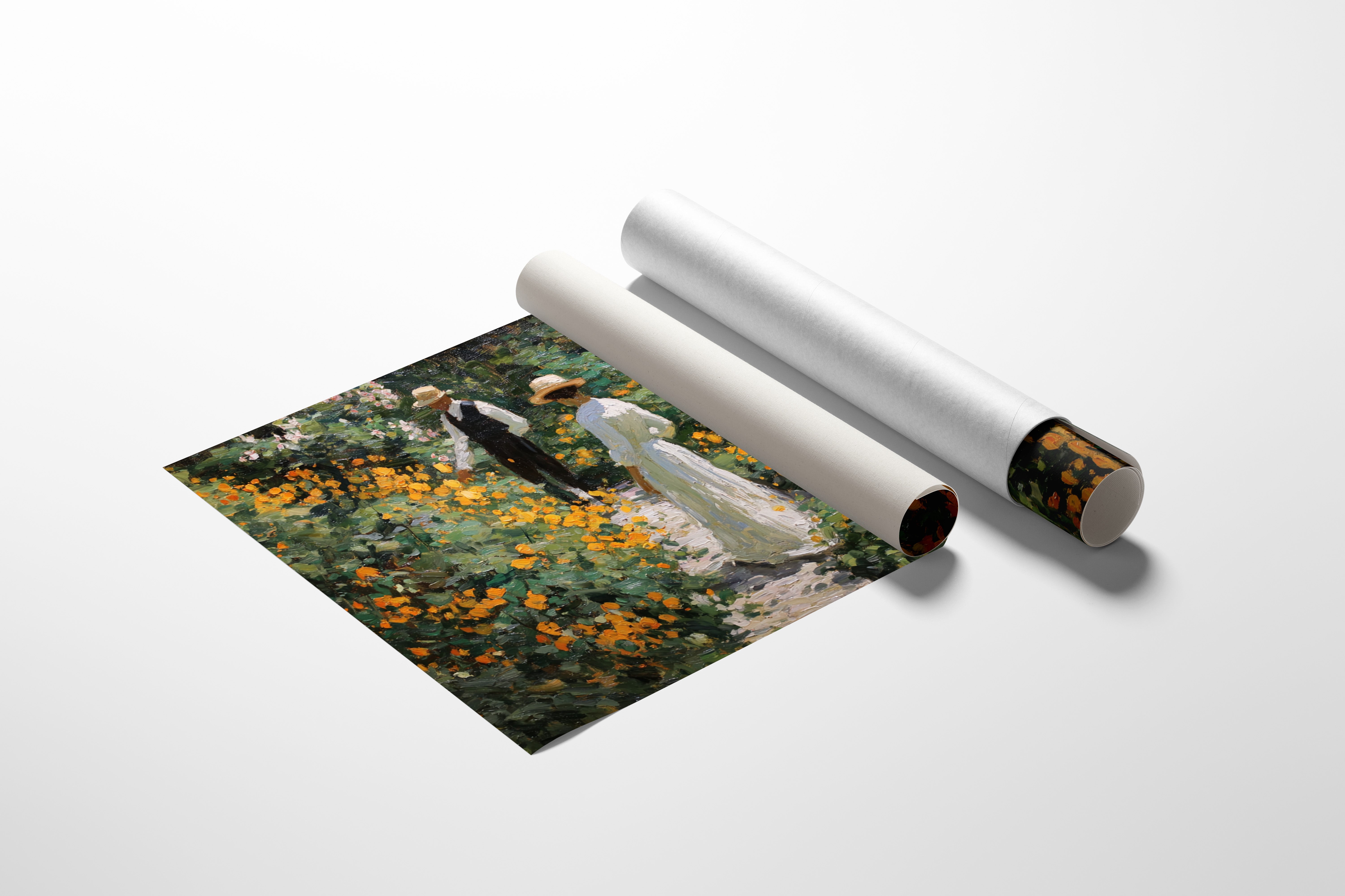 Golden light filters through a lush garden, where marigolds and wildflowers dance along a winding path. Thick brushstrokes capture the warmth of a summer afternoon, with vibrant orange blooms creating a natural corridor through deep green foliage. The textured painting style evokes the impressionist era, where every dab of paint builds a scene rich with seasonal abundance and elegant leisure. This piece brings the tranquility of a Victorian garden moment into contemporary spaces.