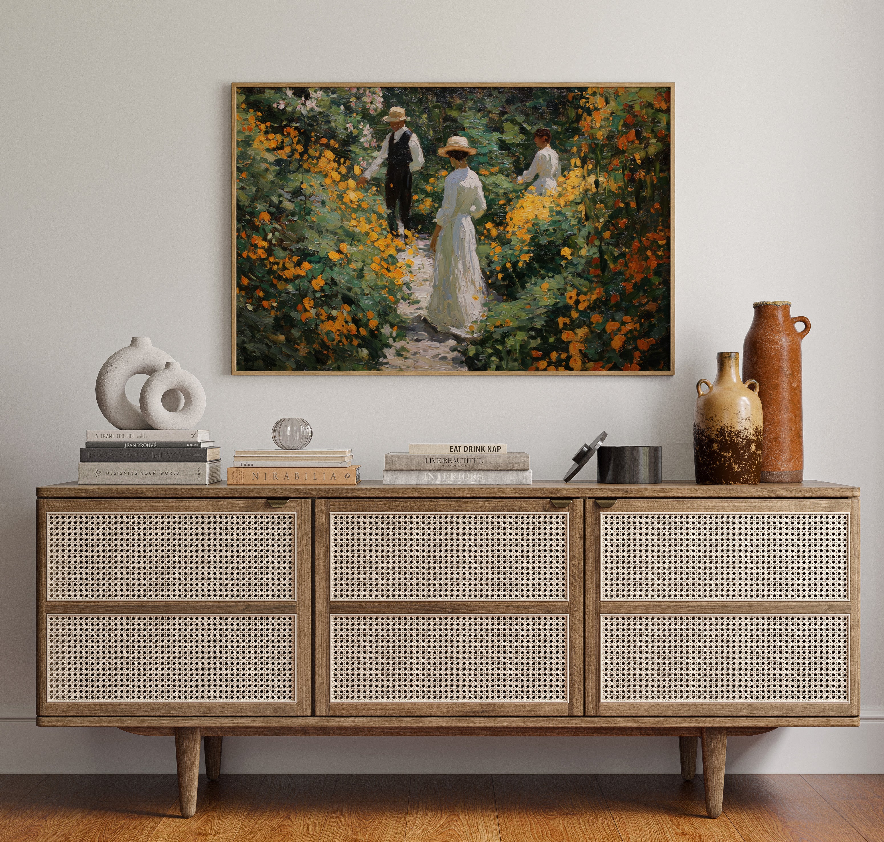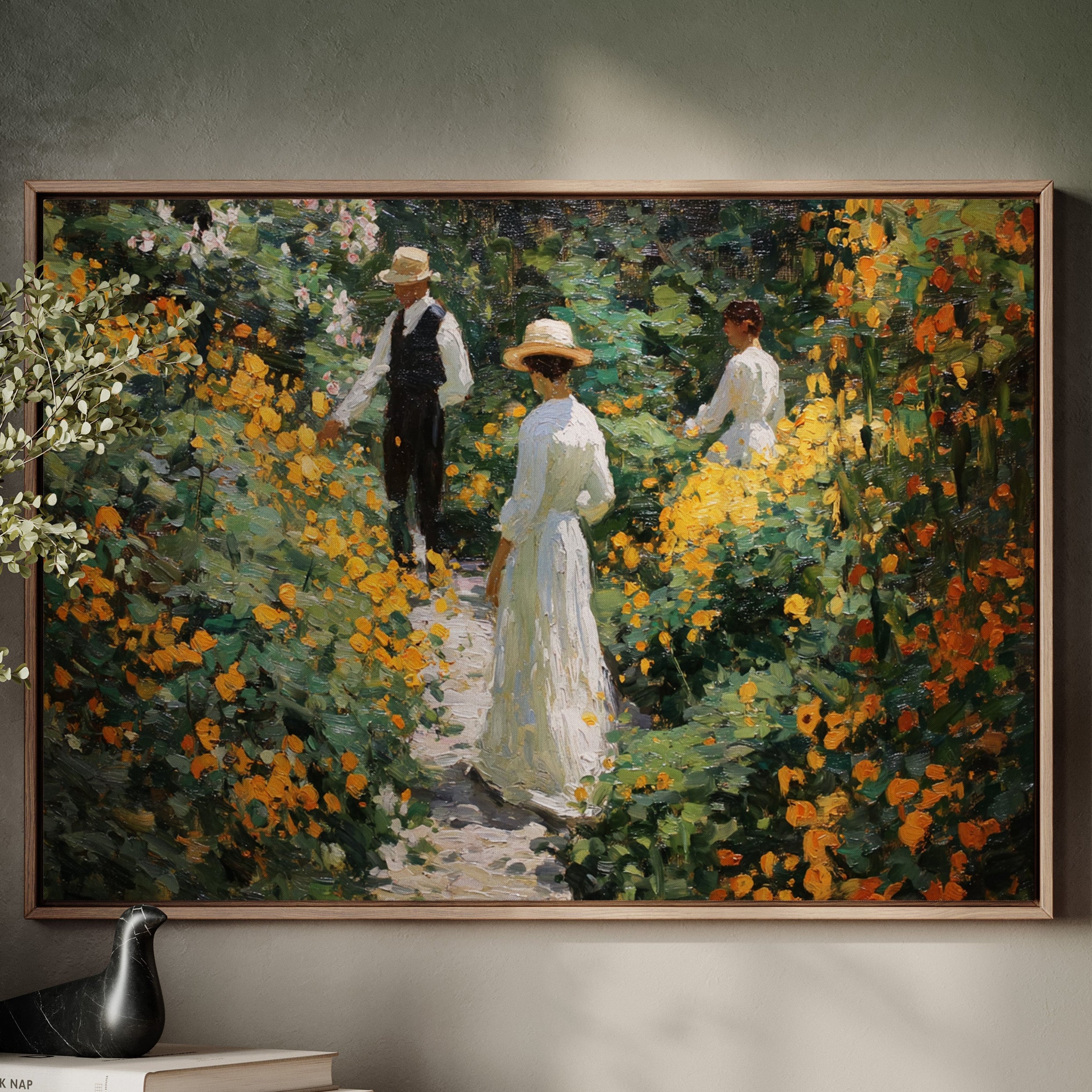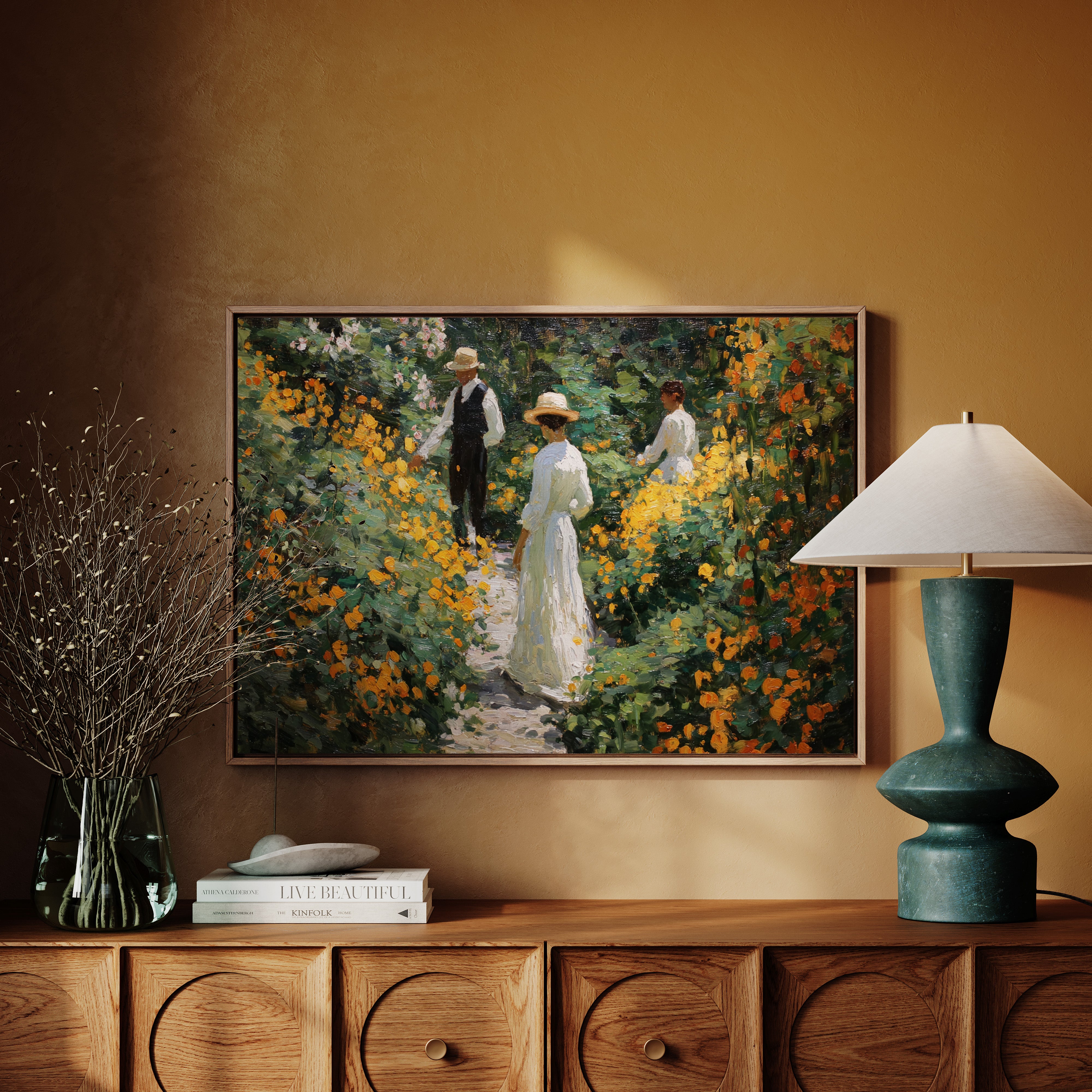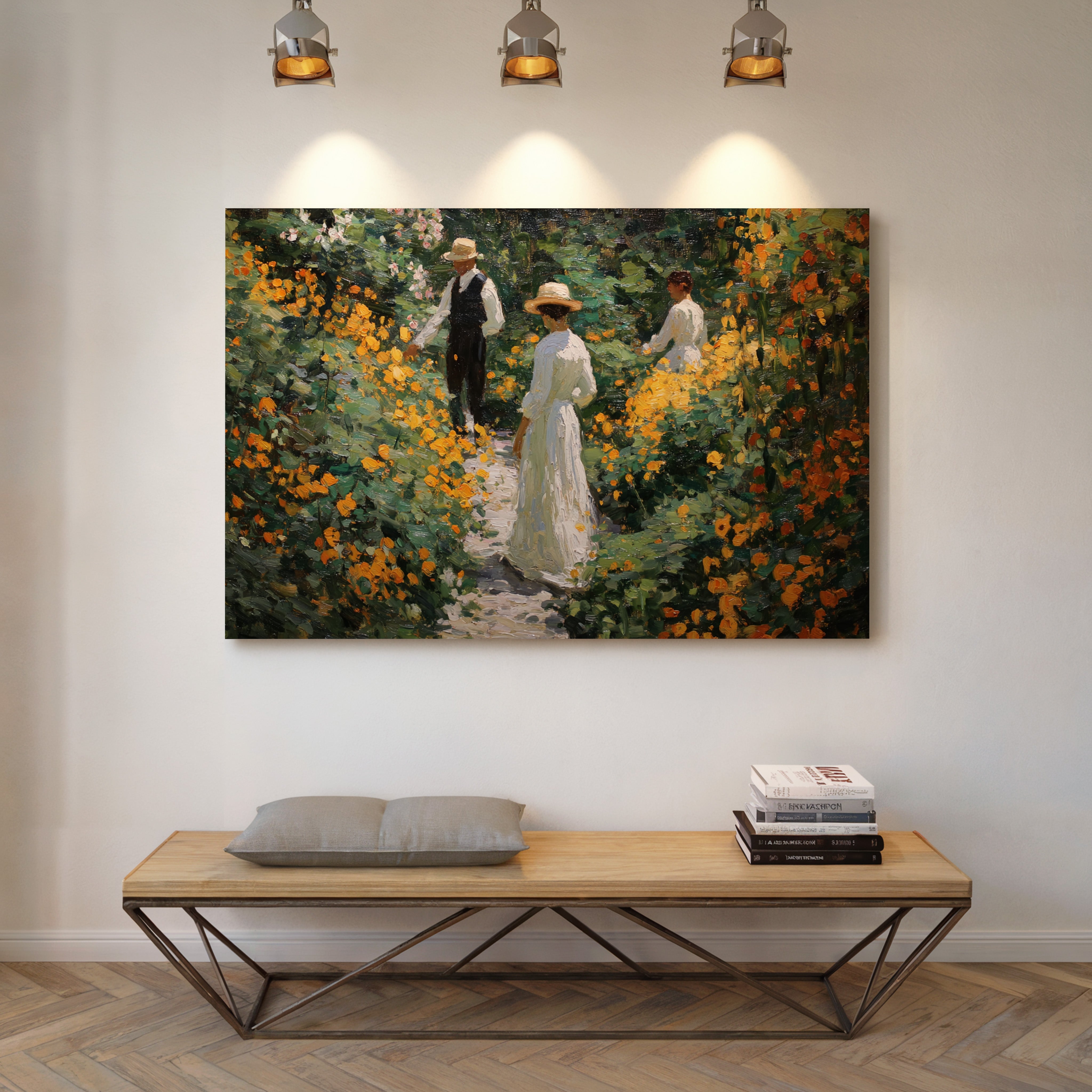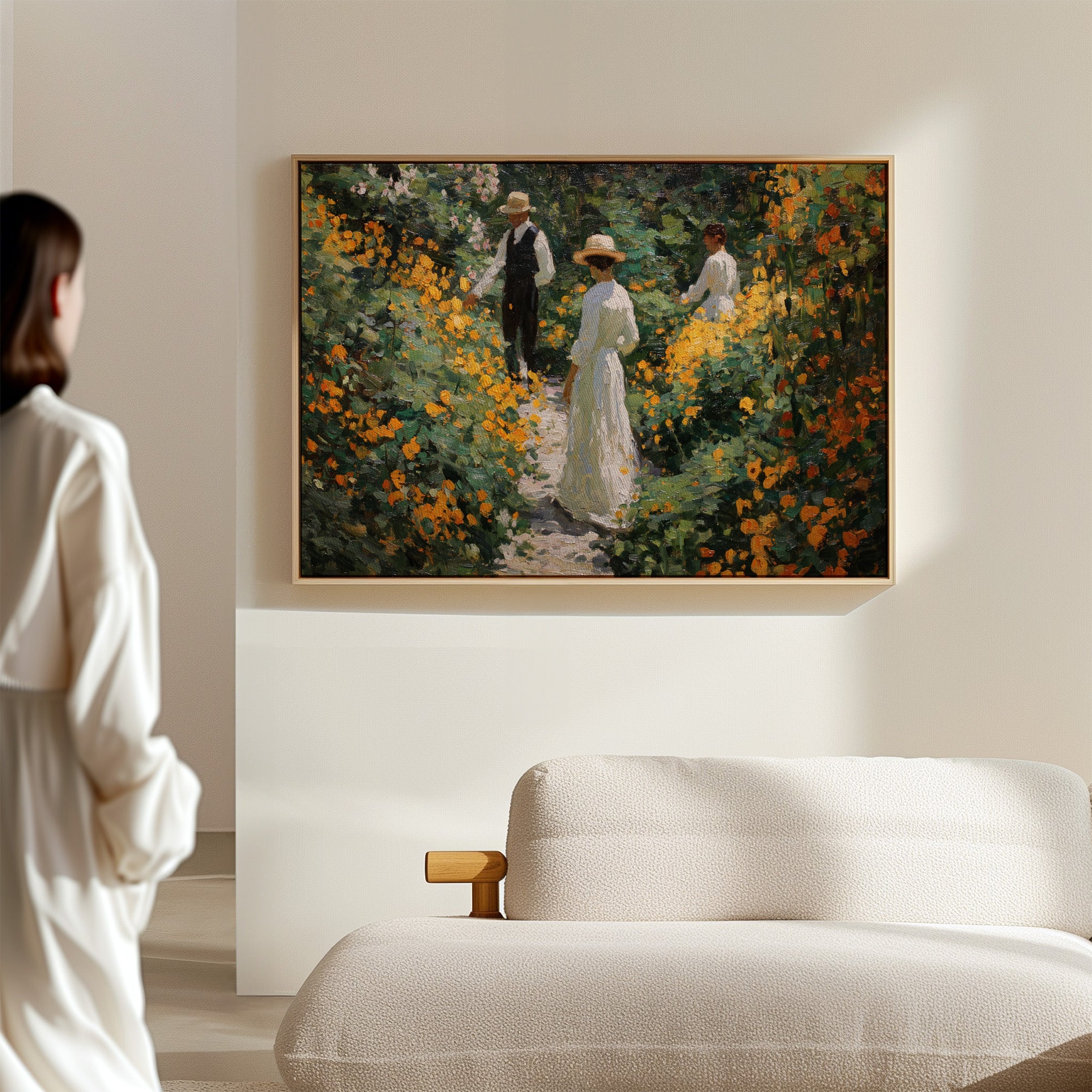 Golden light filters through a lush garden, where marigolds and wildflowers dance along a winding path. Thick brushstrokes capture the warmth of a summer afternoon, with vibrant orange blooms creating a natural corridor through deep green foliage. The textured painting style evokes the impressionist era, where every dab of paint builds a scene rich with seasonal abundance and elegant leisure. This piece brings the tranquility of a Victorian garden moment into contemporary spaces.