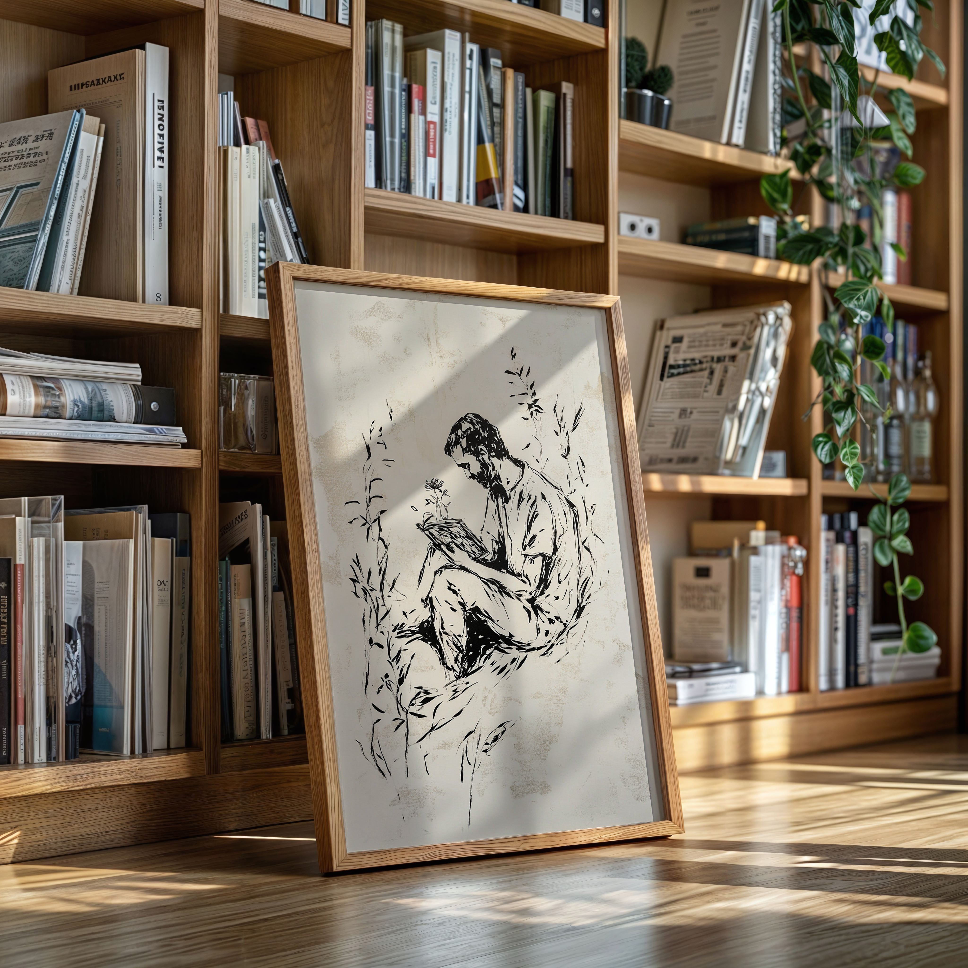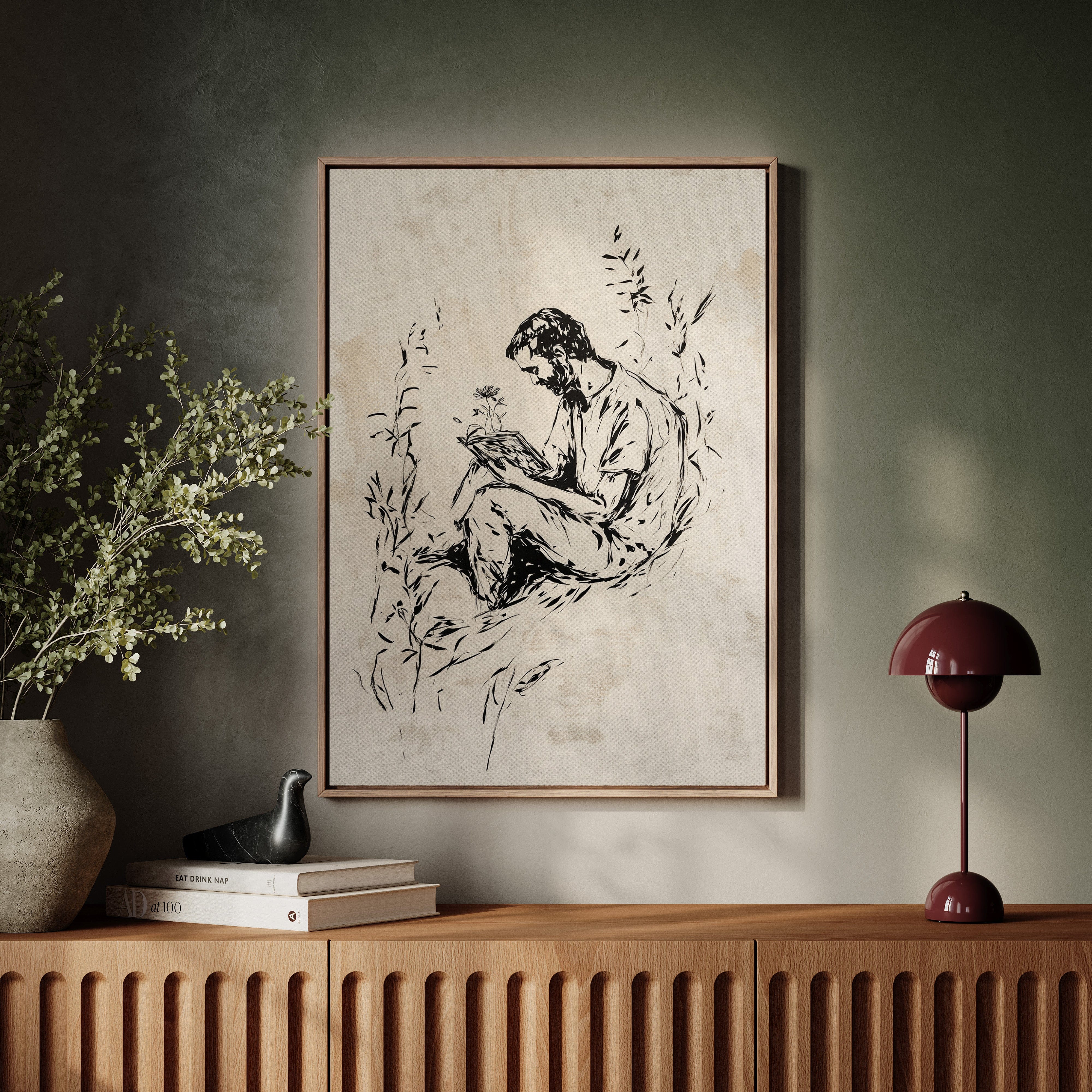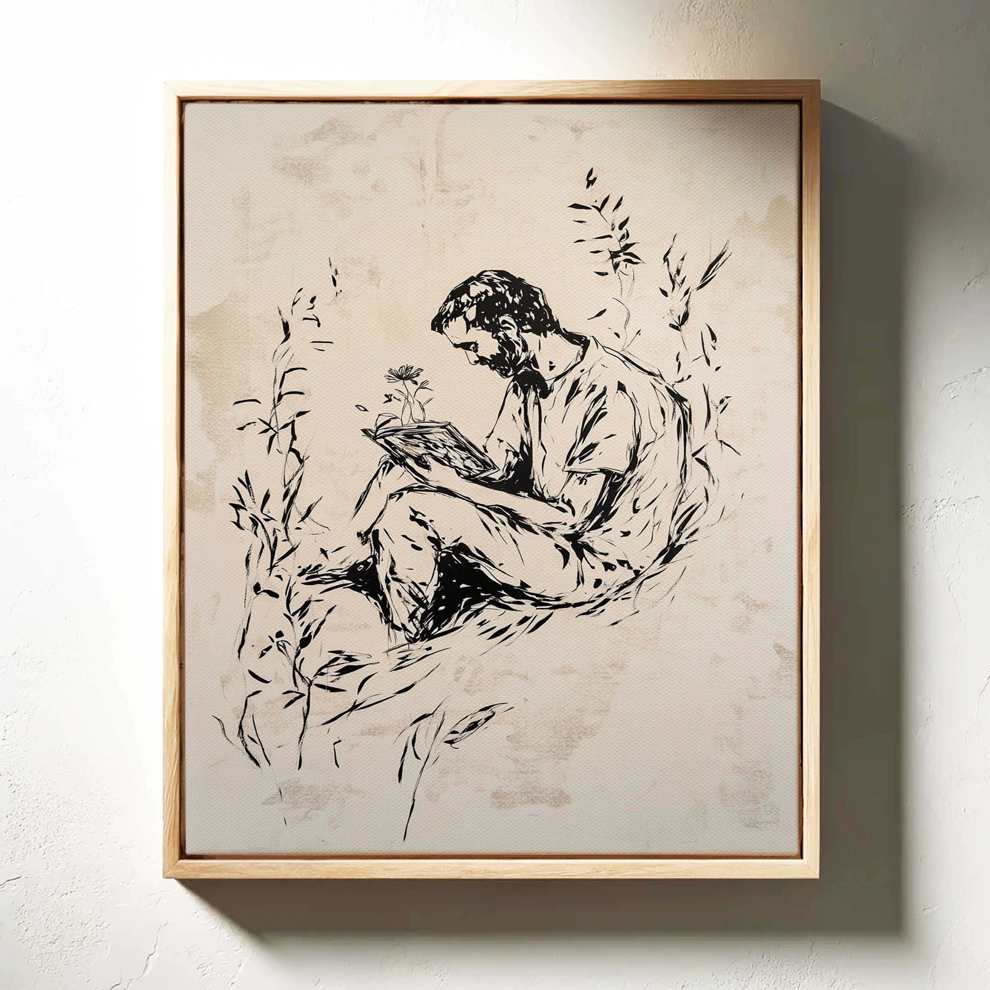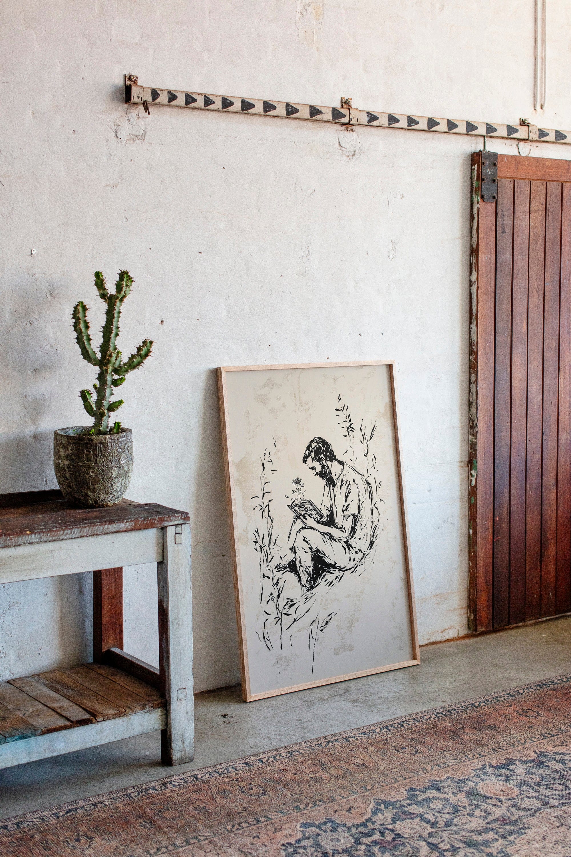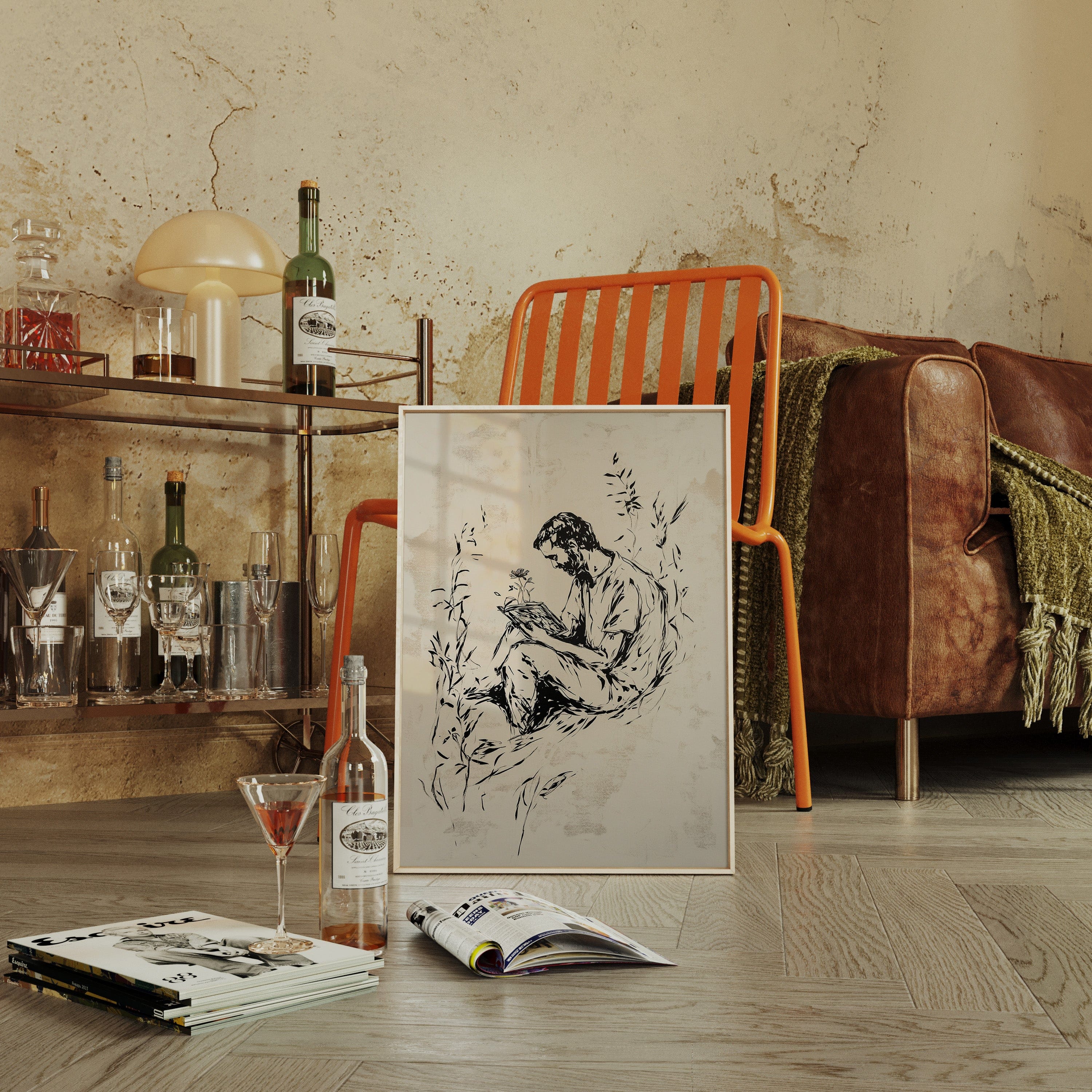 Amid swaying stalks of wild grass, a moment of pure literary escape unfolds in bold brush strokes. The stark contrast of black ink against cream creates a powerful meditation on solitude and contemplation. Gestural lines capture both movement and stillness - the gentle bend of grass stems and the absorbed focus of the reader, while loose, expressive strokes suggest a breeze rustling through the meadow scene. This contemporary ink drawing would bring a sense of peaceful reflection to a reading nook, home library, or any quiet corner meant for moments of introspection.