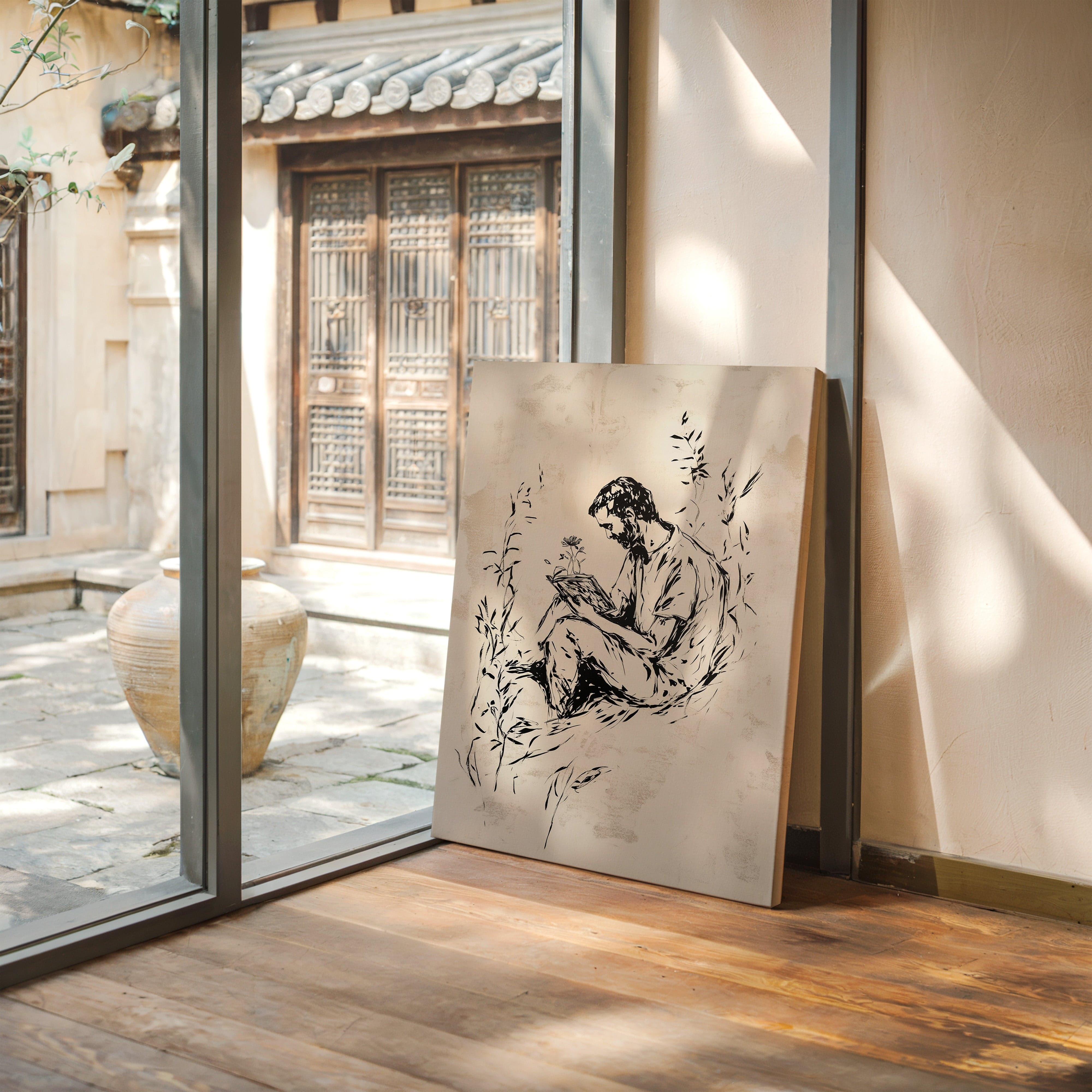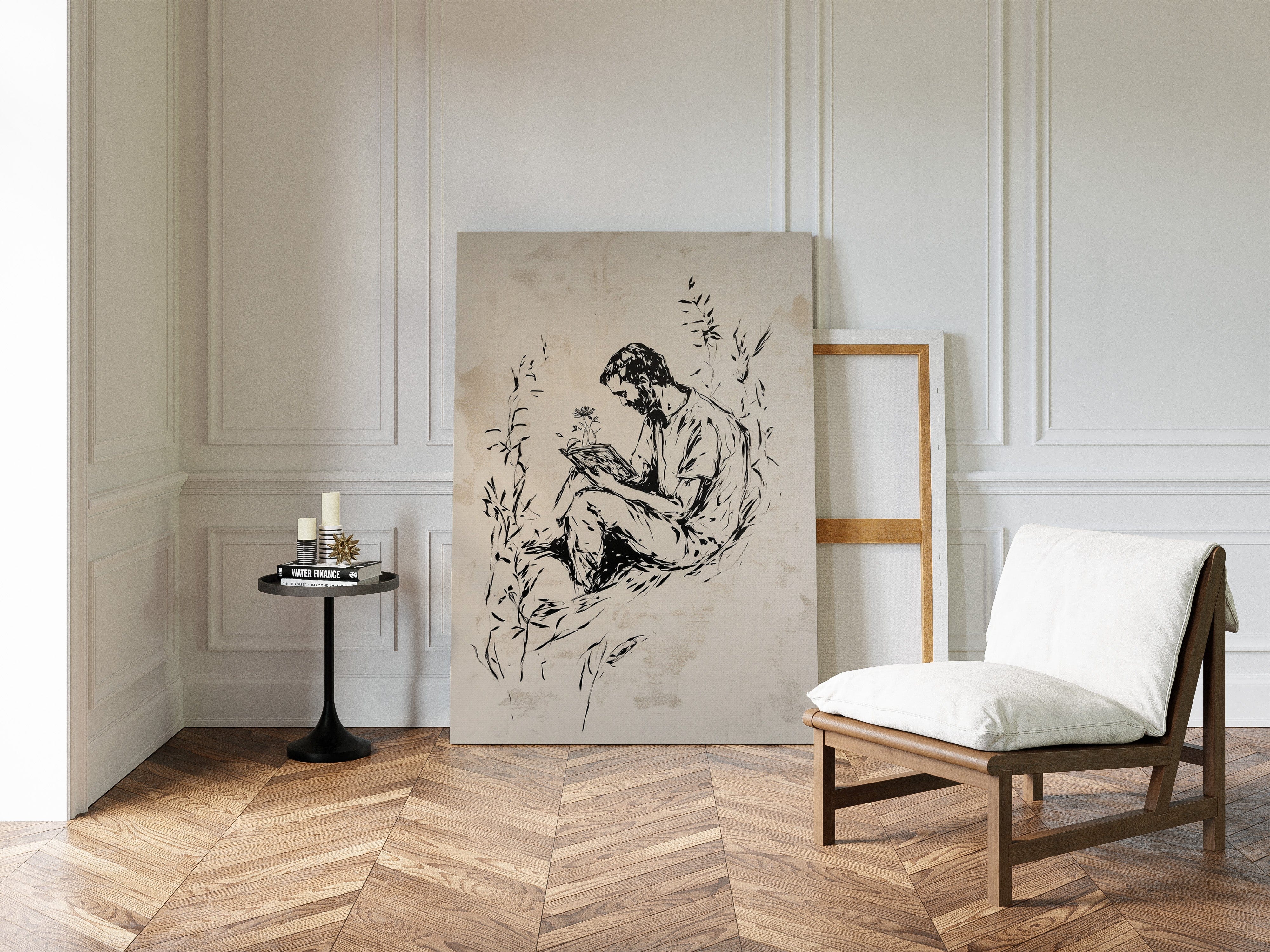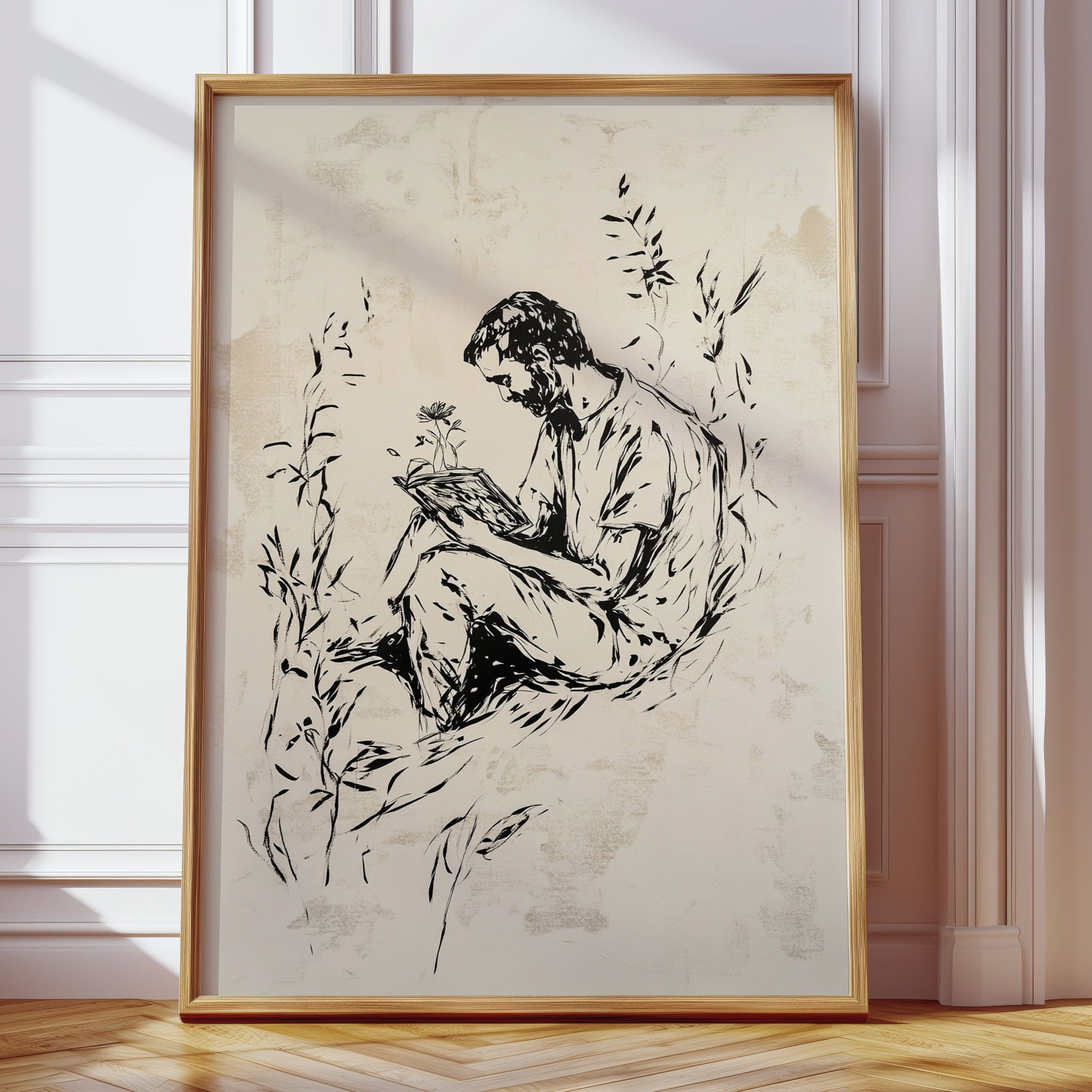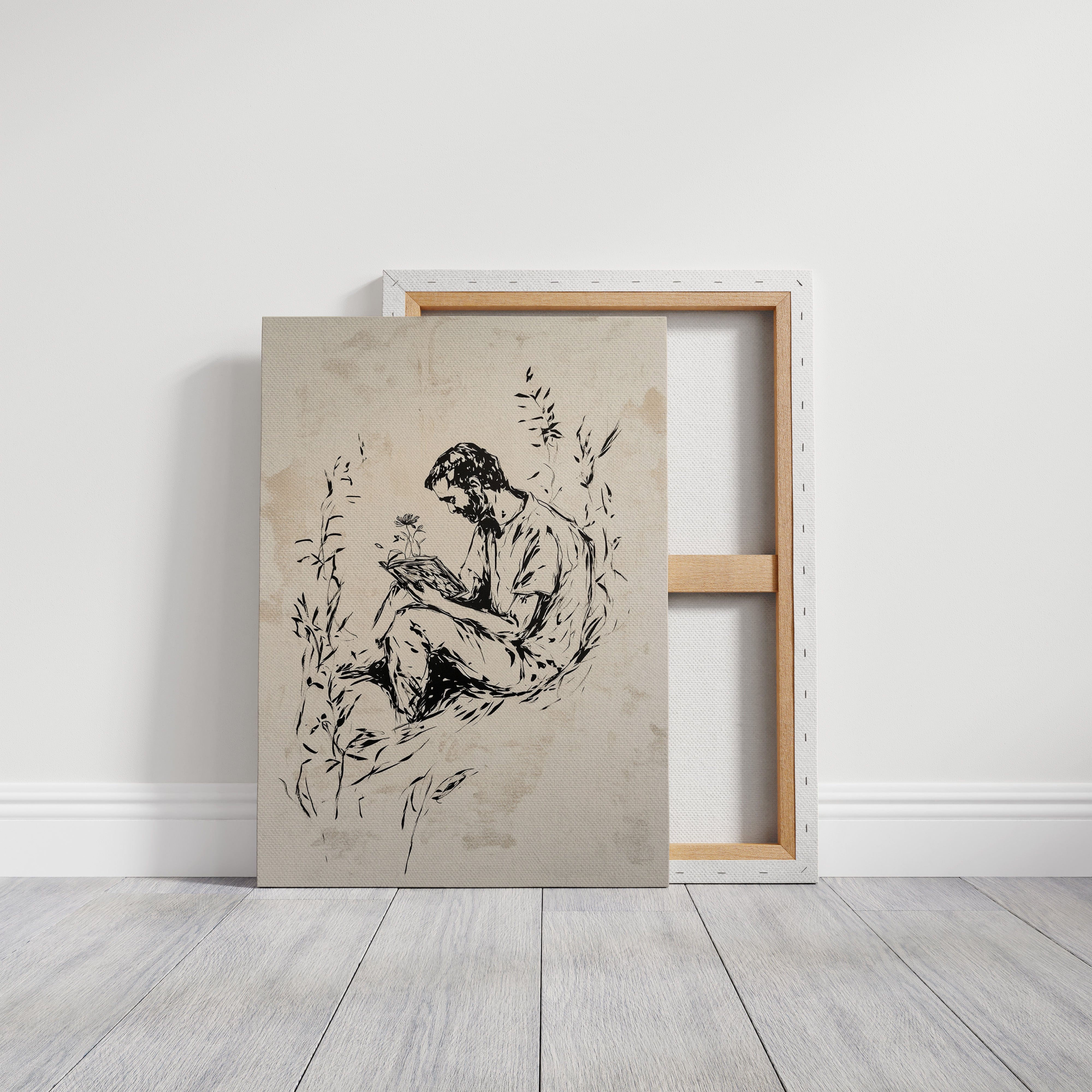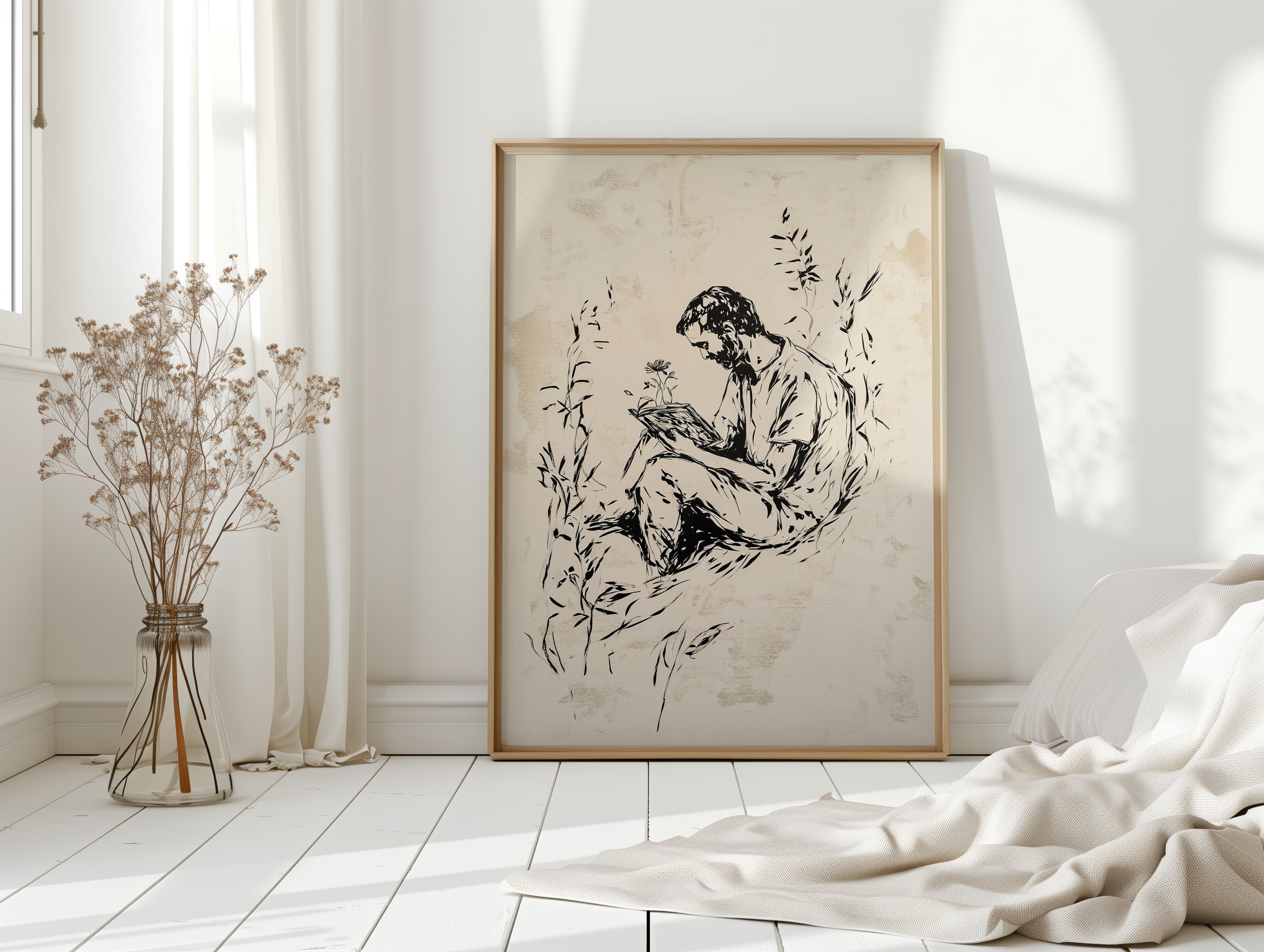 Amid swaying stalks of wild grass, a moment of pure literary escape unfolds in bold brush strokes. The stark contrast of black ink against cream creates a powerful meditation on solitude and contemplation. Gestural lines capture both movement and stillness - the gentle bend of grass stems and the absorbed focus of the reader, while loose, expressive strokes suggest a breeze rustling through the meadow scene. This contemporary ink drawing would bring a sense of peaceful reflection to a reading nook, home library, or any quiet corner meant for moments of introspection.
