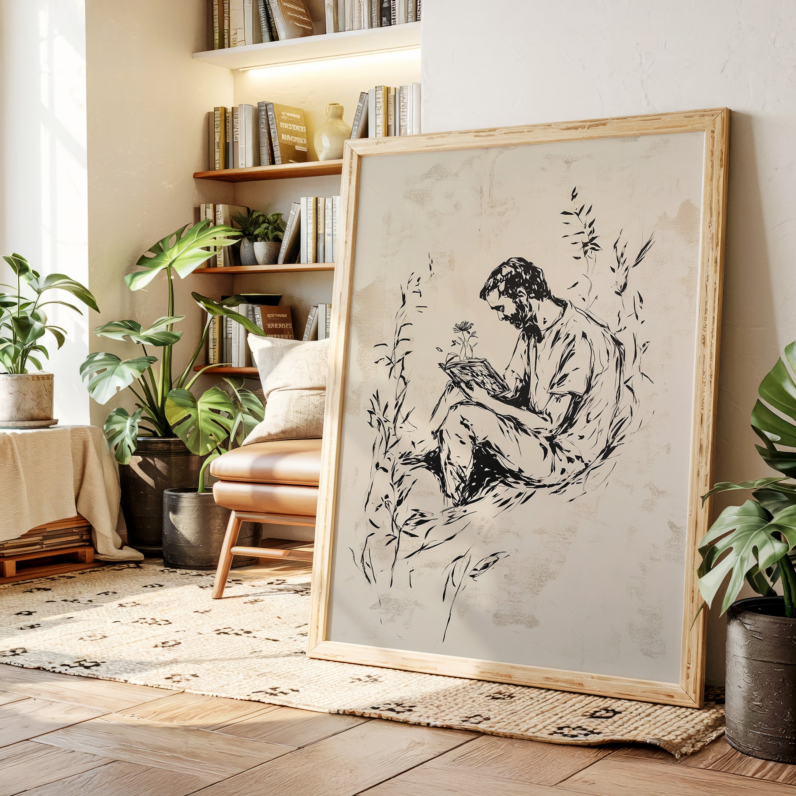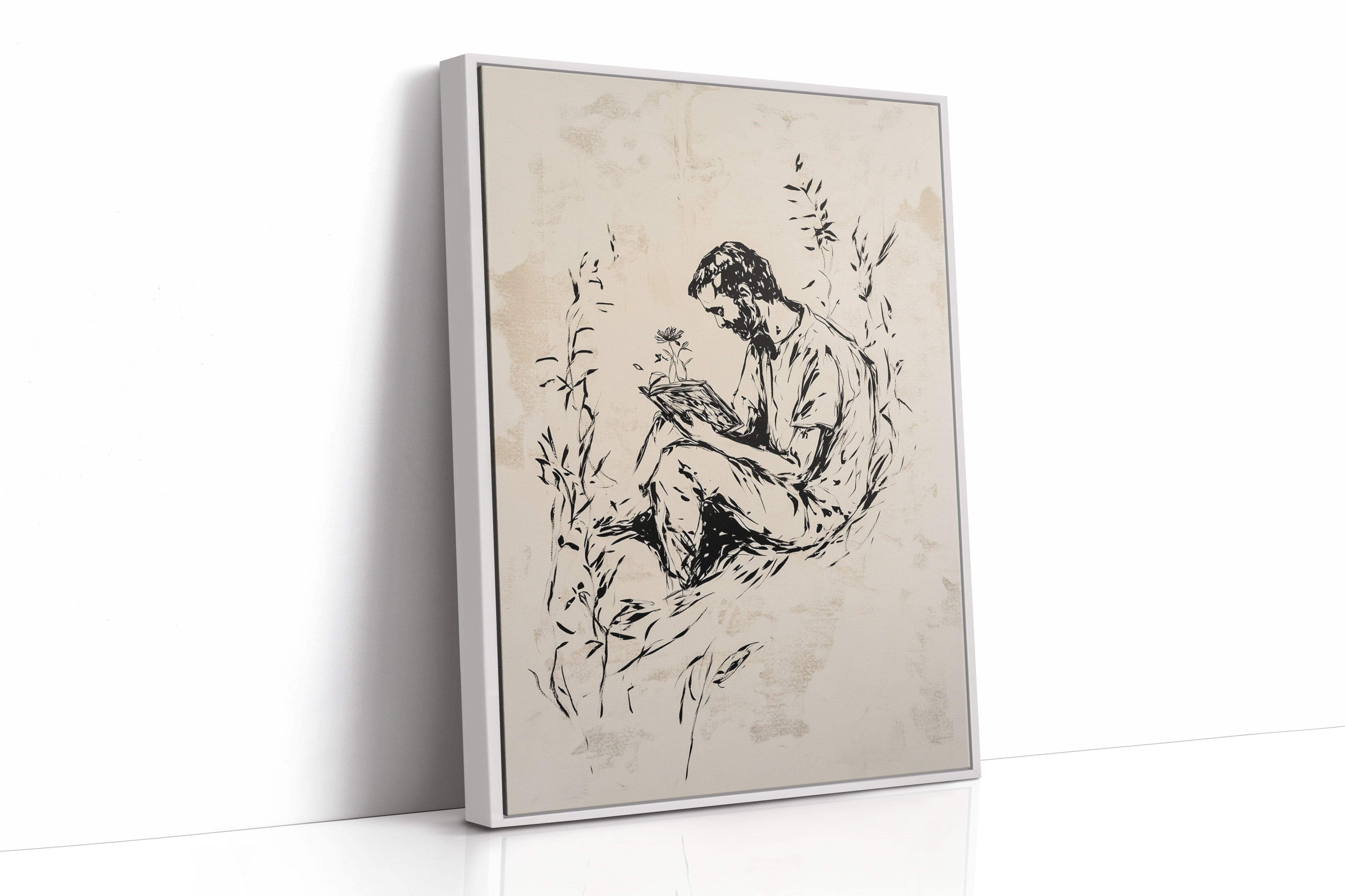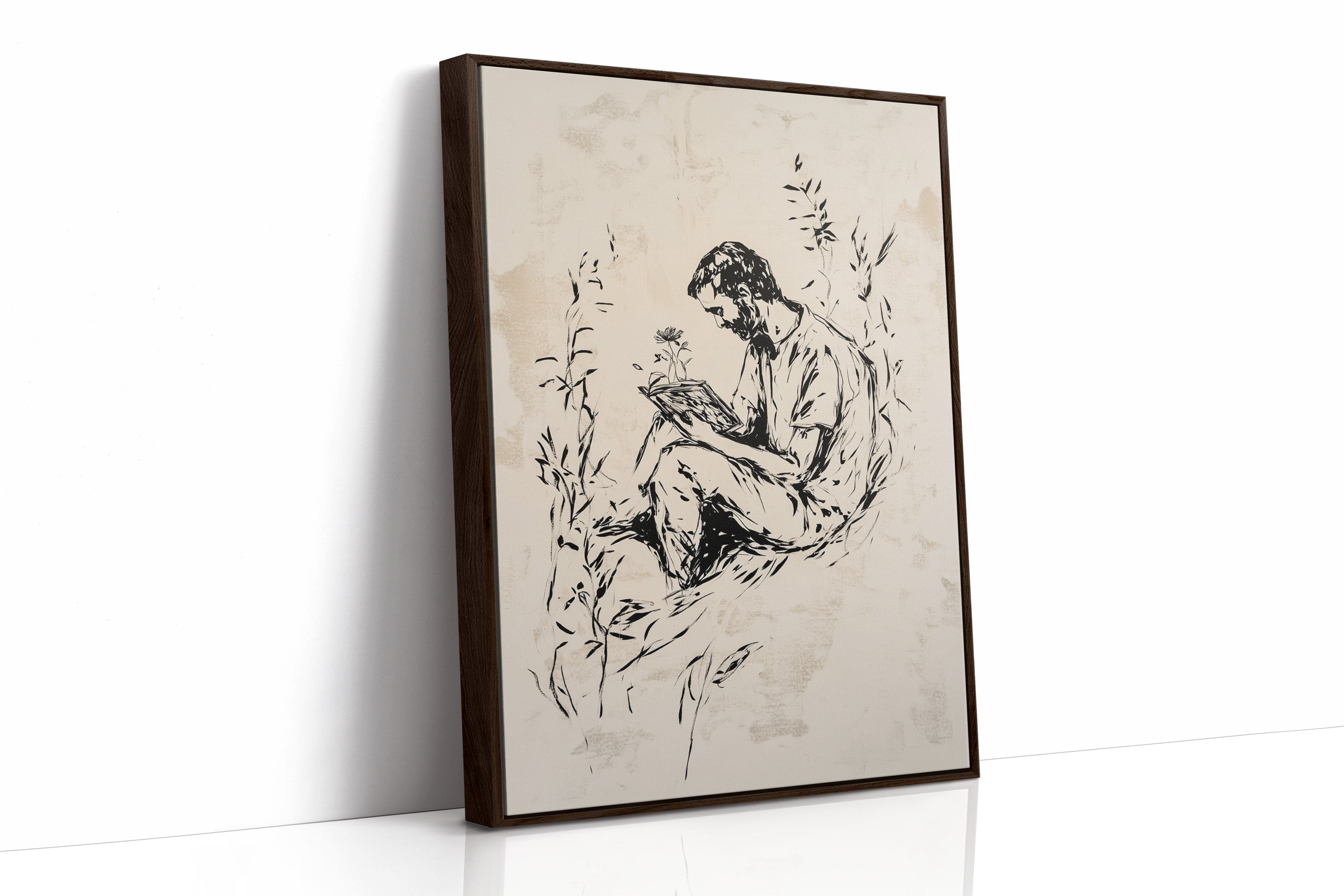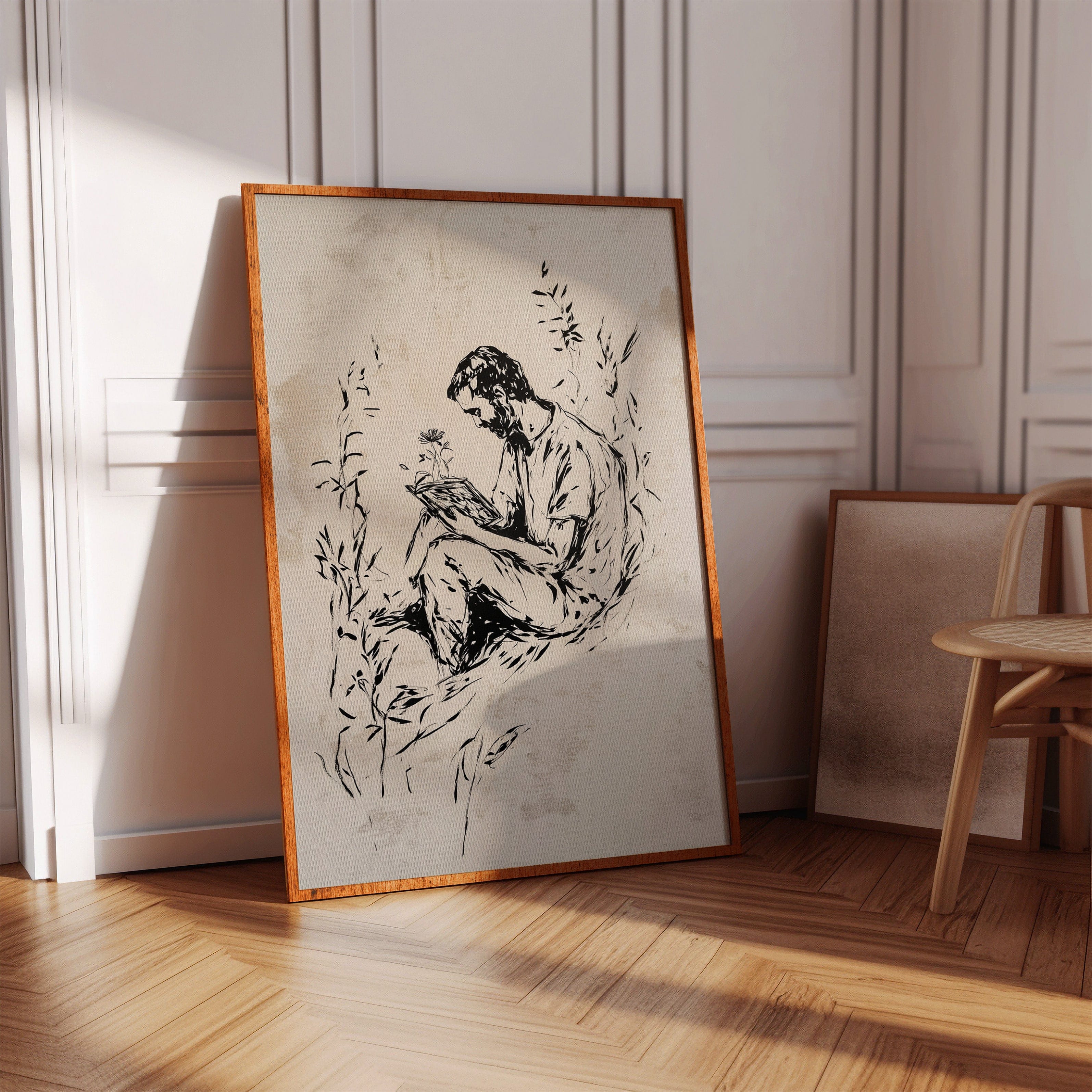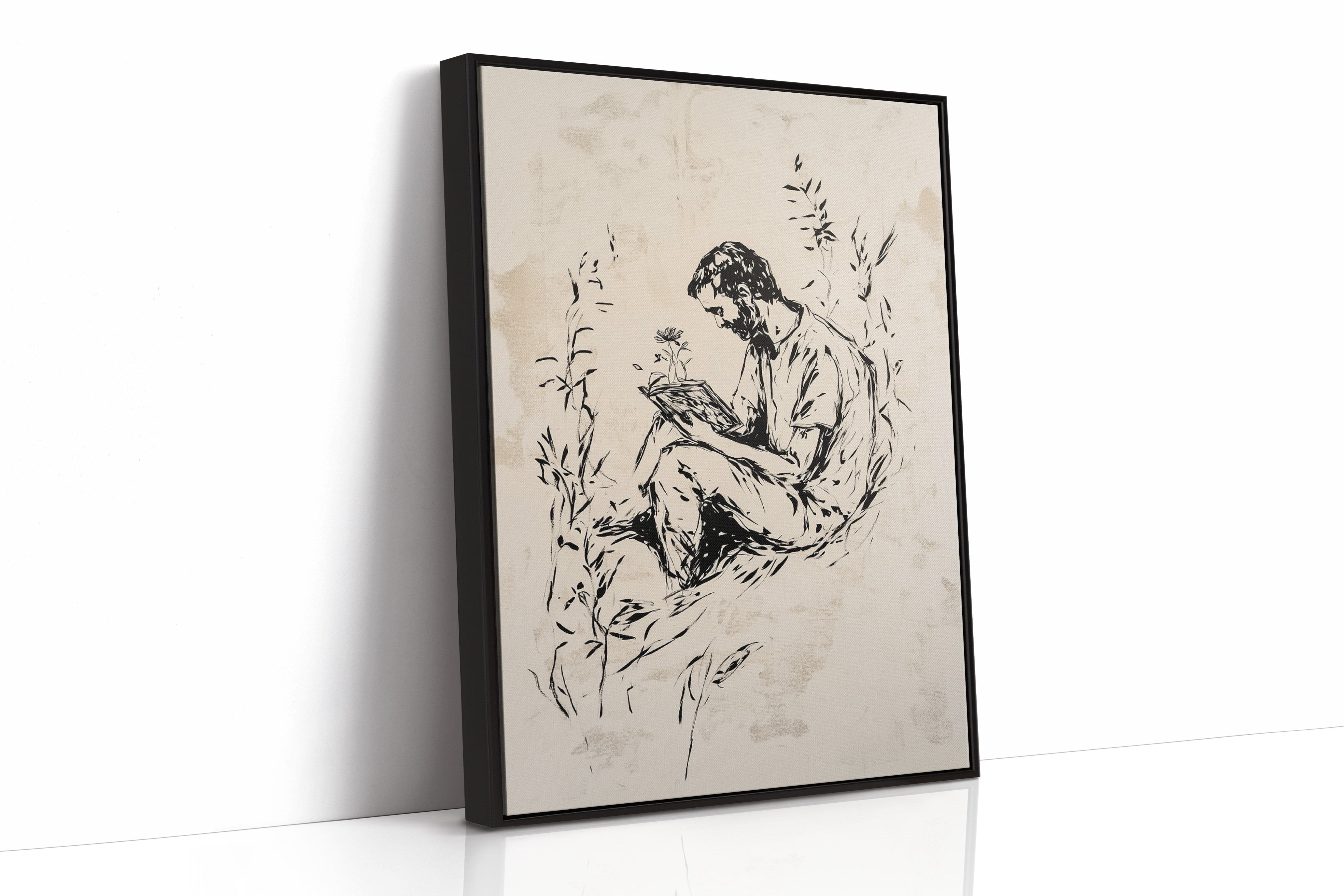 Amid swaying stalks of wild grass, a moment of pure literary escape unfolds in bold brush strokes. The stark contrast of black ink against cream creates a powerful meditation on solitude and contemplation. Gestural lines capture both movement and stillness - the gentle bend of grass stems and the absorbed focus of the reader, while loose, expressive strokes suggest a breeze rustling through the meadow scene. This contemporary ink drawing would bring a sense of peaceful reflection to a reading nook, home library, or any quiet corner meant for moments of introspection.