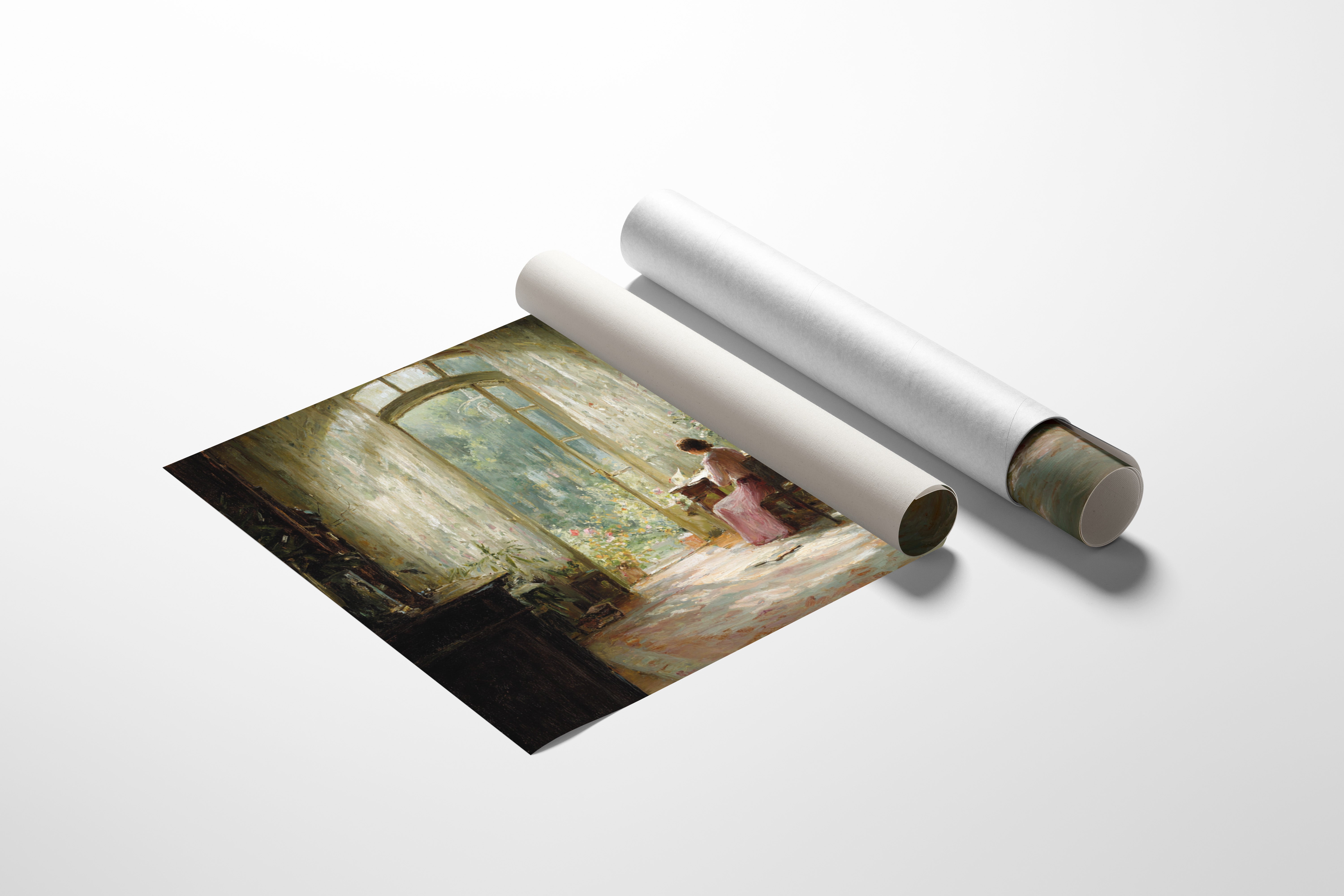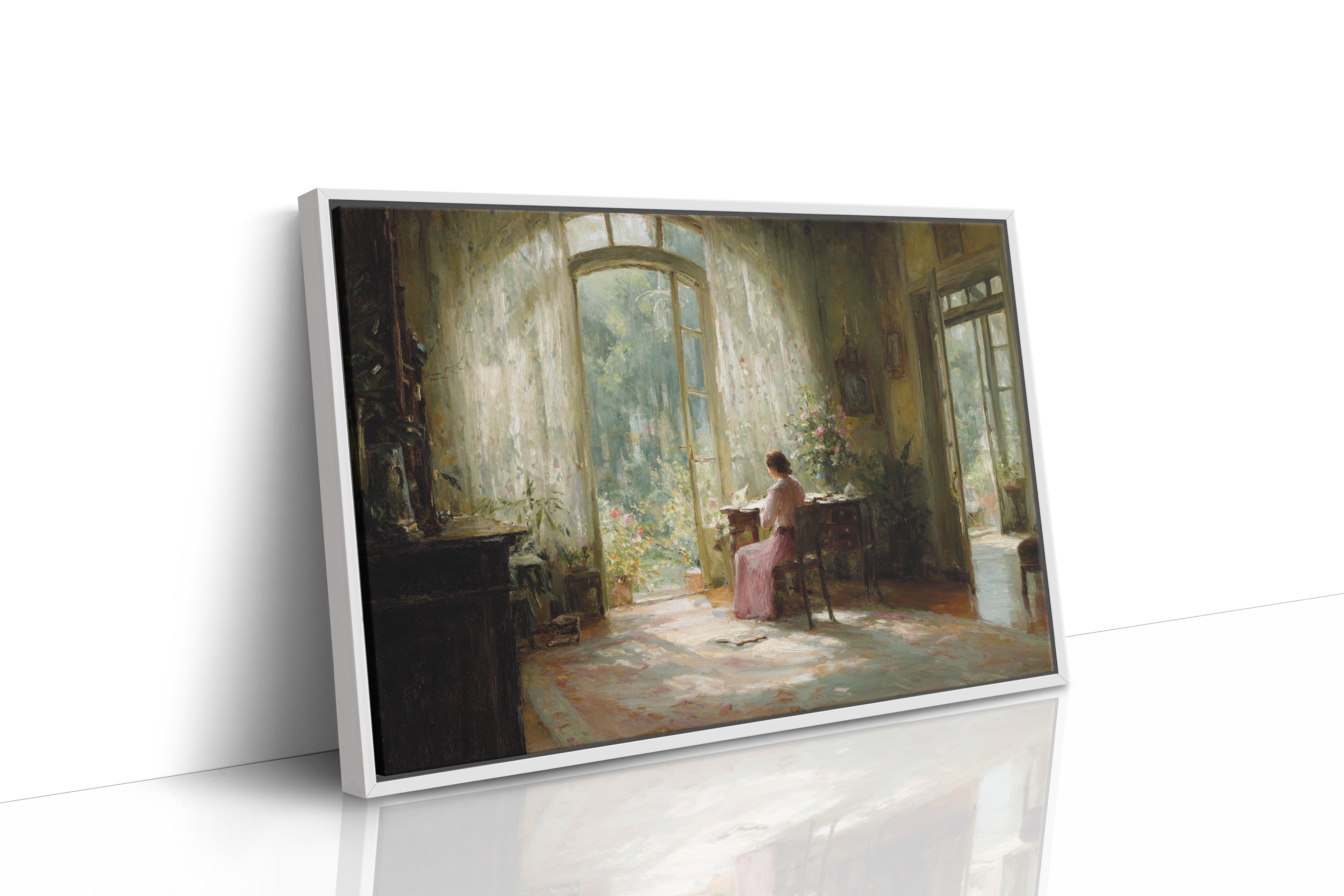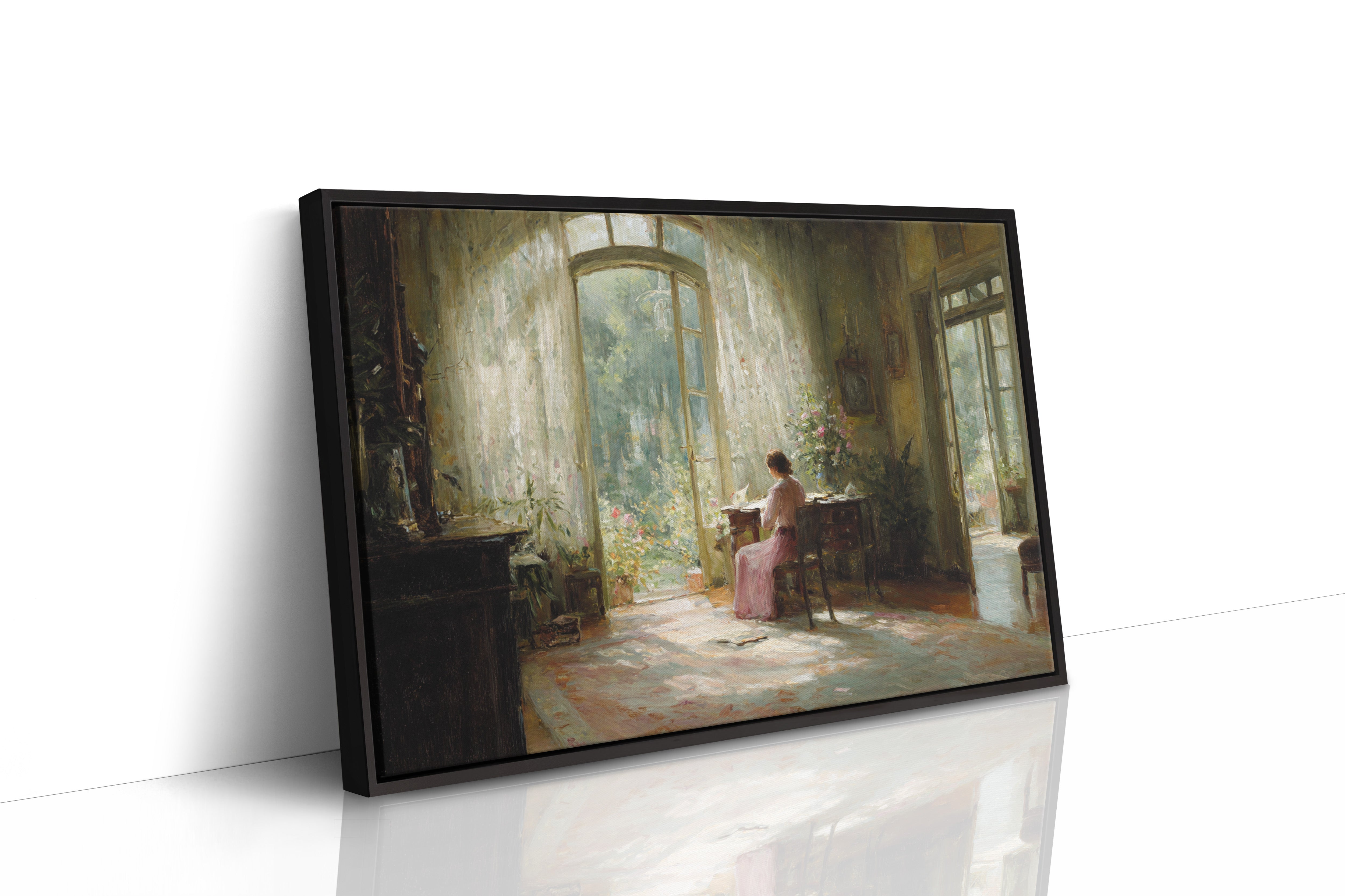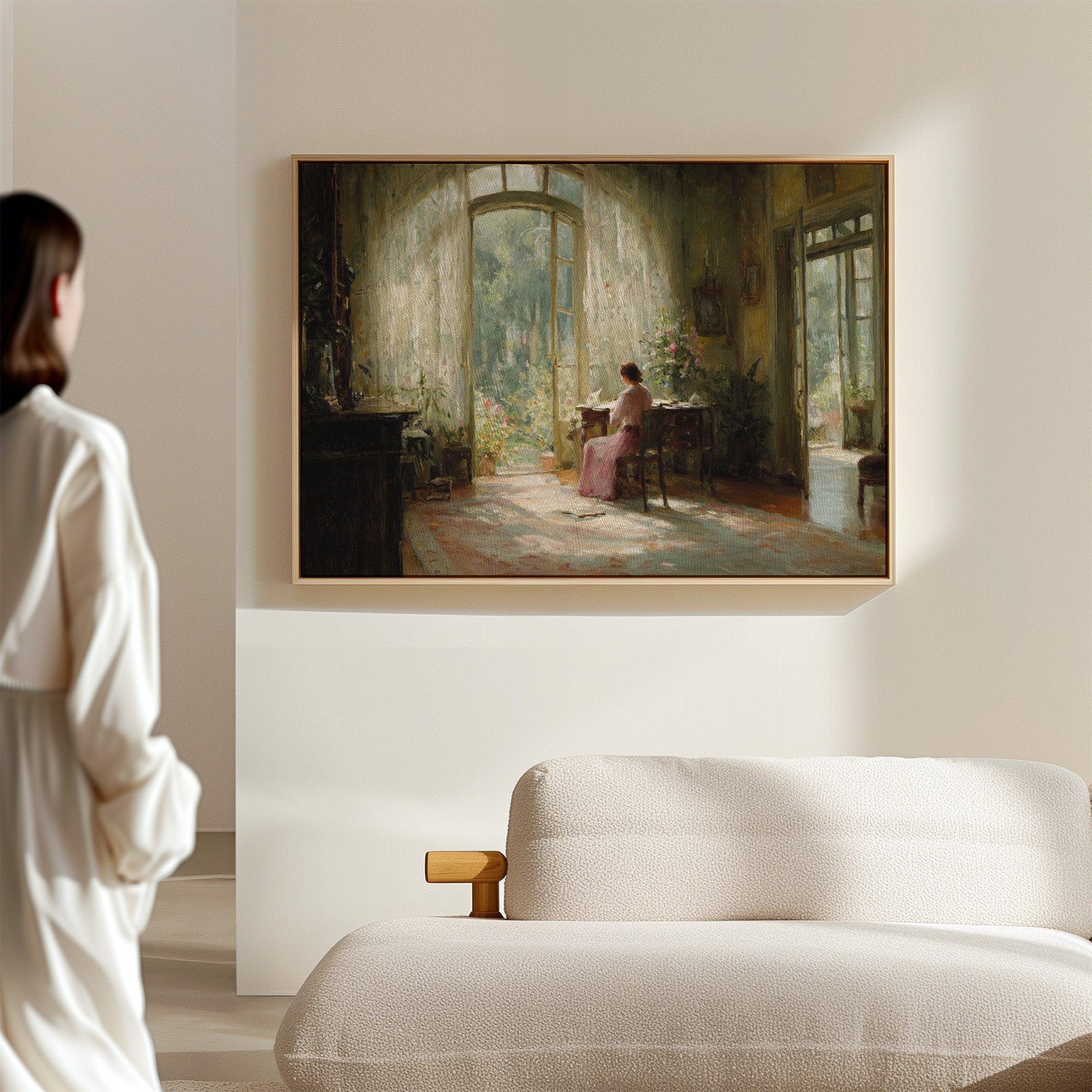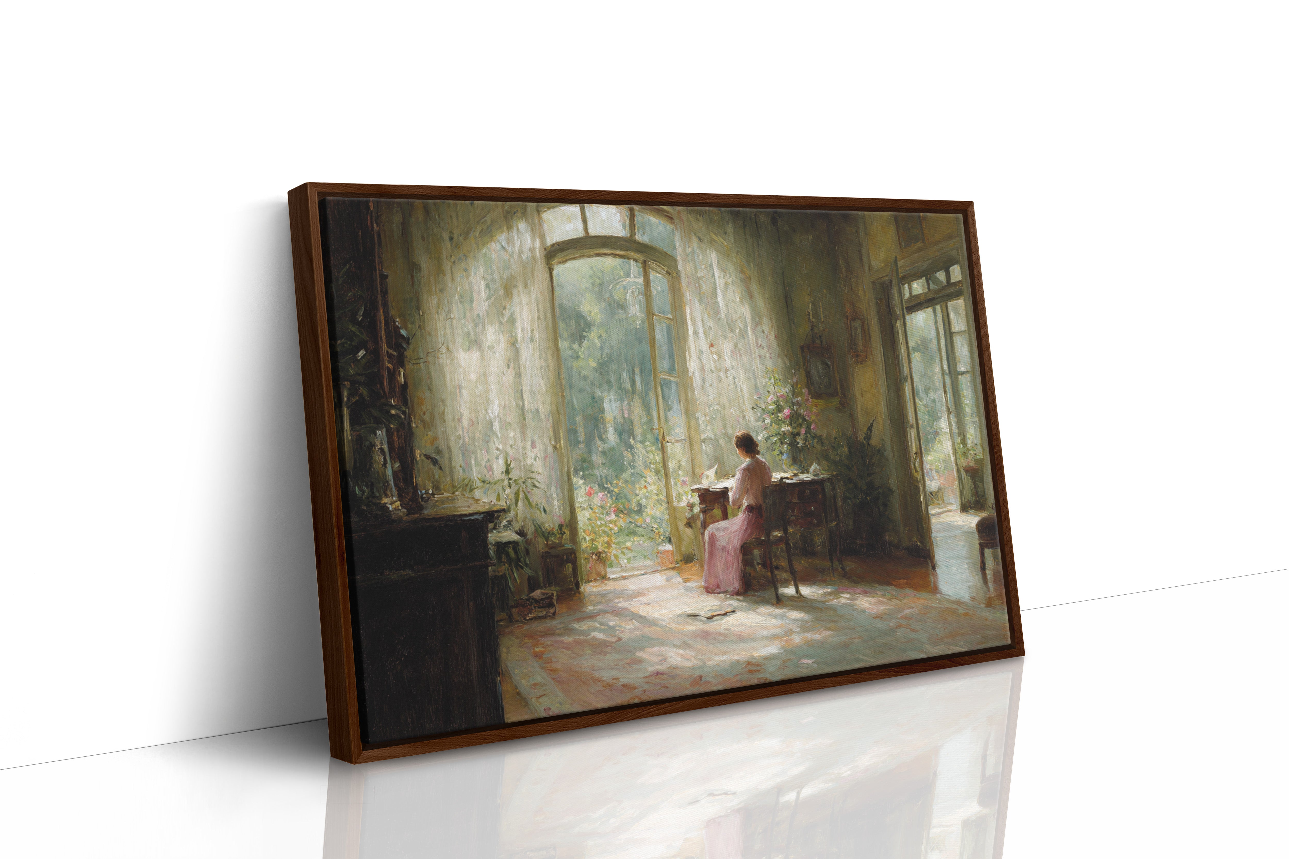 Sunbeams cascade through towering windows, painting the worn marble floors in pools of golden warmth. A solitary figure in rose-colored dress sits at an antique writing desk, surrounded by the gentle chaos of scattered papers and climbing garden vines. The grand salon speaks of faded elegance - its weathered walls and ornate architectural details telling stories of bygone afternoons. Delicate flowers arranged in crystal vases catch the morning light, while french doors open to a glimpse of a verdant garden beyond. This piece brings timeless serenity to a master bedroom, reading nook, or any space where quiet contemplation is cherished.