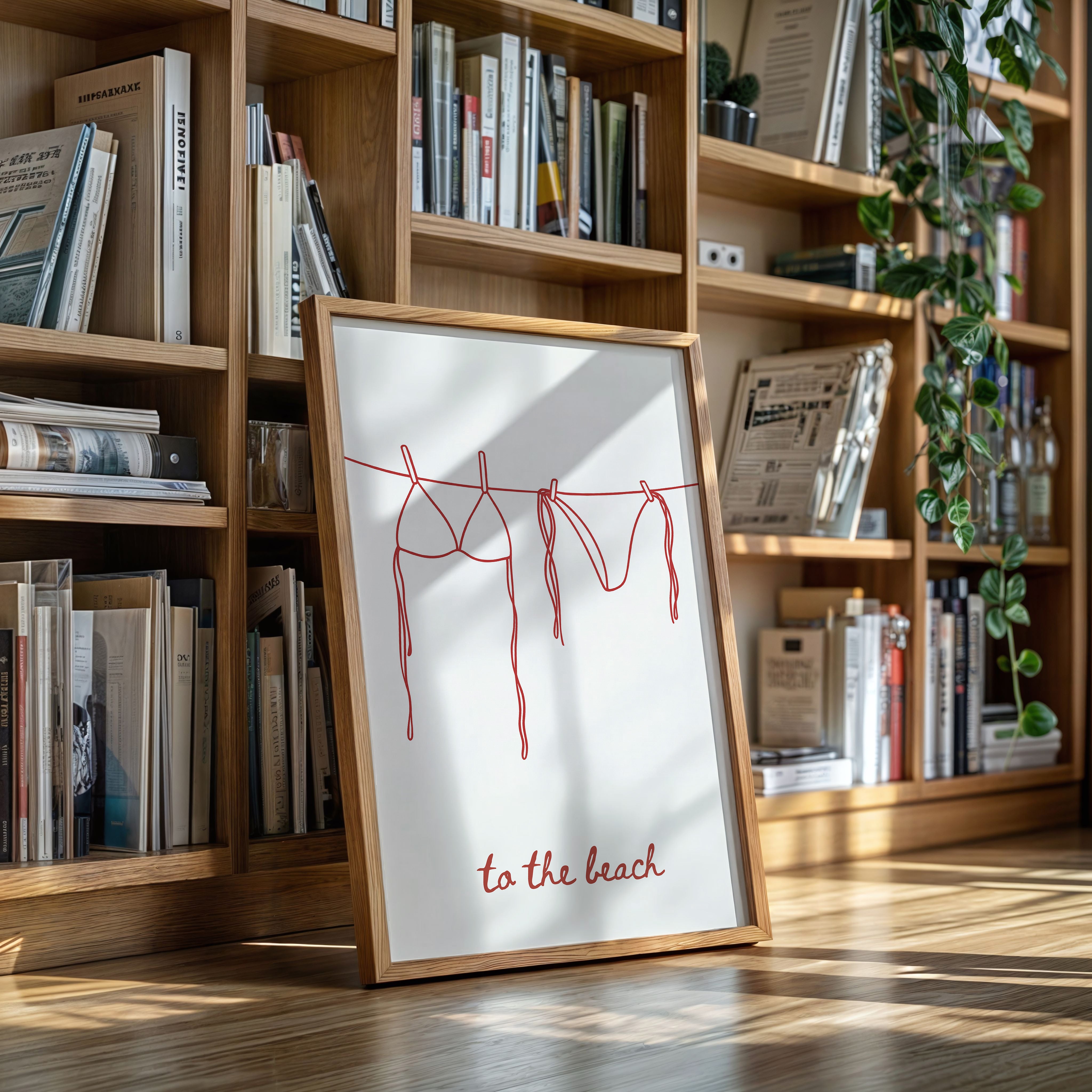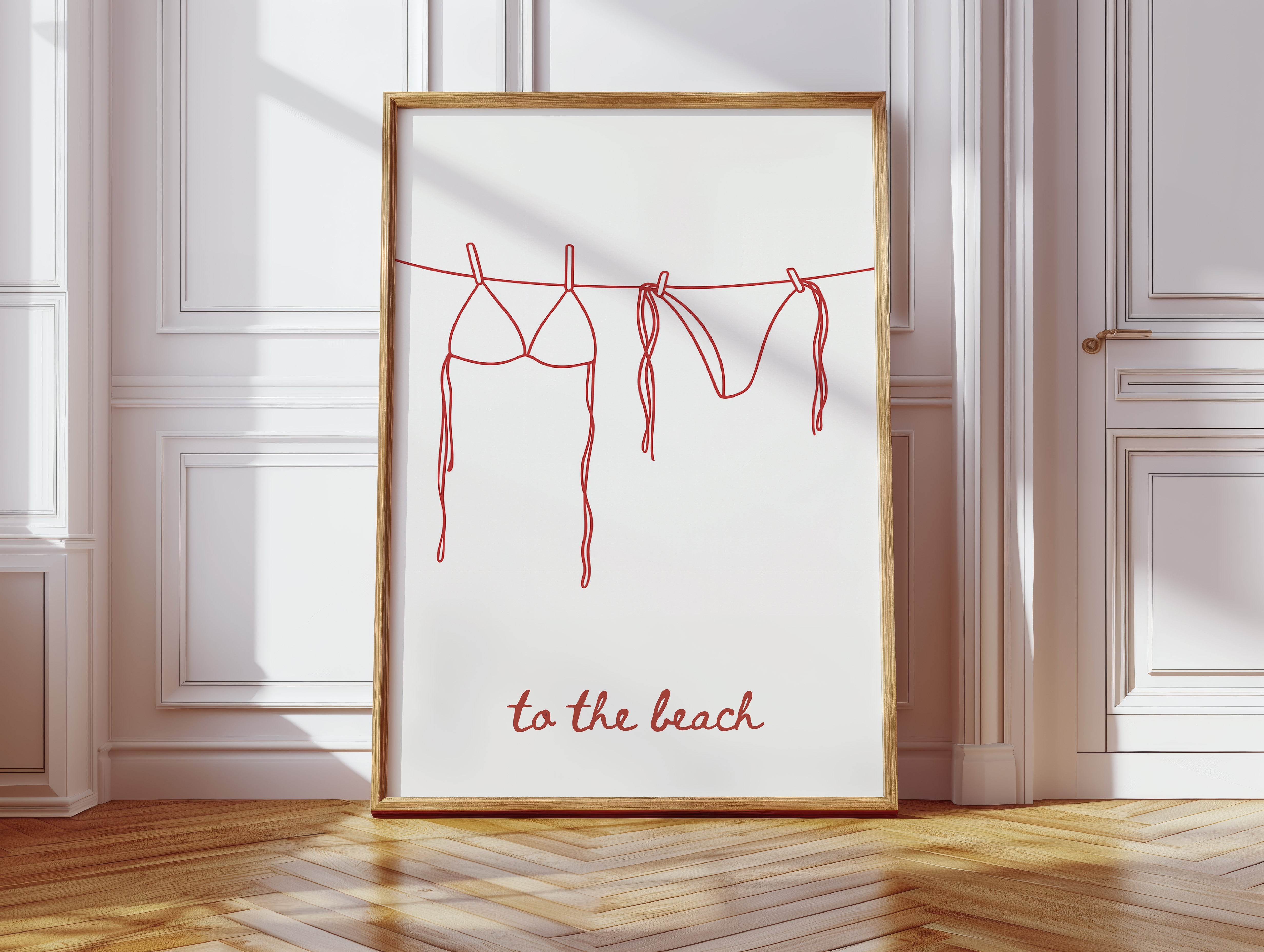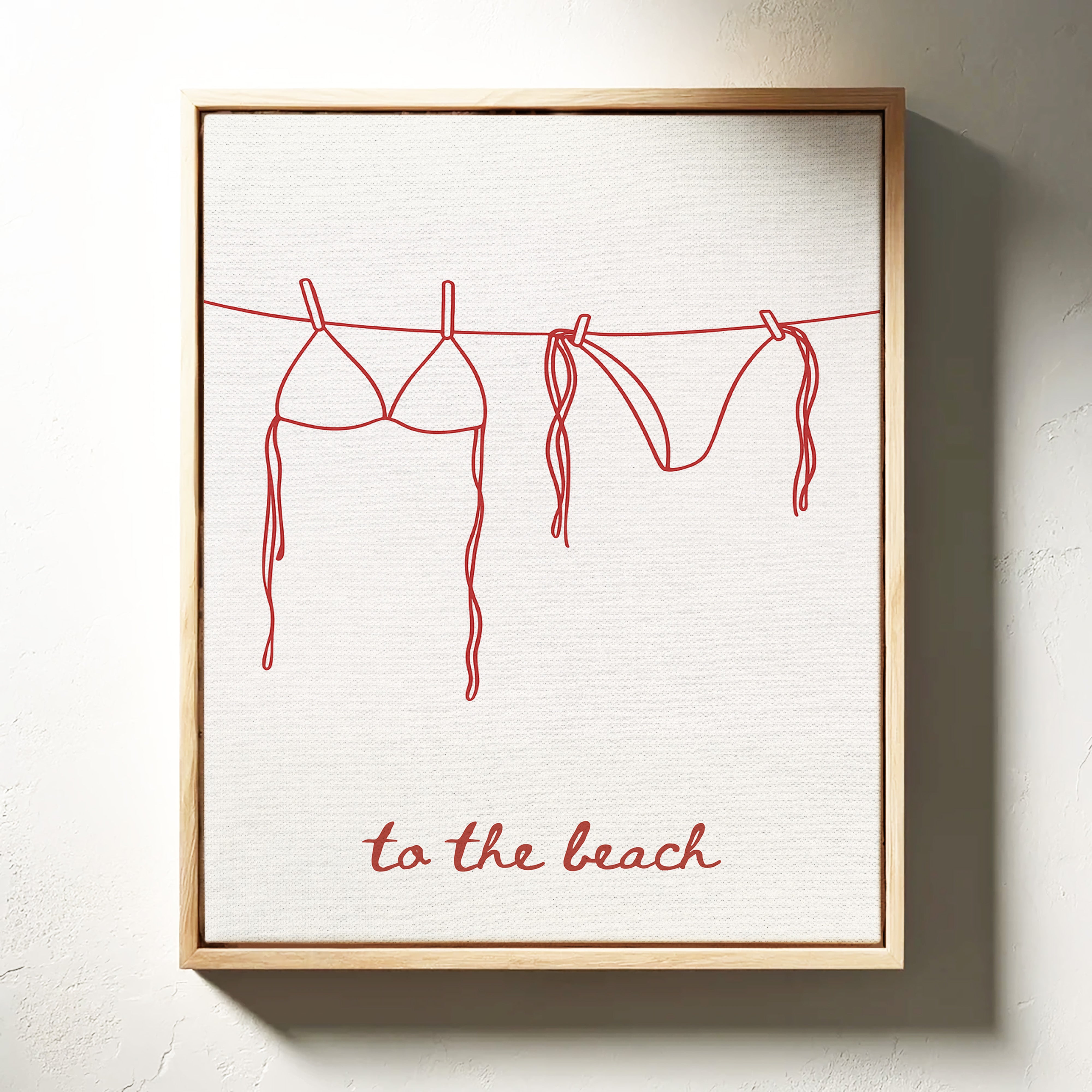 A simple red line drawing captures the essence of carefree beach days, with a bikini and swim bottoms hanging from a clothesline. The minimalist illustration speaks of sun-soaked memories and salty breezes, rendered in confident, continuous strokes. The playful handwritten text ""to the beach"" anchors the composition, adding a touch of whimsy to the clean design. This piece brings a fresh, modern take on coastal living while maintaining an effortless sophistication.