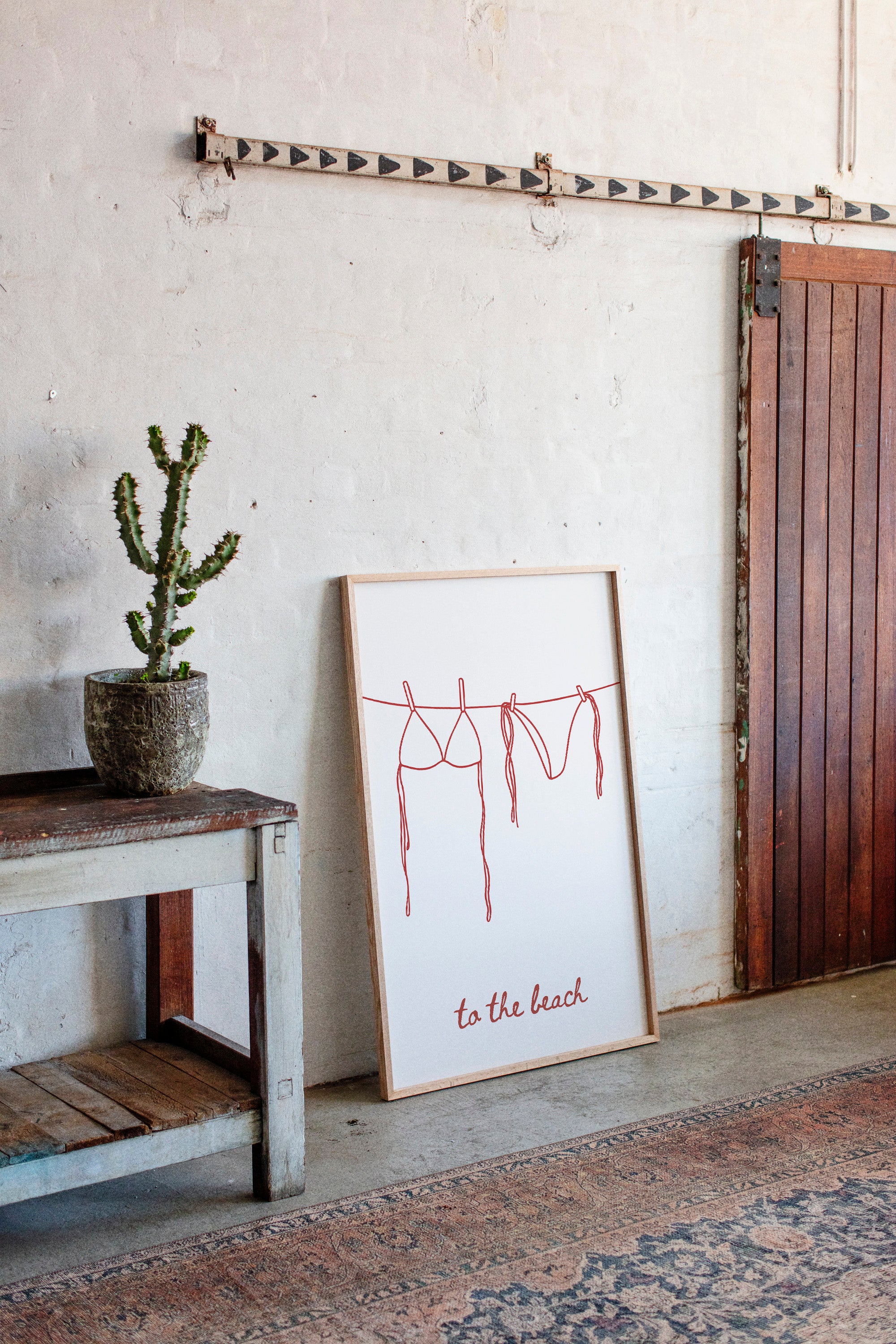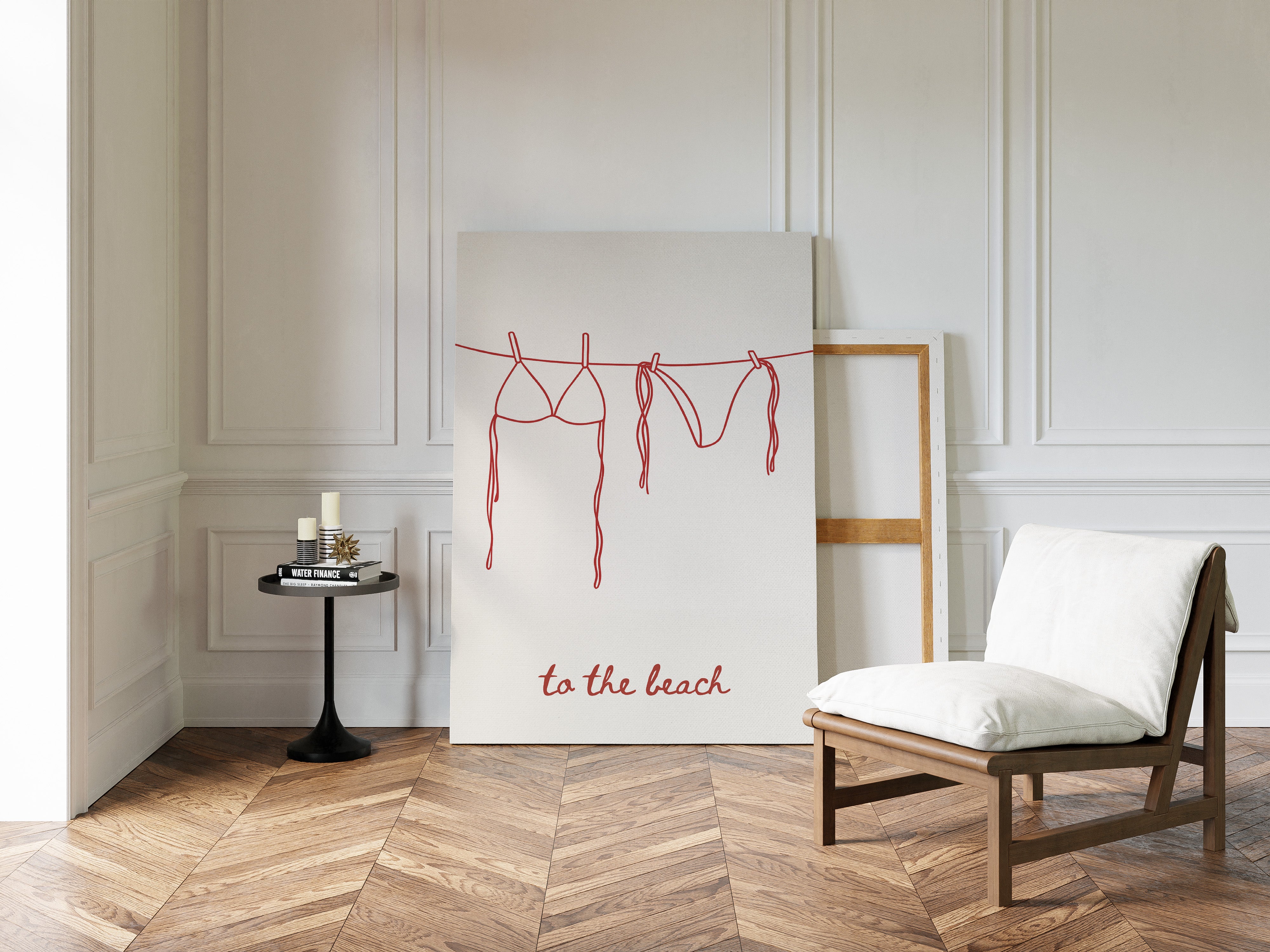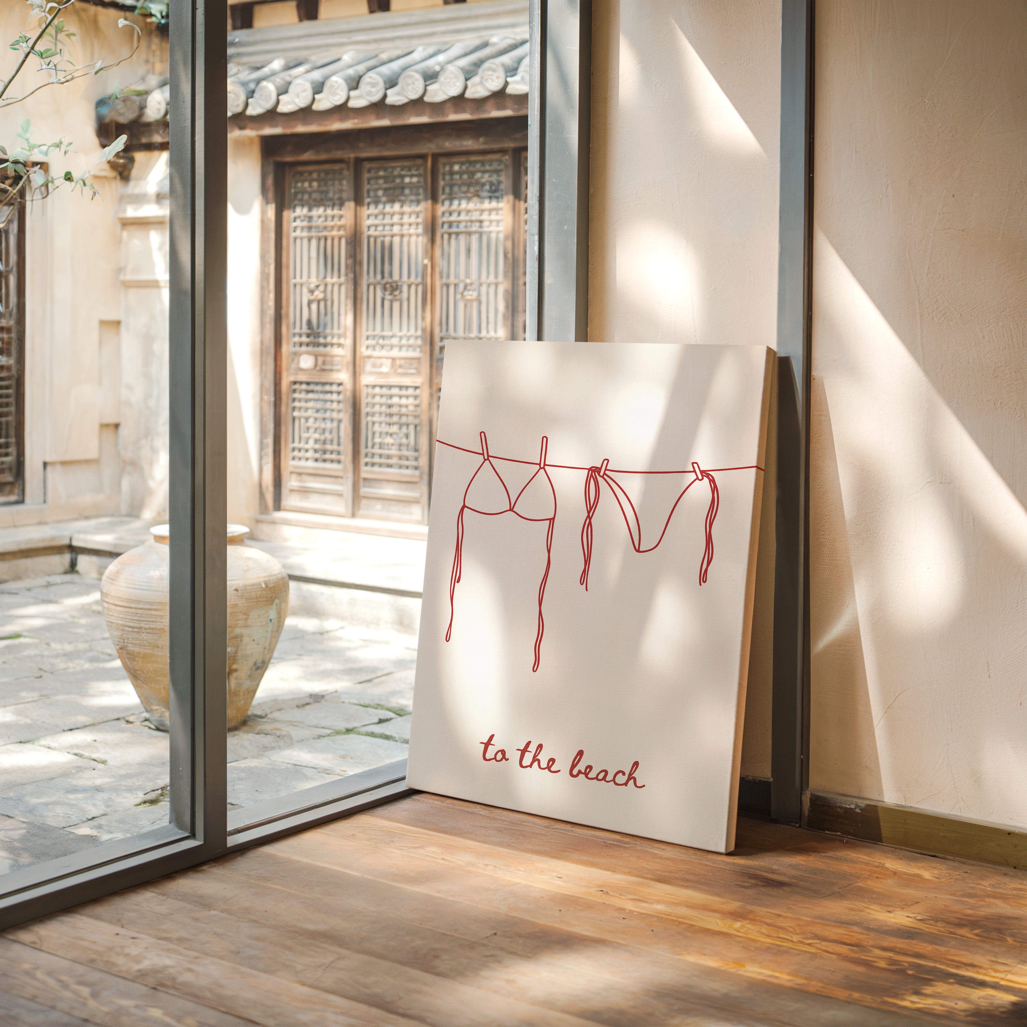 A simple red line drawing captures the essence of carefree beach days, with a bikini and swim bottoms hanging from a clothesline. The minimalist illustration speaks of sun-soaked memories and salty breezes, rendered in confident, continuous strokes. The playful handwritten text ""to the beach"" anchors the composition, adding a touch of whimsy to the clean design. This piece brings a fresh, modern take on coastal living while maintaining an effortless sophistication.