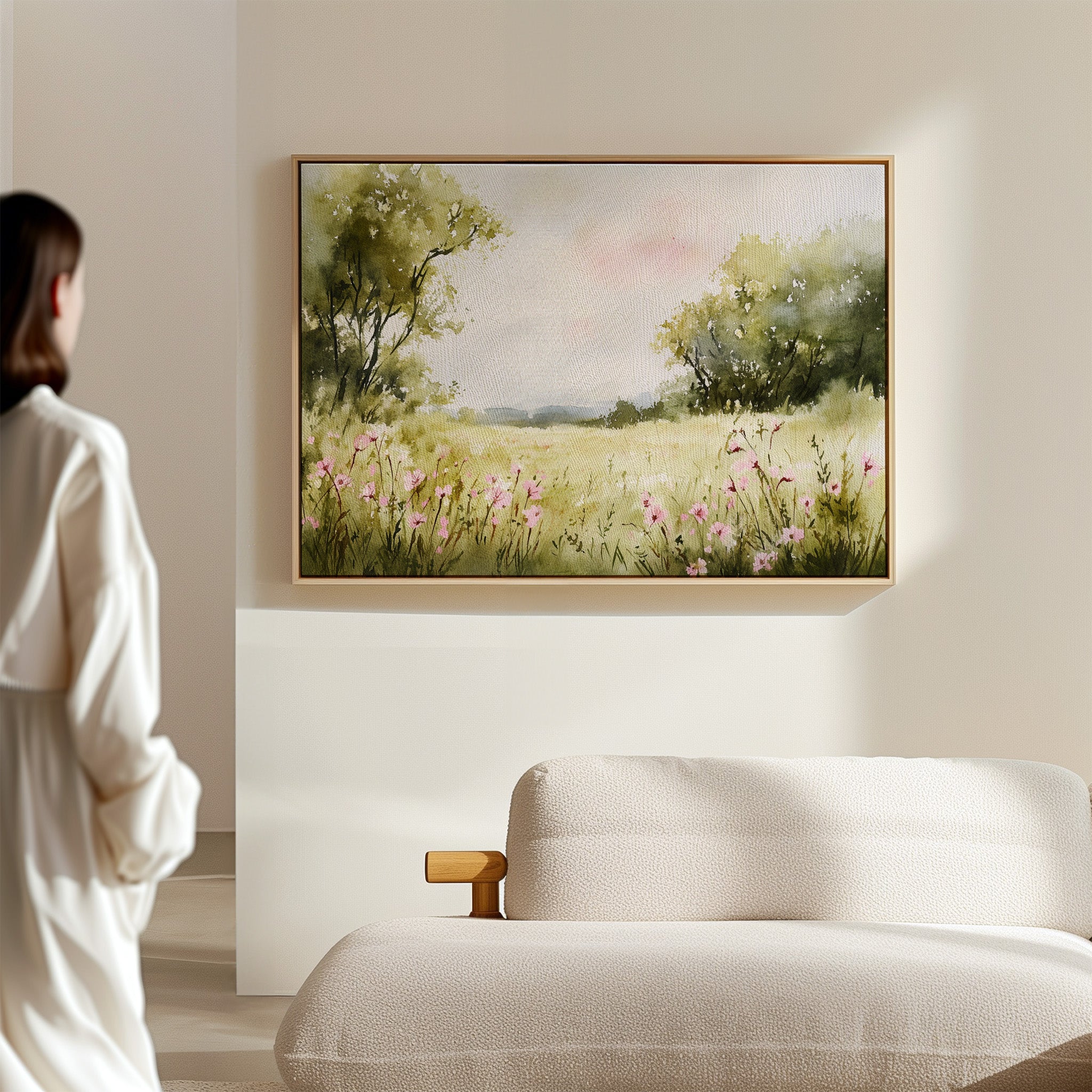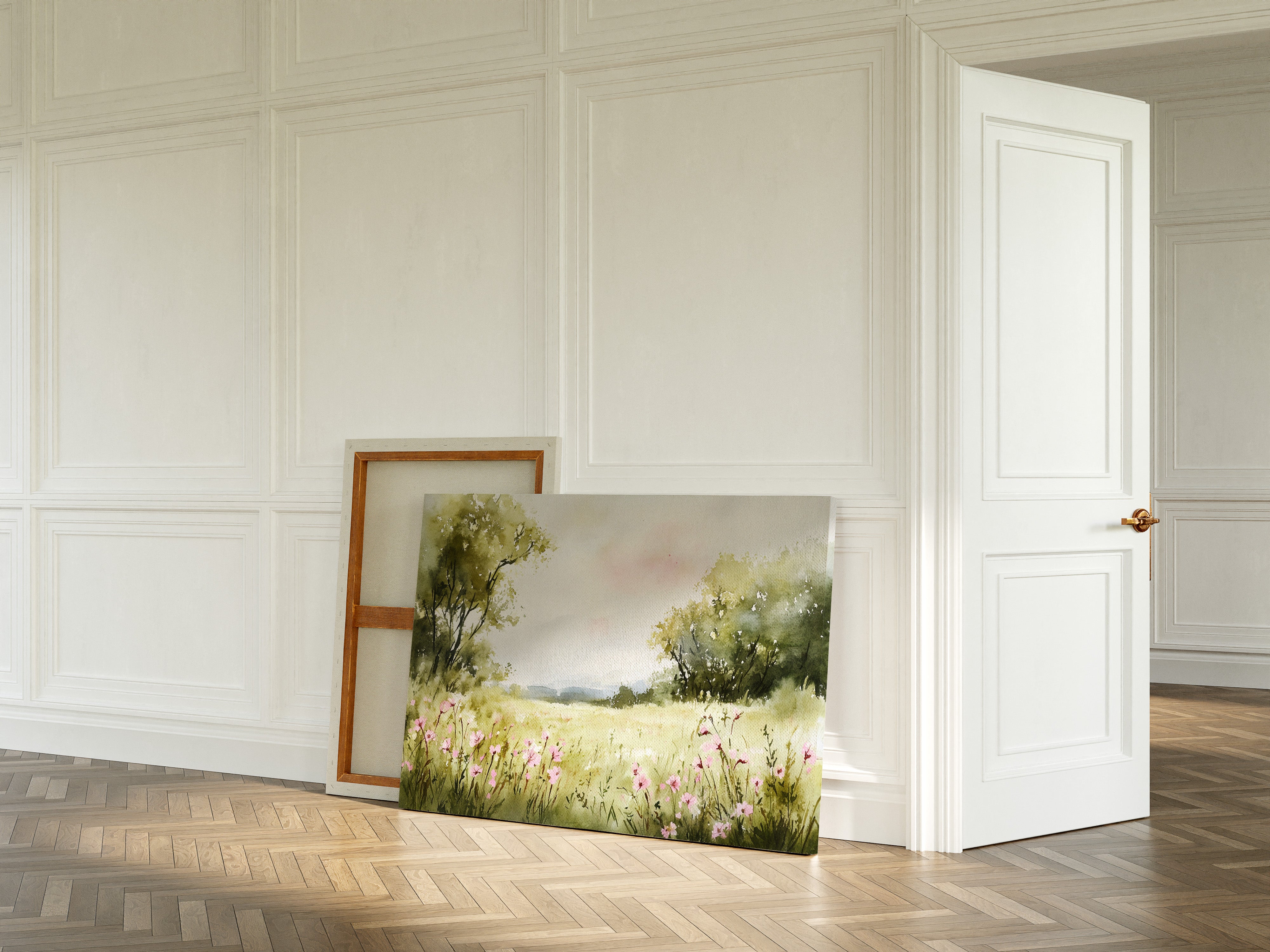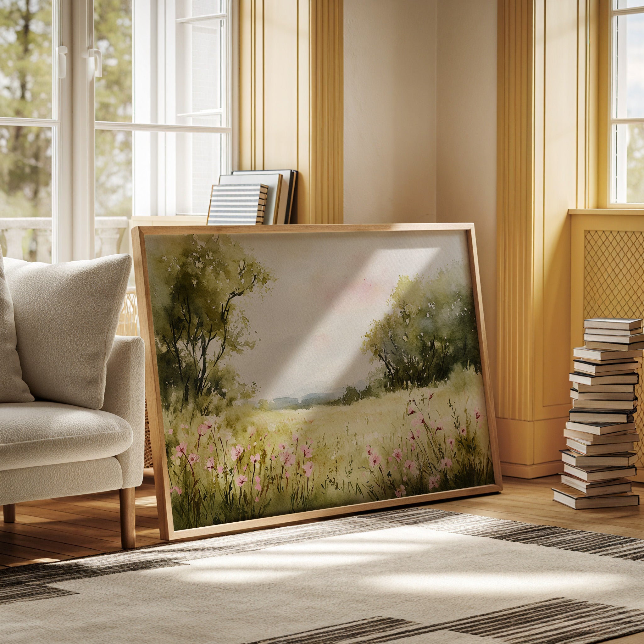 Delicate pink wildflowers dance along the edges of a sun-warmed meadow, their petals catching the soft morning light. The watercolor scene unfolds in gentle olive and sage tones, with trees framing a distant mountain vista in misty blues. Each brushstroke captures the essence of a perfect summer day, where tall grasses sway and wild blooms reach skyward in nature's elegant choreography. This tranquil landscape would bring a sense of pastoral serenity to a reading nook or bedroom sanctuary, creating a window into a peaceful countryside moment.