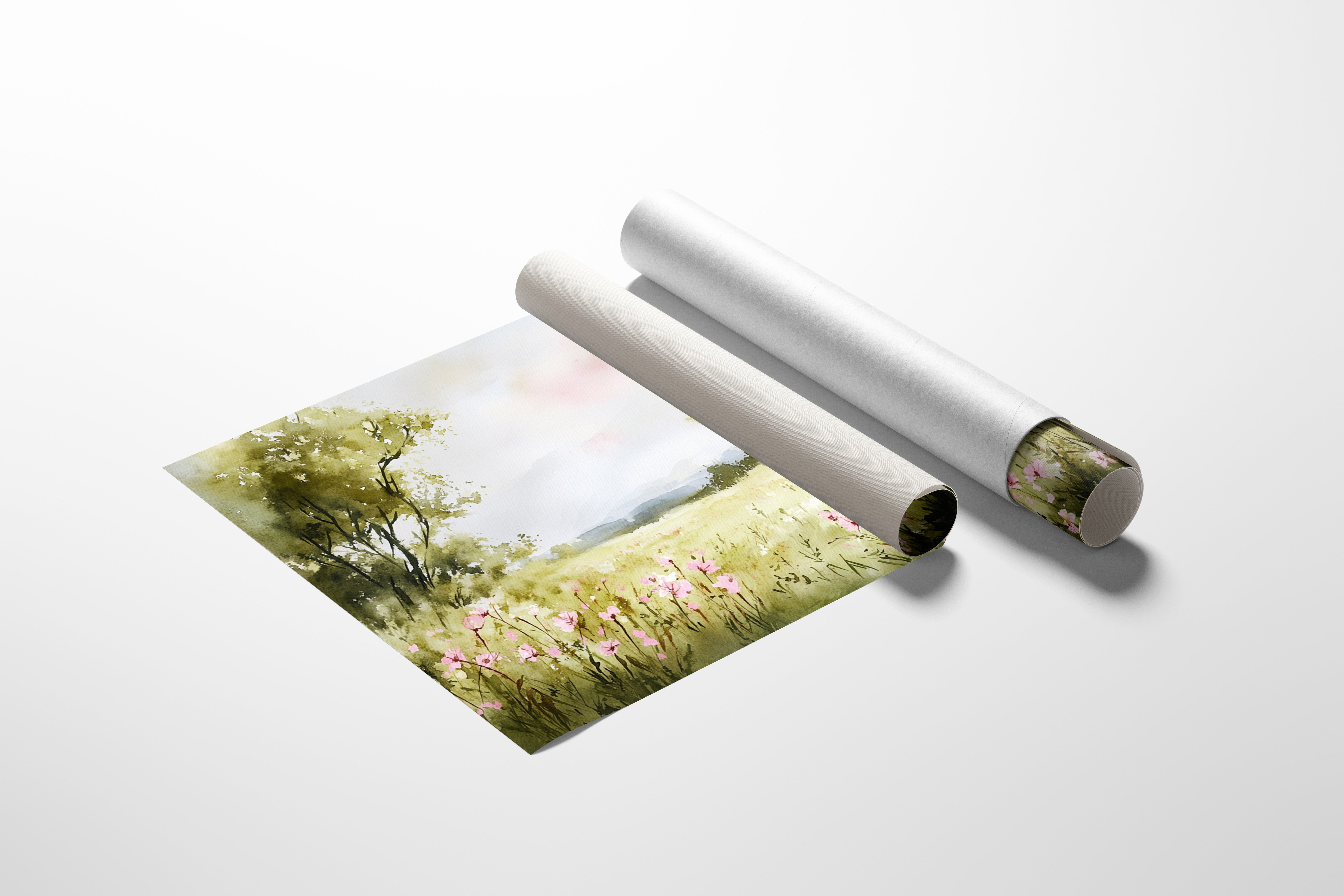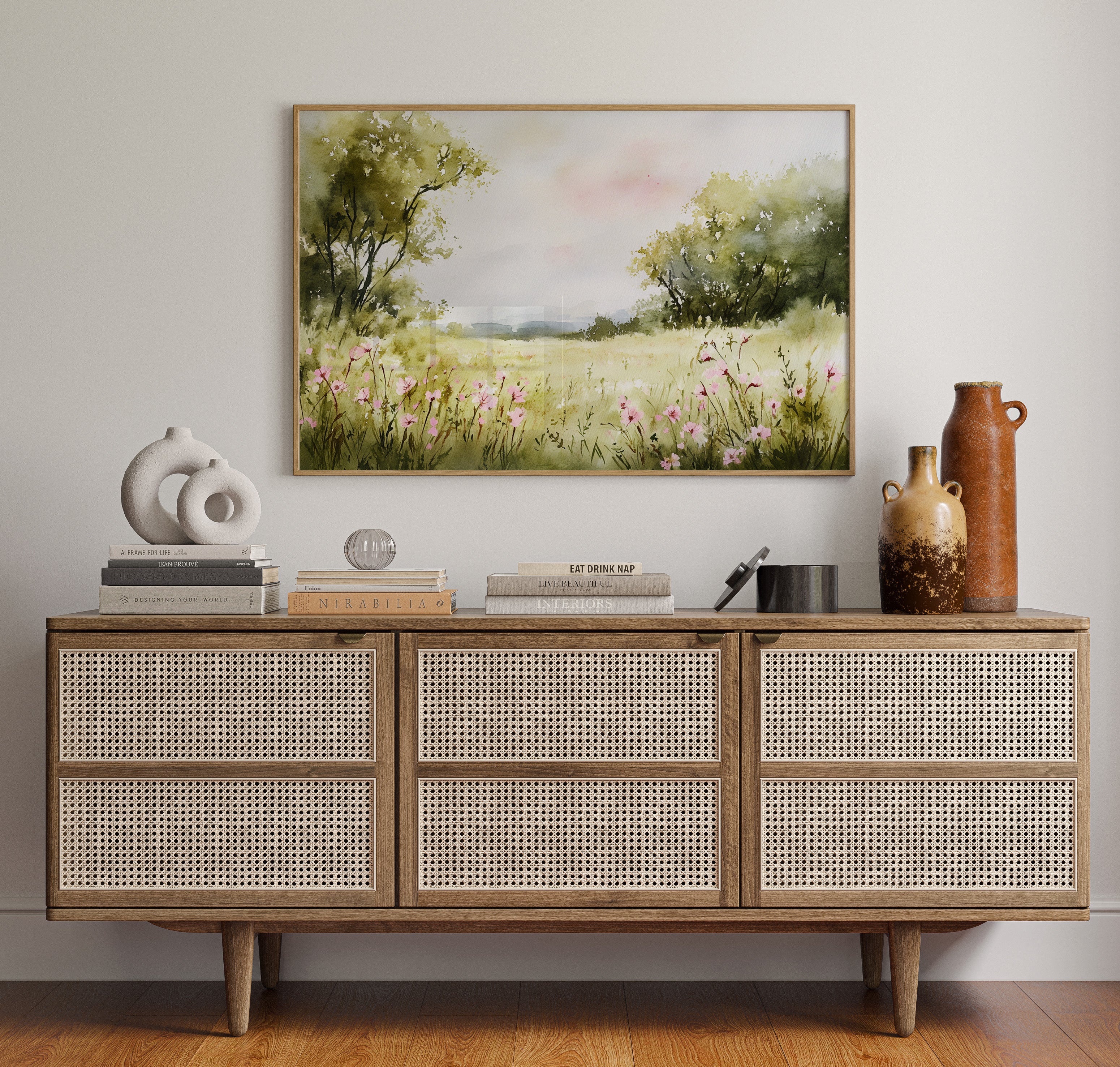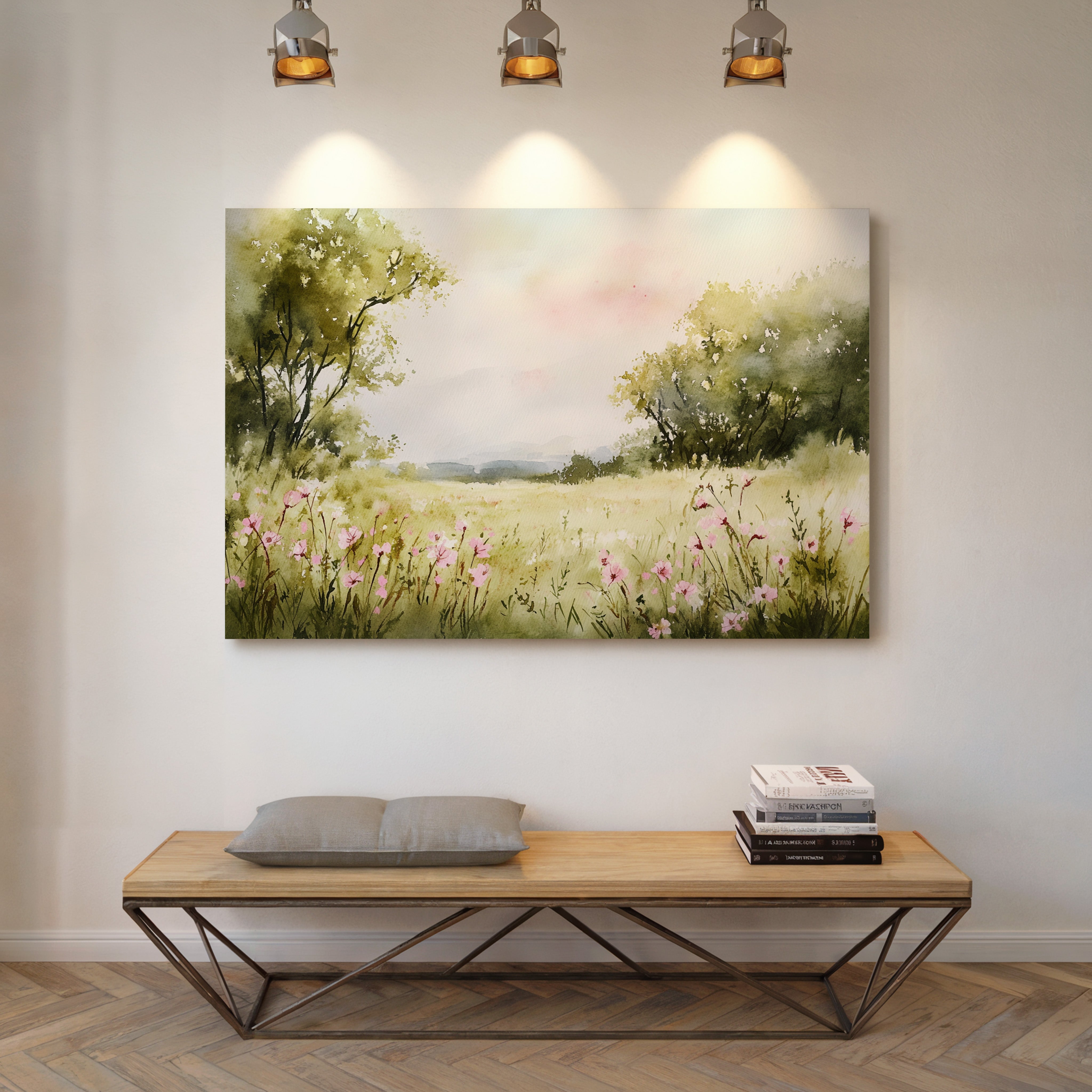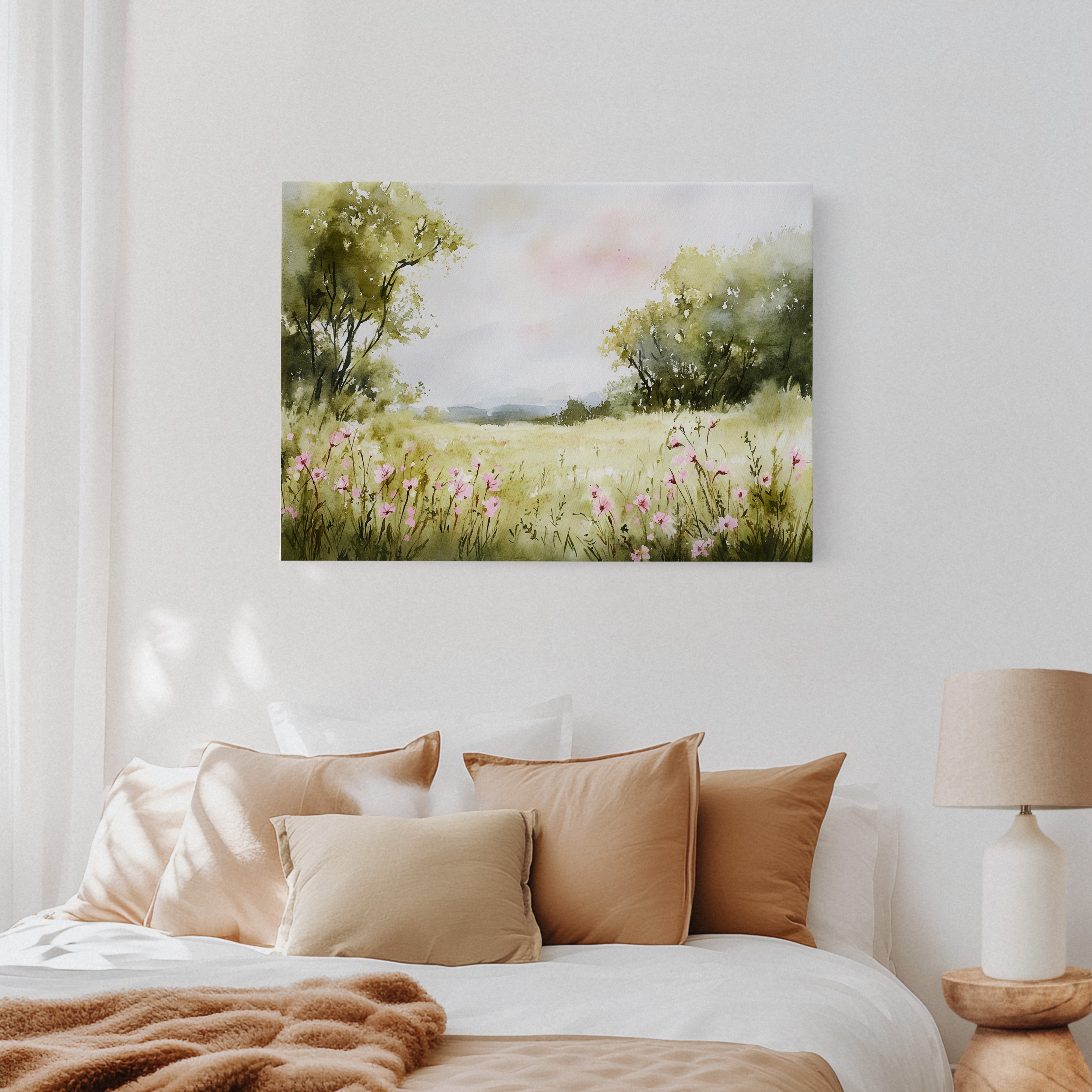 Delicate pink wildflowers dance along the edges of a sun-warmed meadow, their petals catching the soft morning light. The watercolor scene unfolds in gentle olive and sage tones, with trees framing a distant mountain vista in misty blues. Each brushstroke captures the essence of a perfect summer day, where tall grasses sway and wild blooms reach skyward in nature's elegant choreography. This tranquil landscape would bring a sense of pastoral serenity to a reading nook or bedroom sanctuary, creating a window into a peaceful countryside moment.