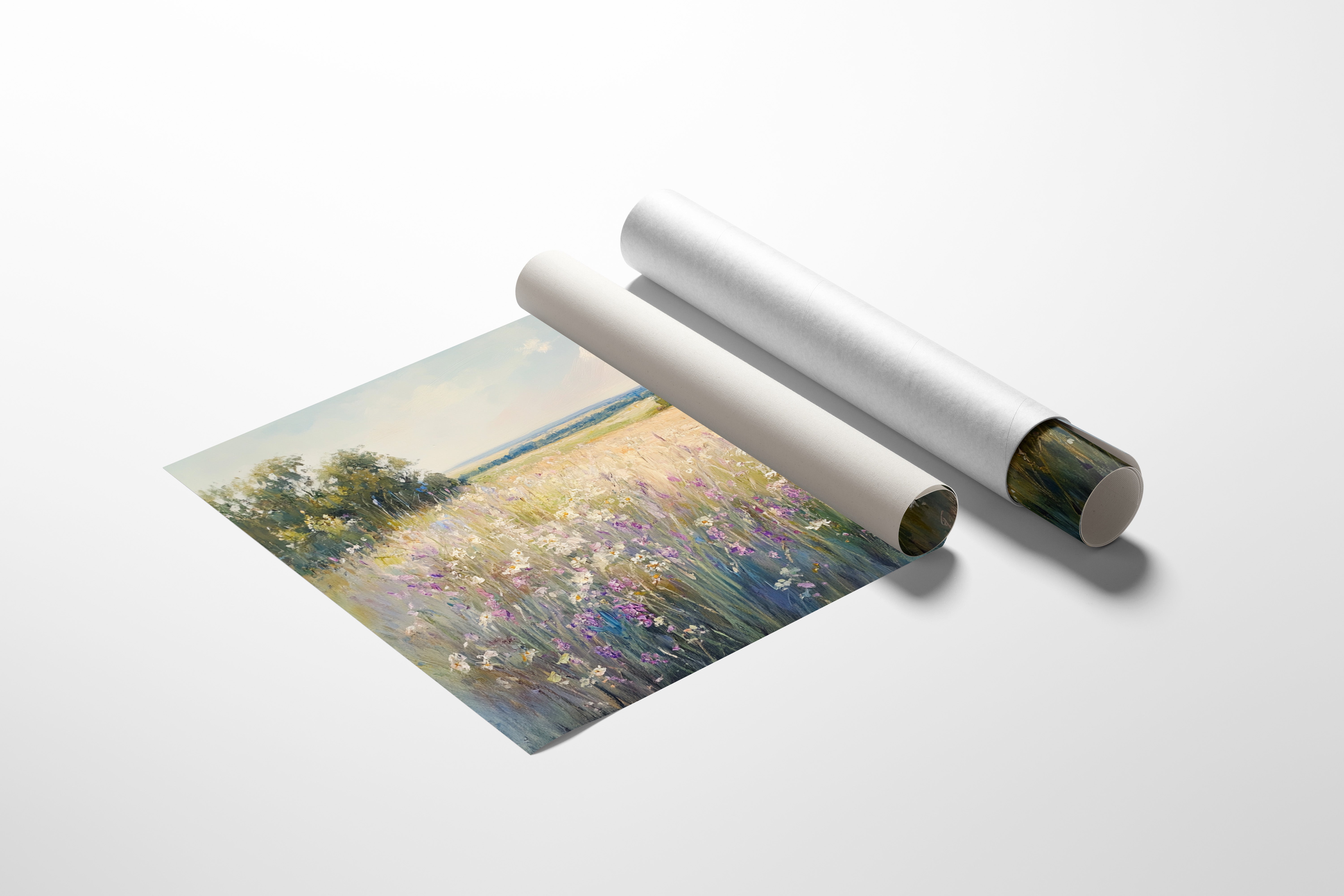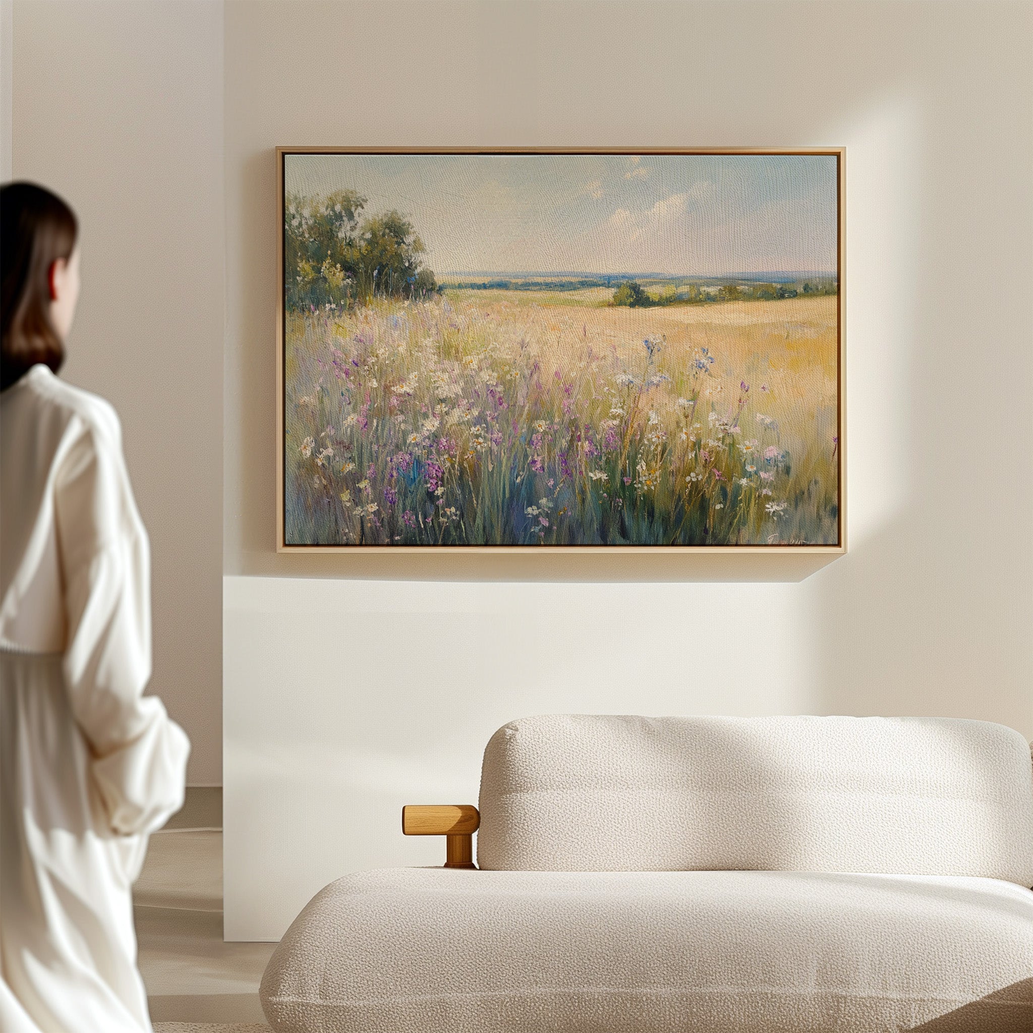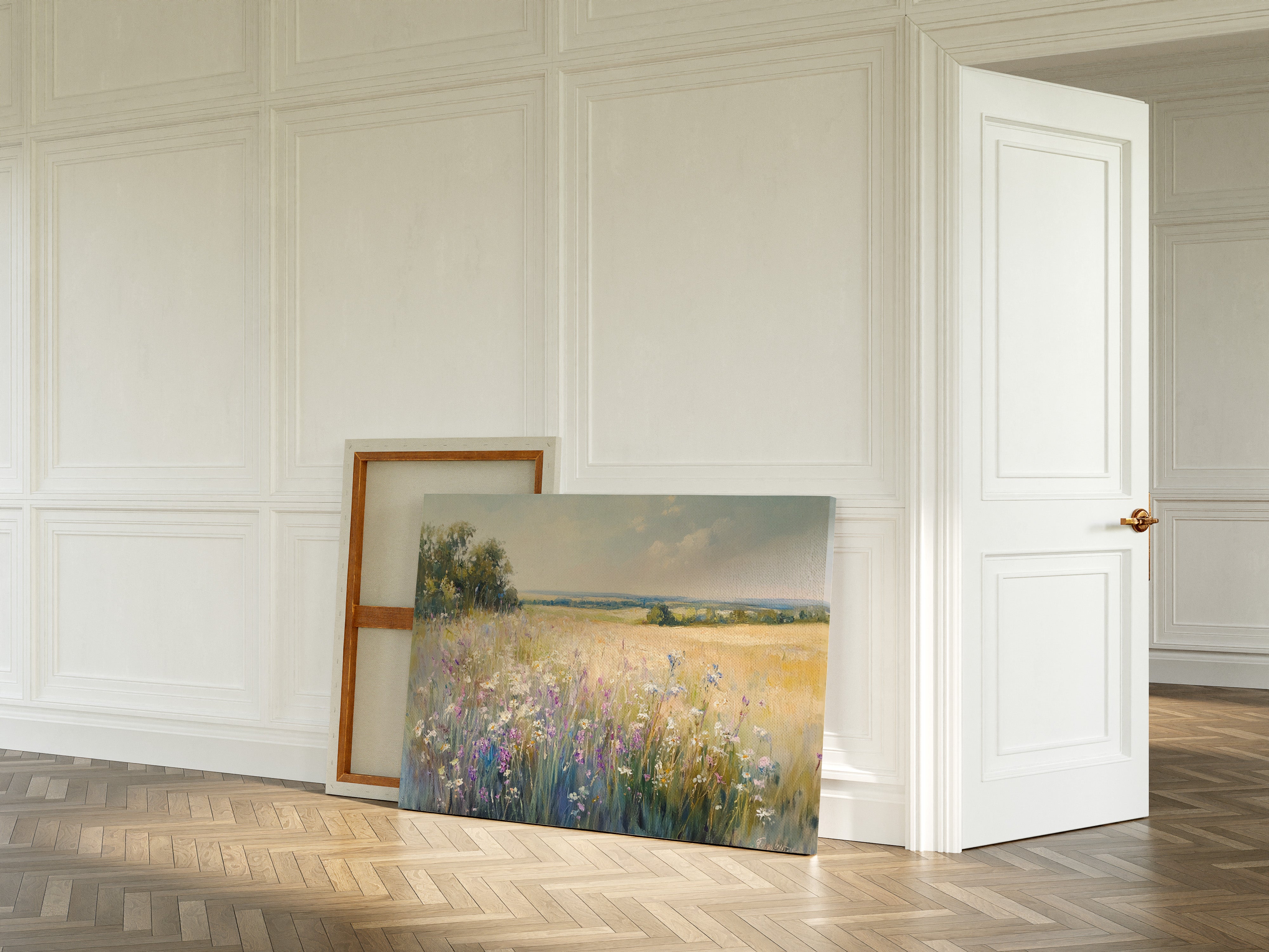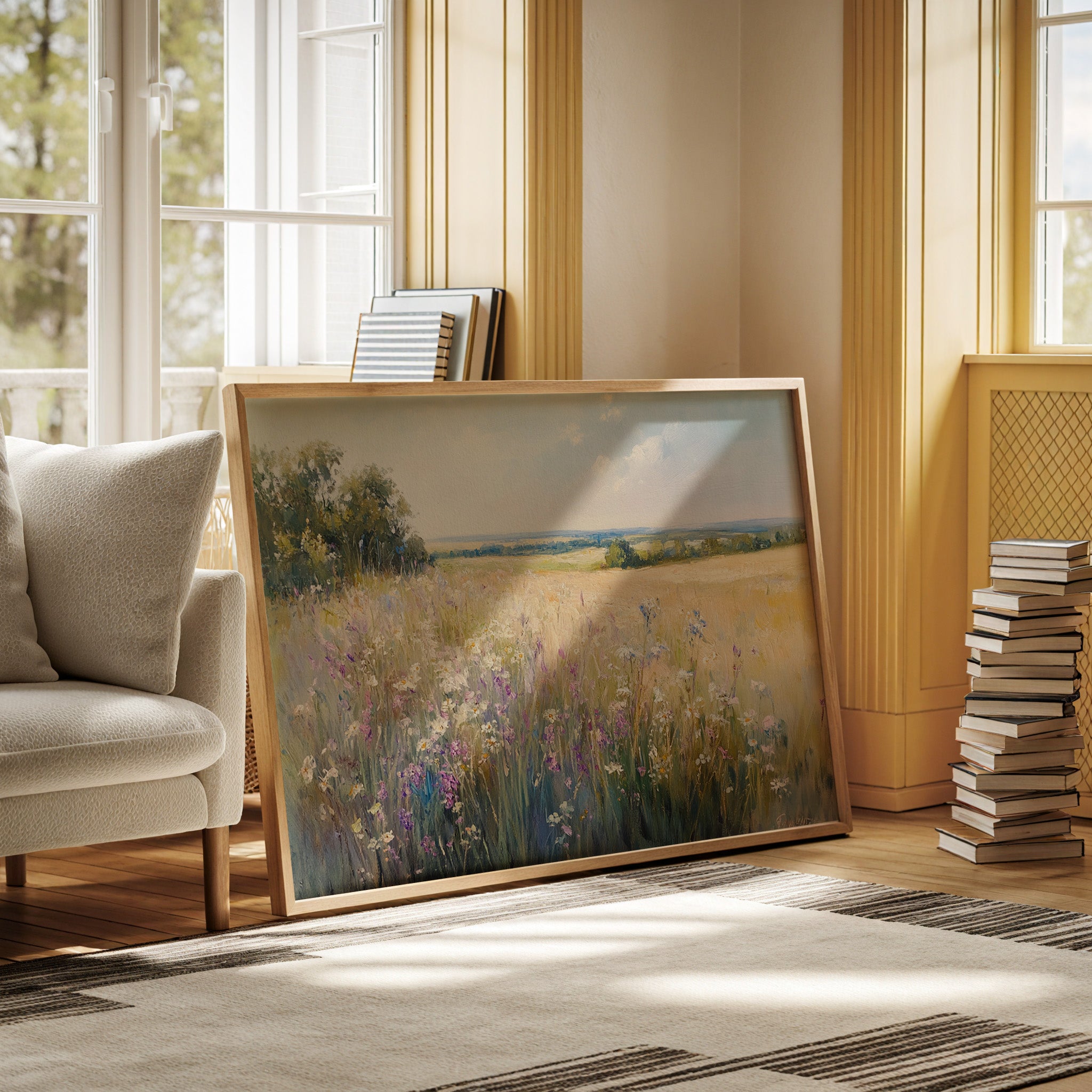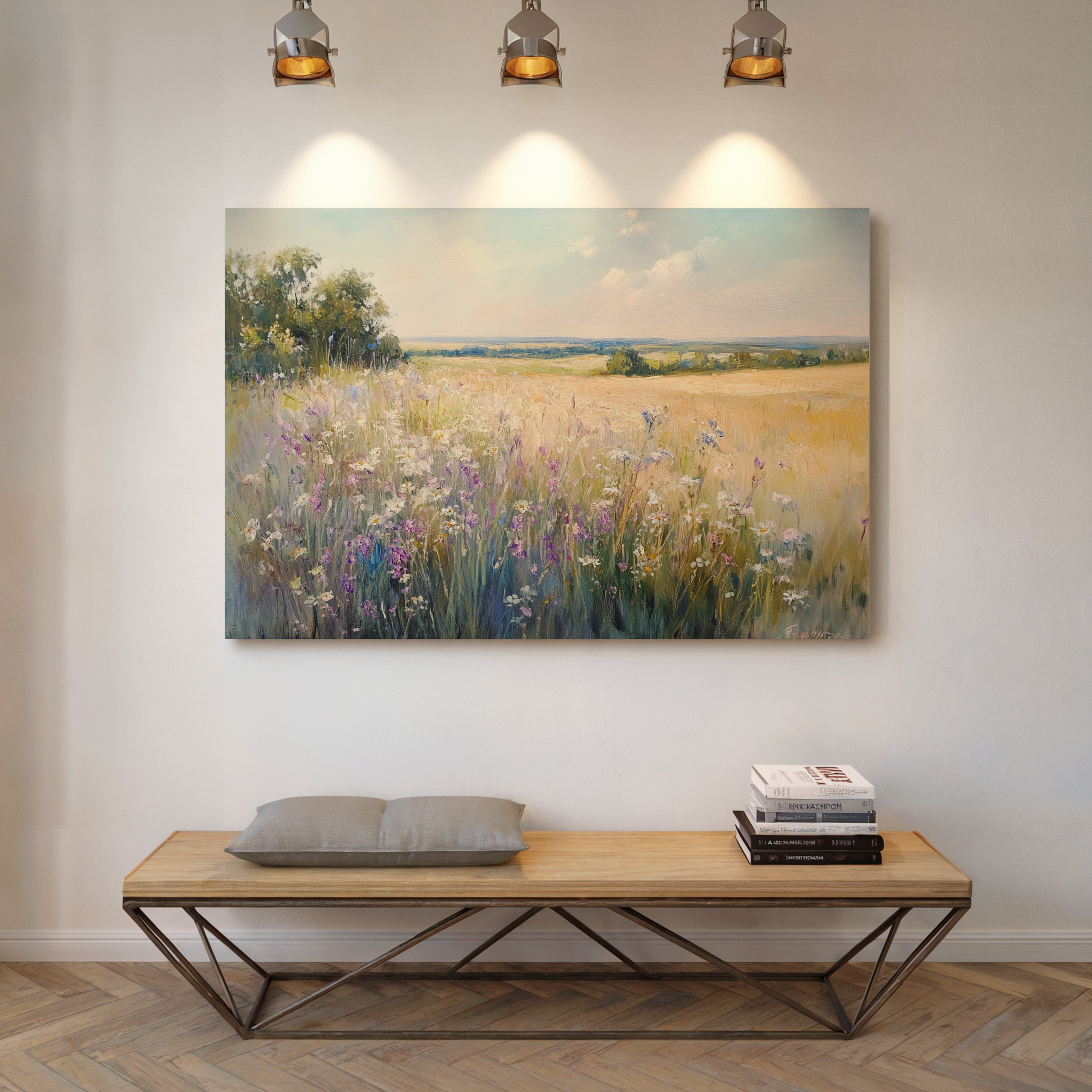 Golden light bathes a wild meadow where daisies and purple wildflowers dance in the gentle breeze. The pastoral landscape stretches endlessly toward the horizon, where rolling hills meet a soft, cloud-kissed sky. Delicate brushstrokes capture the ethereal quality of tall grasses swaying among the blooms, while touches of blue and lavender create depth in the foreground flora. The scene evokes memories of languid summer afternoons when time moves as slowly as drifting clouds.