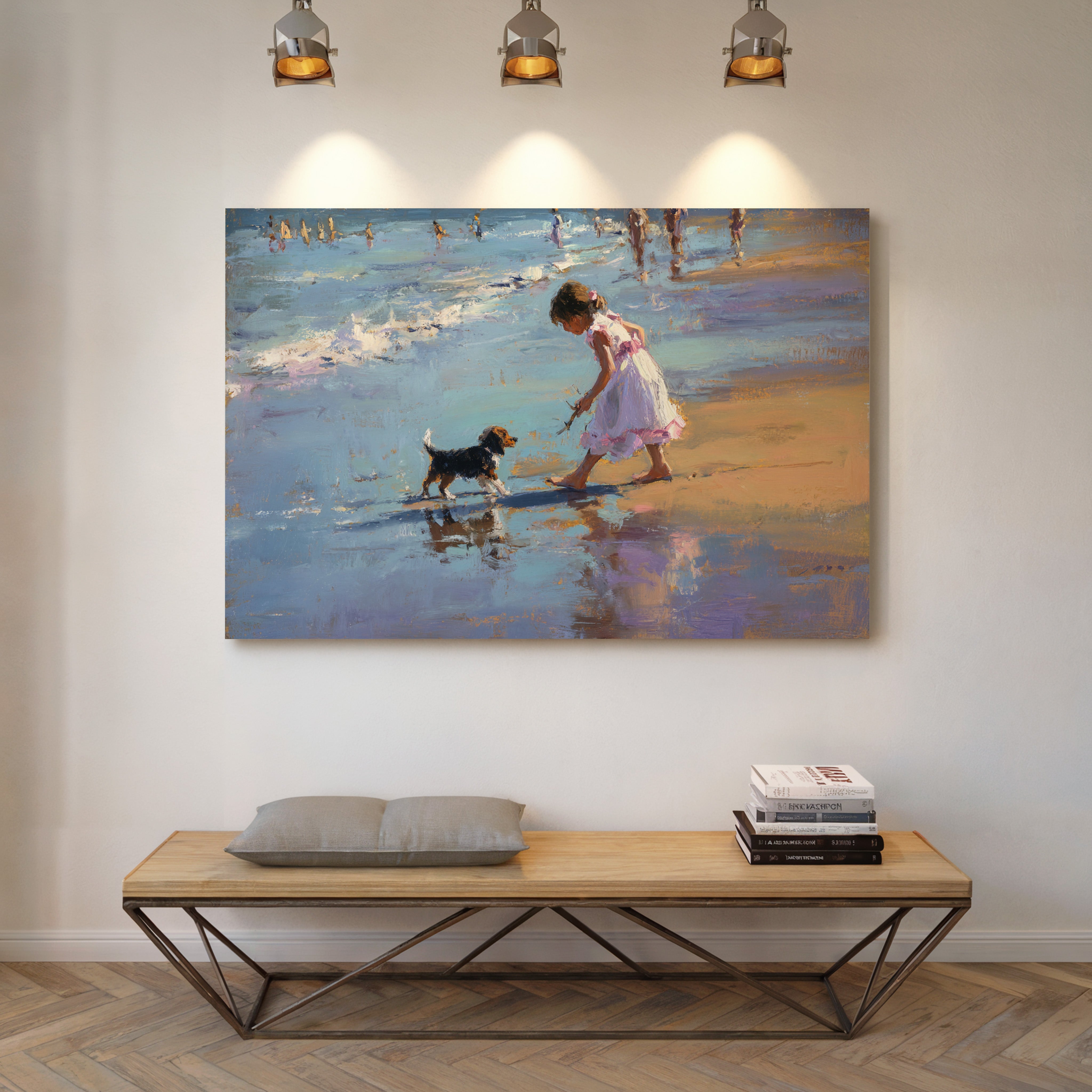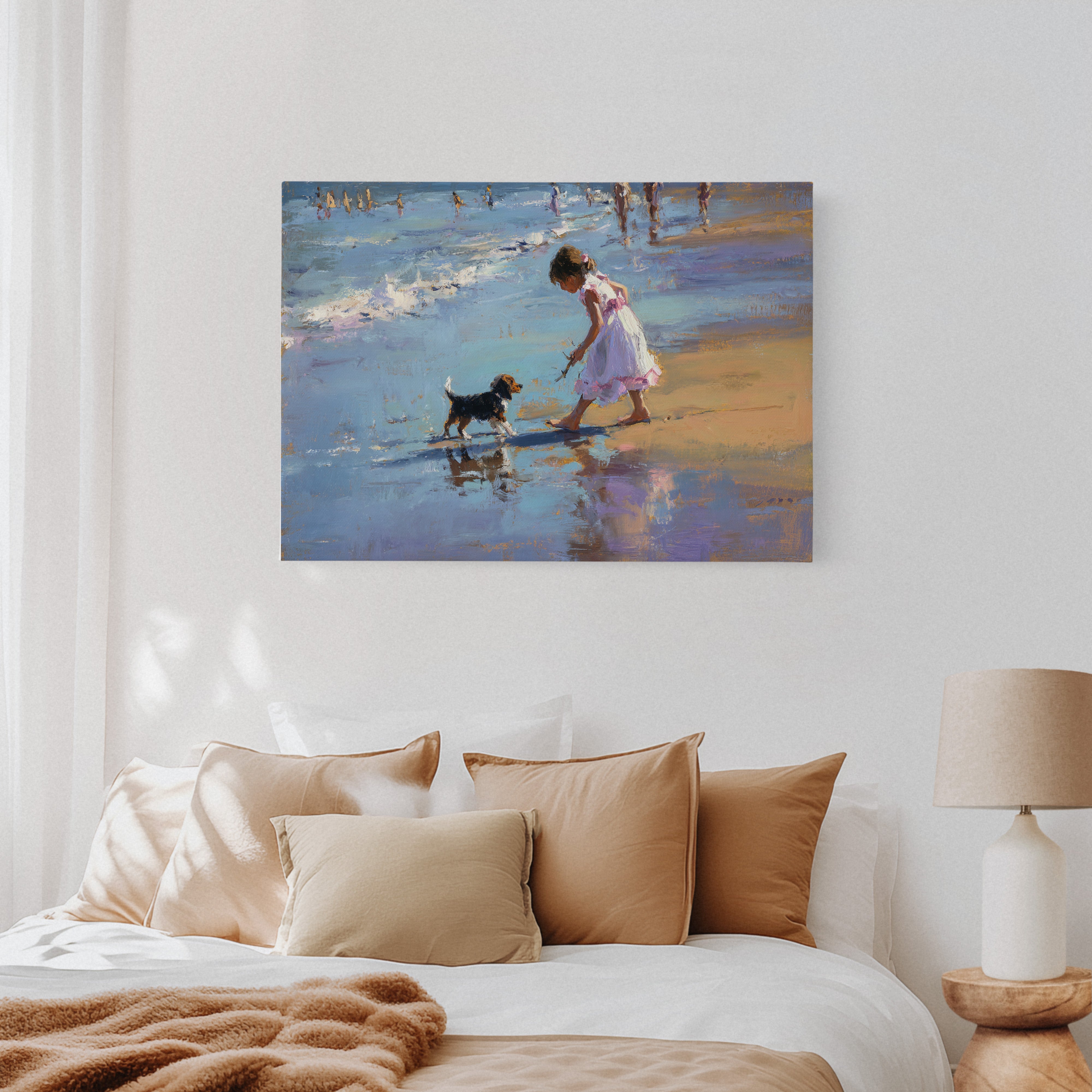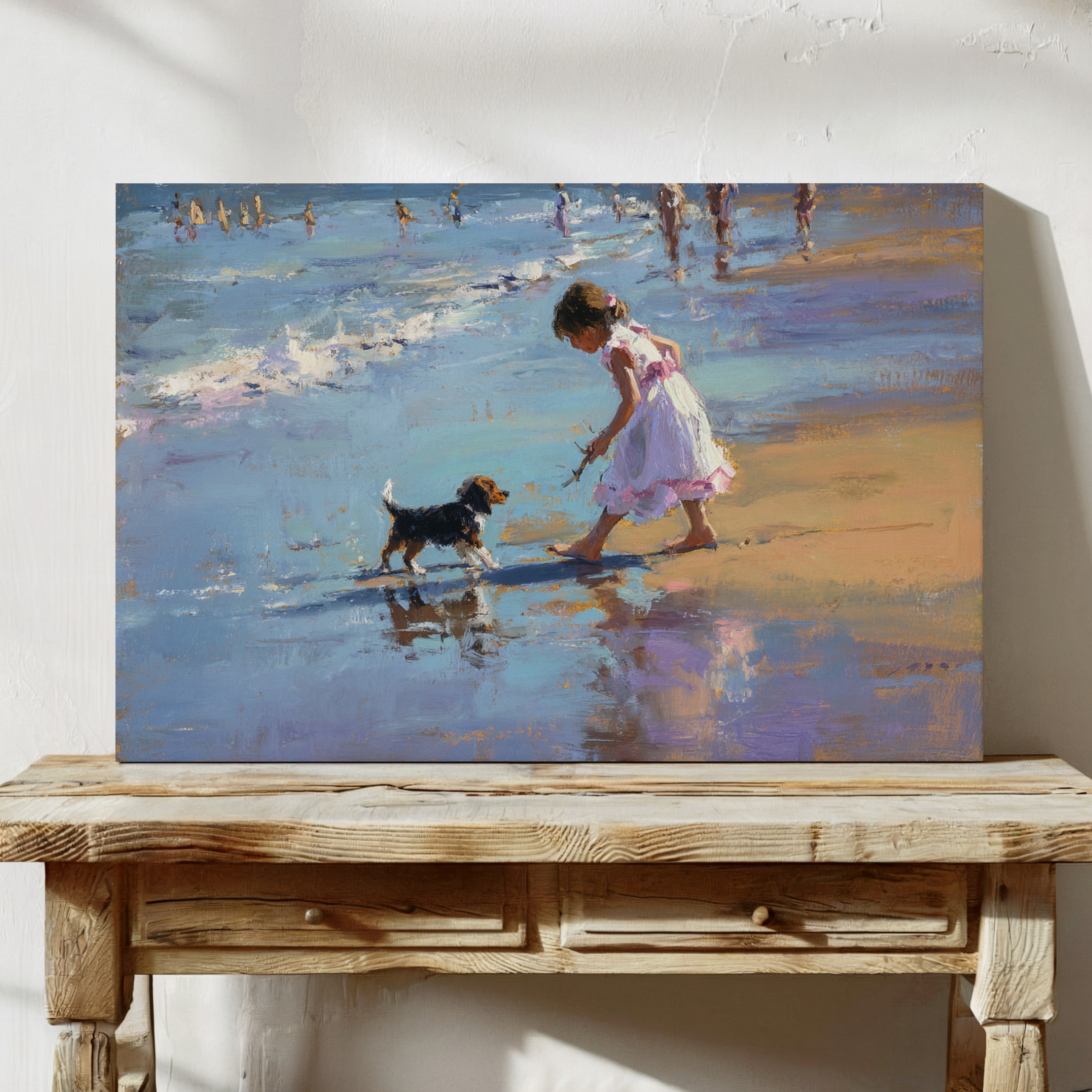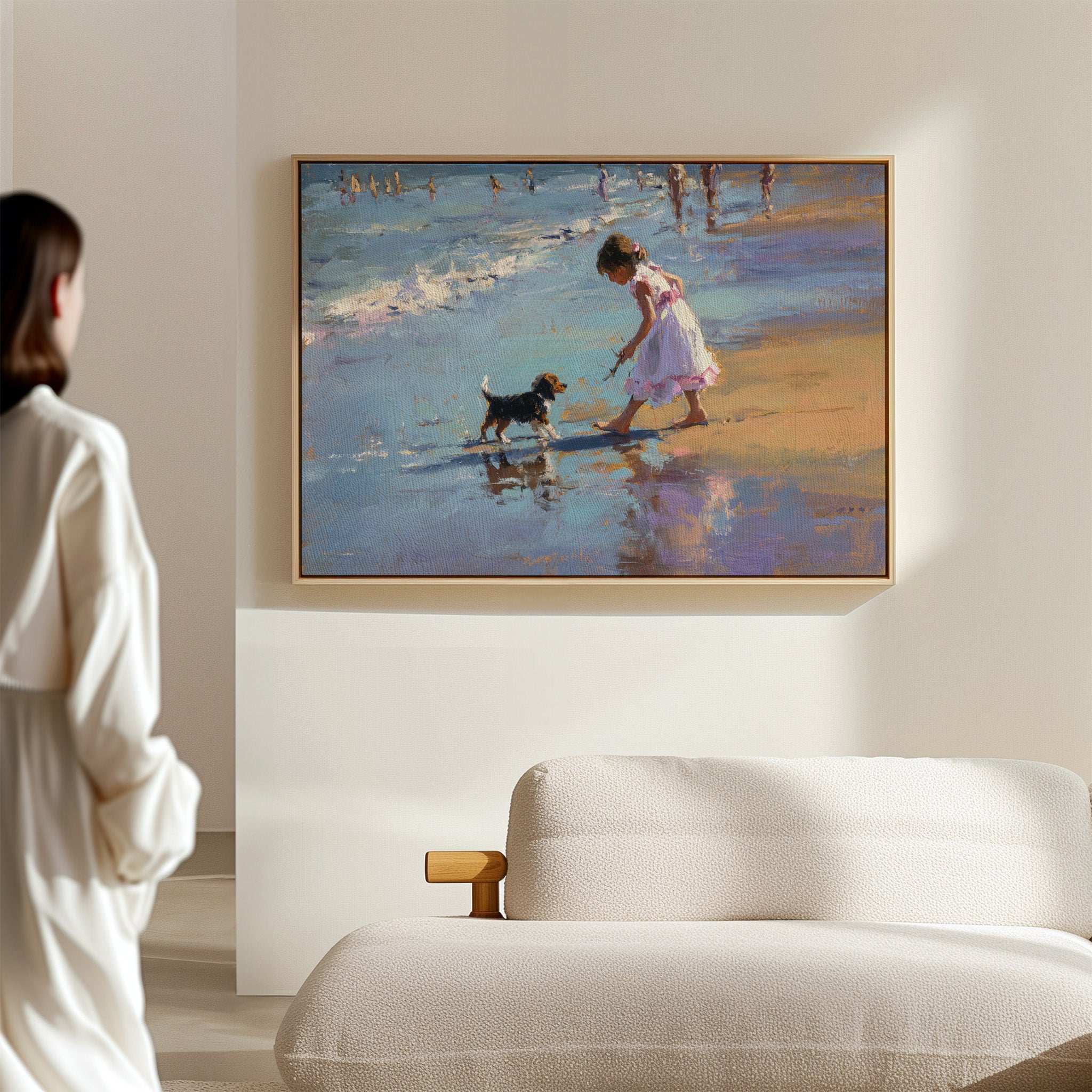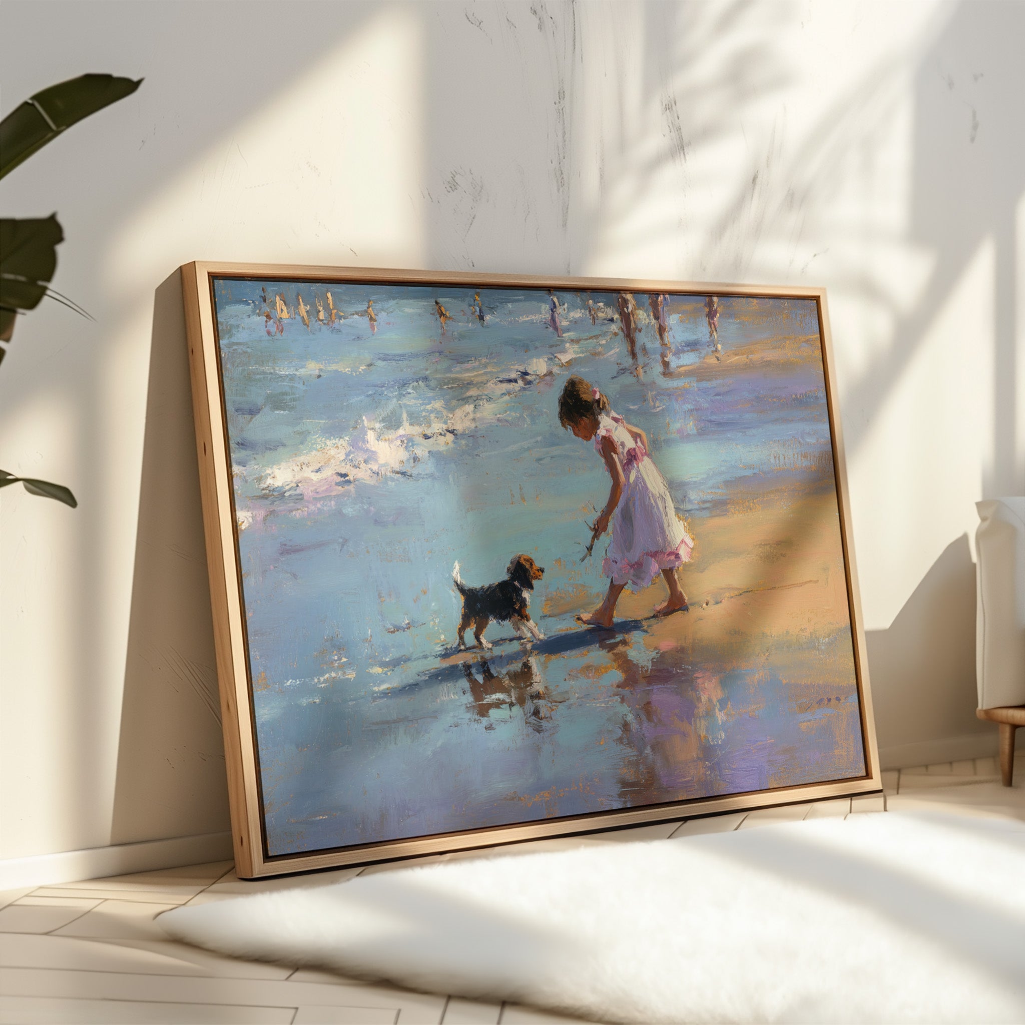 Gentle waves lap at tiny feet as childhood wonder unfolds along the shoreline. A figure in a flowing lavender dress bends toward their faithful companion, creating rippling reflections in the wet sand. The scene captures a fleeting moment of pure joy, with loose brushstrokes in blues, purples, and warm sandy tones merging to create a dreamlike summer afternoon. The background hints at other beachgoers enjoying the day, but keeps the intimate connection between child and pet as its emotional center. This evocative piece would bring warmth and nostalgia to a living room or family space, where its seaside serenity can be enjoyed daily.