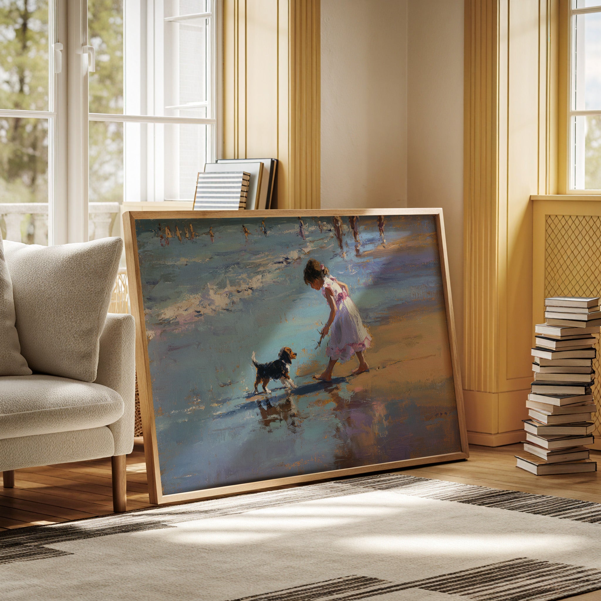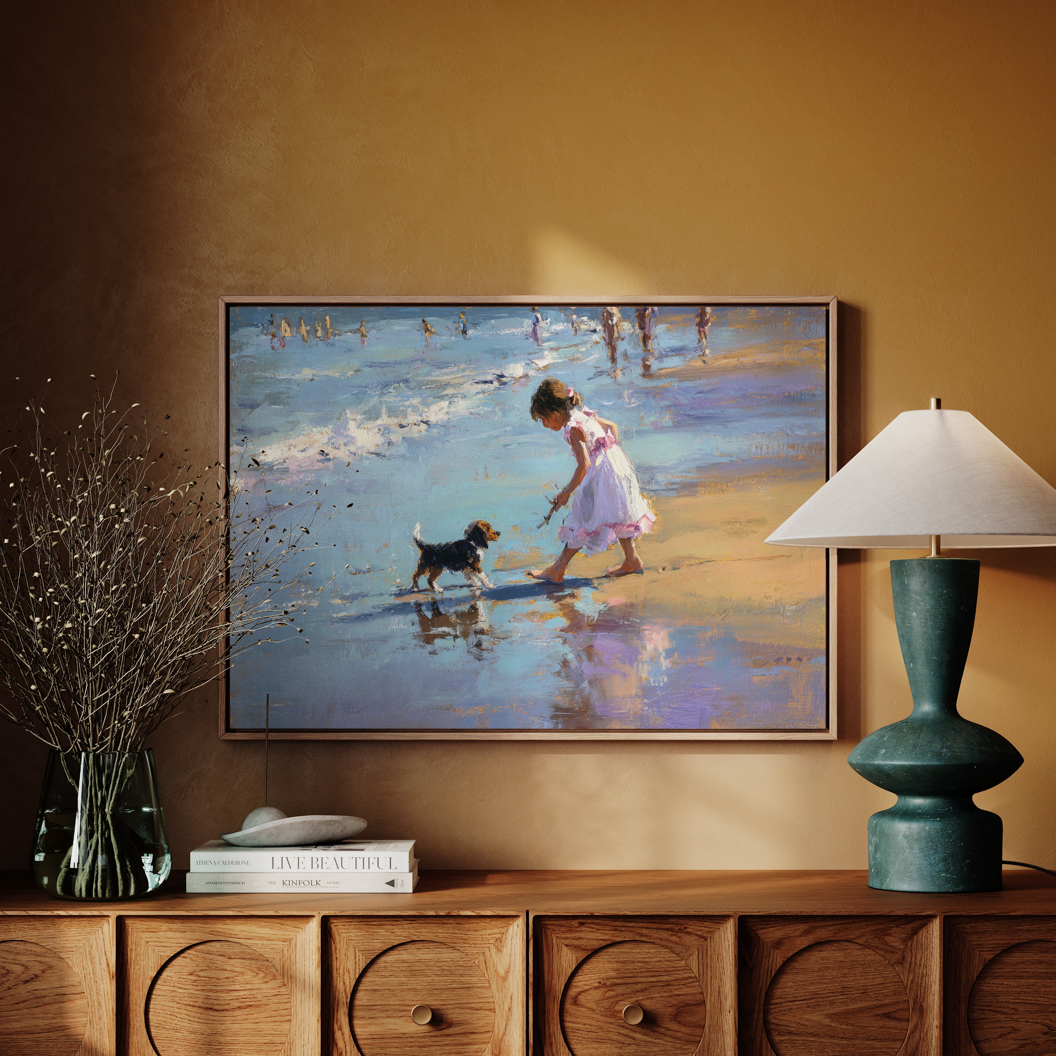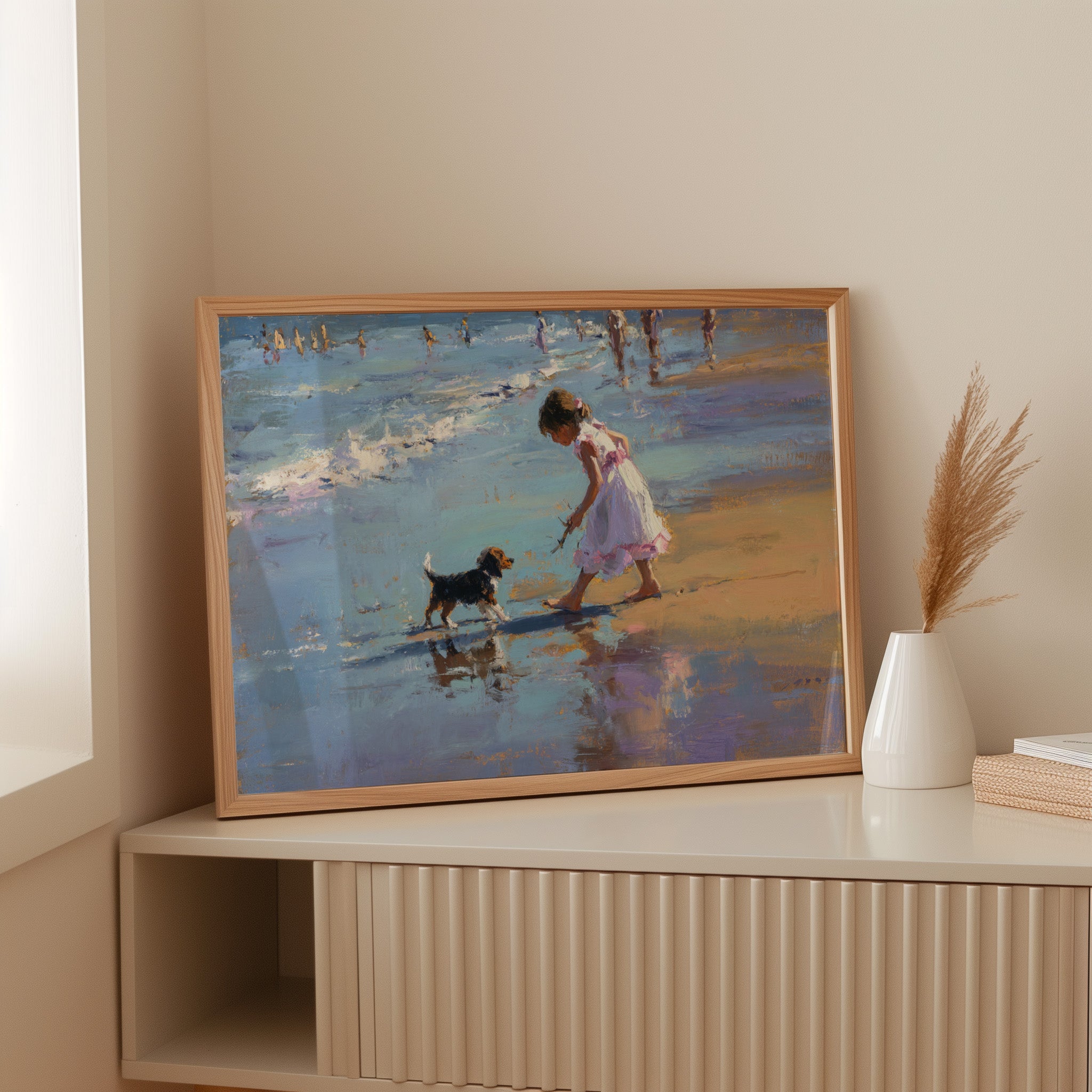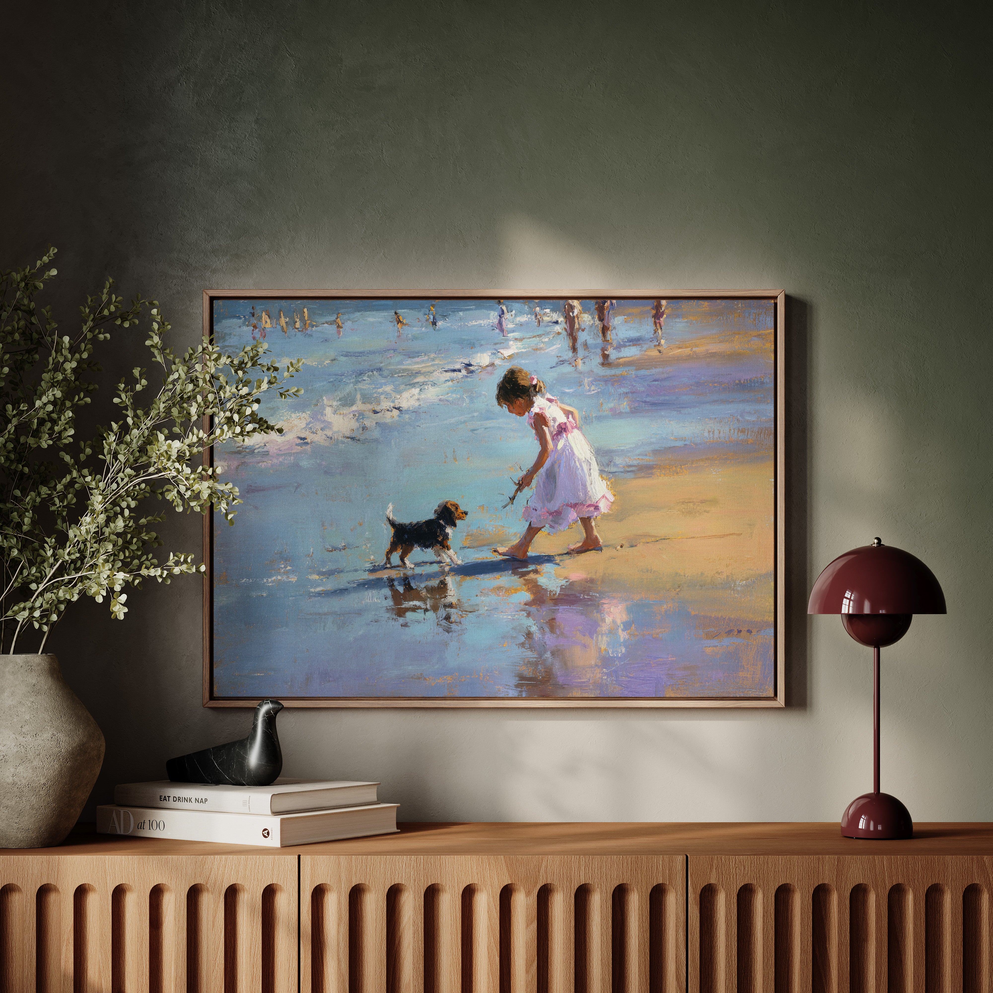 Gentle waves lap at tiny feet as childhood wonder unfolds along the shoreline. A figure in a flowing lavender dress bends toward their faithful companion, creating rippling reflections in the wet sand. The scene captures a fleeting moment of pure joy, with loose brushstrokes in blues, purples, and warm sandy tones merging to create a dreamlike summer afternoon. The background hints at other beachgoers enjoying the day, but keeps the intimate connection between child and pet as its emotional center. This evocative piece would bring warmth and nostalgia to a living room or family space, where its seaside serenity can be enjoyed daily.