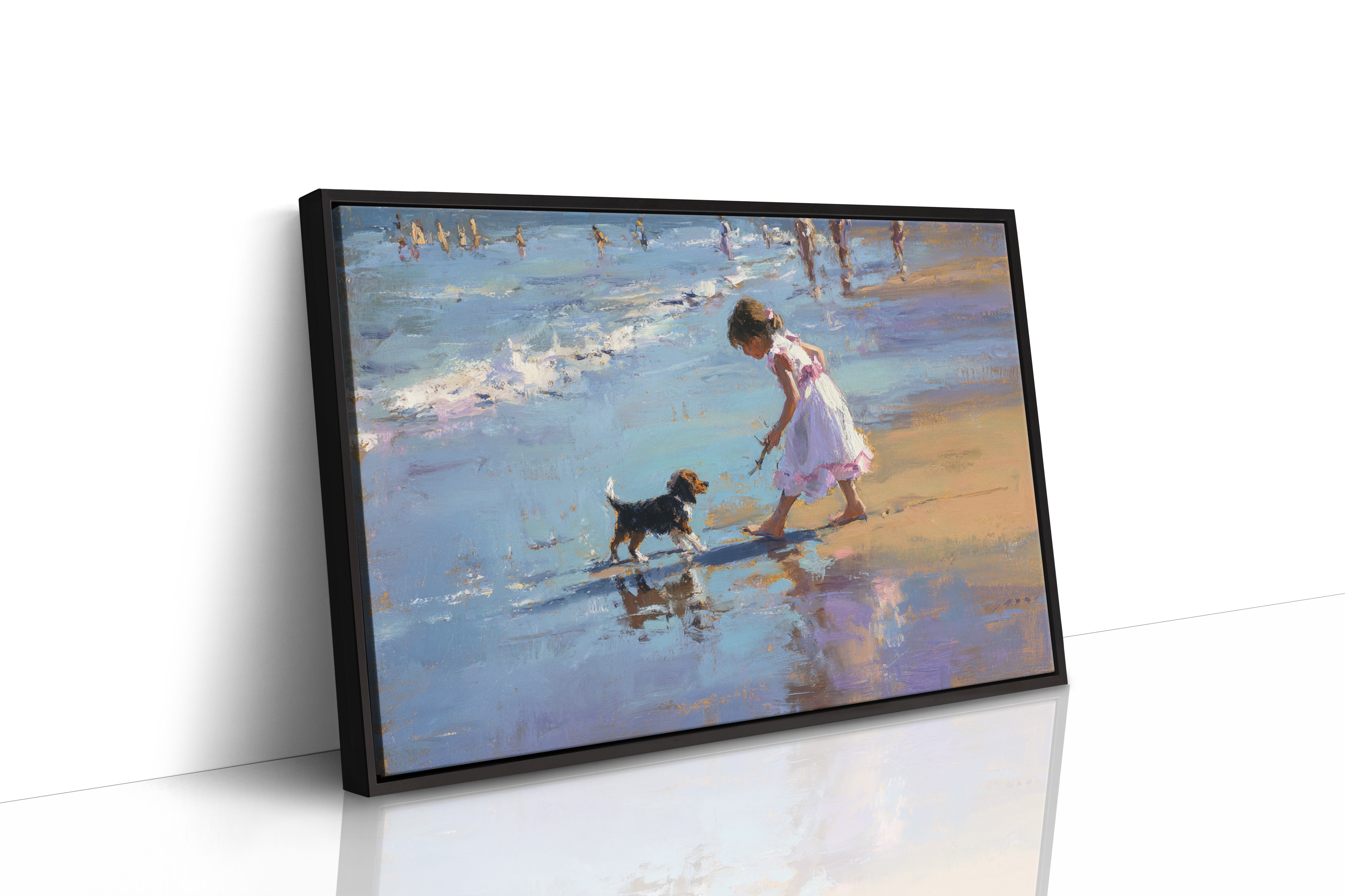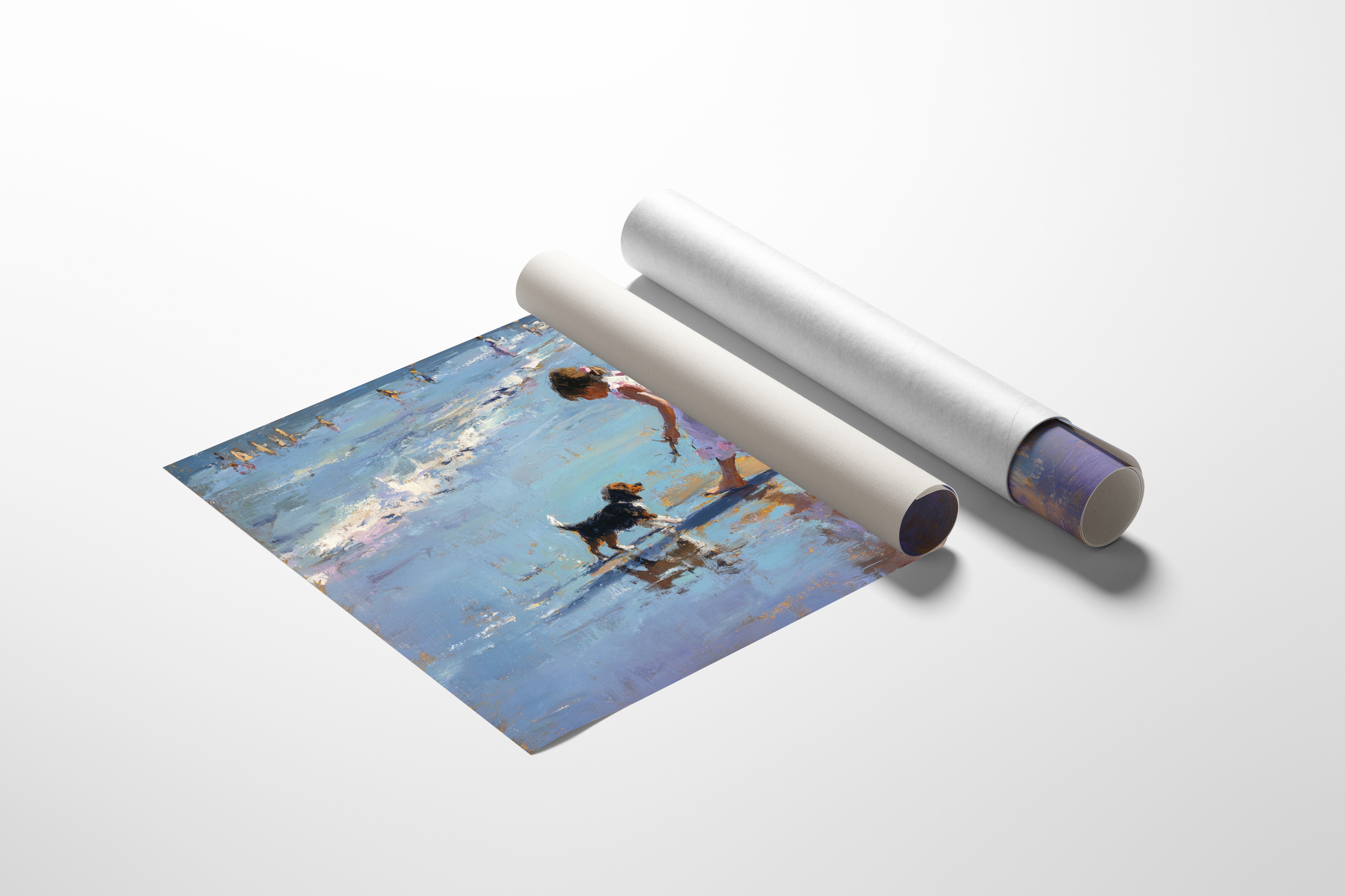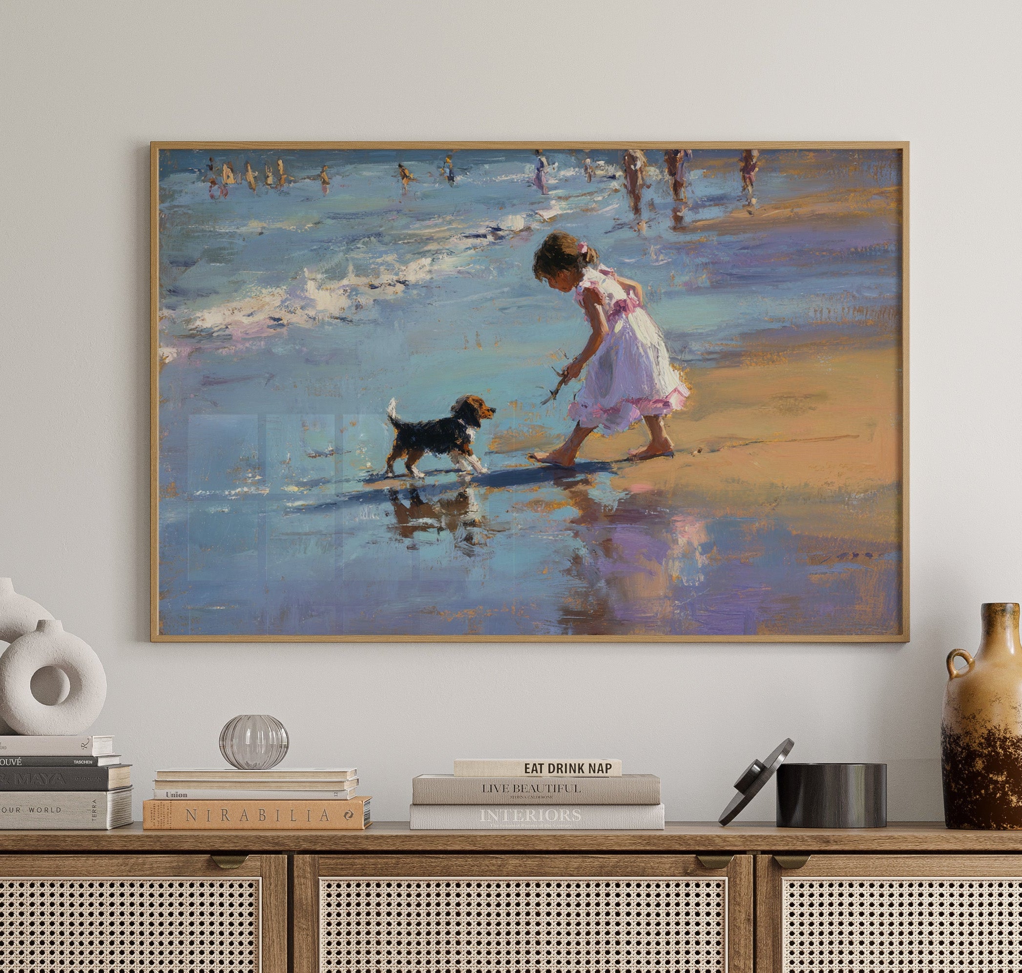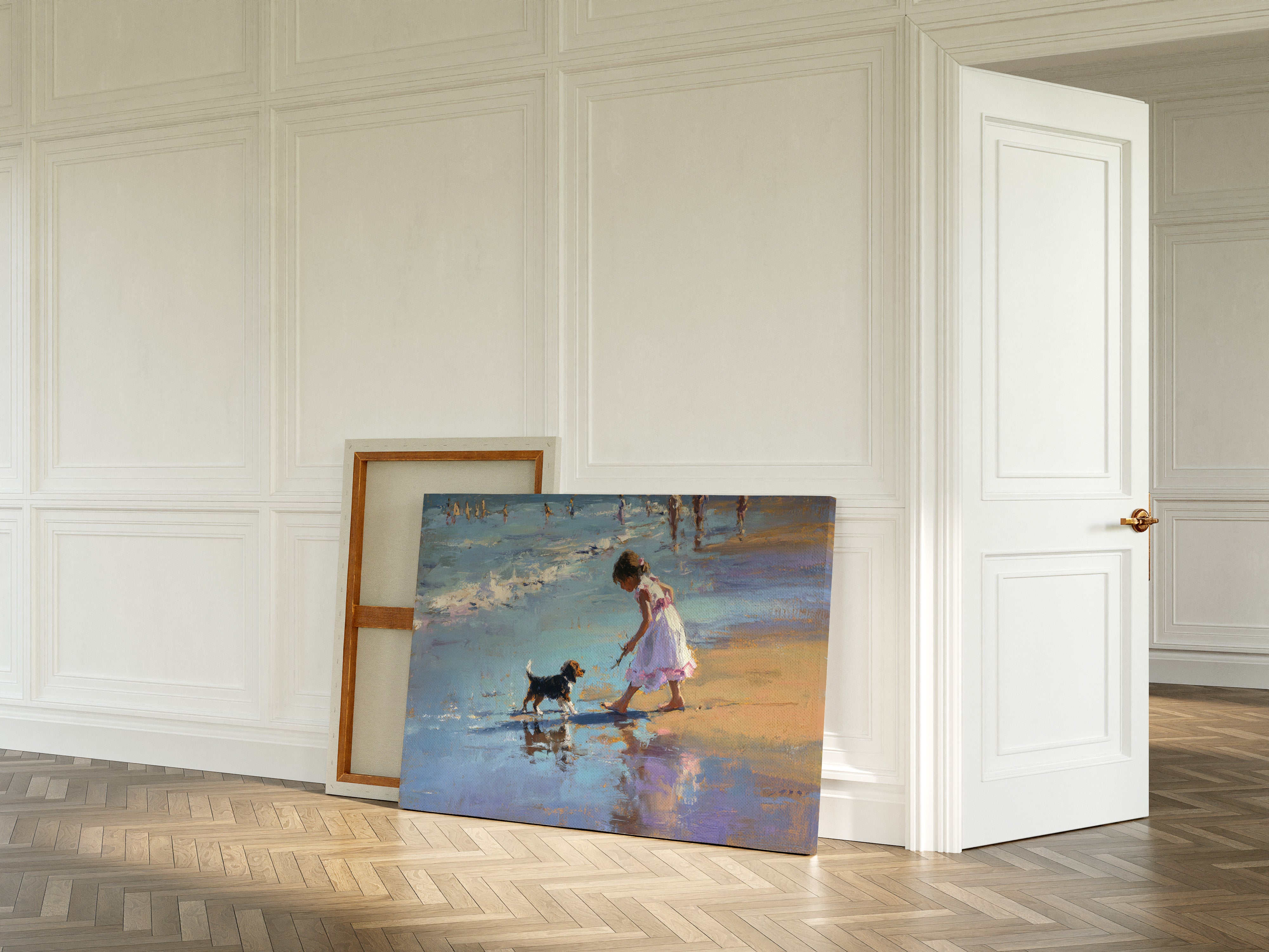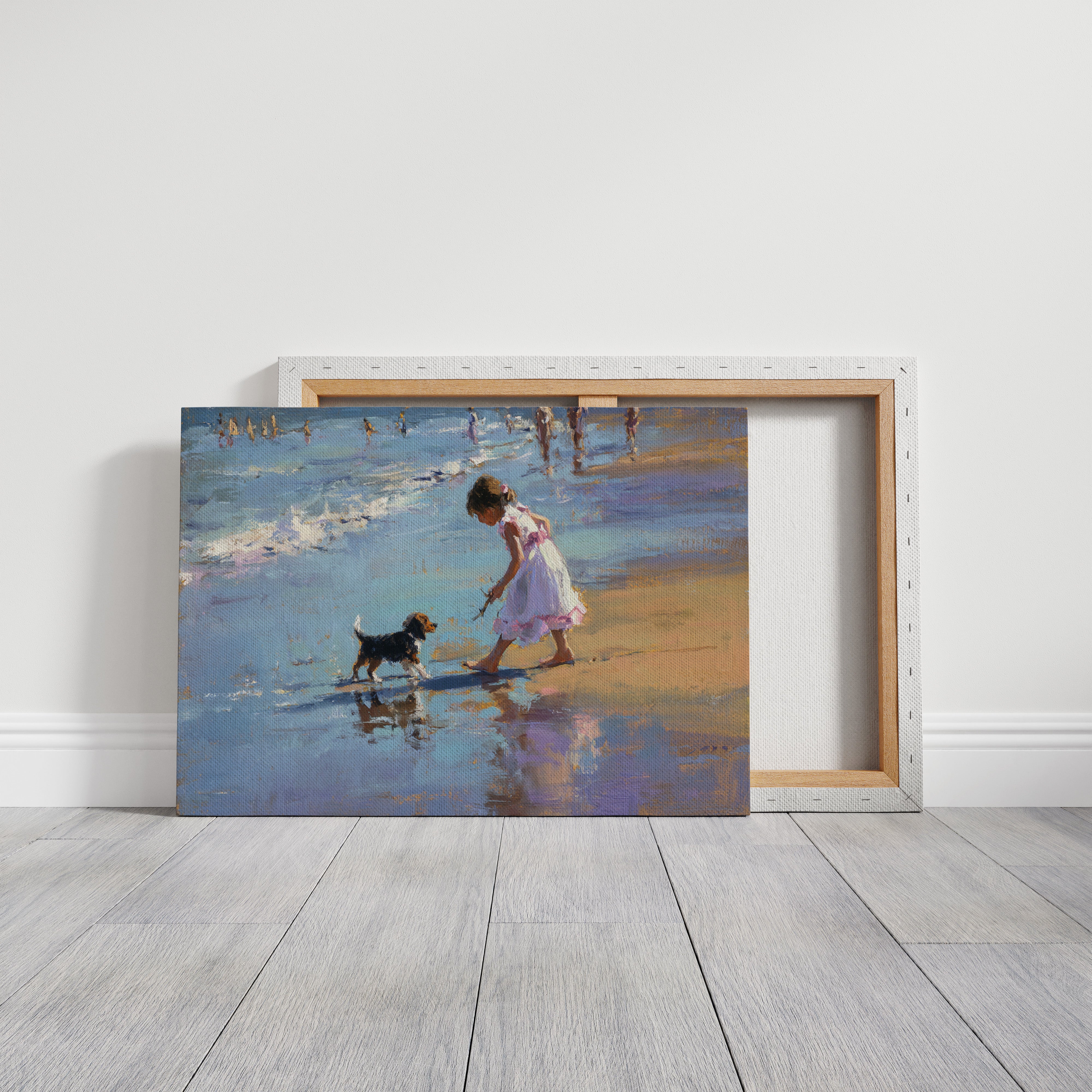 Gentle waves lap at tiny feet as childhood wonder unfolds along the shoreline. A figure in a flowing lavender dress bends toward their faithful companion, creating rippling reflections in the wet sand. The scene captures a fleeting moment of pure joy, with loose brushstrokes in blues, purples, and warm sandy tones merging to create a dreamlike summer afternoon. The background hints at other beachgoers enjoying the day, but keeps the intimate connection between child and pet as its emotional center. This evocative piece would bring warmth and nostalgia to a living room or family space, where its seaside serenity can be enjoyed daily.
