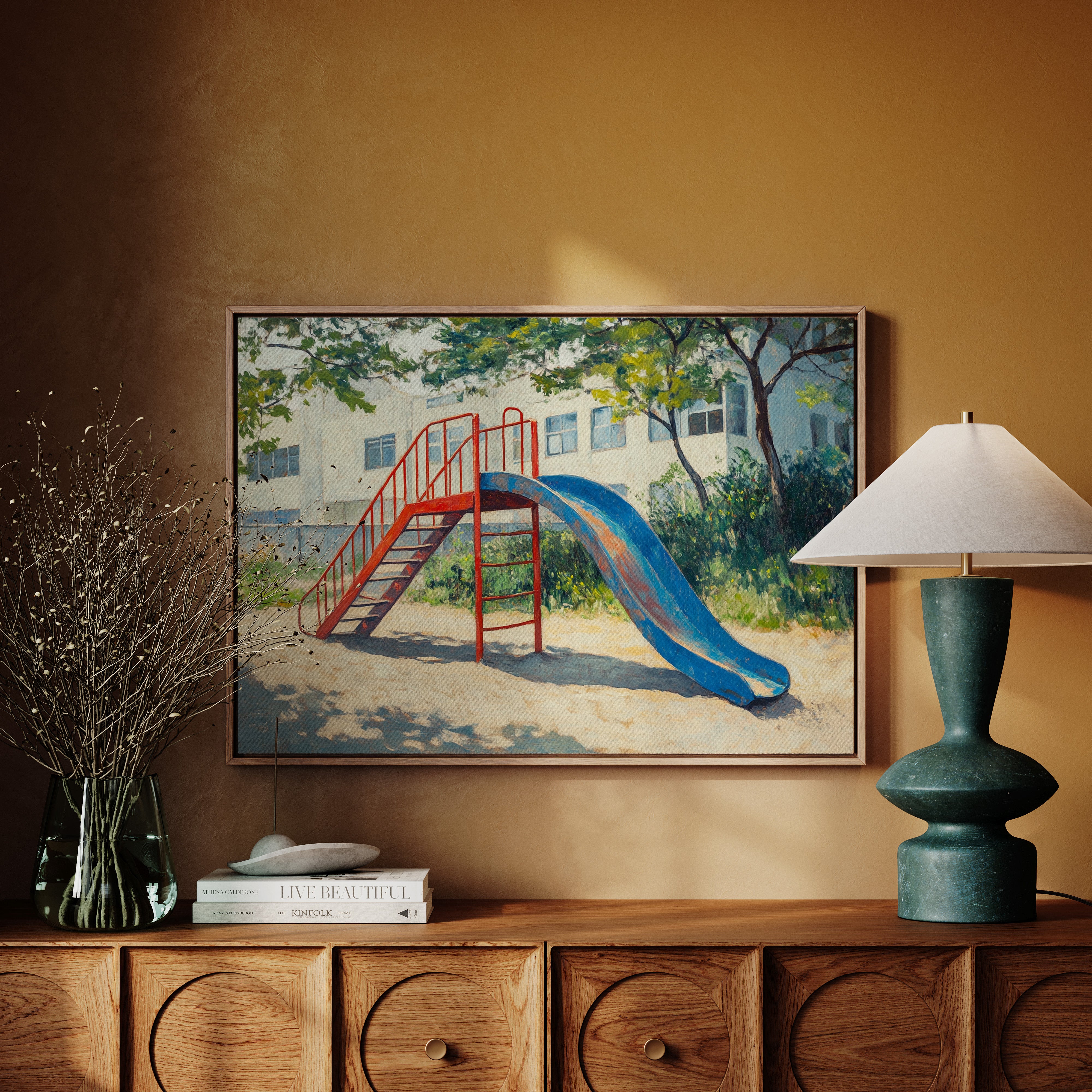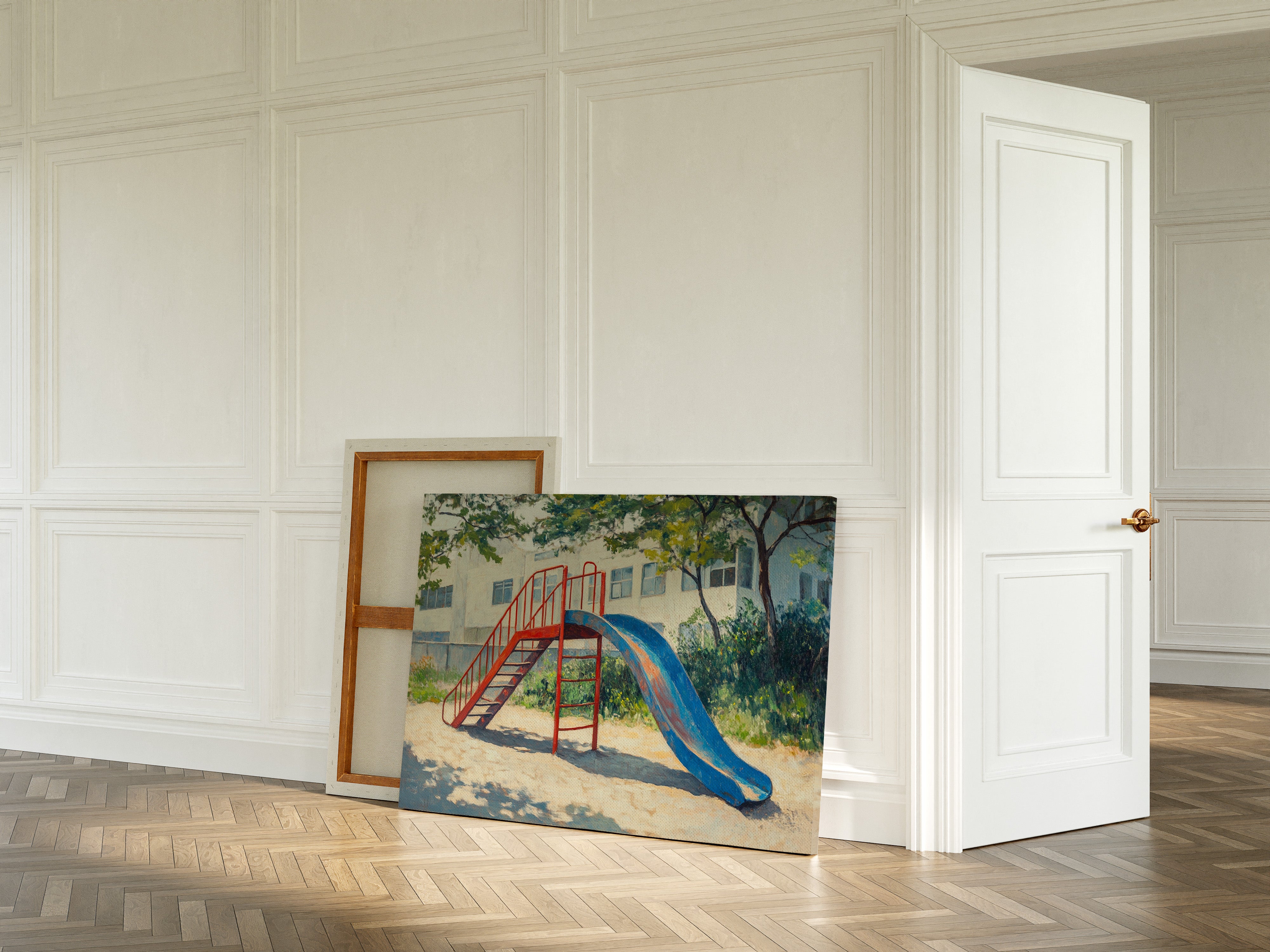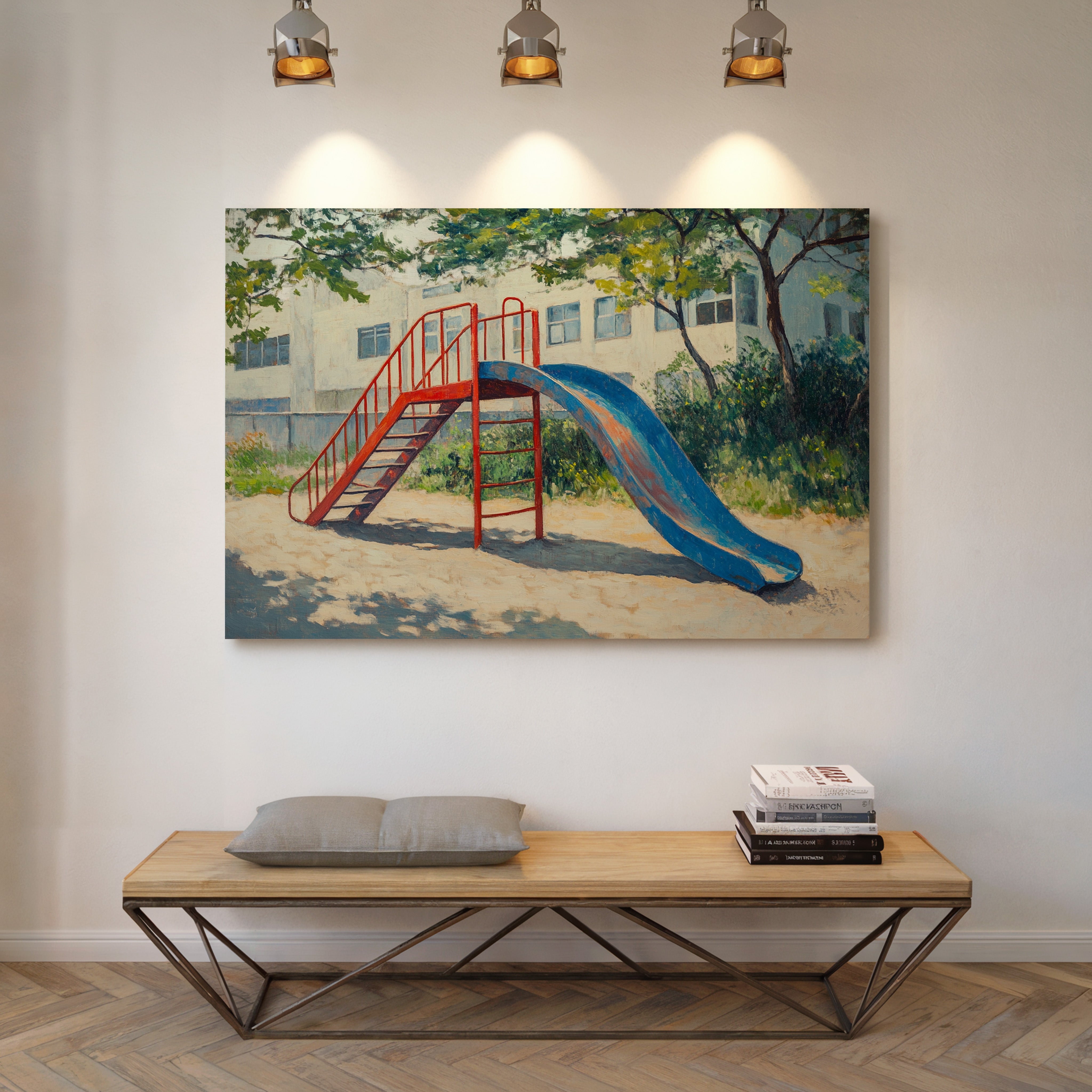 Dappled sunlight plays across an empty playground, where a vintage red and blue slide stands as a silent storyteller of childhood adventures. The worn metal structure, with its bold primary colors against white walls and green foliage, captures the essence of timeless summer afternoons. Shadows dance beneath leafy branches, while the weathered blue slide curves gracefully downward, bearing the marks of countless joyful descents. This nostalgic scene would bring a touch of wistful charm to a modern family room or child's reading nook, inviting conversations about simpler times and treasured memories.