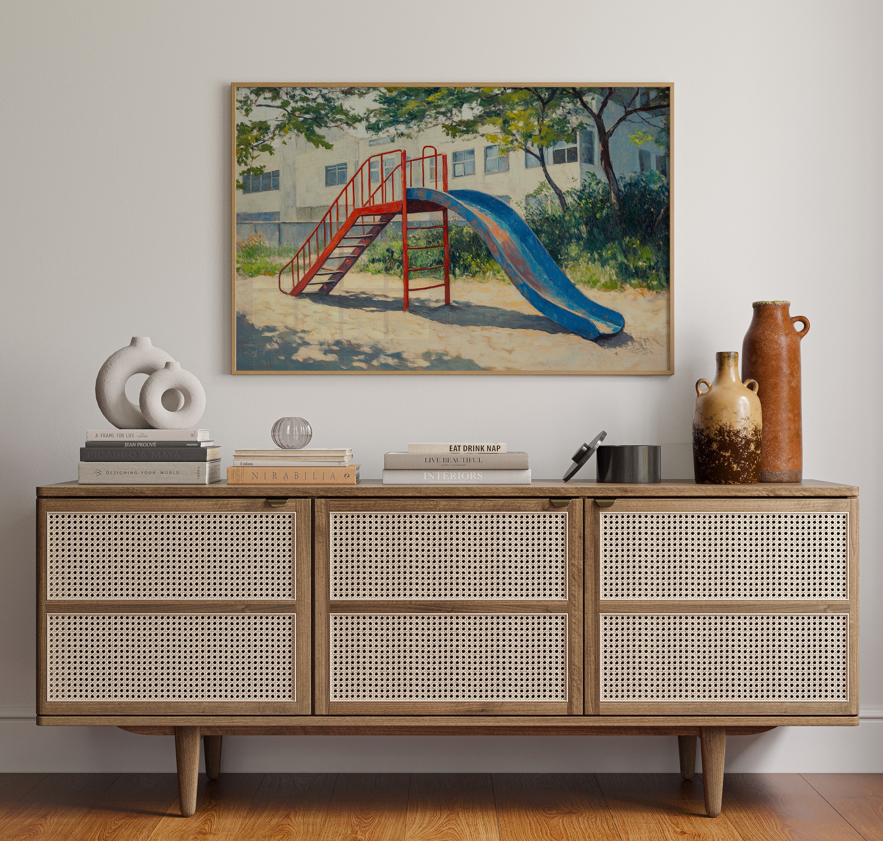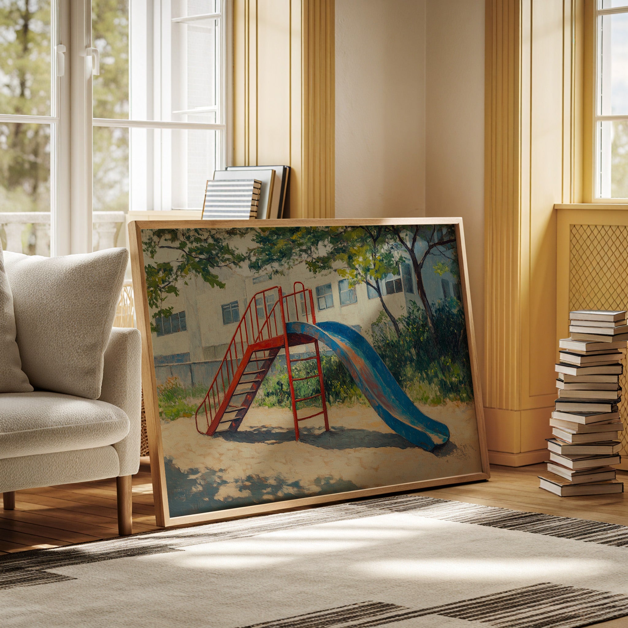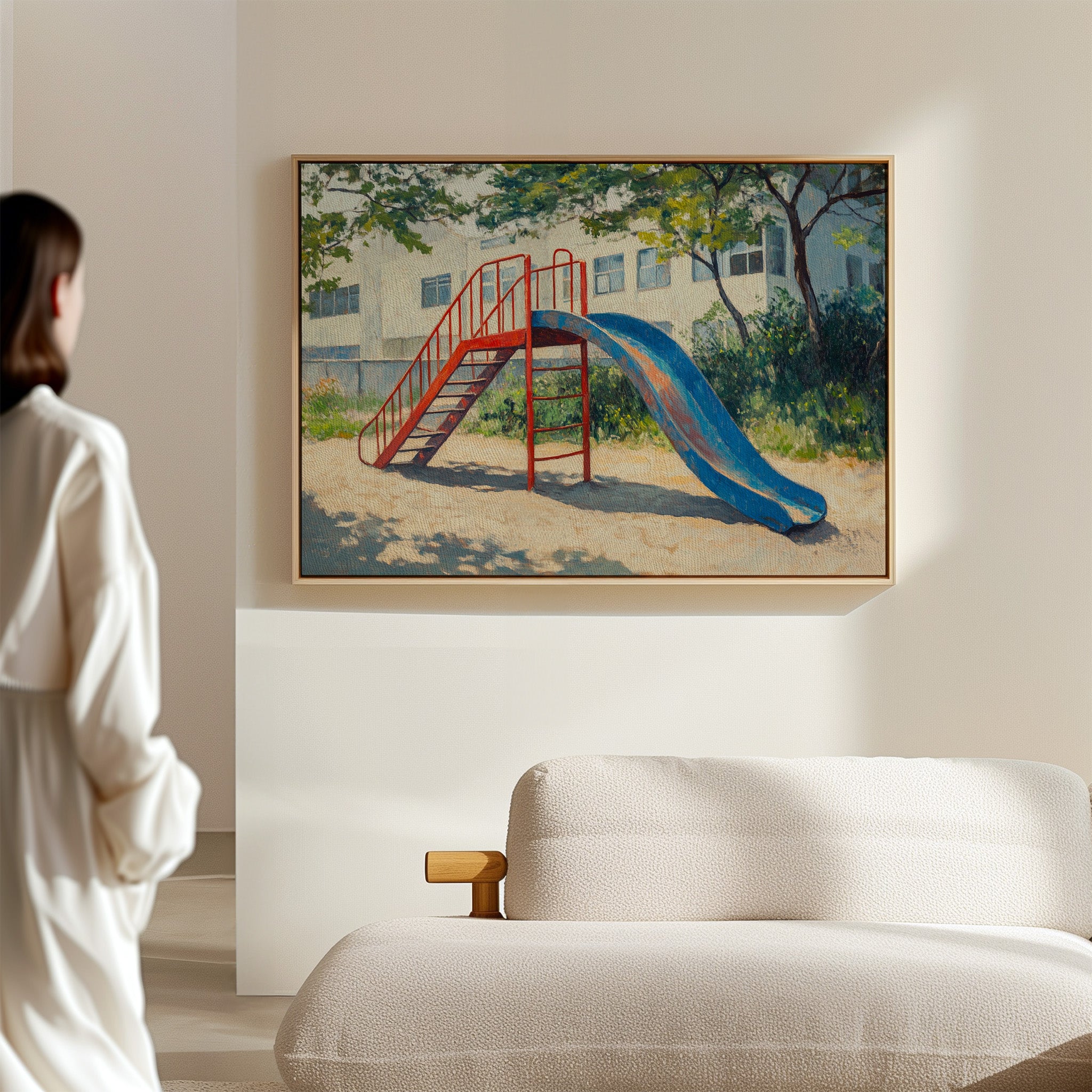 Dappled sunlight plays across an empty playground, where a vintage red and blue slide stands as a silent storyteller of childhood adventures. The worn metal structure, with its bold primary colors against white walls and green foliage, captures the essence of timeless summer afternoons. Shadows dance beneath leafy branches, while the weathered blue slide curves gracefully downward, bearing the marks of countless joyful descents. This nostalgic scene would bring a touch of wistful charm to a modern family room or child's reading nook, inviting conversations about simpler times and treasured memories.