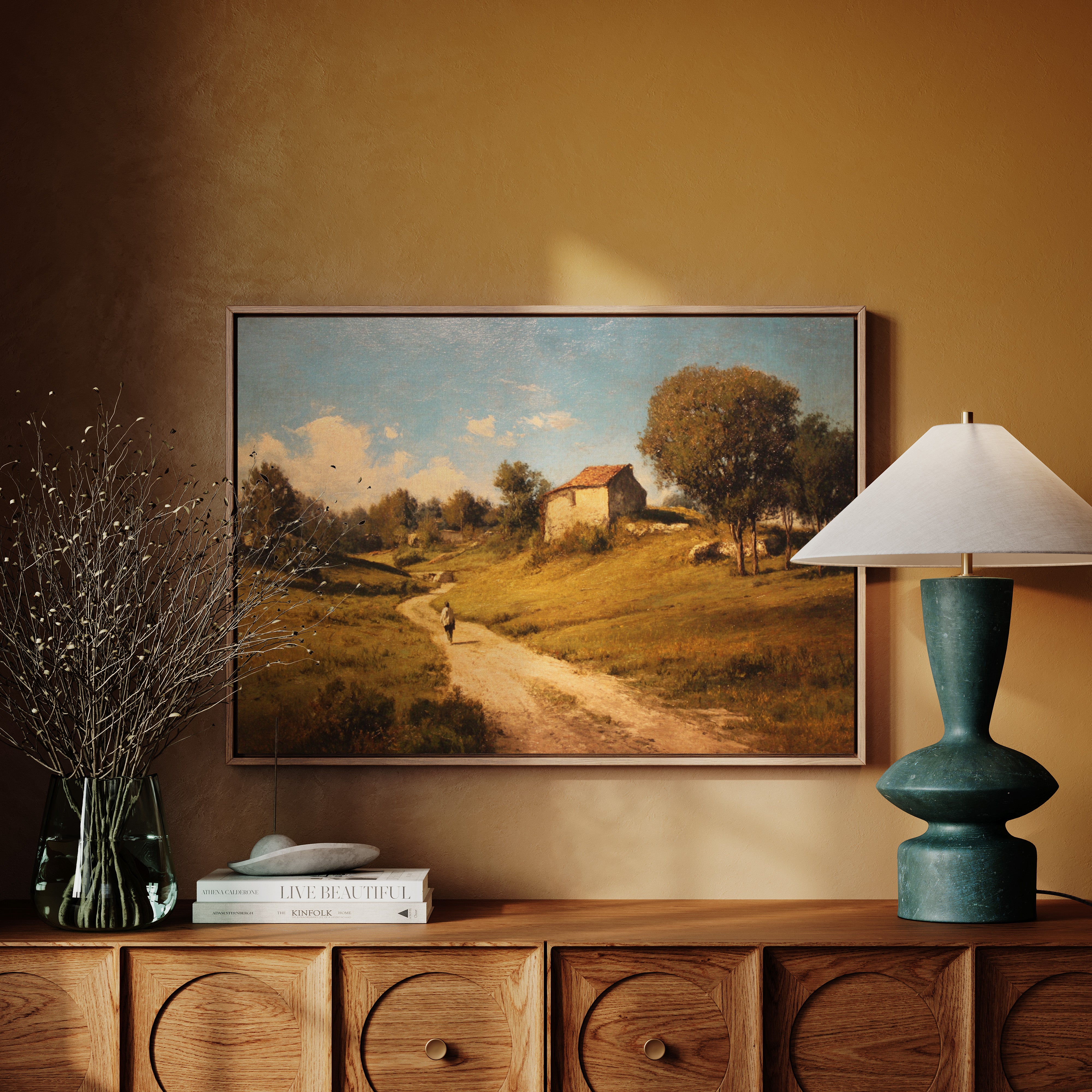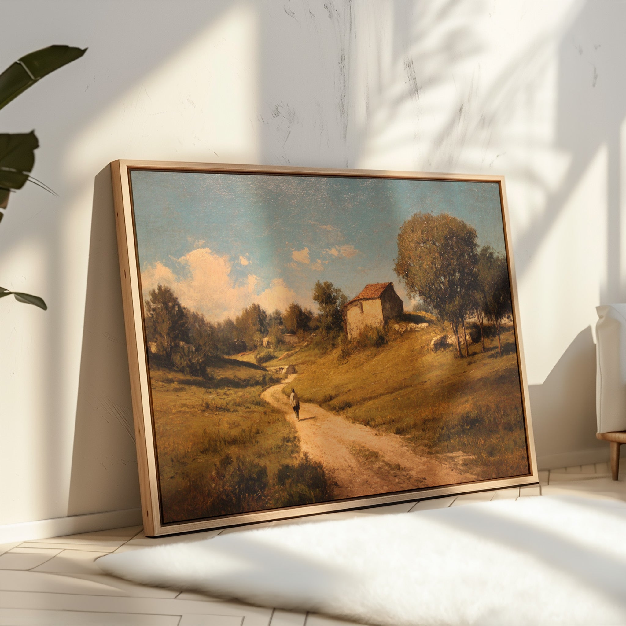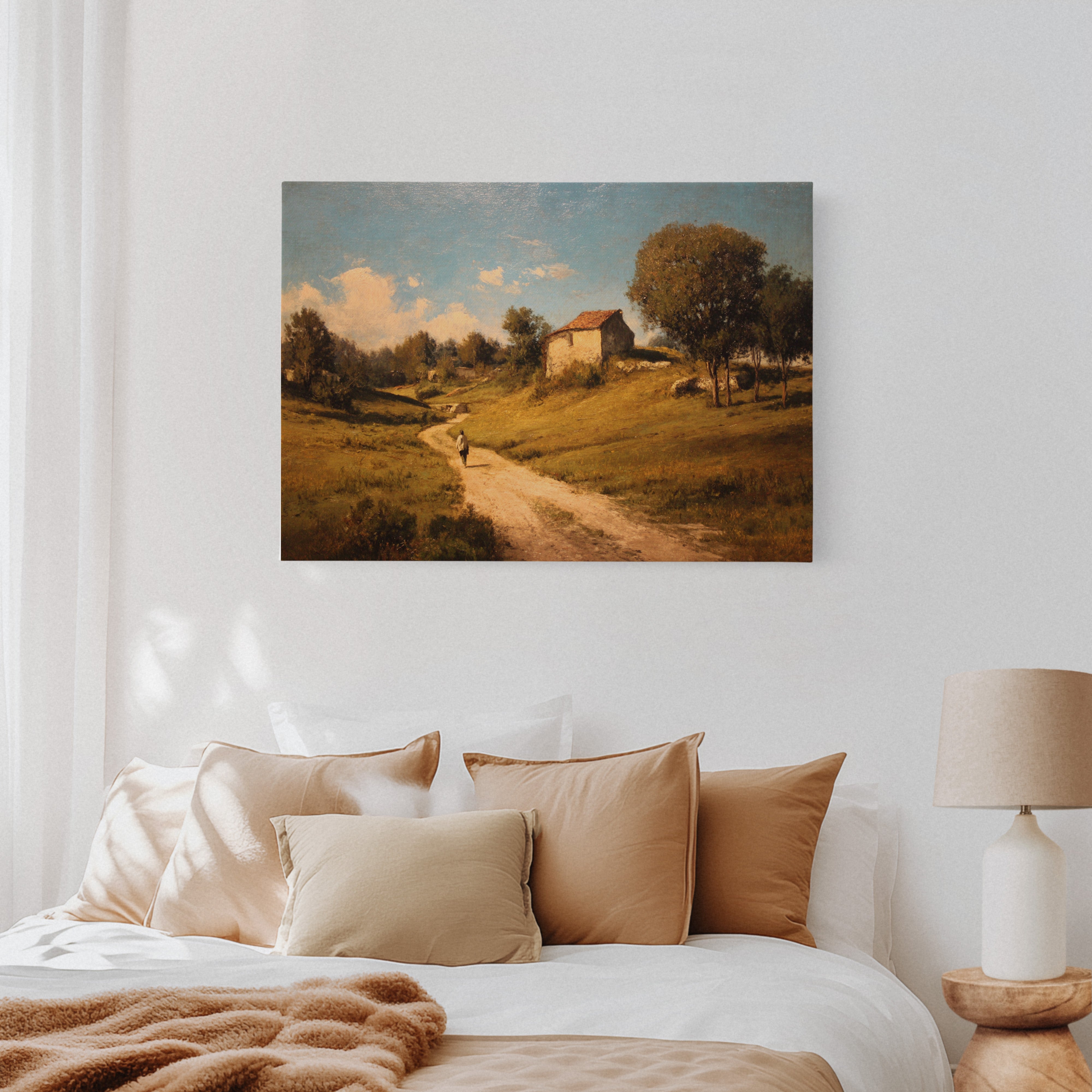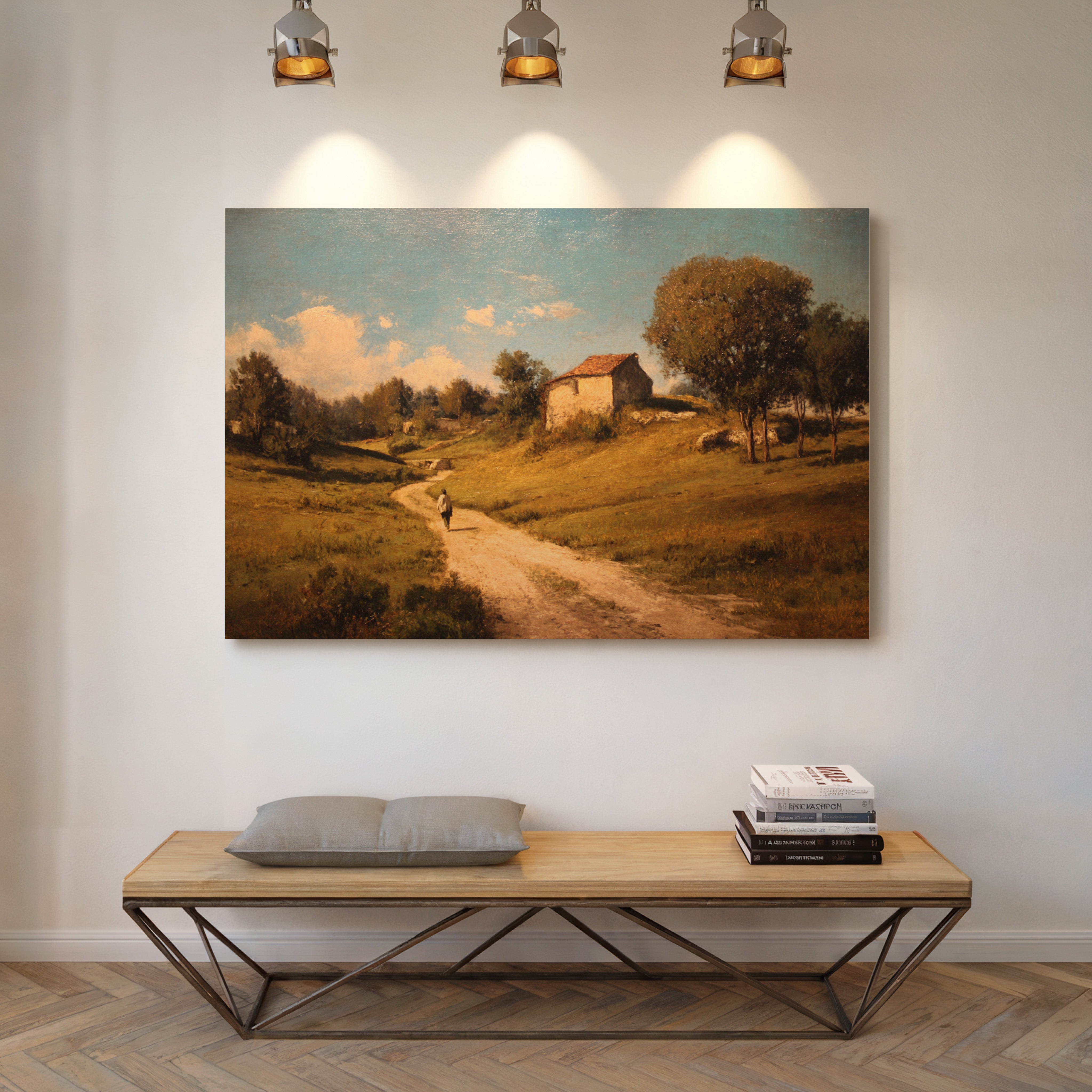 A winding dirt path cuts through sun-drenched hills, leading a solitary traveler toward a weathered stone cottage. Golden afternoon light bathes the pastoral landscape, where wild grasses sway beneath a cerulean sky dotted with billowing clouds. The scene captures a timeless moment of rural tranquility, with mature trees standing sentinel over the rolling terrain and the rustic building's terra cotta roof glowing in the warm light. This evocative landscape would bring a sense of peaceful contemplation to a living room or study, where its warm tones and serene composition can create a window into a simpler time.