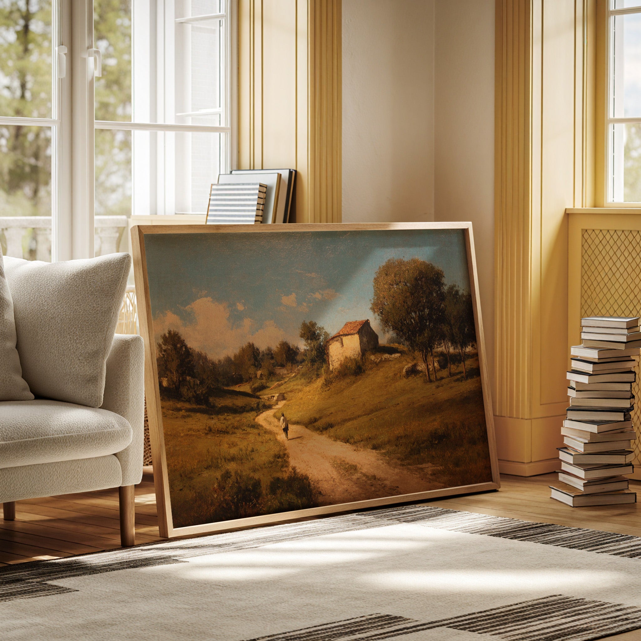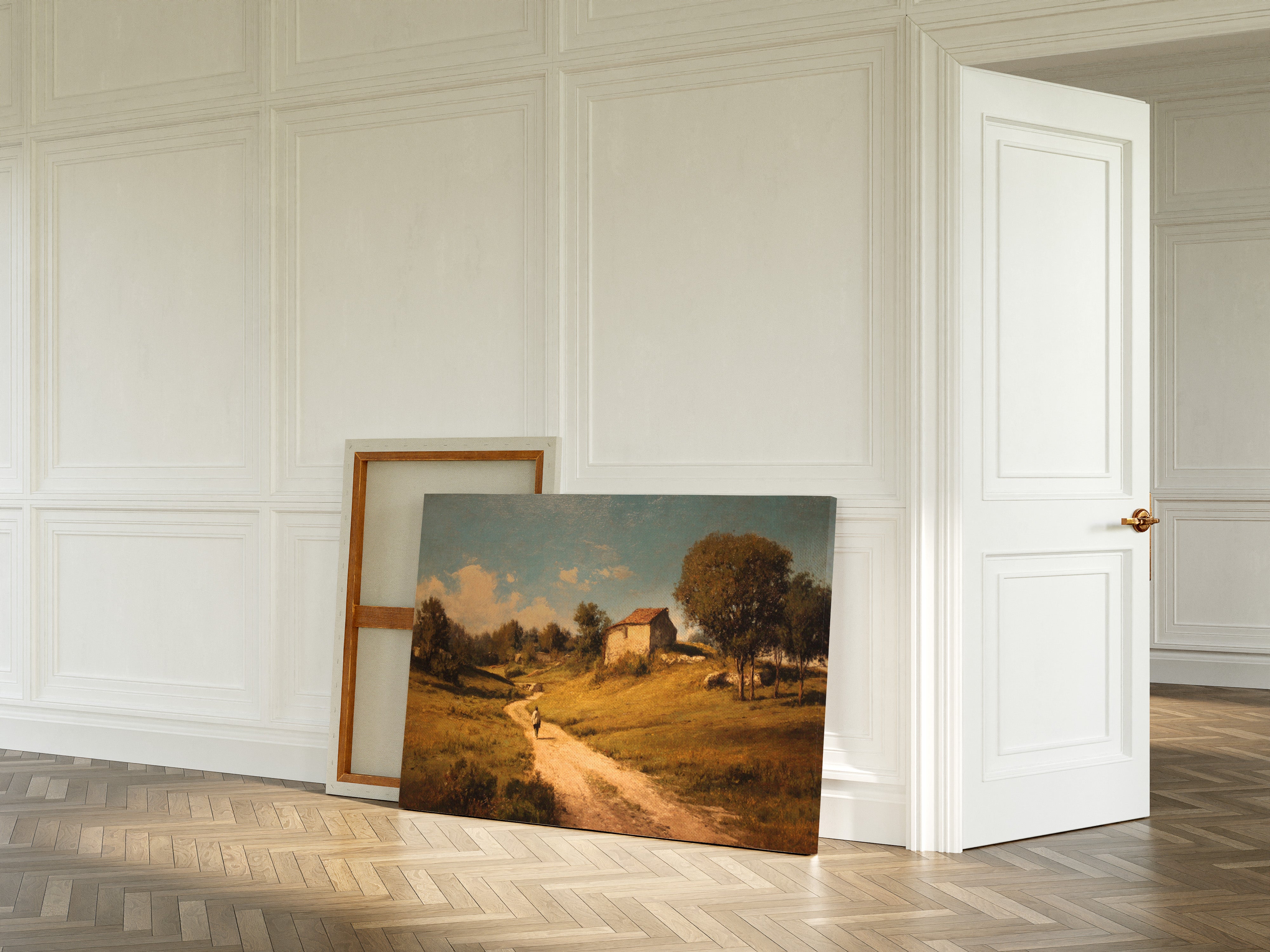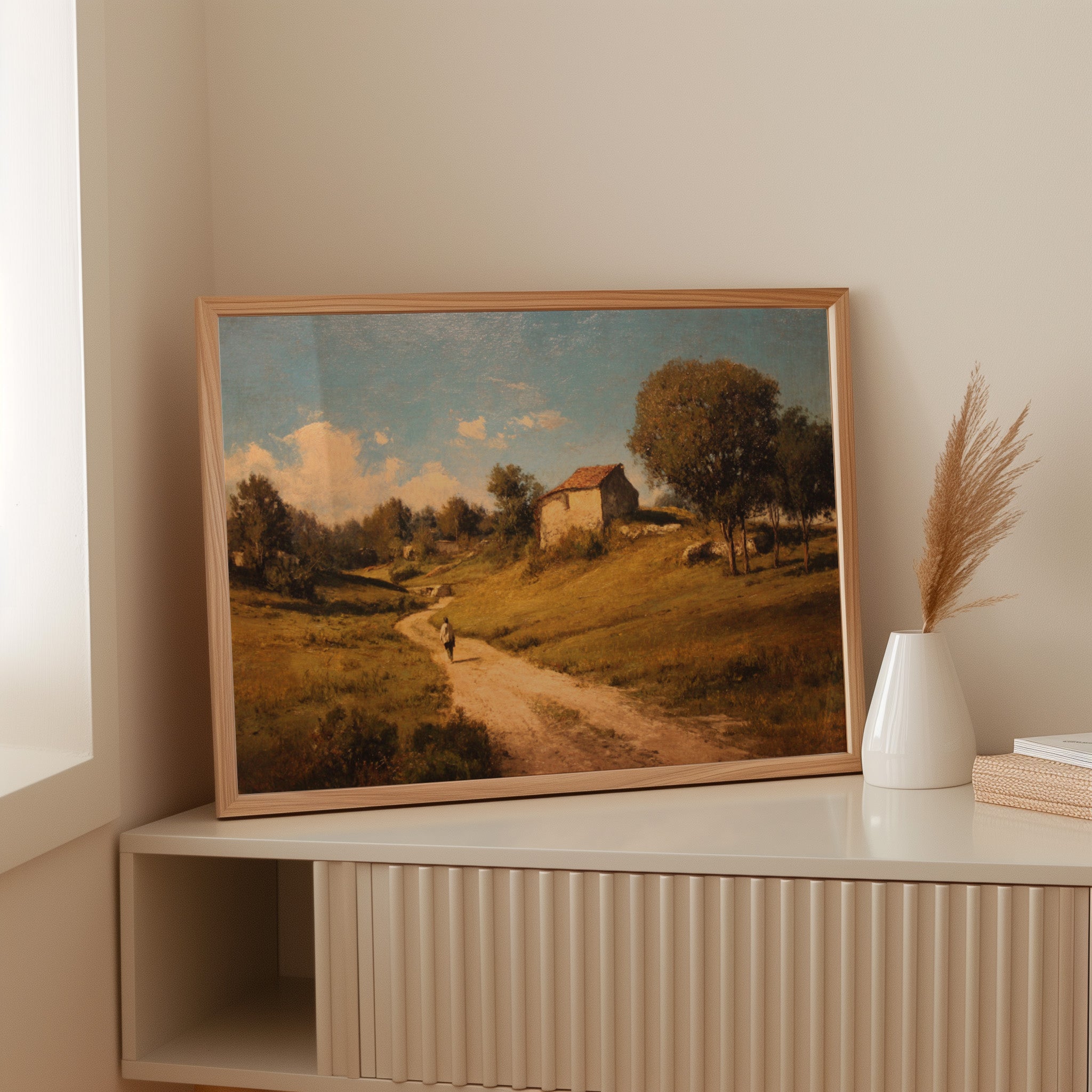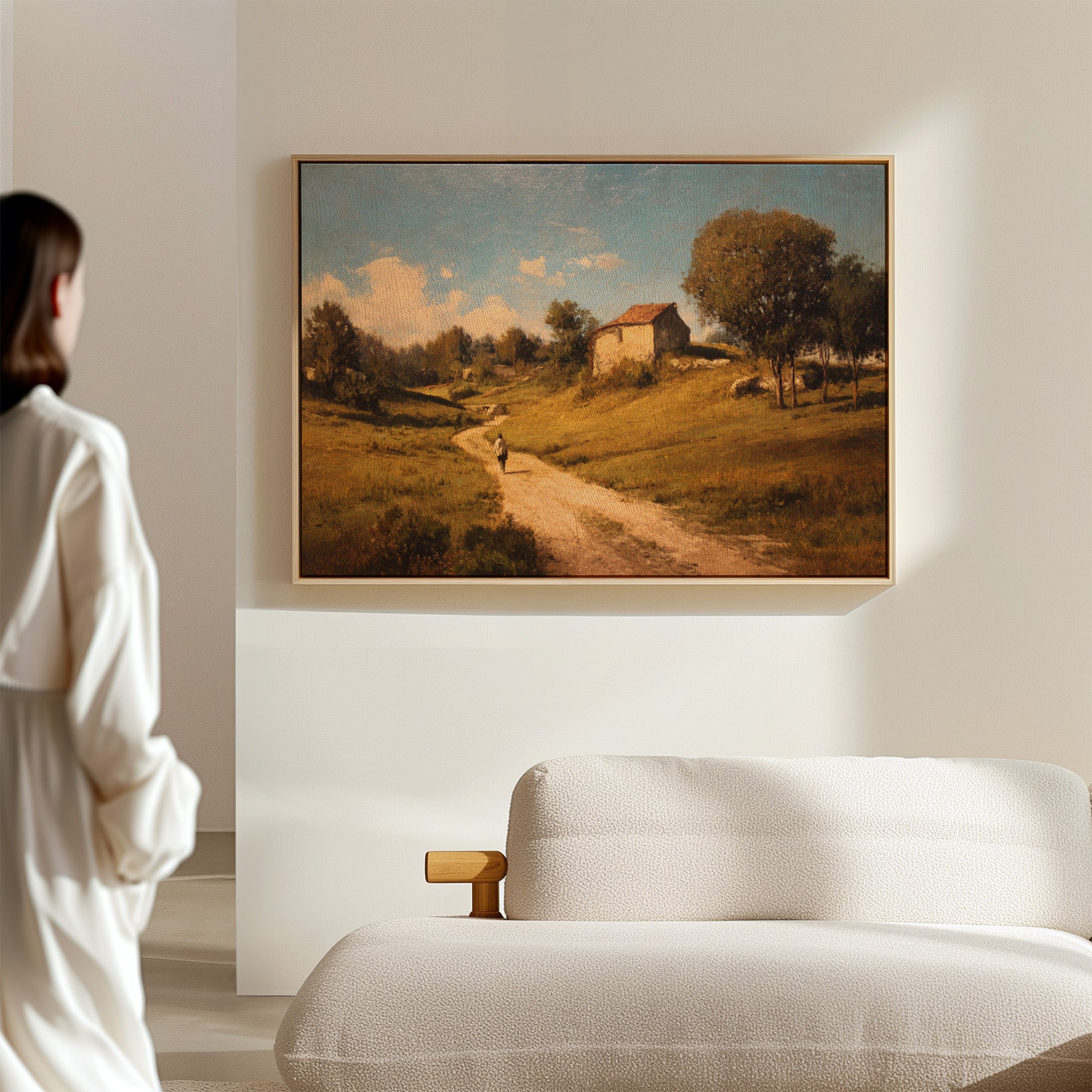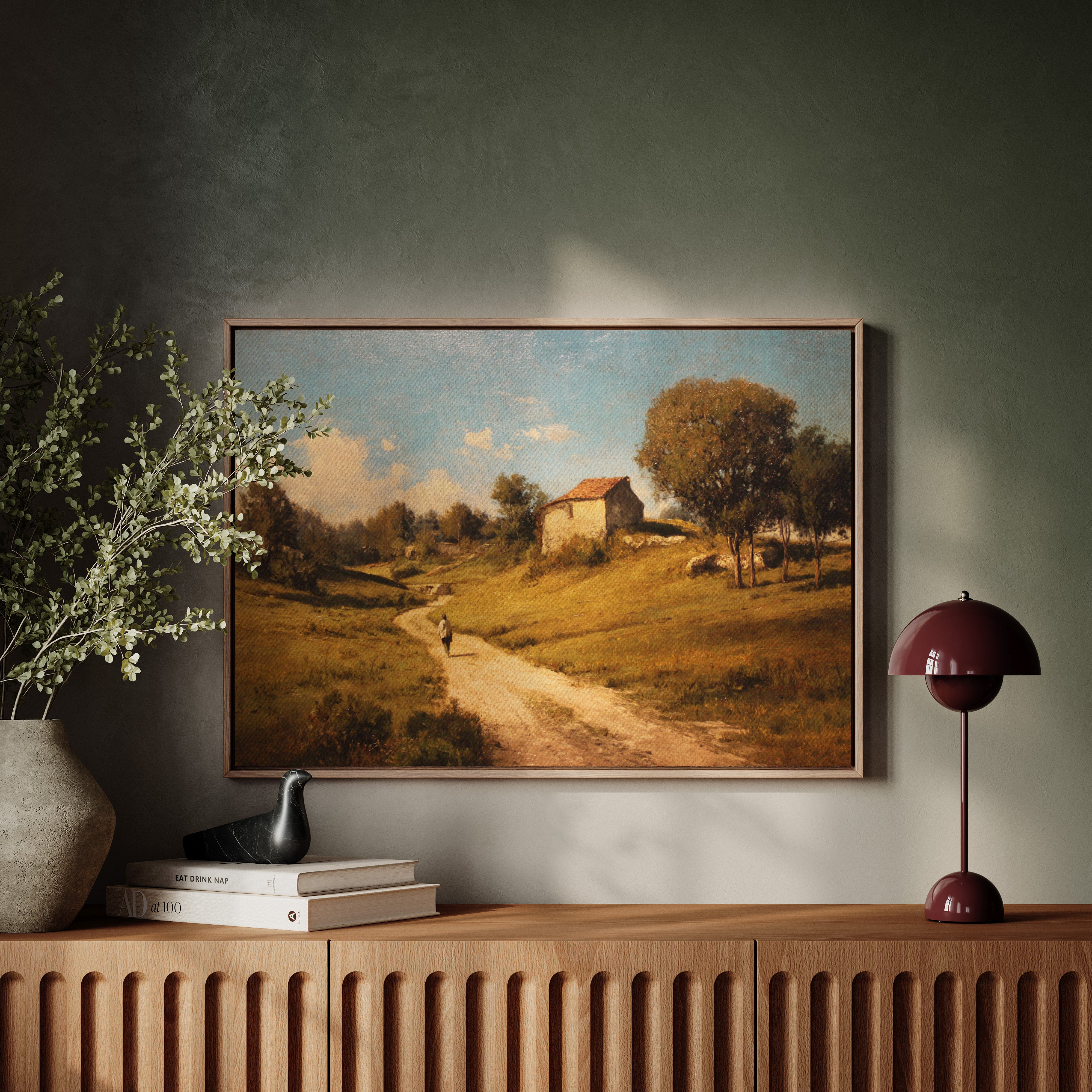 A winding dirt path cuts through sun-drenched hills, leading a solitary traveler toward a weathered stone cottage. Golden afternoon light bathes the pastoral landscape, where wild grasses sway beneath a cerulean sky dotted with billowing clouds. The scene captures a timeless moment of rural tranquility, with mature trees standing sentinel over the rolling terrain and the rustic building's terra cotta roof glowing in the warm light. This evocative landscape would bring a sense of peaceful contemplation to a living room or study, where its warm tones and serene composition can create a window into a simpler time.