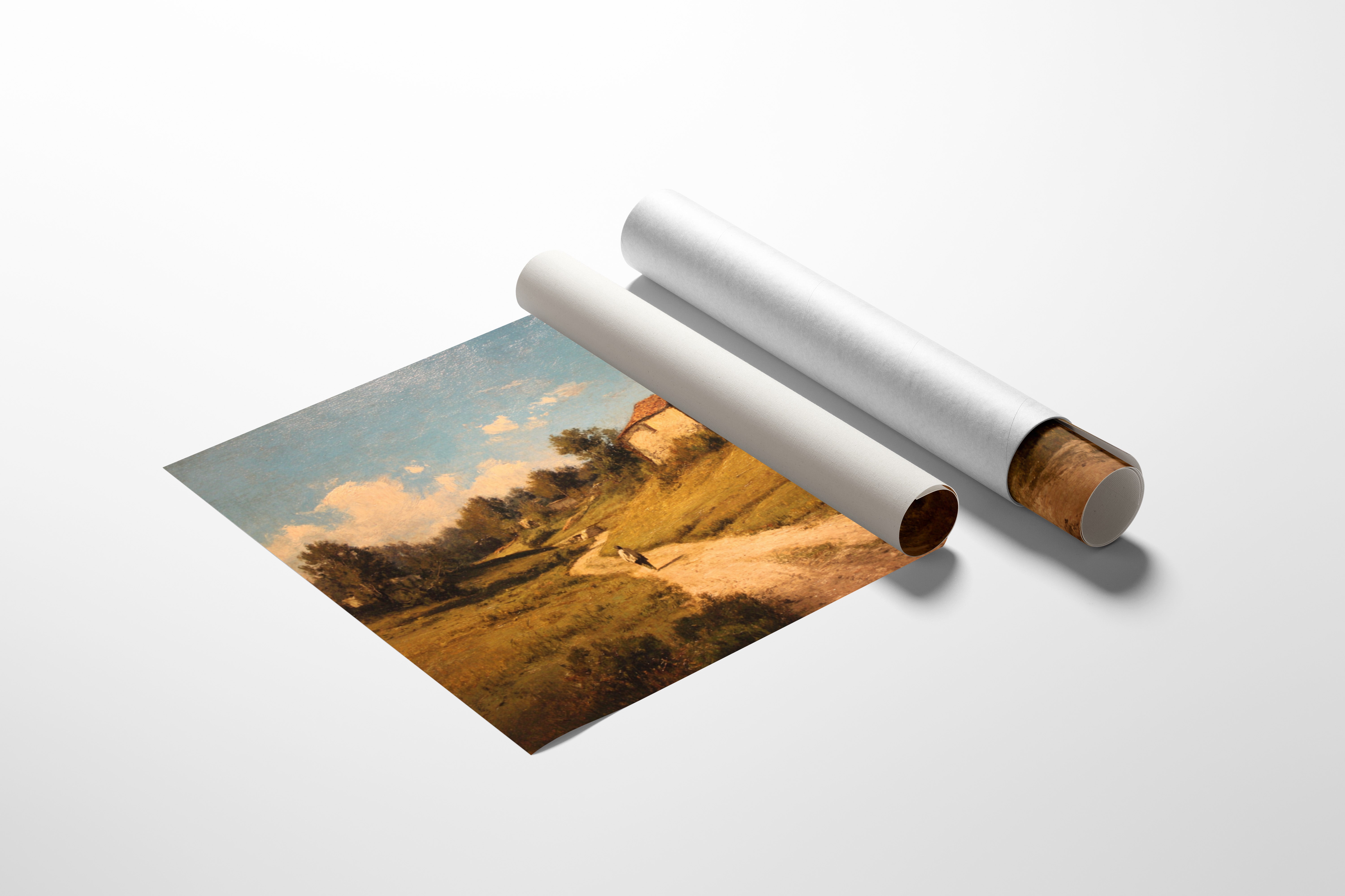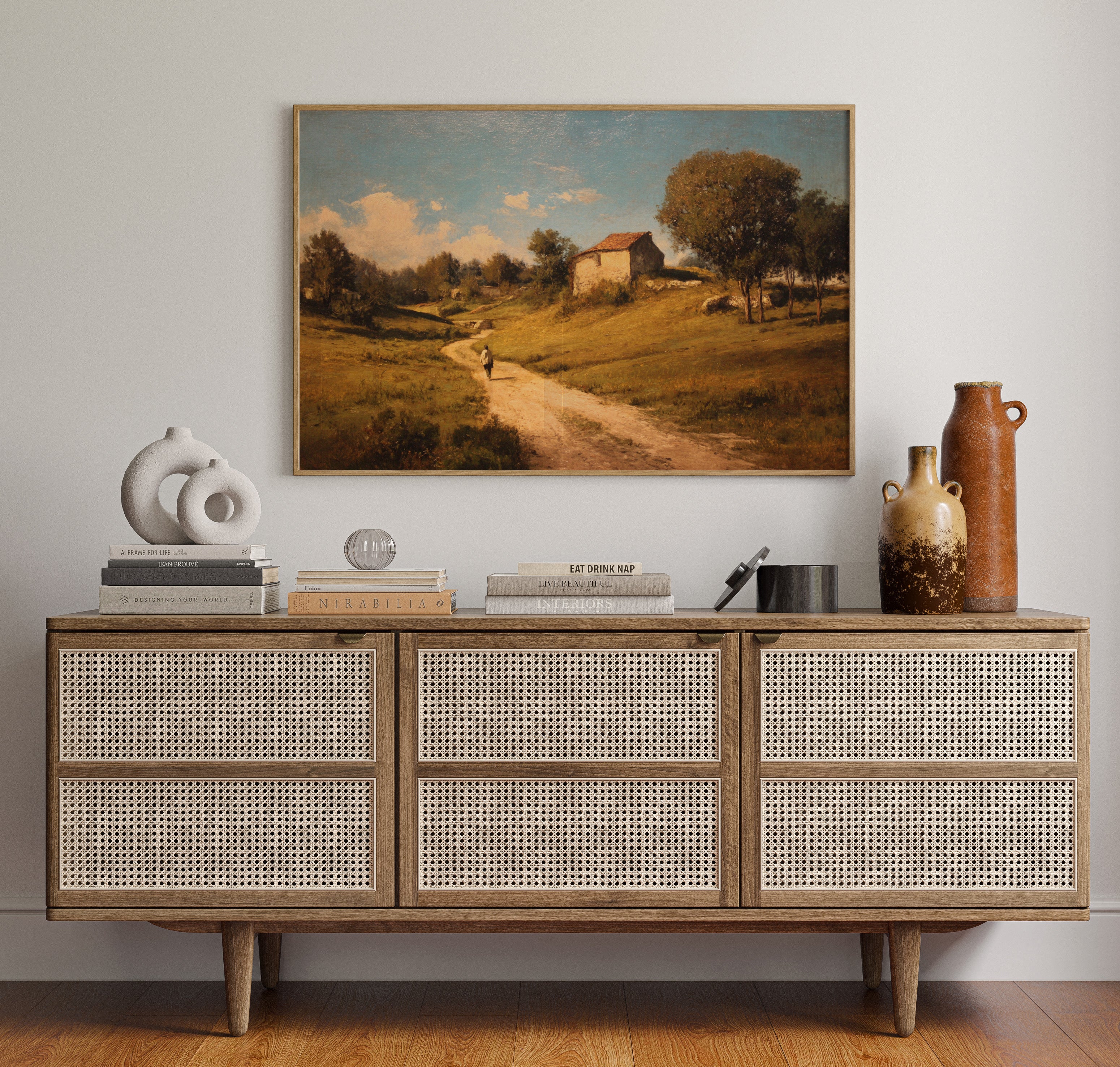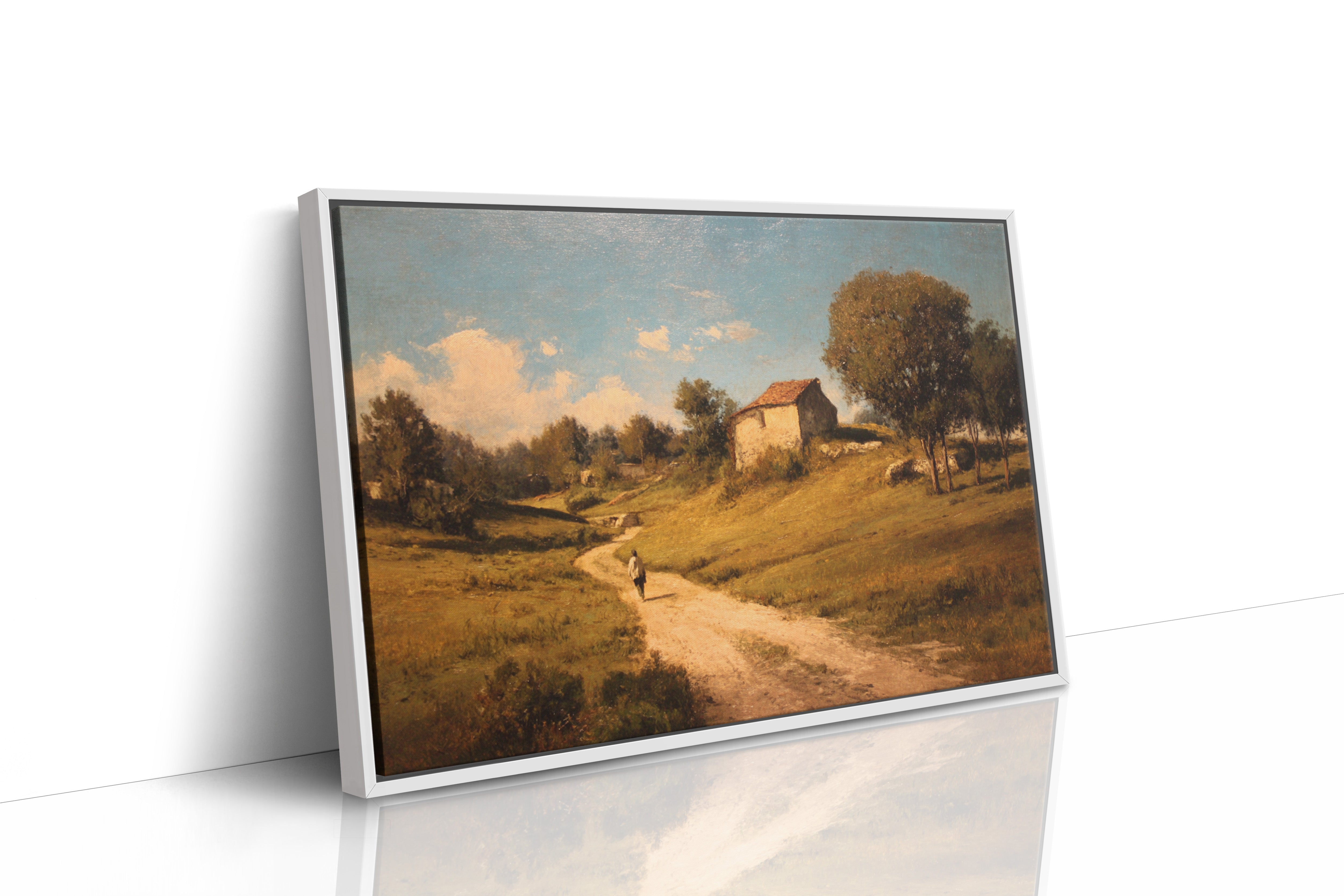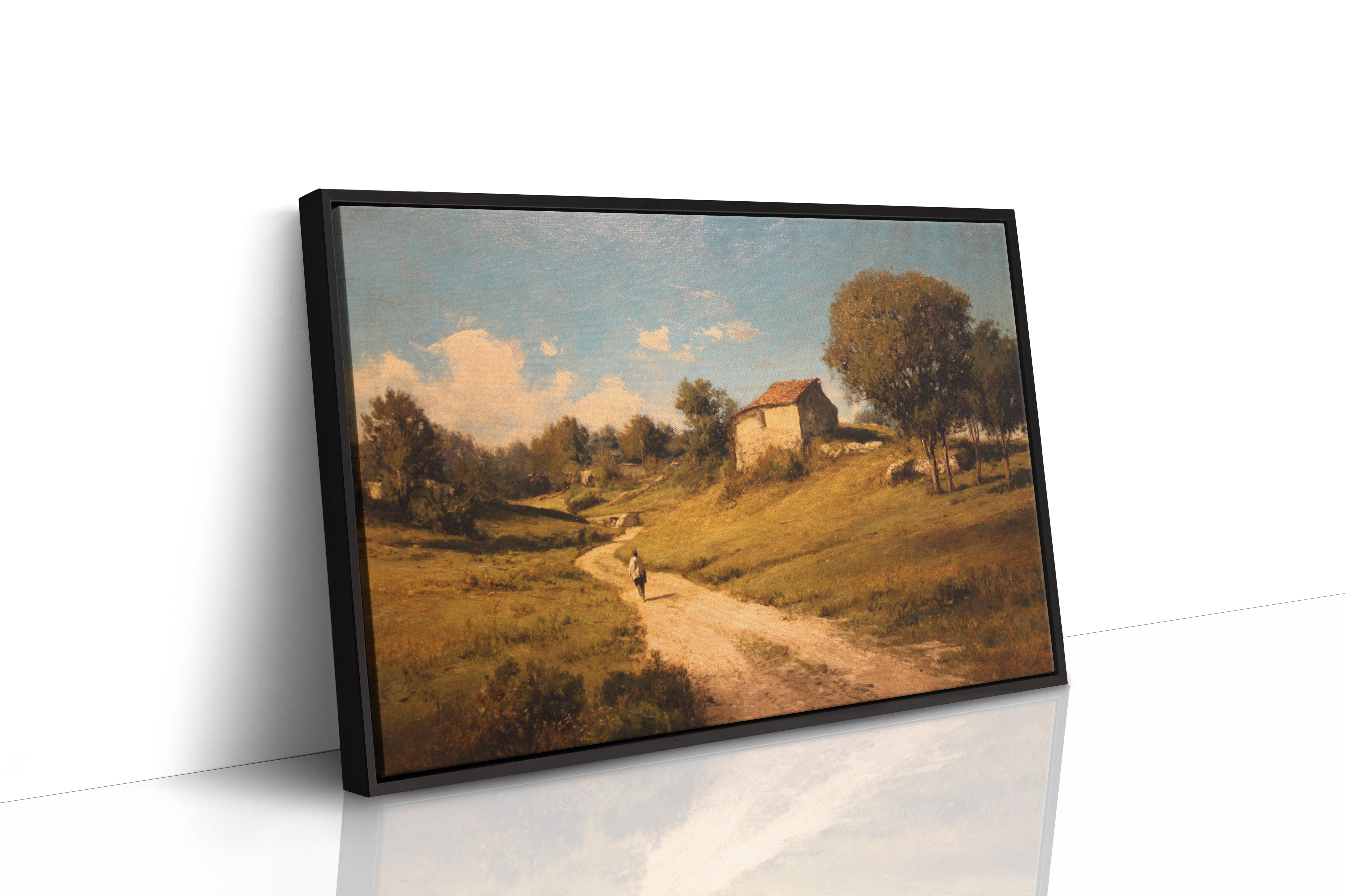 A winding dirt path cuts through sun-drenched hills, leading a solitary traveler toward a weathered stone cottage. Golden afternoon light bathes the pastoral landscape, where wild grasses sway beneath a cerulean sky dotted with billowing clouds. The scene captures a timeless moment of rural tranquility, with mature trees standing sentinel over the rolling terrain and the rustic building's terra cotta roof glowing in the warm light. This evocative landscape would bring a sense of peaceful contemplation to a living room or study, where its warm tones and serene composition can create a window into a simpler time.