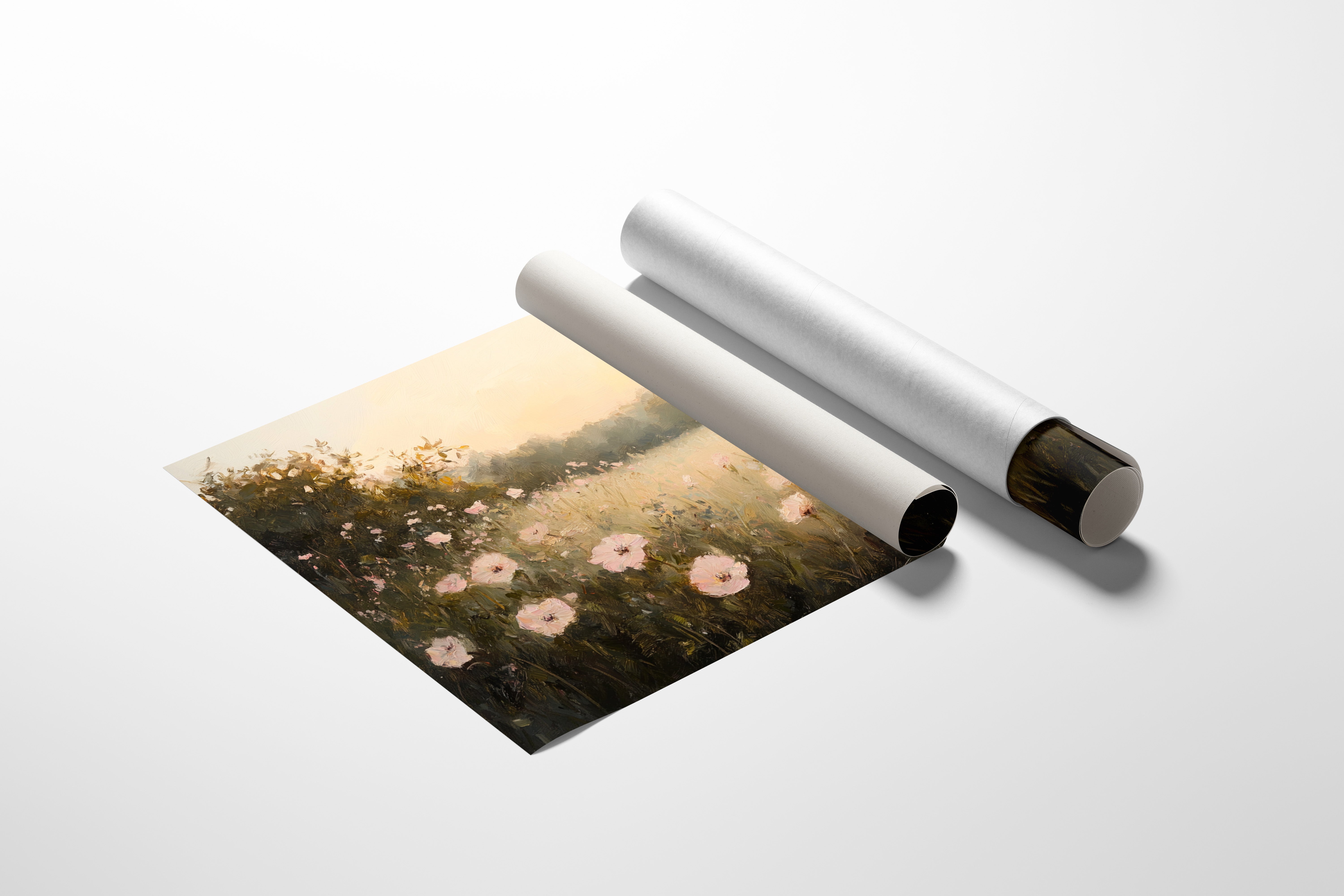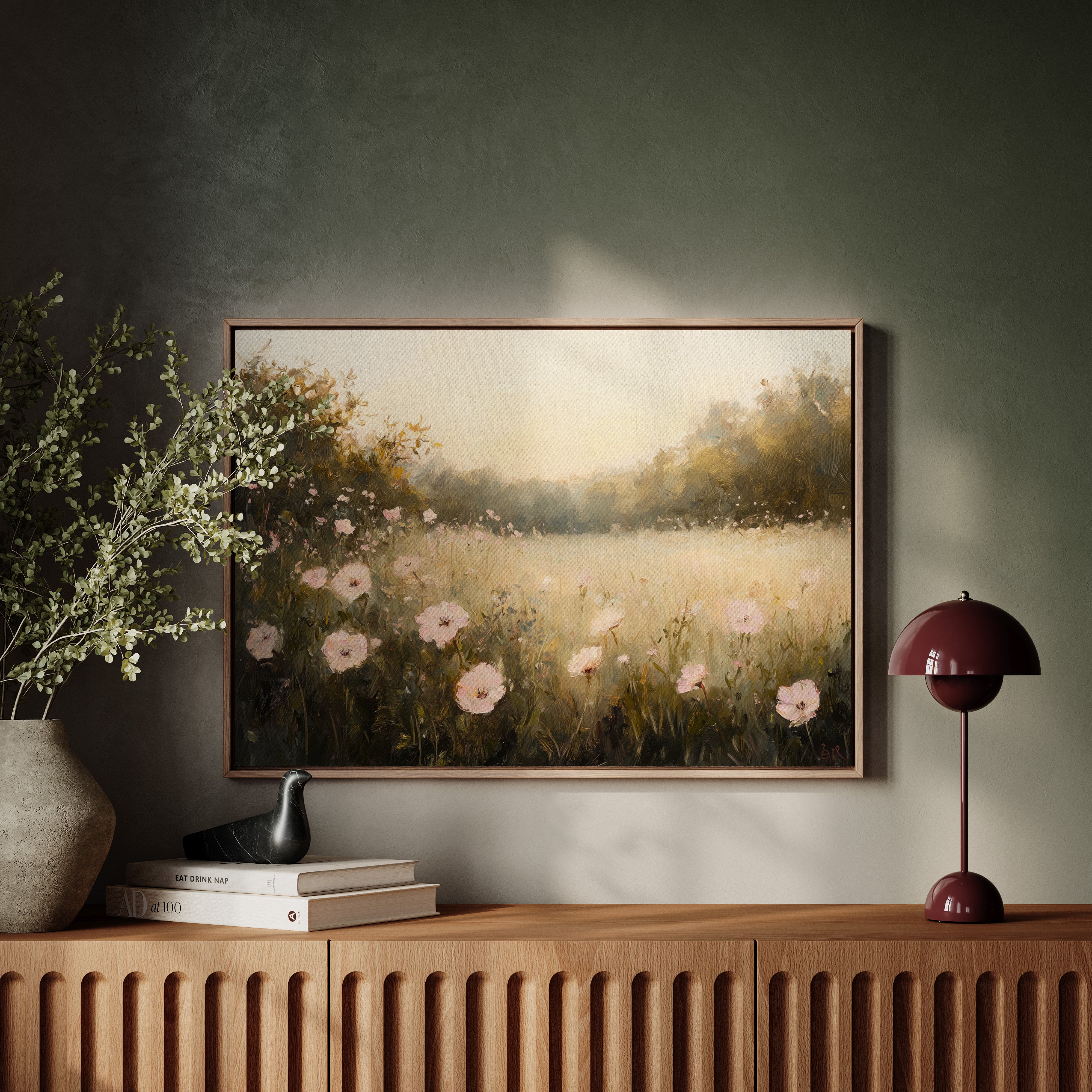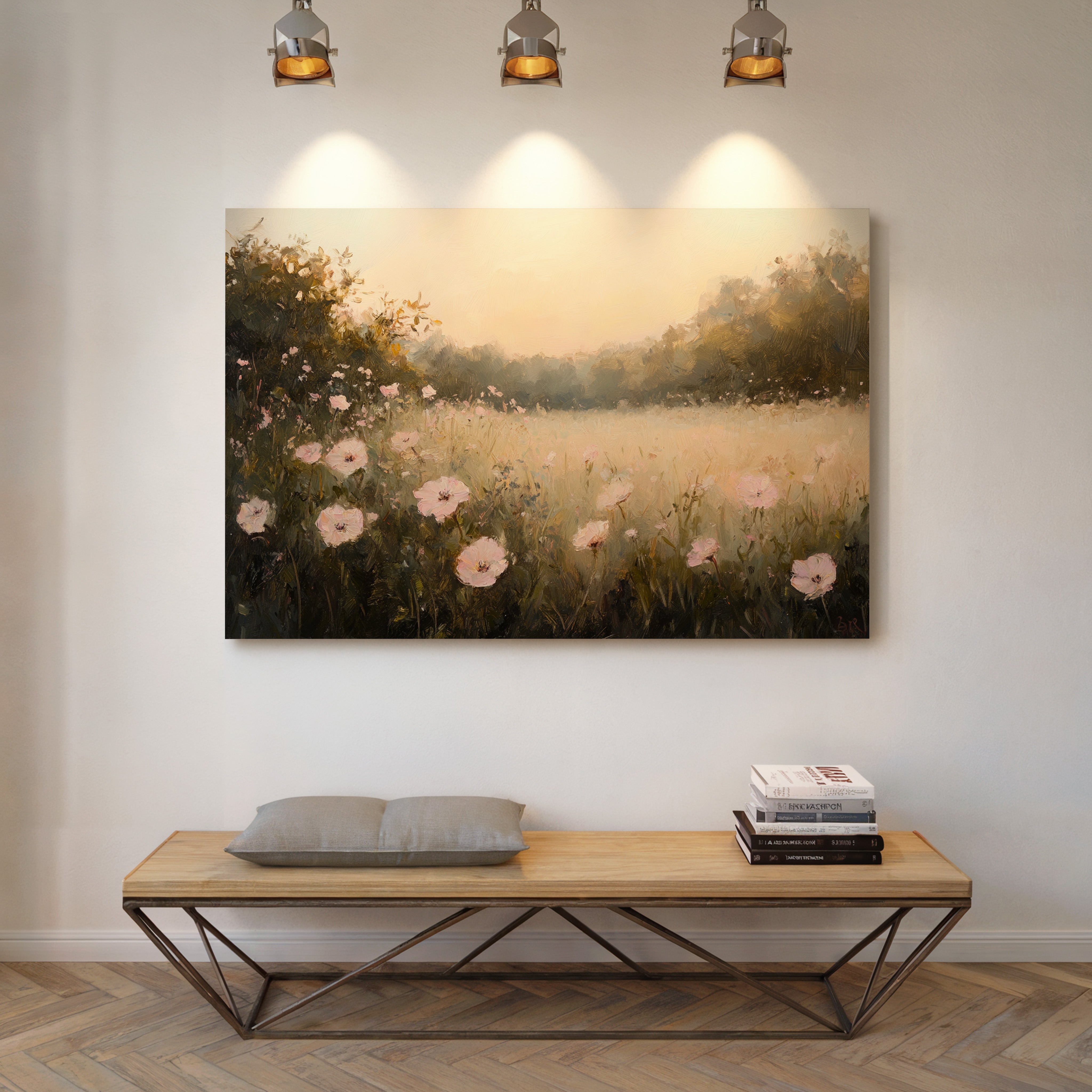 Soft morning light bathes a meadow where delicate pink poppies sway in the gentle breeze, their petals catching the first golden rays of daybreak. The impressionistic brushstrokes capture the dreamy essence of a pastoral morning, where wild blooms stand sentinel against a backdrop of misty forest greens. Rich textures blend the untamed grass with ethereal florals, creating a harmonious dance between light and shadow. This tranquil scene would bring natural serenity to a bedroom or reading nook, offering a daily reminder of summer's gentle awakening.
