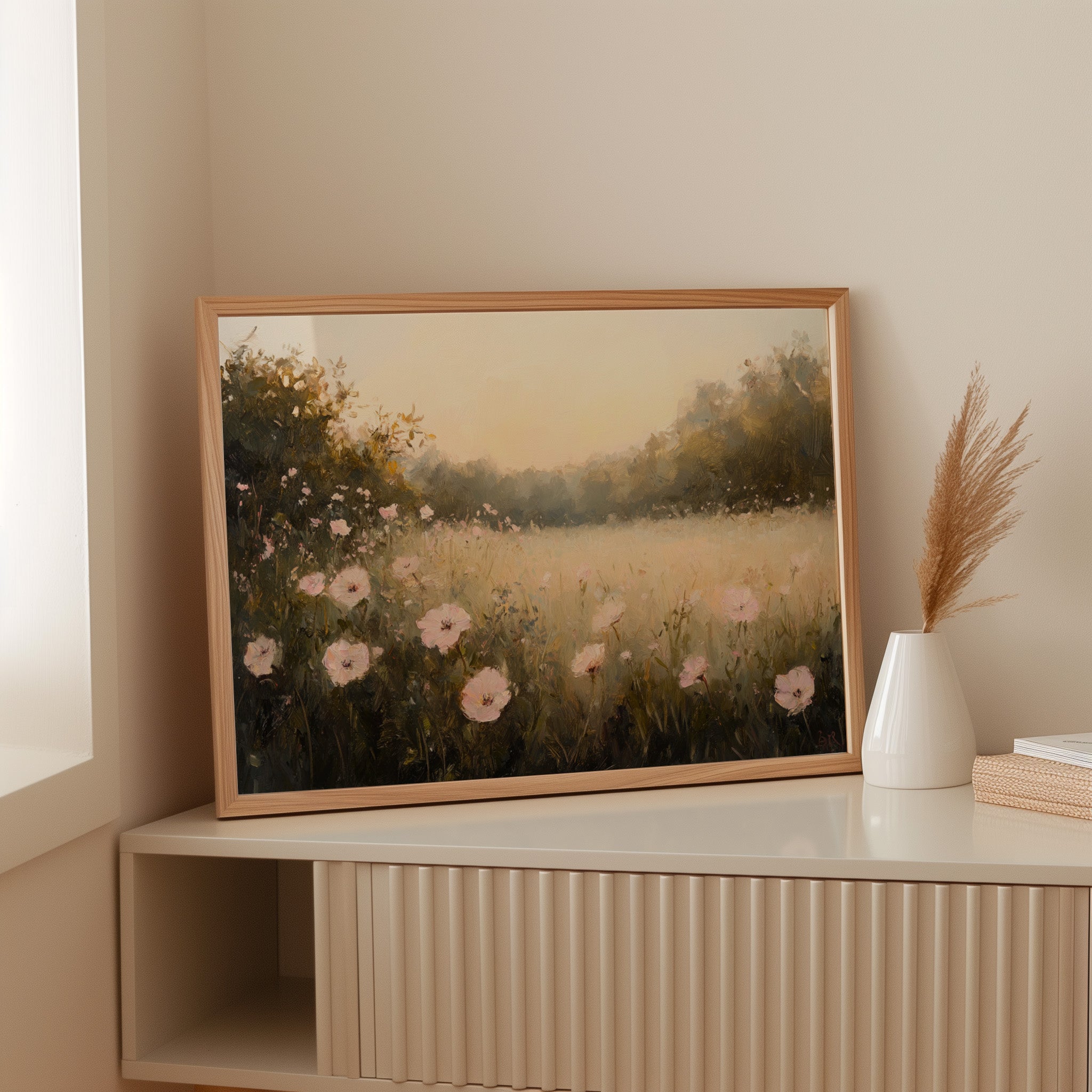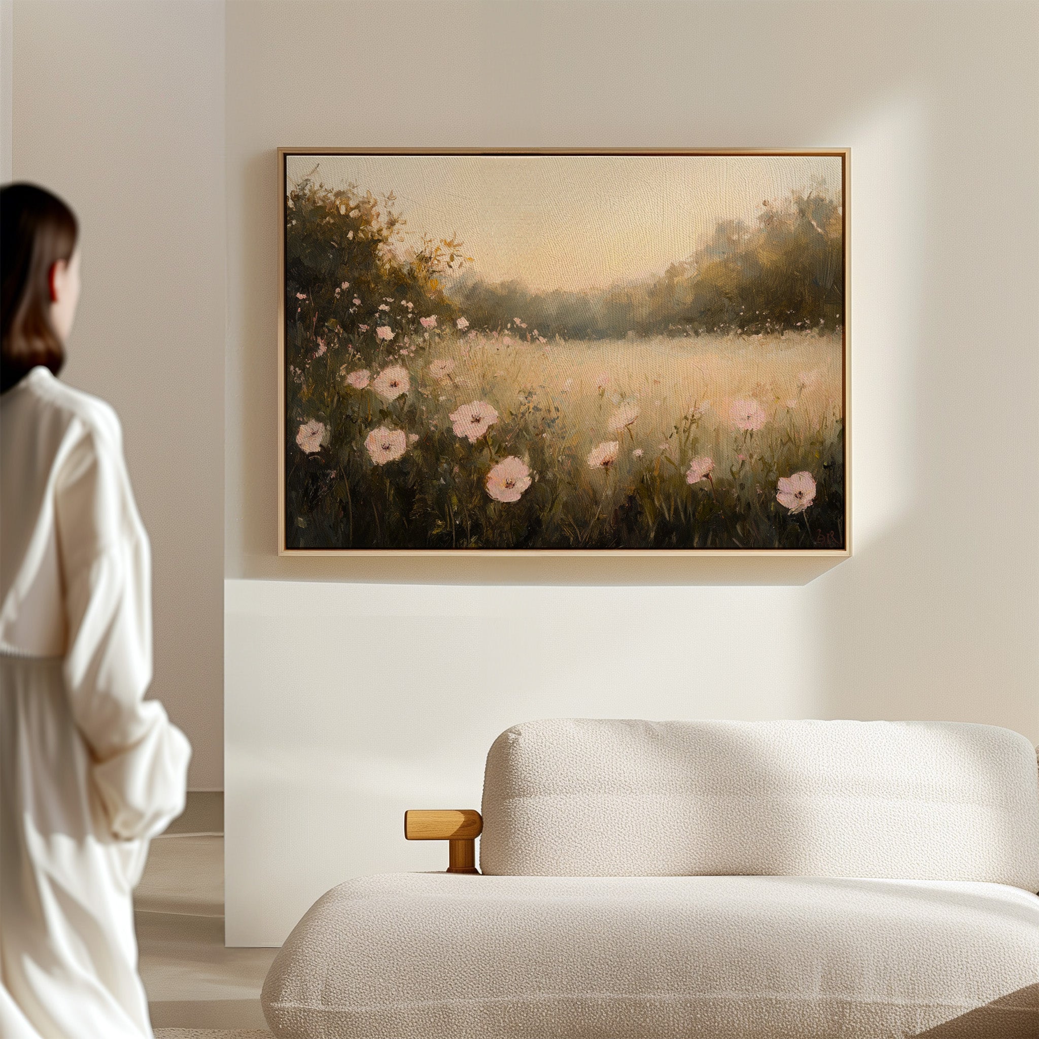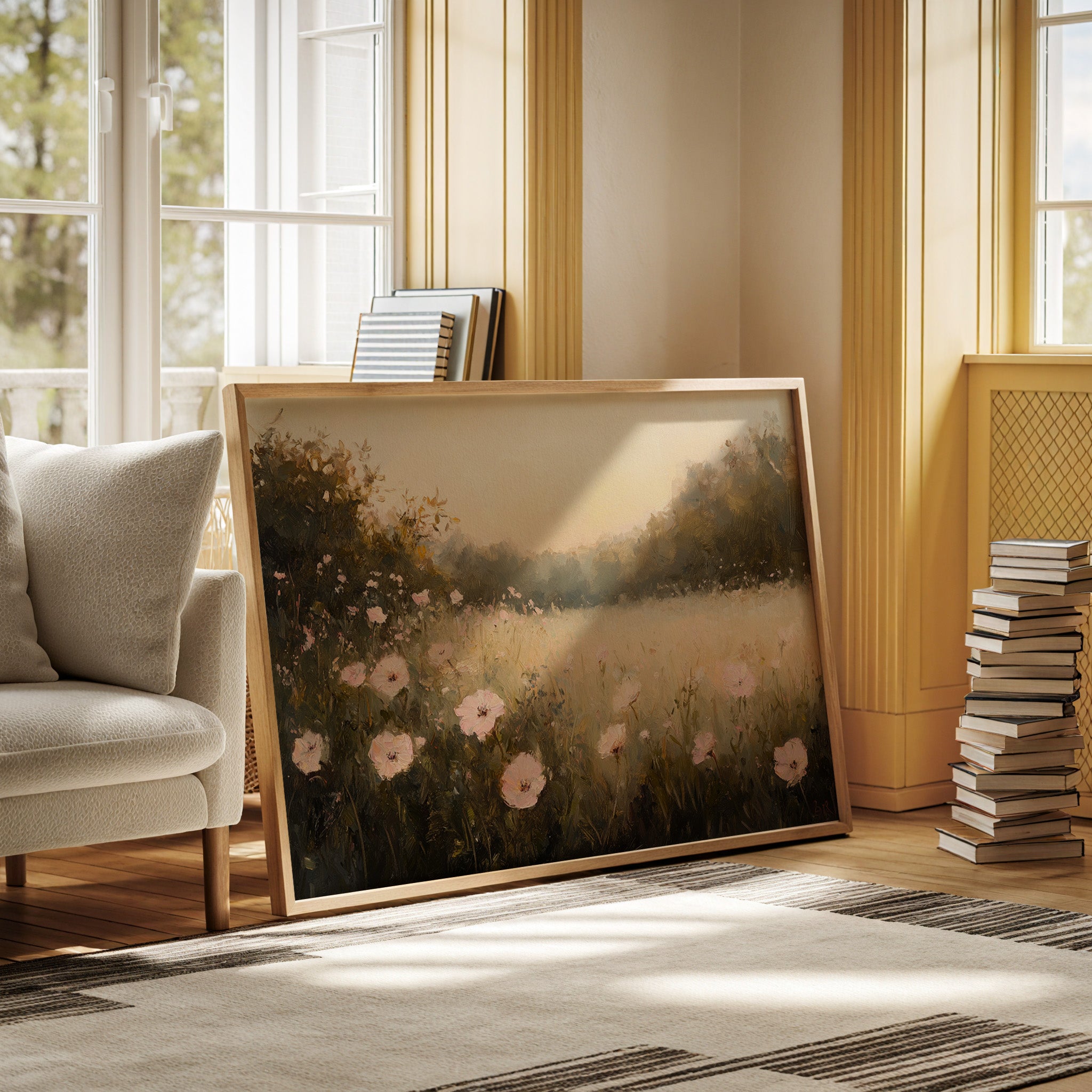 Soft morning light bathes a meadow where delicate pink poppies sway in the gentle breeze, their petals catching the first golden rays of daybreak. The impressionistic brushstrokes capture the dreamy essence of a pastoral morning, where wild blooms stand sentinel against a backdrop of misty forest greens. Rich textures blend the untamed grass with ethereal florals, creating a harmonious dance between light and shadow. This tranquil scene would bring natural serenity to a bedroom or reading nook, offering a daily reminder of summer's gentle awakening.