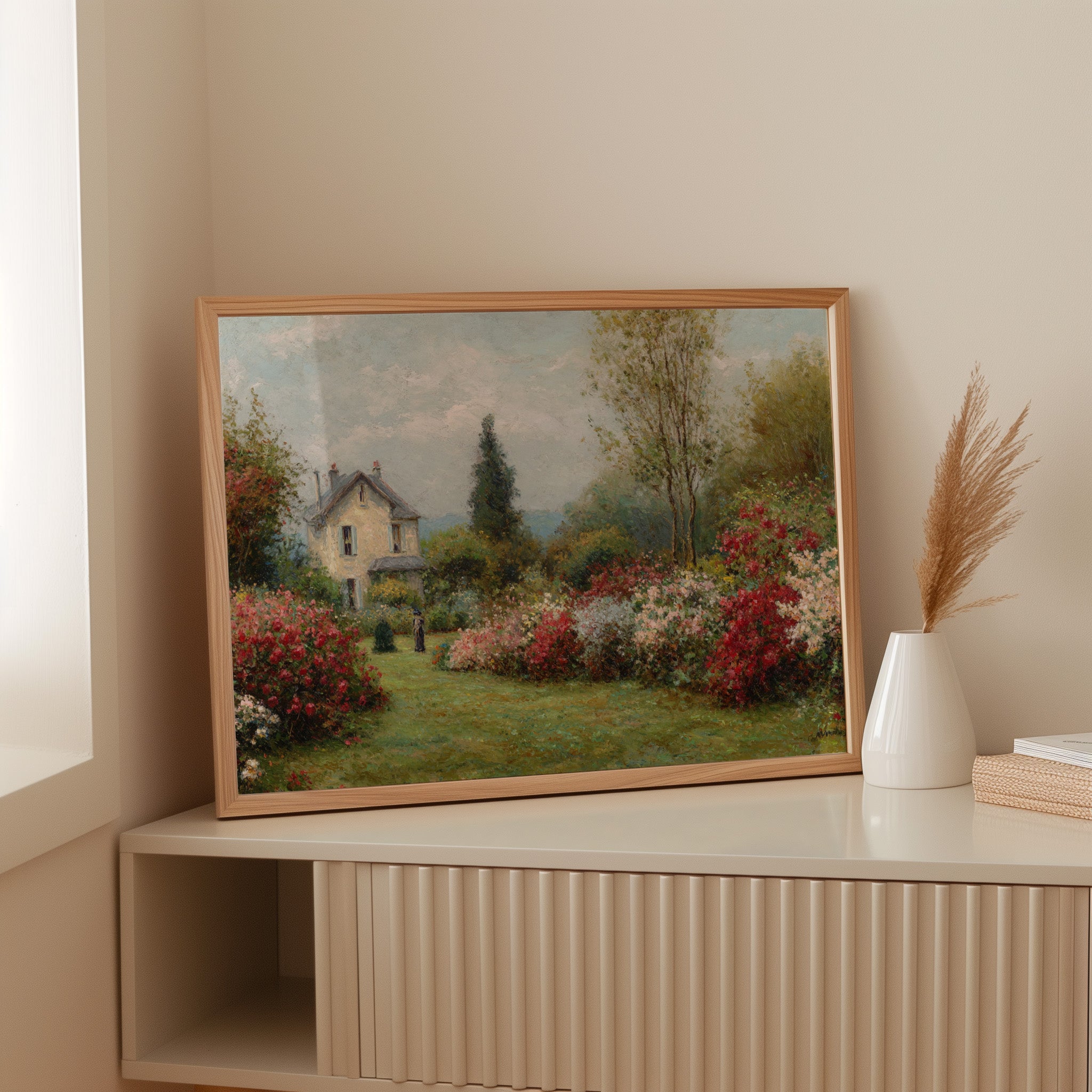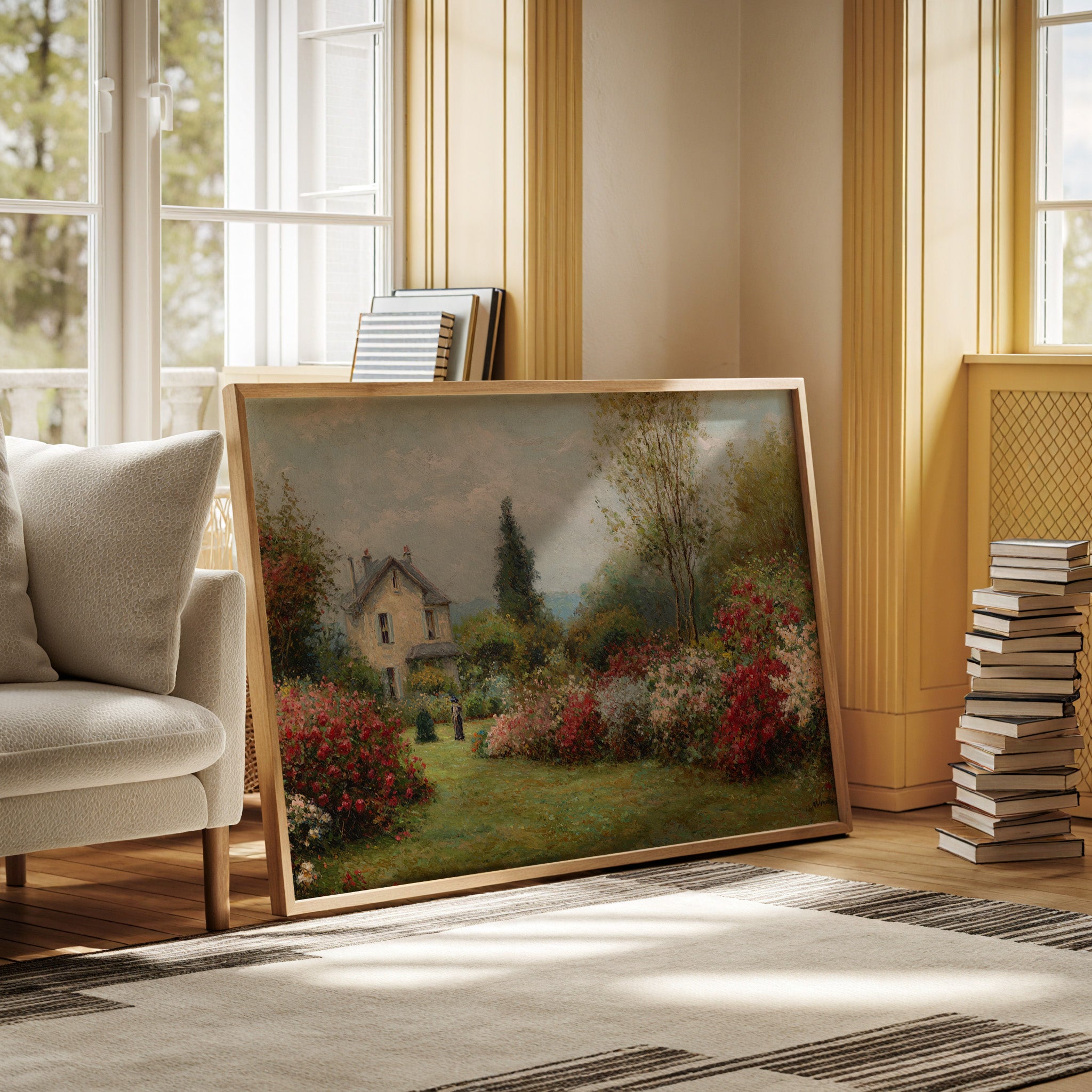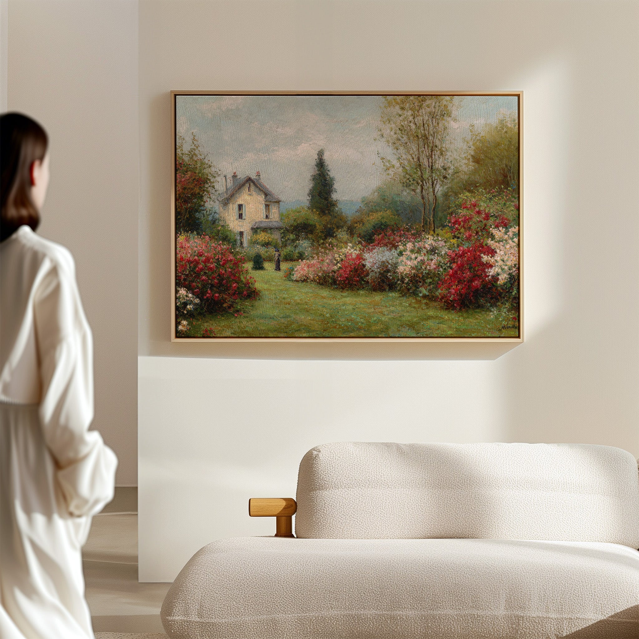 A charming stone cottage stands sentinel in a garden where time seems to pause between seasons. Crimson and blush roses spill across emerald lawns, creating nature's own embrace around the quaint dwelling. The scene captures the essence of a French countryside morning, where dappled sunlight plays across cream-colored walls and twin chimneys reach toward cotton-cloud skies. A solitary figure in dark attire adds a touch of human presence to this pastoral paradise, suggesting quiet contemplation amid the blooming abundance. This piece brings the tranquility of a country garden into any space, perfect for creating a sense of escape in a reading nook or bringing romantic charm to a bedroom sanctuary.