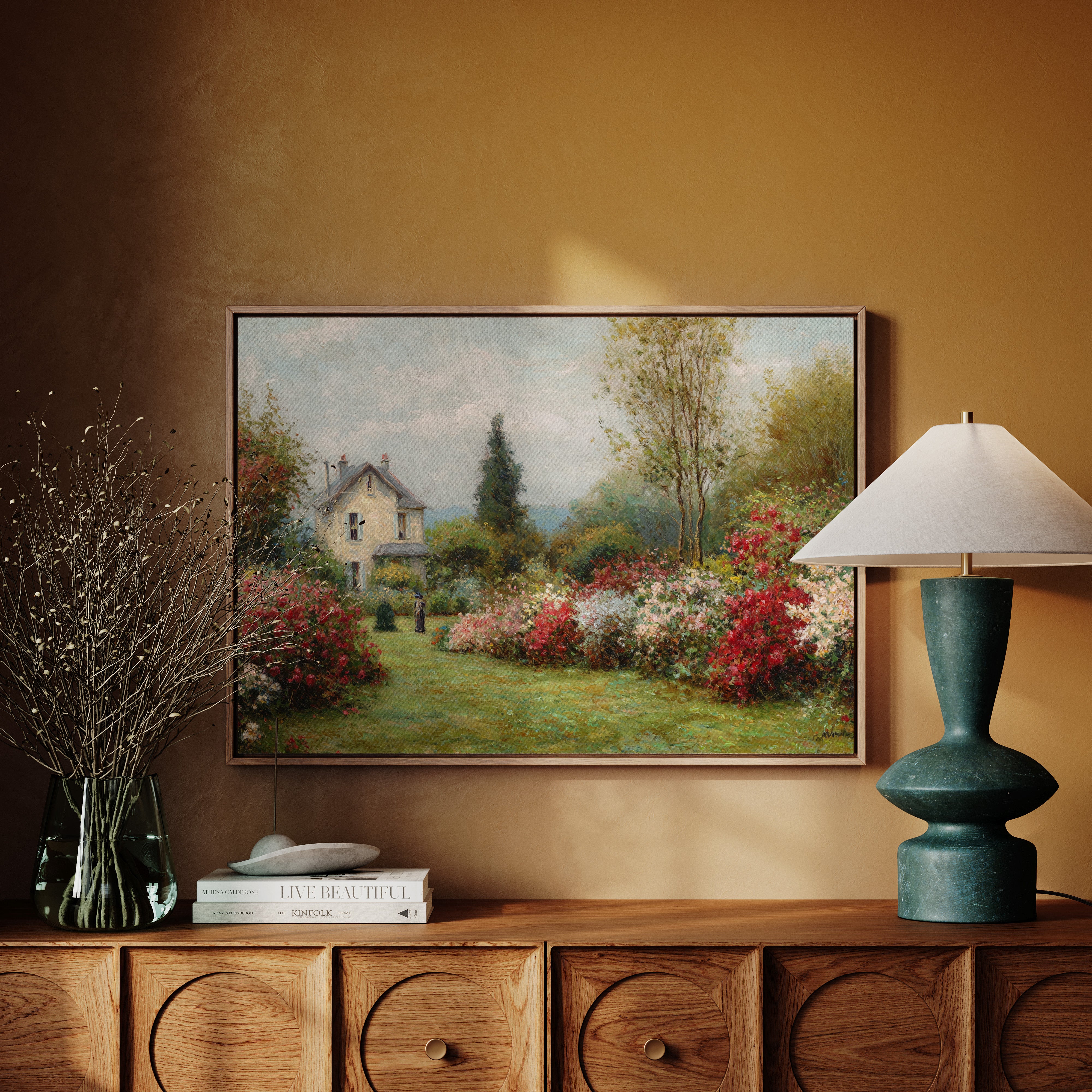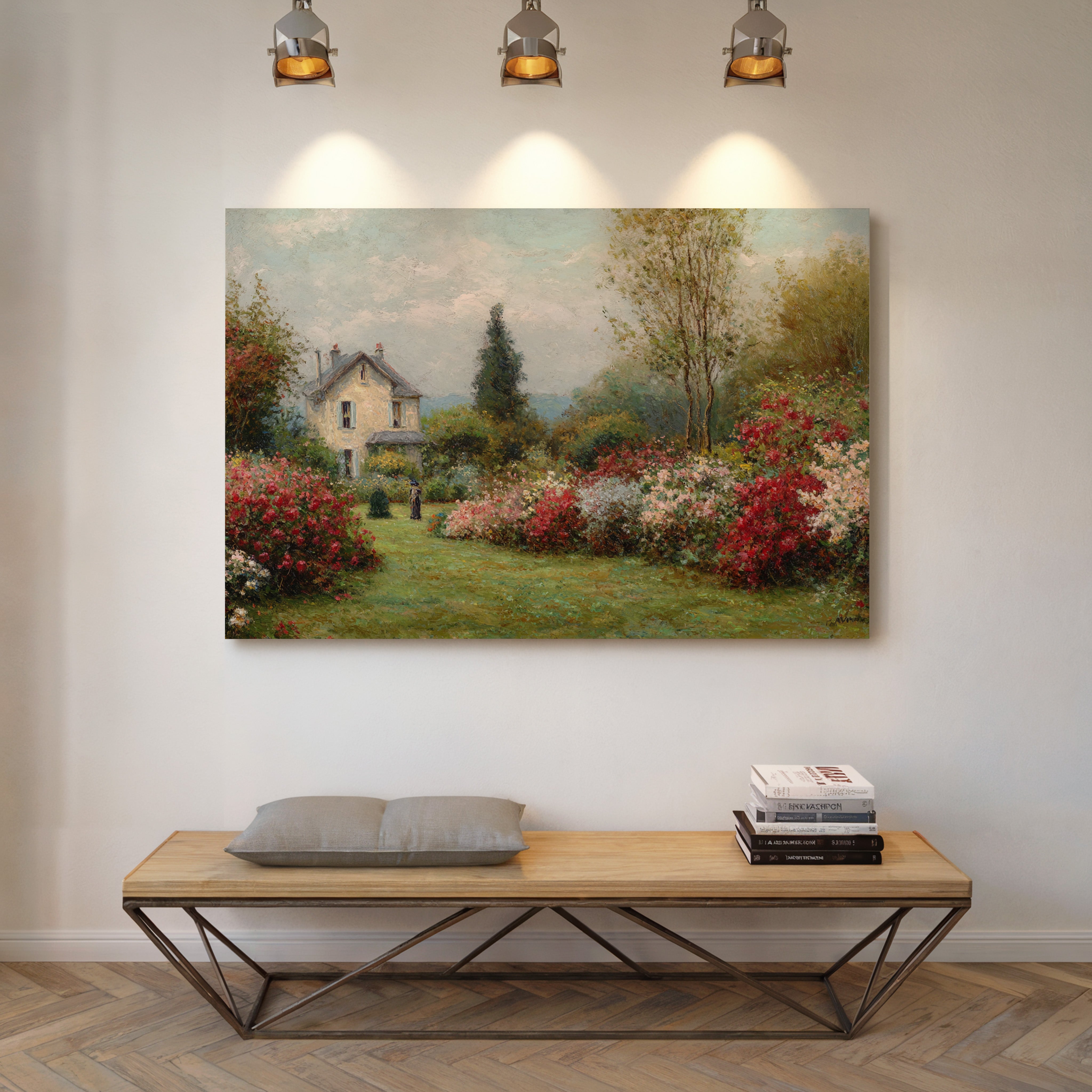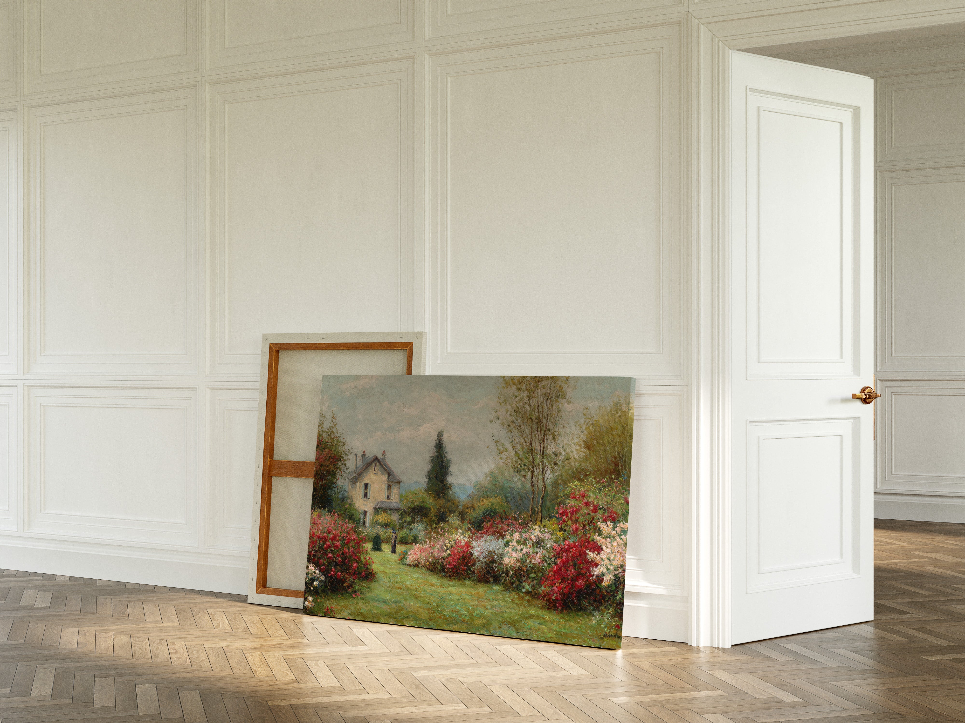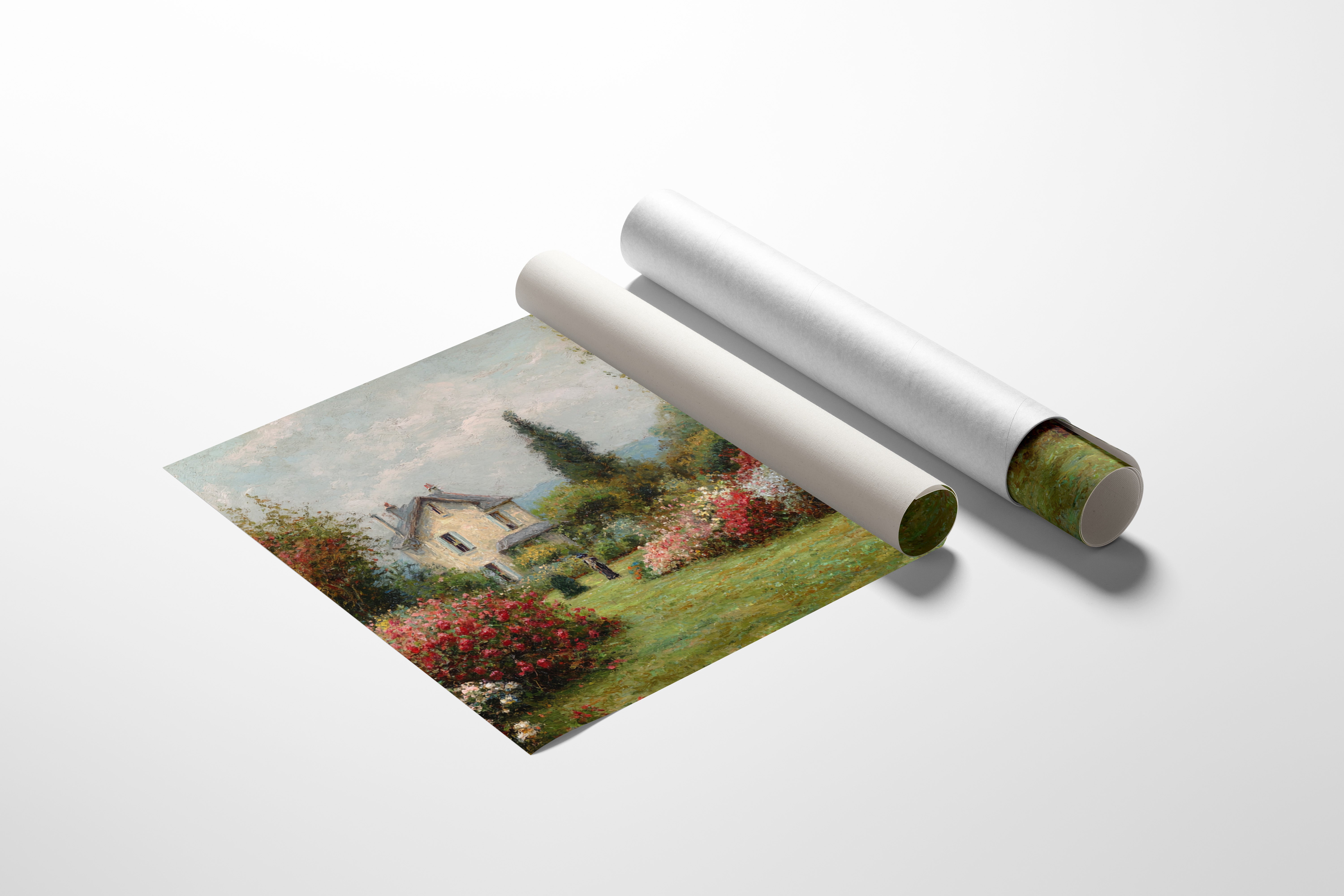 A charming stone cottage stands sentinel in a garden where time seems to pause between seasons. Crimson and blush roses spill across emerald lawns, creating nature's own embrace around the quaint dwelling. The scene captures the essence of a French countryside morning, where dappled sunlight plays across cream-colored walls and twin chimneys reach toward cotton-cloud skies. A solitary figure in dark attire adds a touch of human presence to this pastoral paradise, suggesting quiet contemplation amid the blooming abundance. This piece brings the tranquility of a country garden into any space, perfect for creating a sense of escape in a reading nook or bringing romantic charm to a bedroom sanctuary.