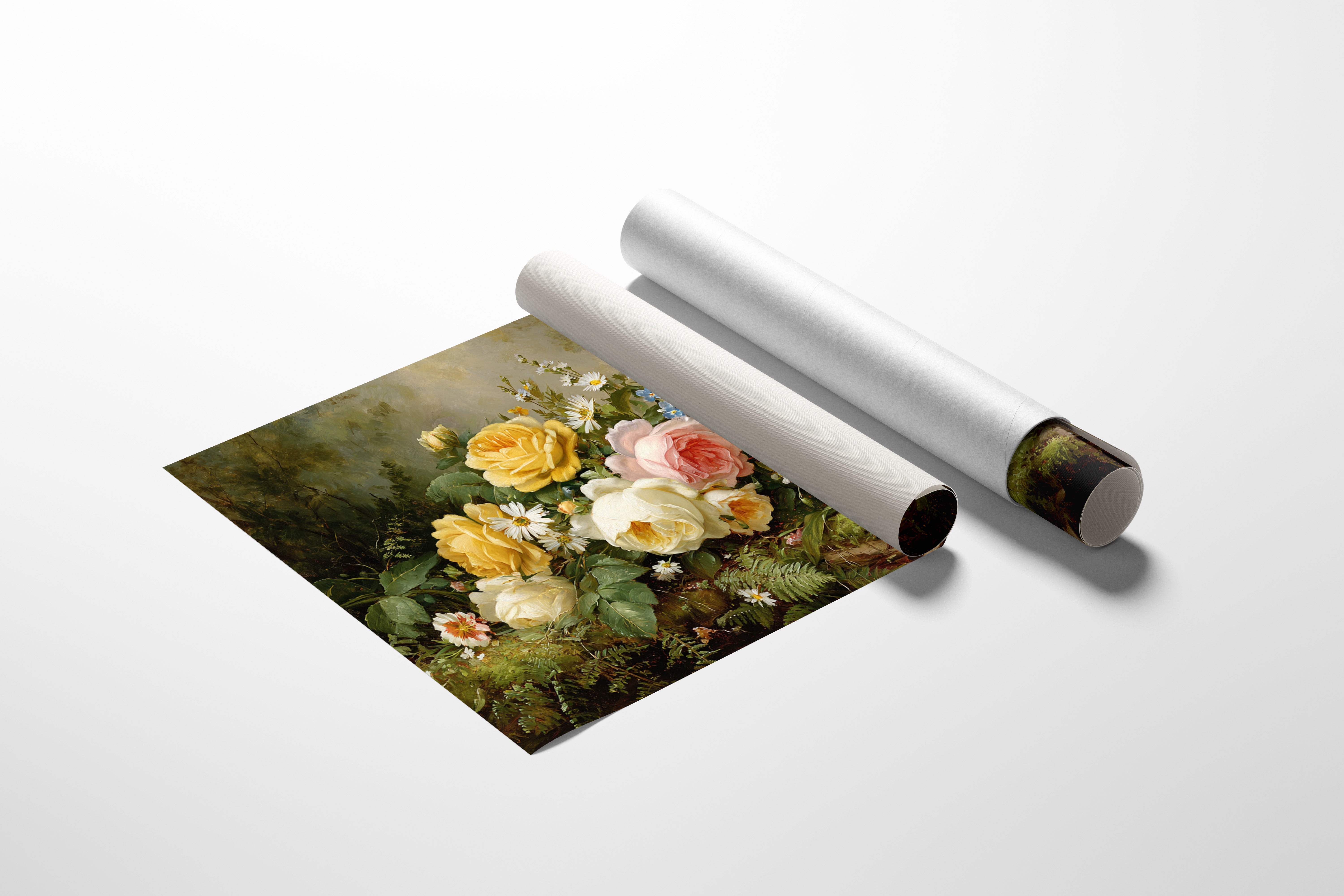 Sunlight filters through a garden's hidden corner, where roses unfurl their petals in a graceful display of nature's artistry. Yellow and pink roses take center stage, their luxuriant blooms complemented by delicate daisies and forget-me-nots scattered like stars against deep forest greens. The composition speaks of Victorian romance, with each flower telling its own story through layers of soft petals and rich textures. Perfect for bringing timeless elegance to a formal dining room or adding classic beauty to a reading nook where afternoon light plays among the blooms.