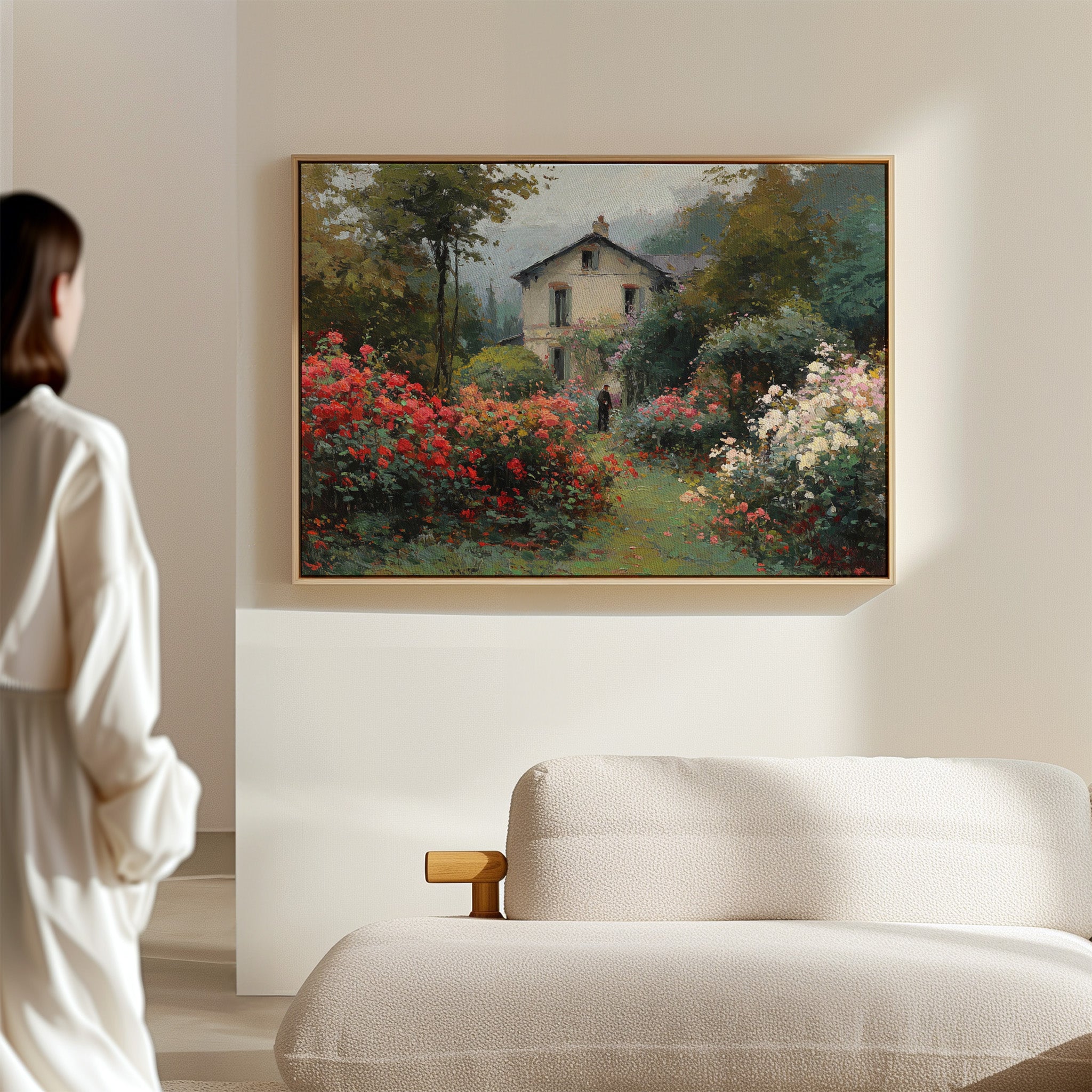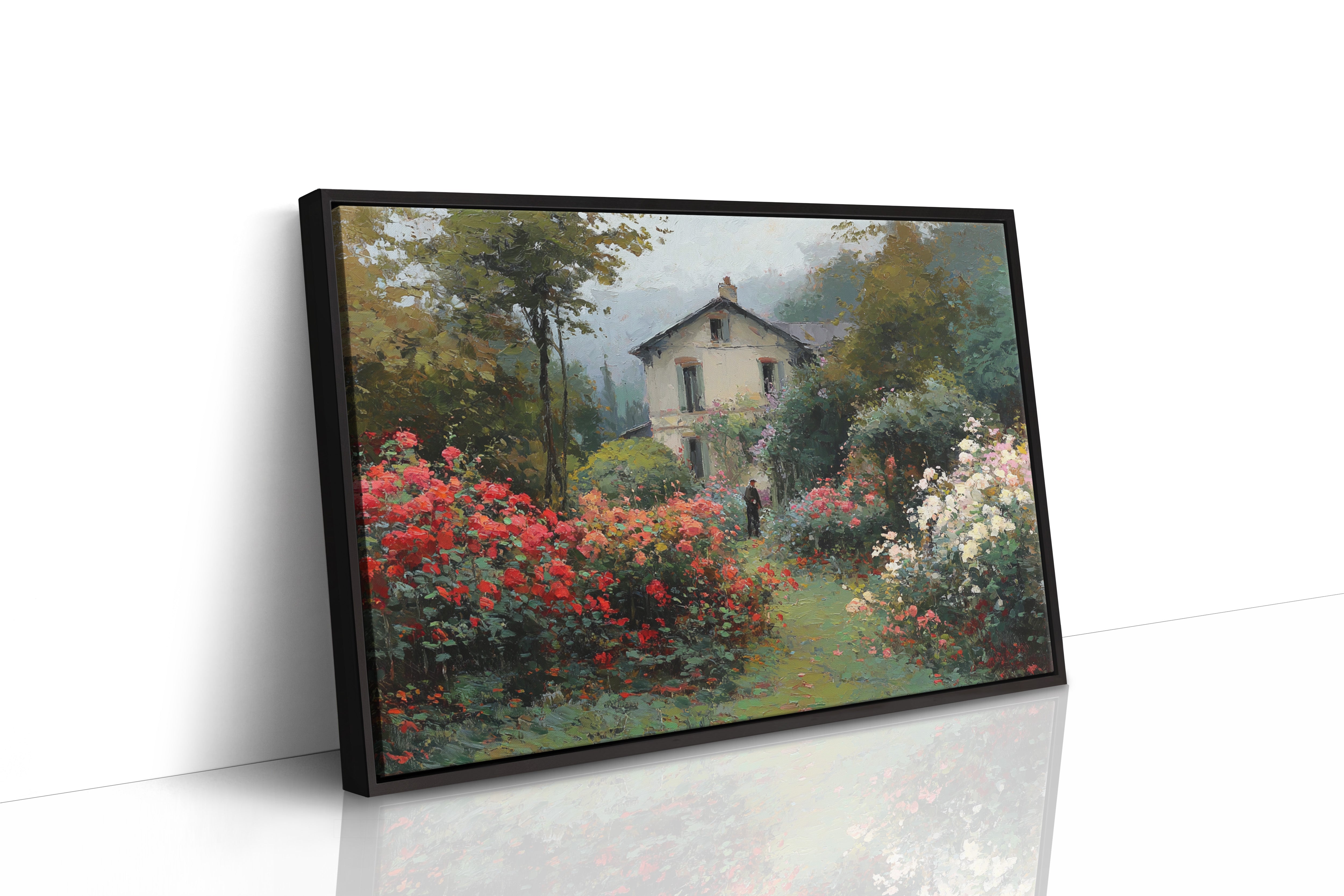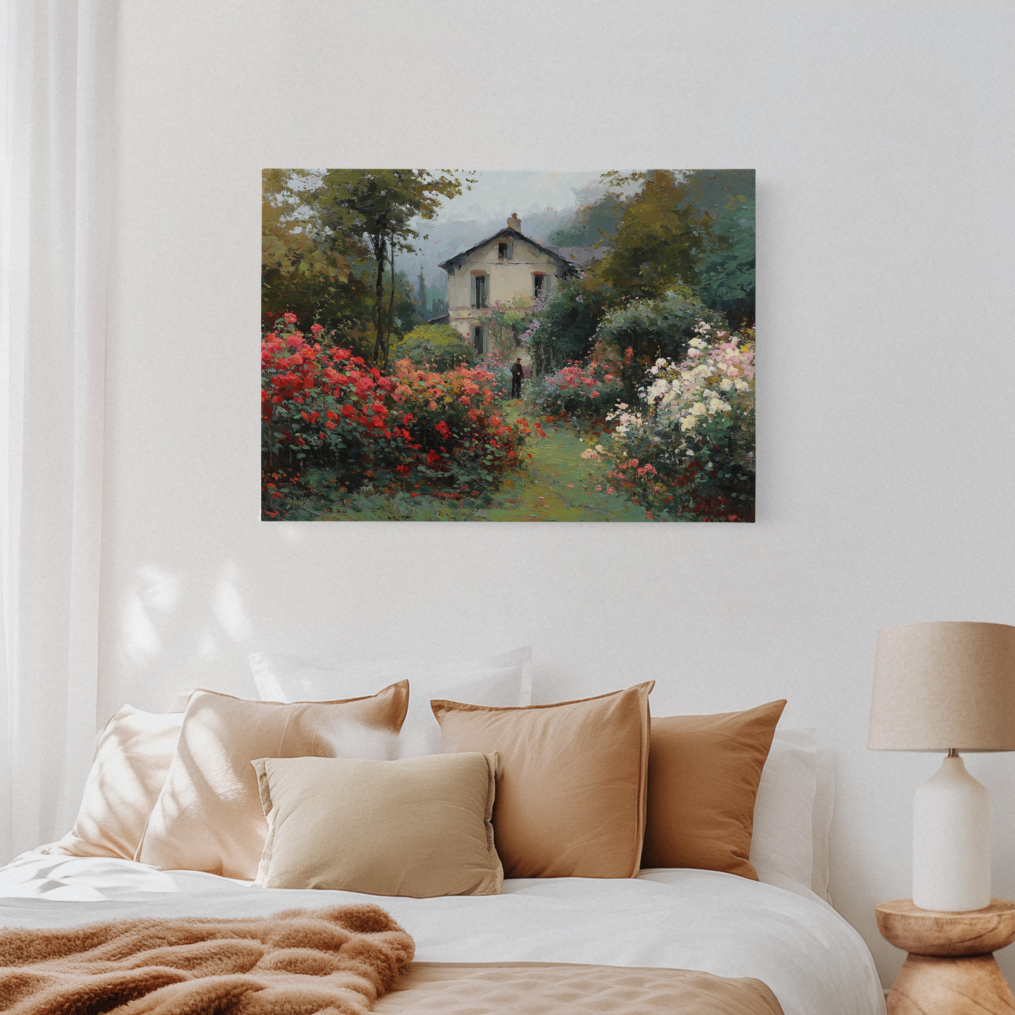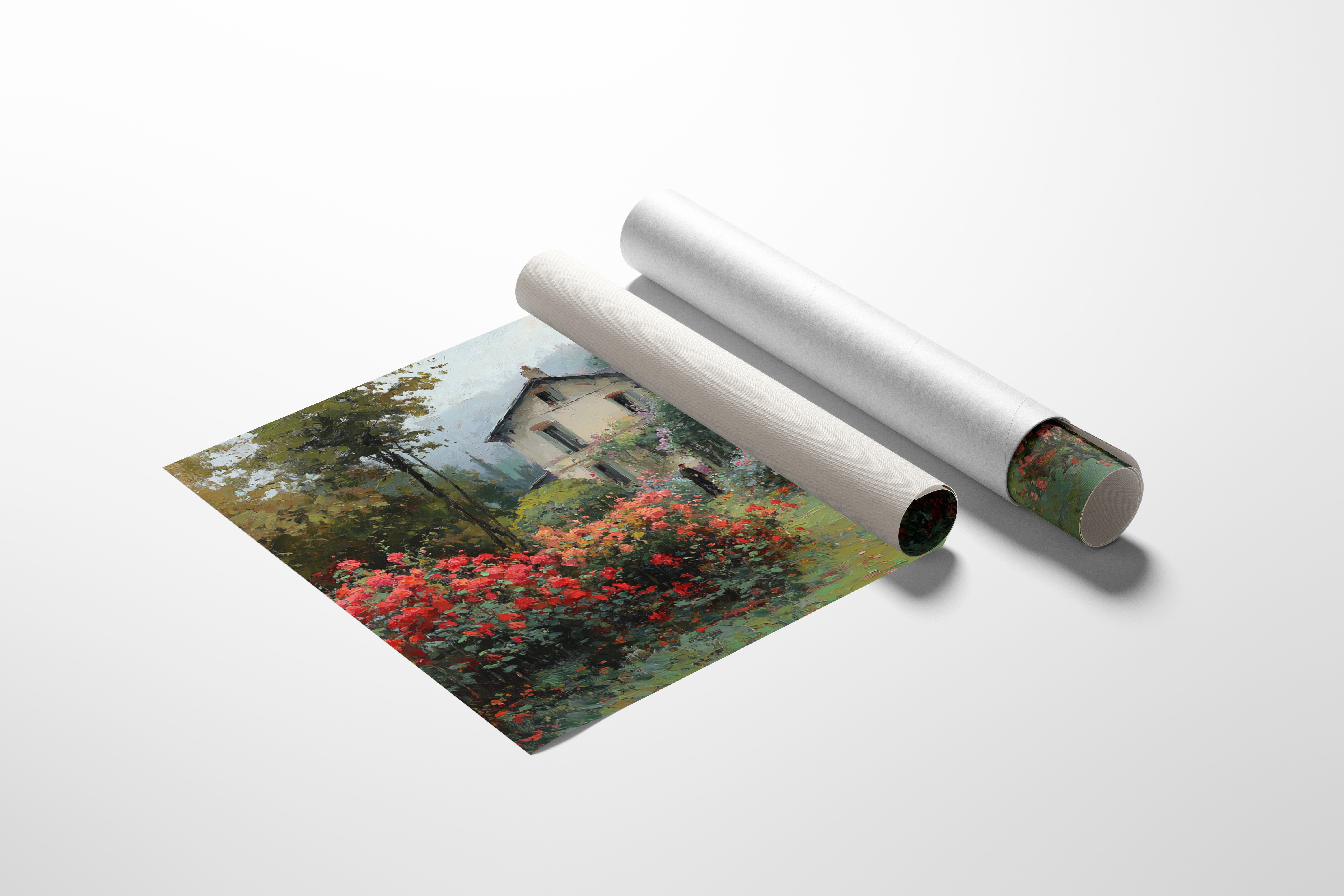 Morning mist lingers above a garden where crimson and ivory roses frame a meandering path, leading to a sun-bleached country house. The scene captures that fleeting moment when dewdrops still cling to petals and the day holds endless possibility. Rich brushstrokes build layers of verdant foliage and climbing blooms, while a solitary figure stands contemplatively amid this floral abundance. The interplay of light and shadow creates depth through the garden, where coral, cream, and burgundy flowers spill over their borders in wild abandon. This romantic scene would bring pastoral charm to a reading nook or create a window of escape in a bedroom sanctuary.