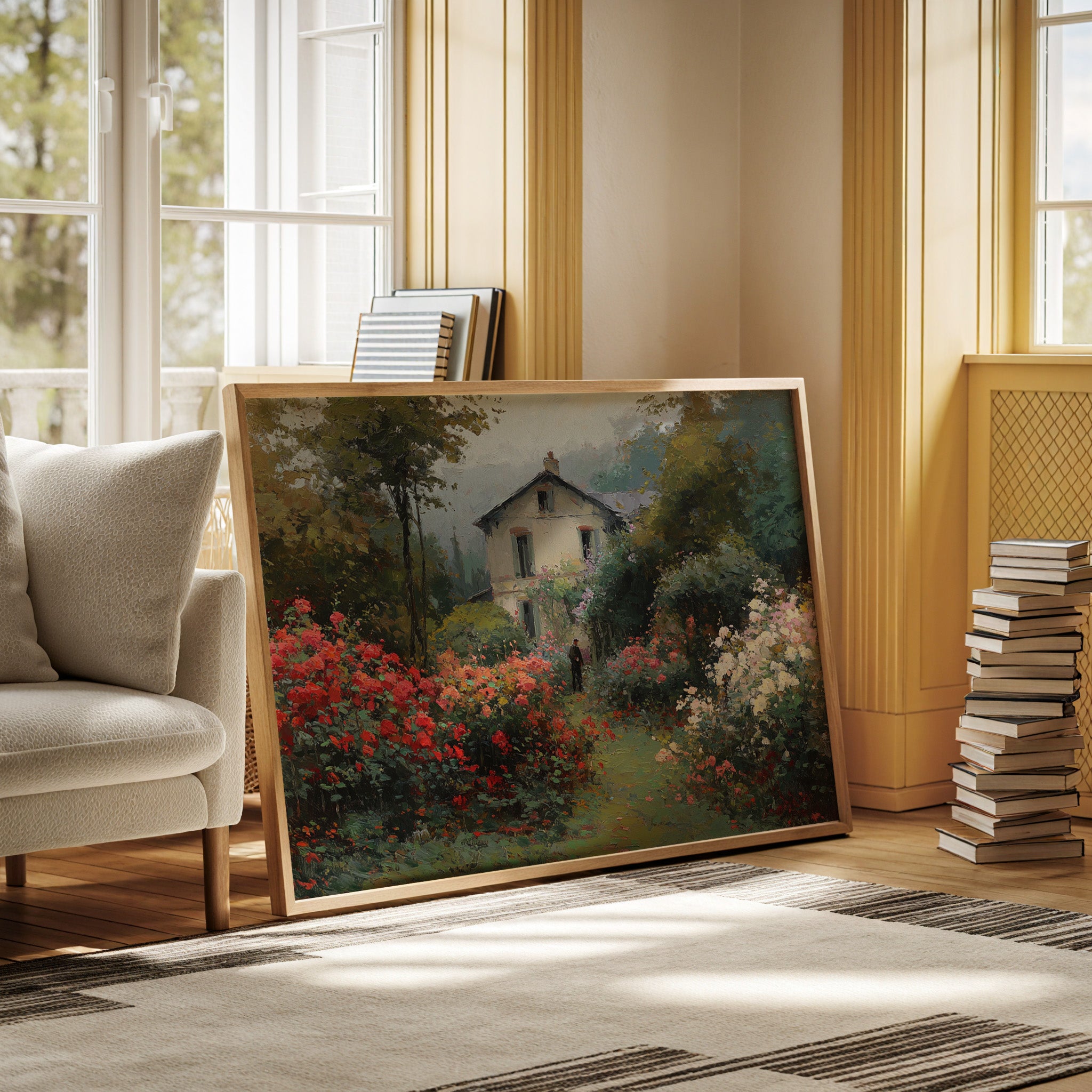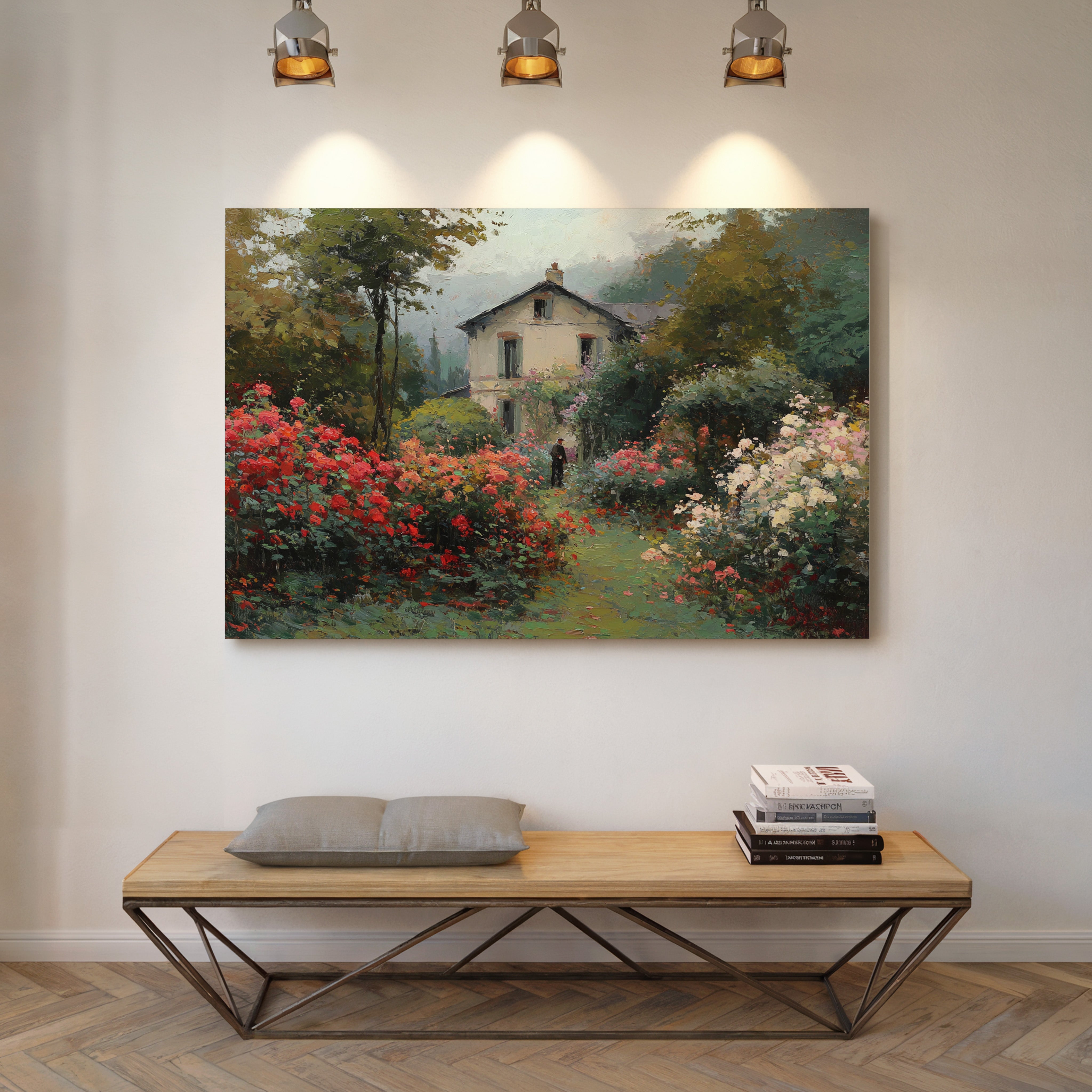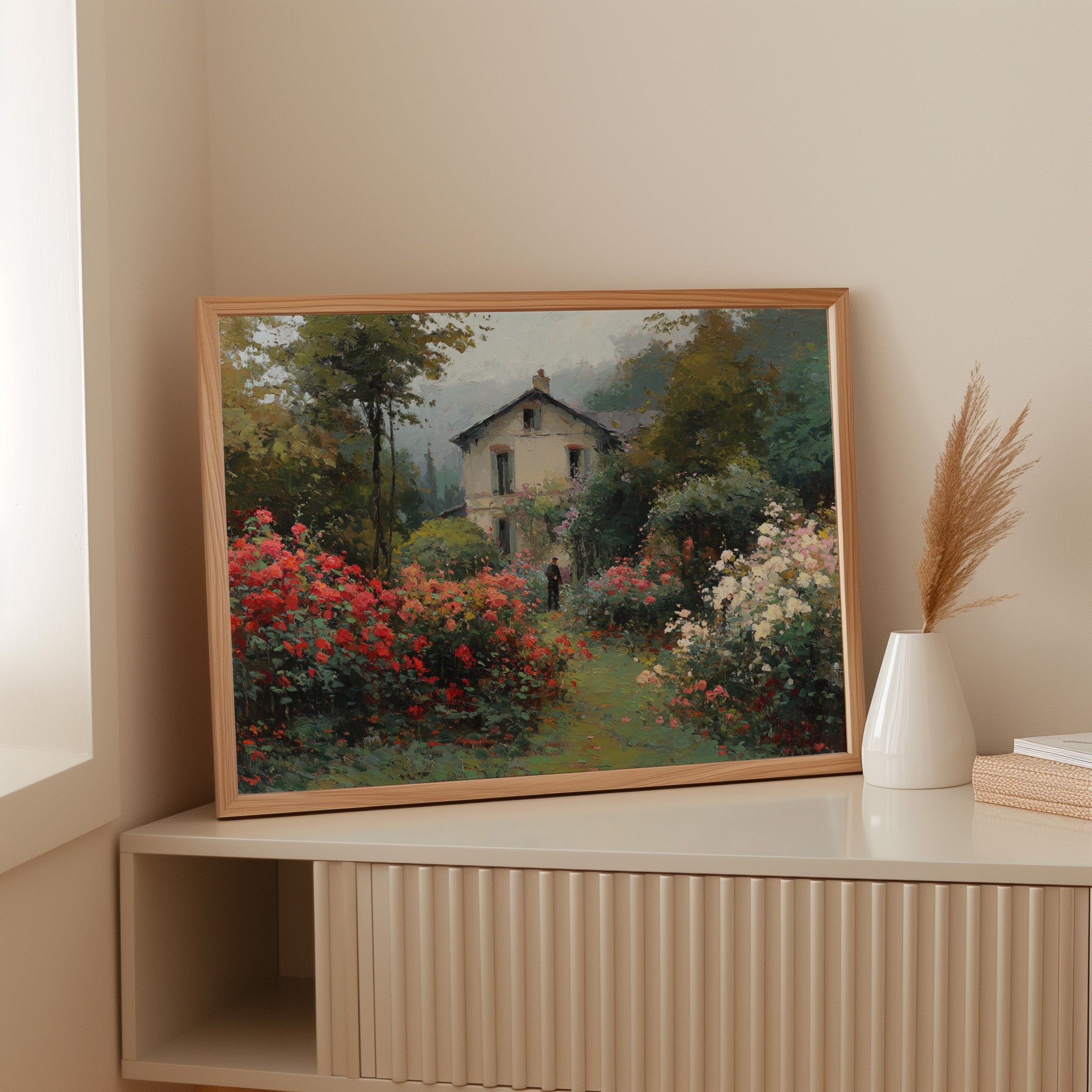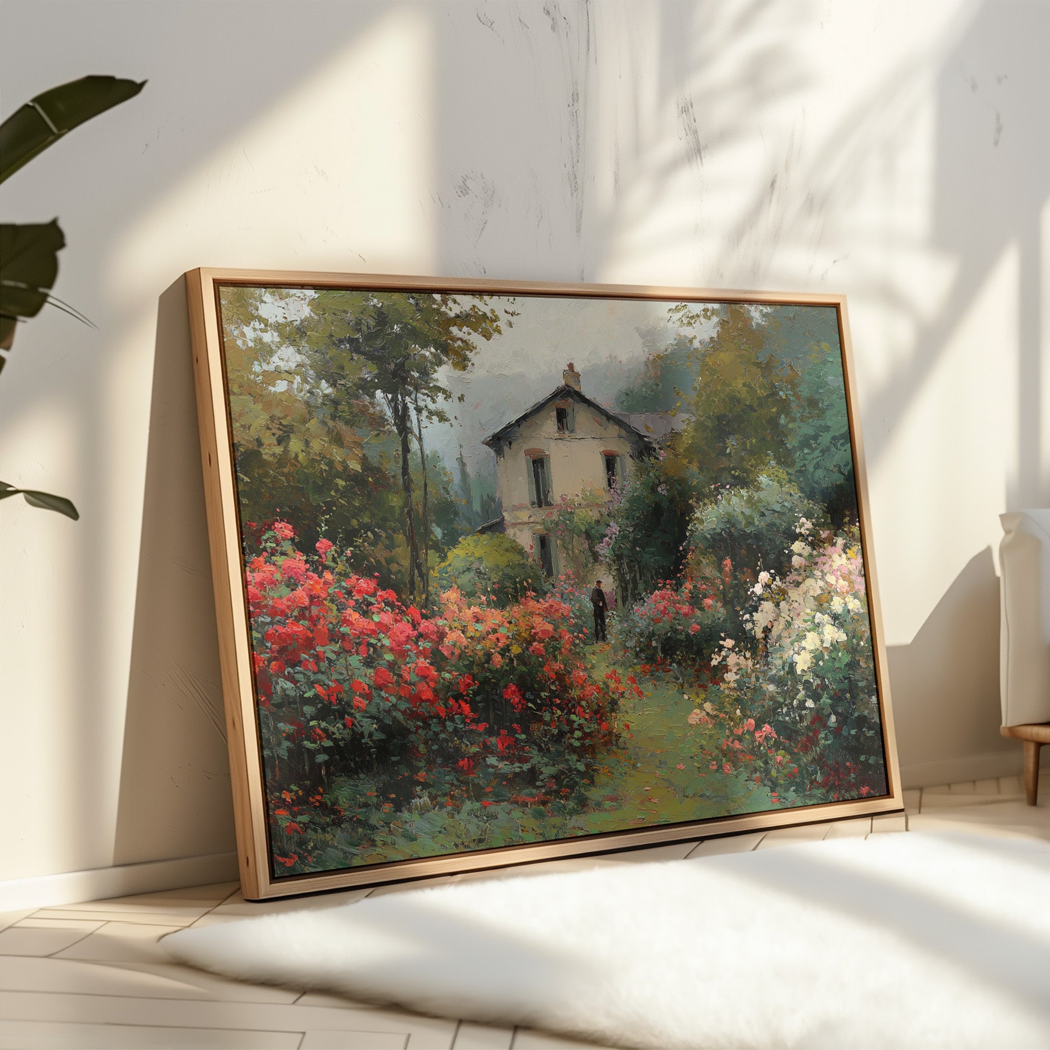Morning mist lingers above a garden where crimson and ivory roses frame a meandering path, leading to a sun-bleached country house. The scene captures that fleeting moment when dewdrops still cling to petals and the day holds endless possibility. Rich brushstrokes build layers of verdant foliage and climbing blooms, while a solitary figure stands contemplatively amid this floral abundance. The interplay of light and shadow creates depth through the garden, where coral, cream, and burgundy flowers spill over their borders in wild abandon. This romantic scene would bring pastoral charm to a reading nook or create a window of escape in a bedroom sanctuary.