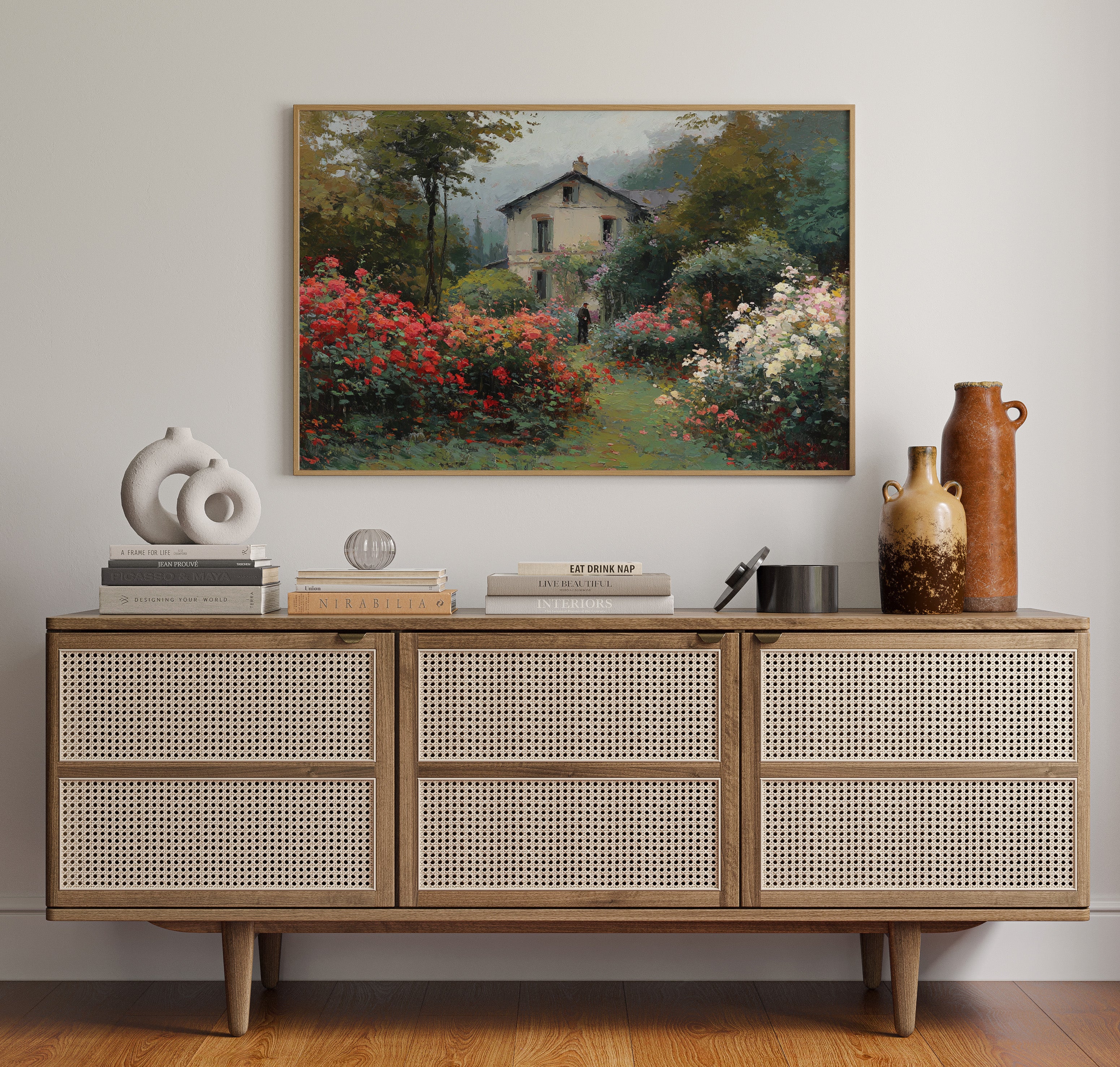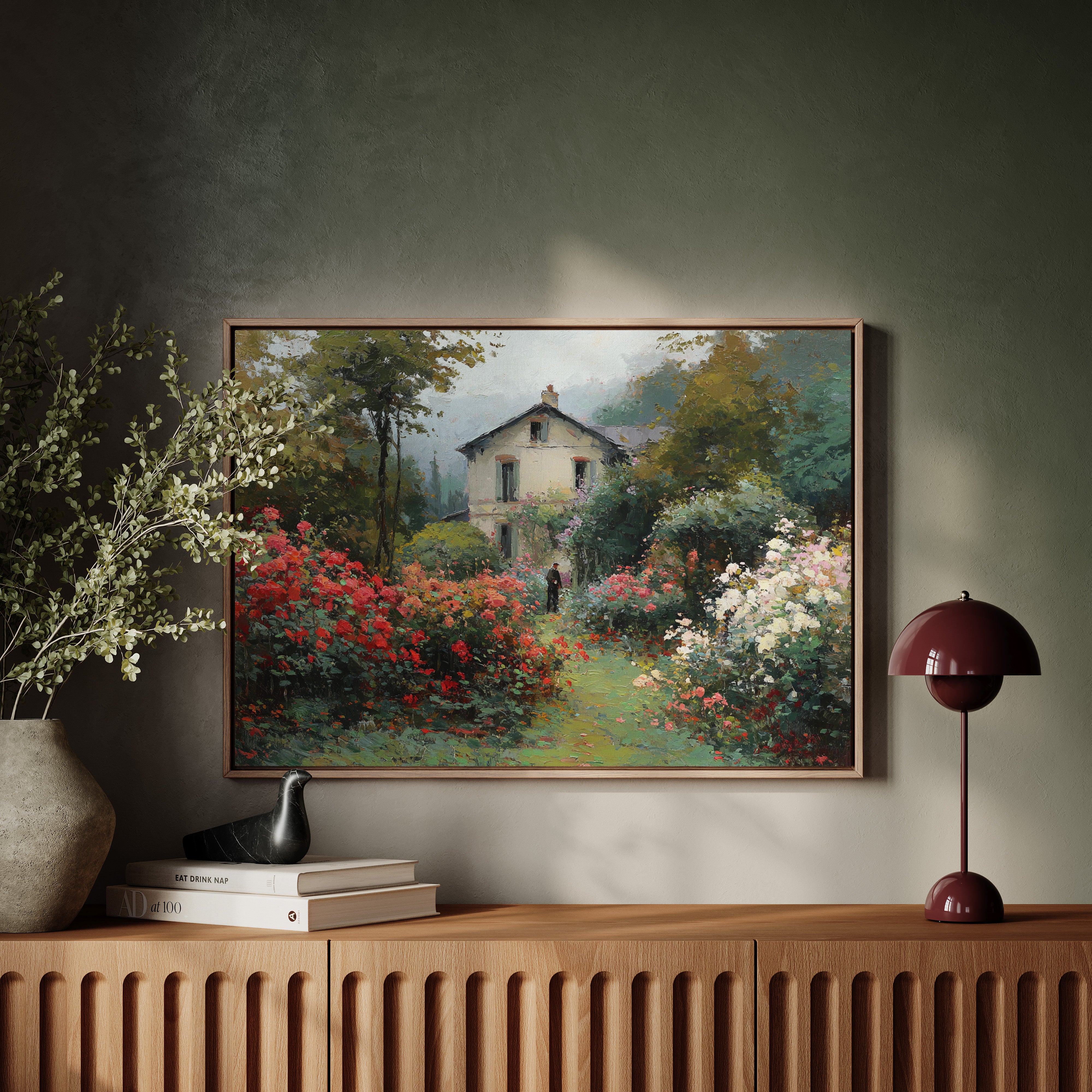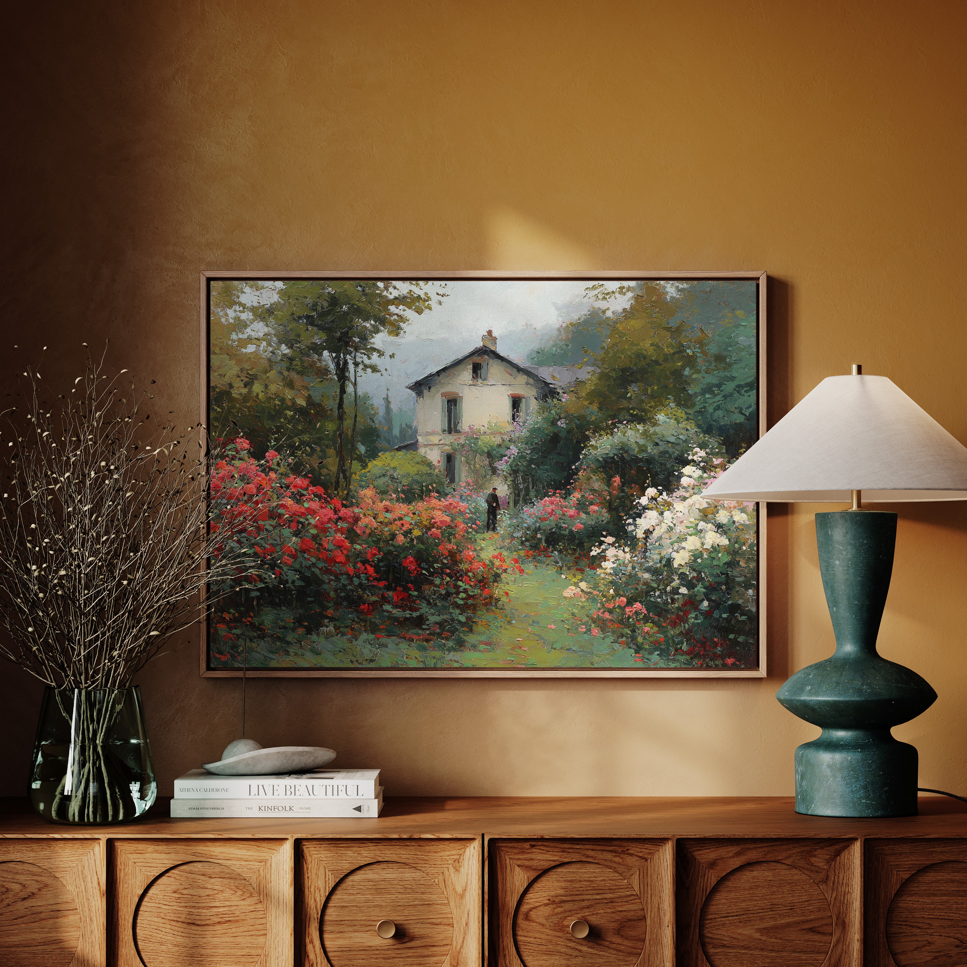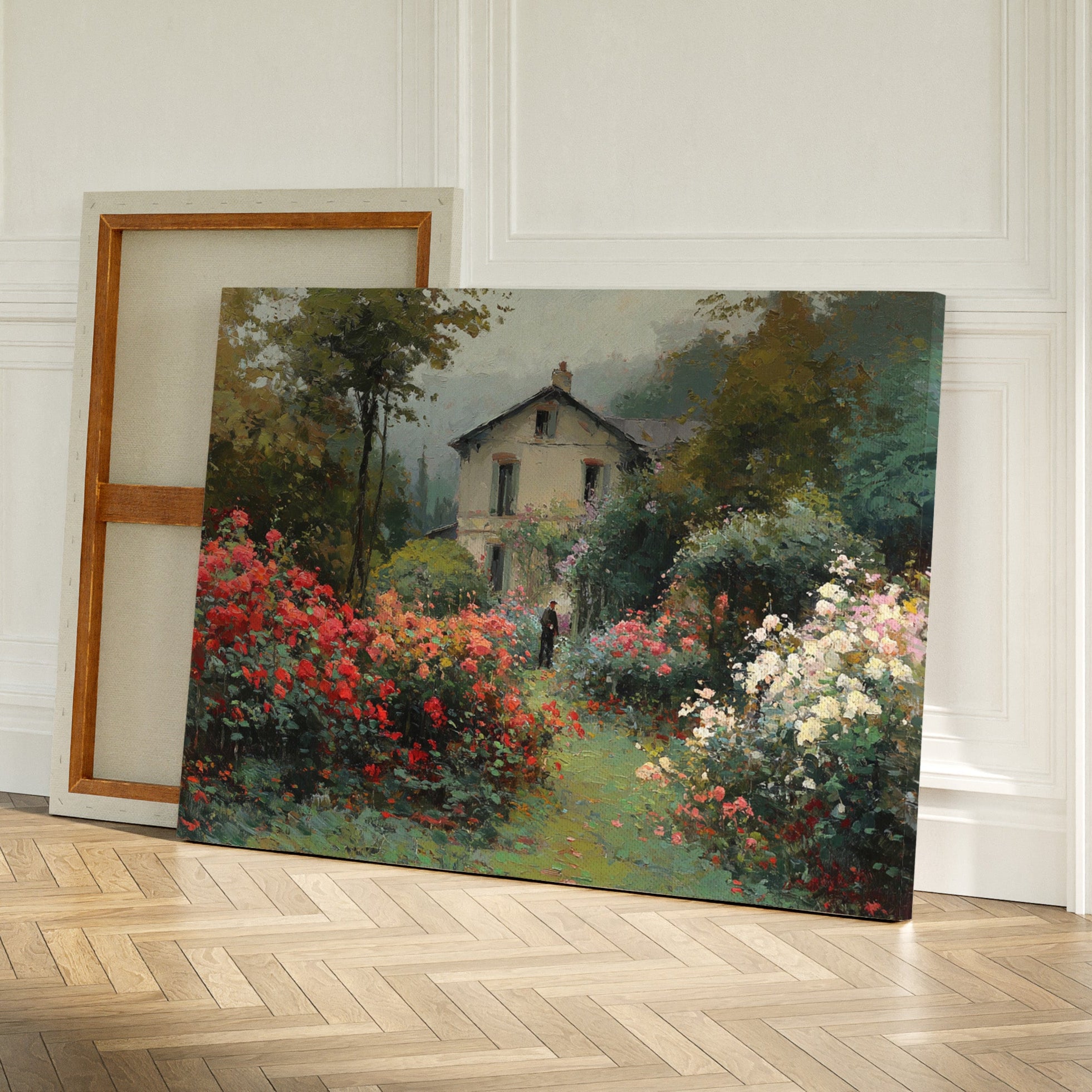 Morning mist lingers above a garden where crimson and ivory roses frame a meandering path, leading to a sun-bleached country house. The scene captures that fleeting moment when dewdrops still cling to petals and the day holds endless possibility. Rich brushstrokes build layers of verdant foliage and climbing blooms, while a solitary figure stands contemplatively amid this floral abundance. The interplay of light and shadow creates depth through the garden, where coral, cream, and burgundy flowers spill over their borders in wild abandon. This romantic scene would bring pastoral charm to a reading nook or create a window of escape in a bedroom sanctuary.