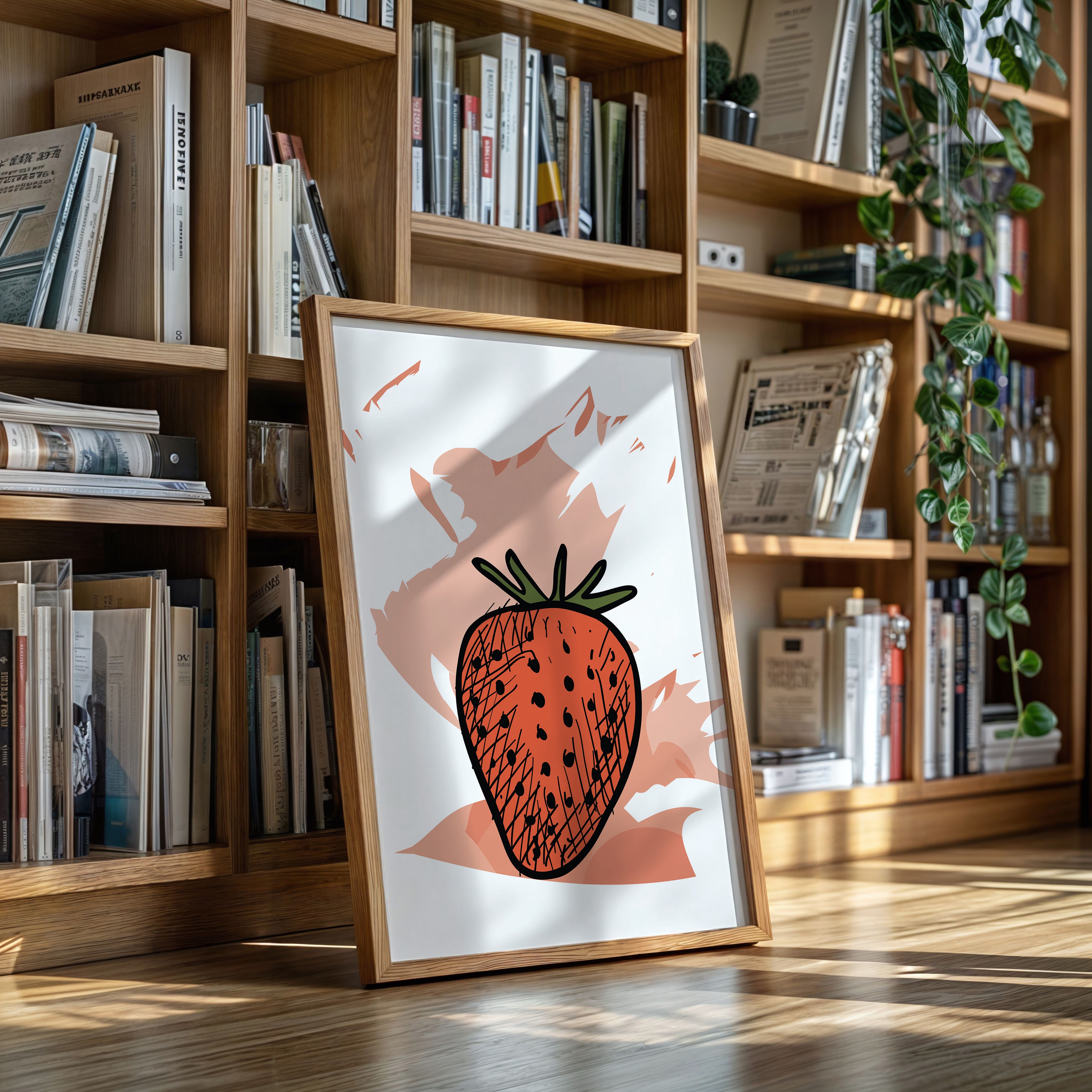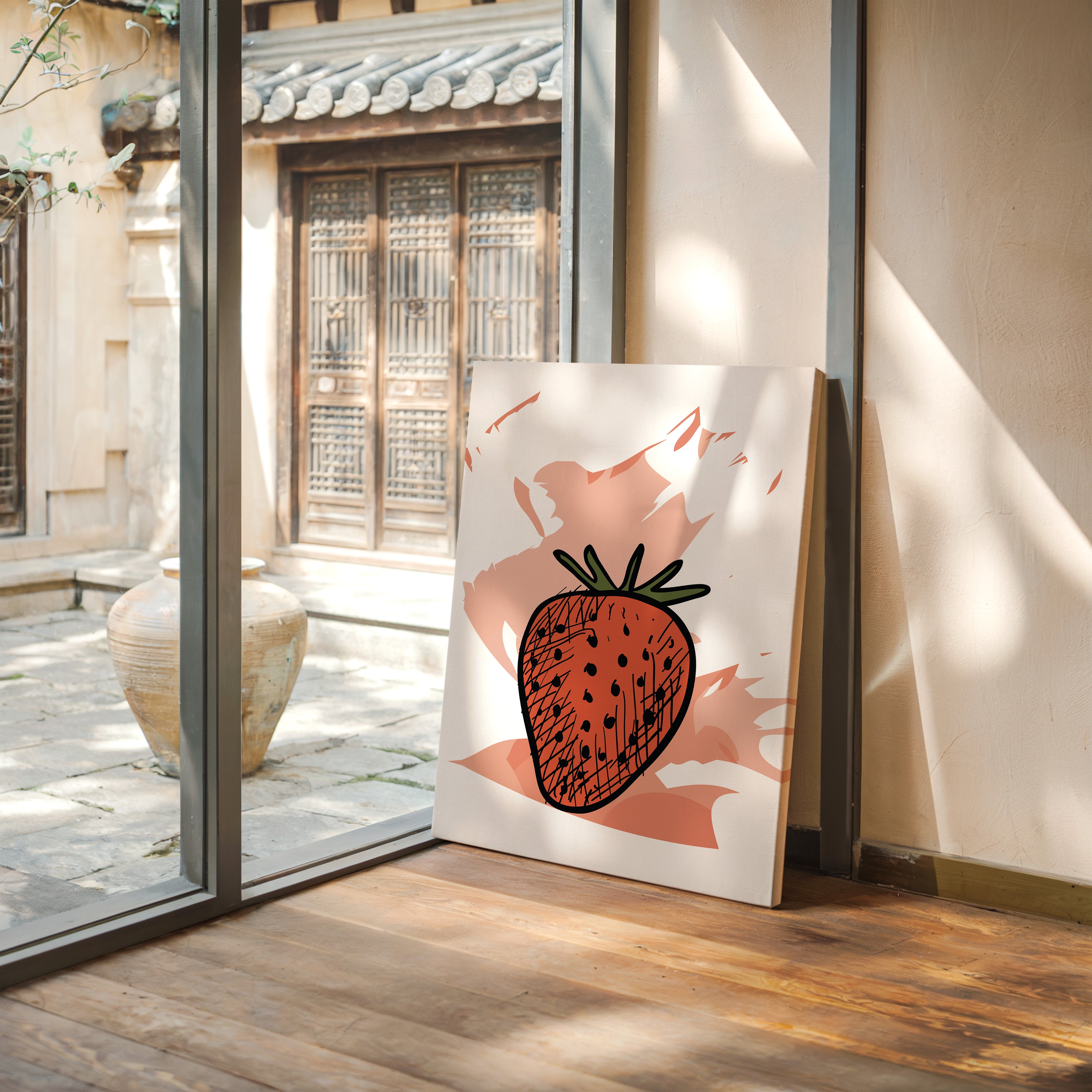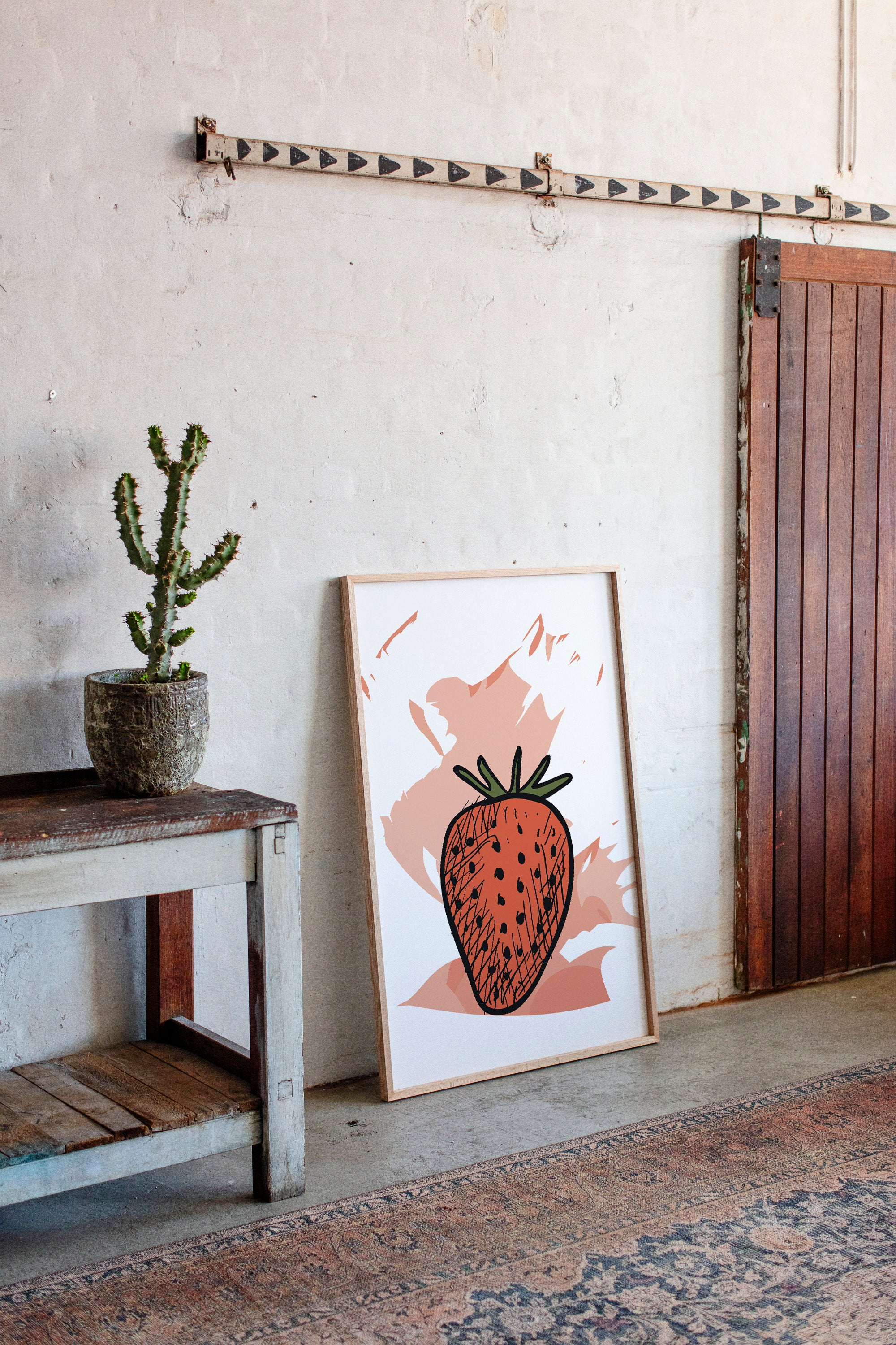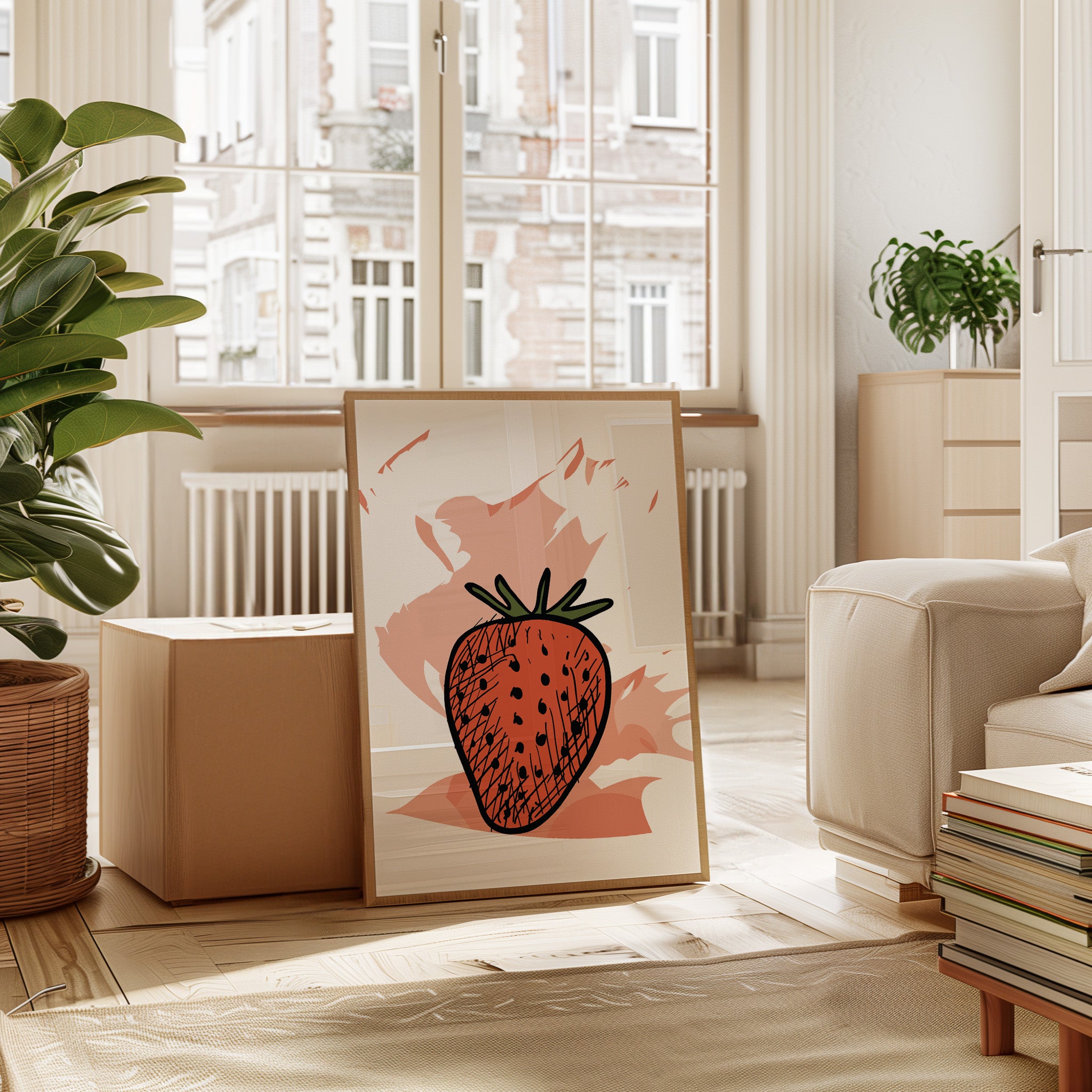 A playful sketch captures the essence of summer's sweetest fruit, rendered in bold coral against a soft blush background. This piece belongs to our Contemporary collection, celebrating simple forms with artistic whimsy. The strawberry's hand-drawn texture and crosshatched details create a charming interplay of line and shape, while its oversized scale makes a confident statement. Black outlines dance with purpose, creating a modern interpretation of botanical illustration. Perfect for bringing a dash of cheerful energy to a kitchen nook or dining space, this piece invites both sophistication and joy to your walls.