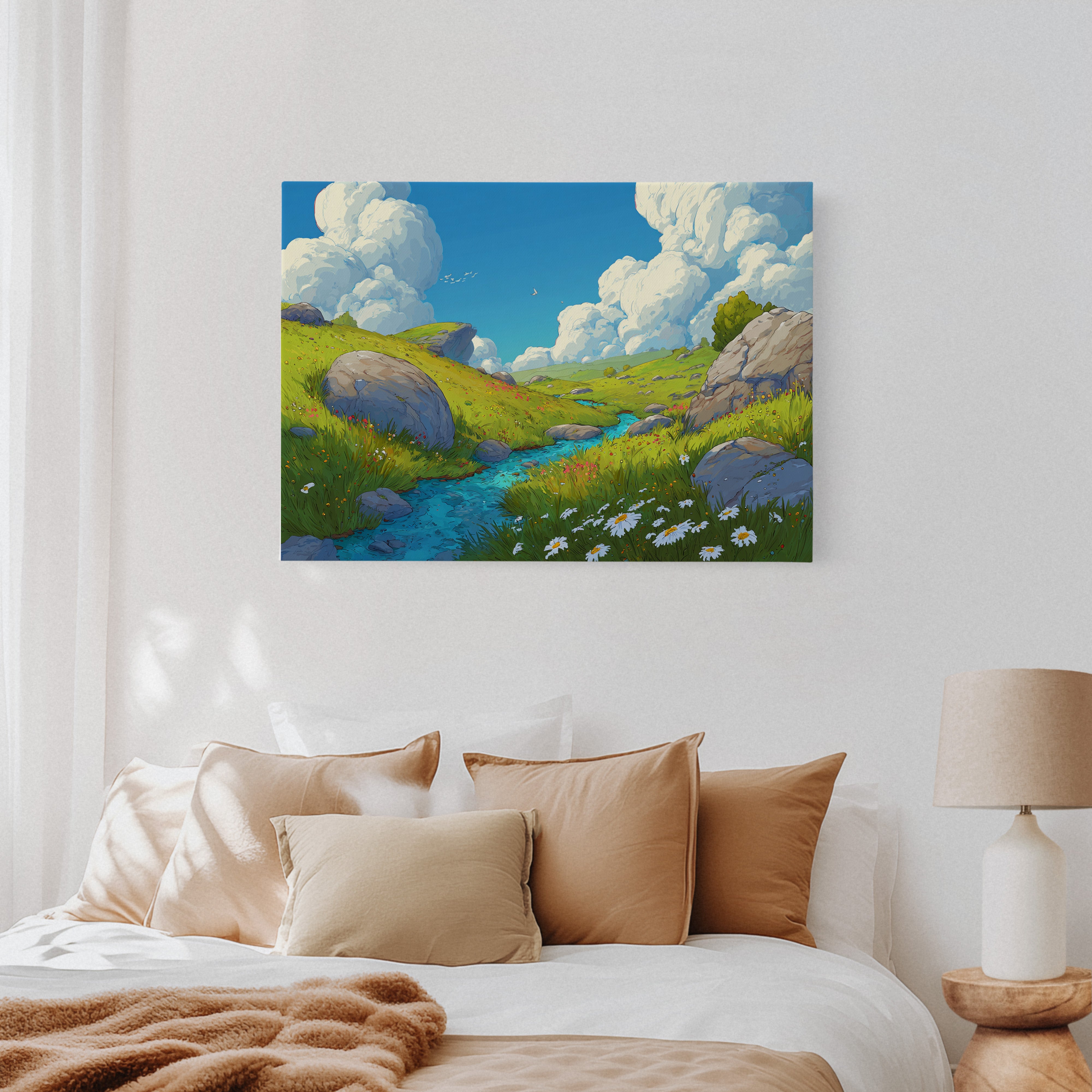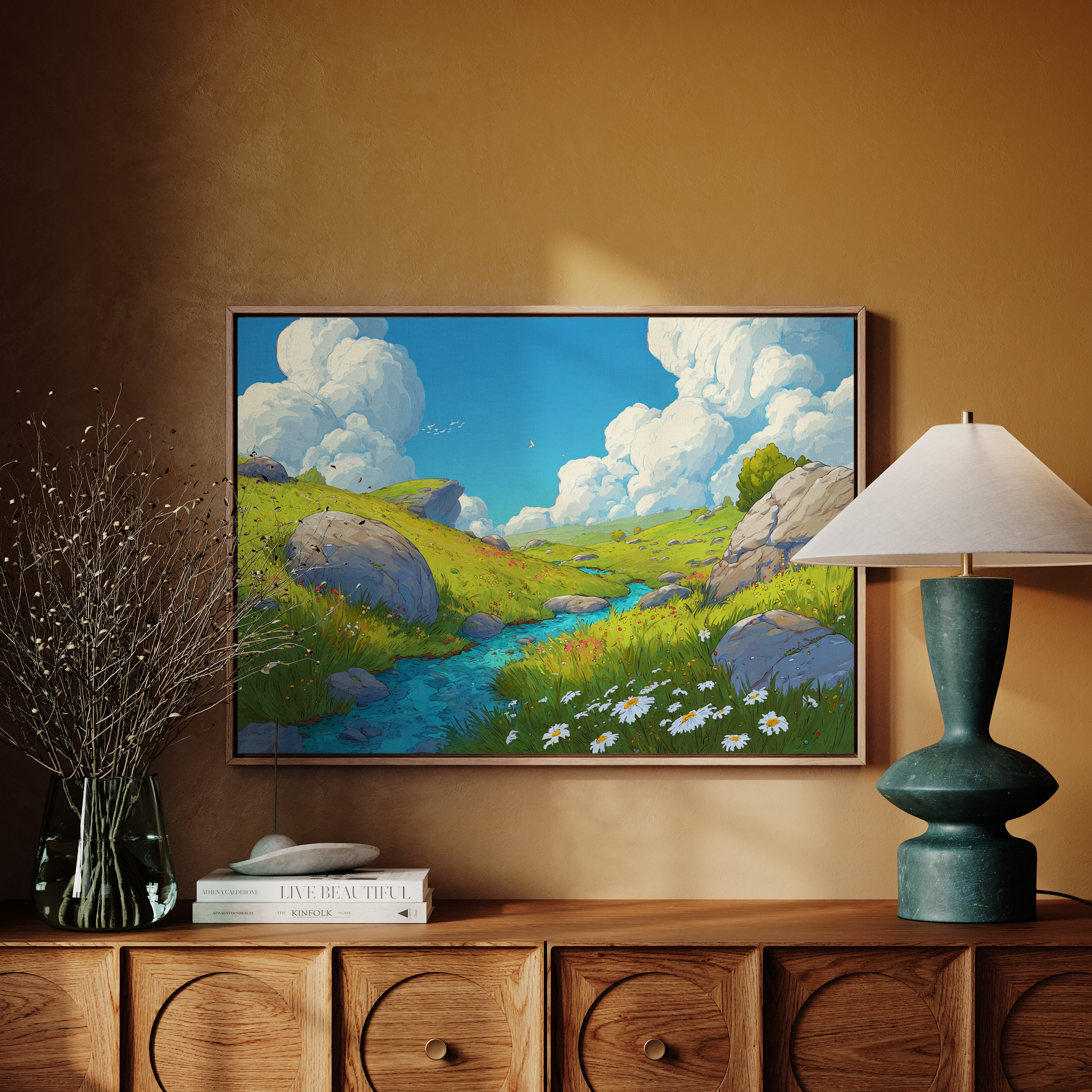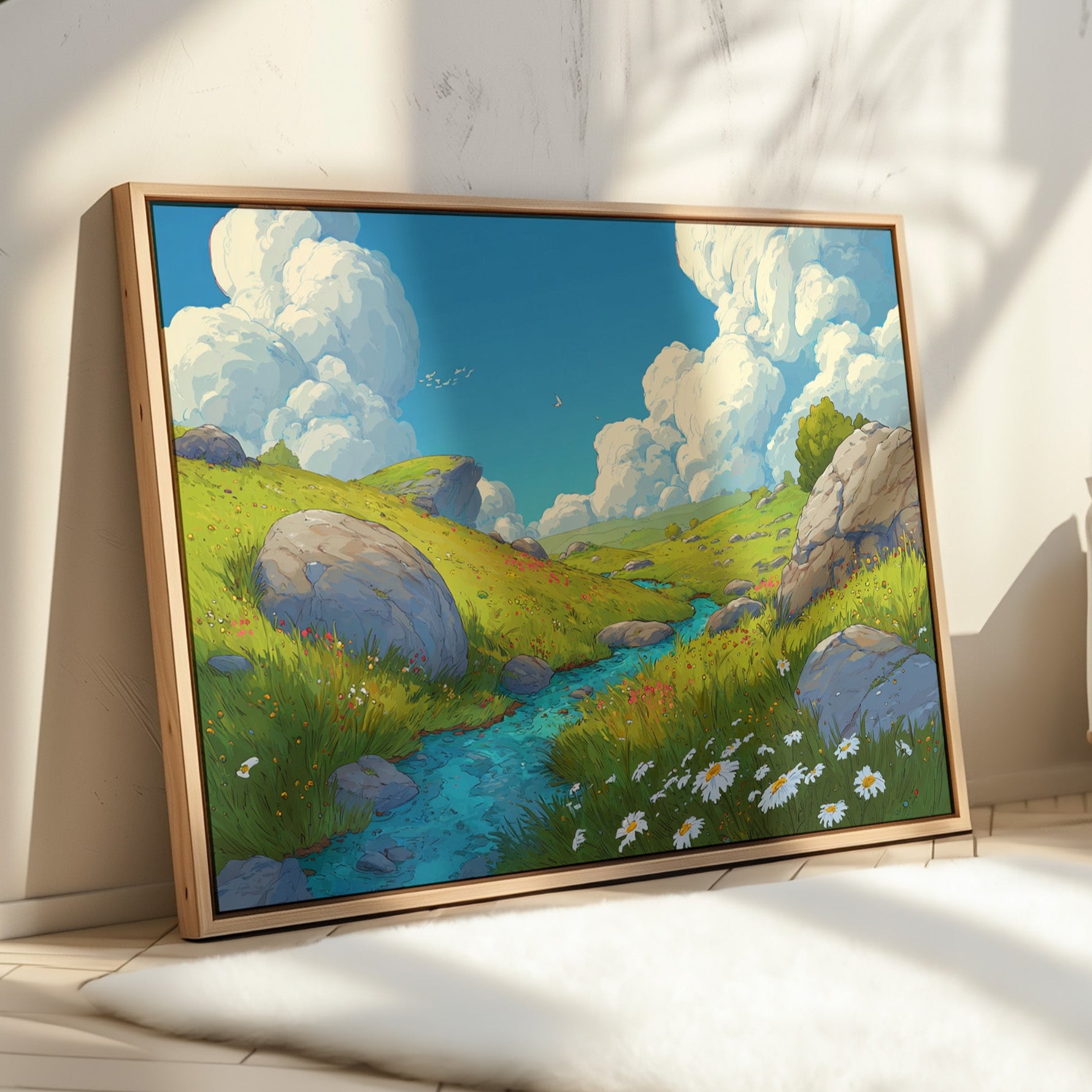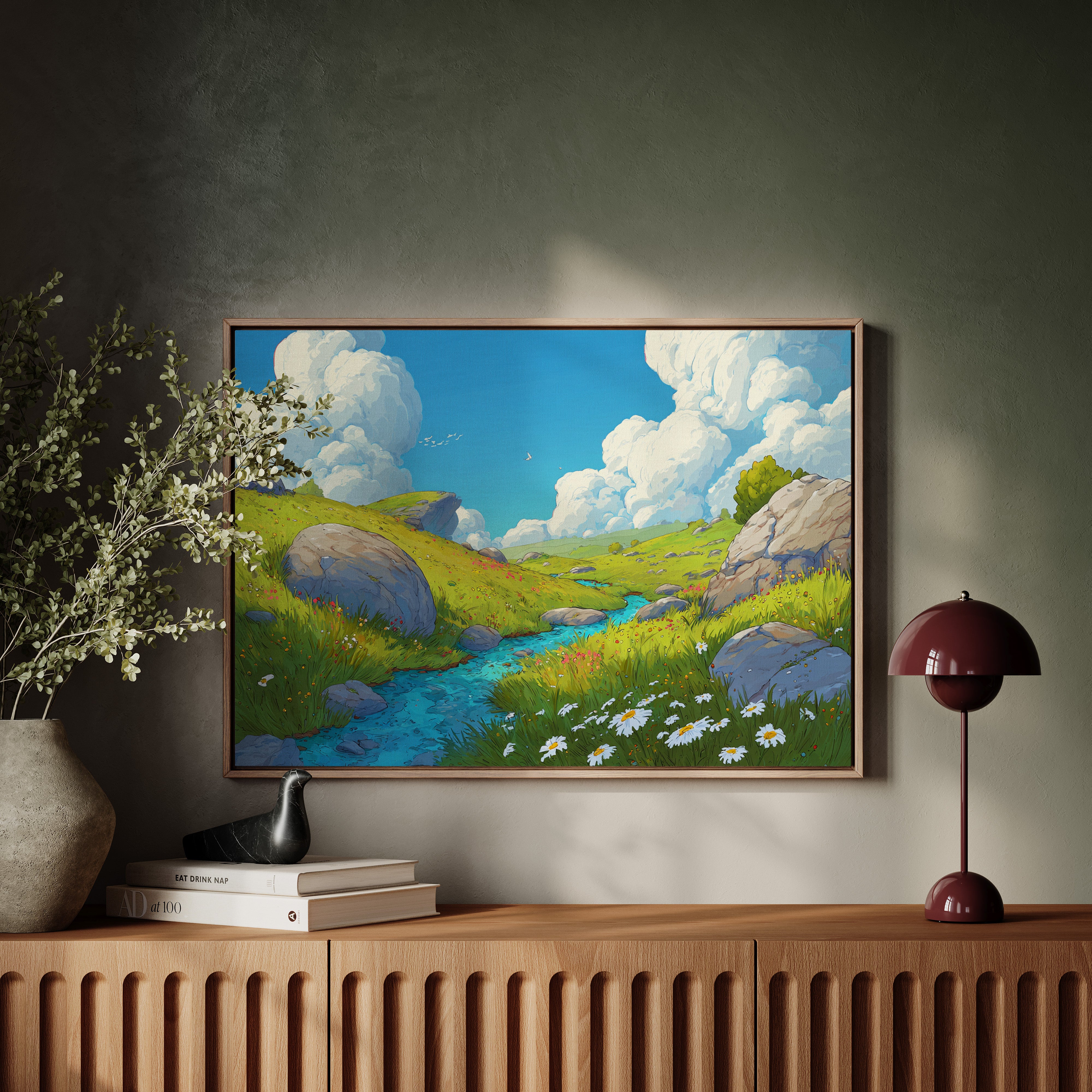 Sunlight dances across a winding blue stream, cutting through emerald meadows dotted with wild daisies and crimson wildflowers. The landscape unfolds like a cherished storybook scene, where granite boulders rest among tall grasses and delicate blooms, their ancient forms softened by nature's gentle touch. Billowing cumulus clouds drift across an azure sky, their pristine white masses creating a cathedral ceiling above this pastoral paradise. This piece captures the pure essence of a perfect summer day, where every element feels intentionally placed yet completely wild and free. Perfect for bringing a sense of serenity and natural wonder to a reading nook, meditation space, or any room seeking connection with the outdoors.
