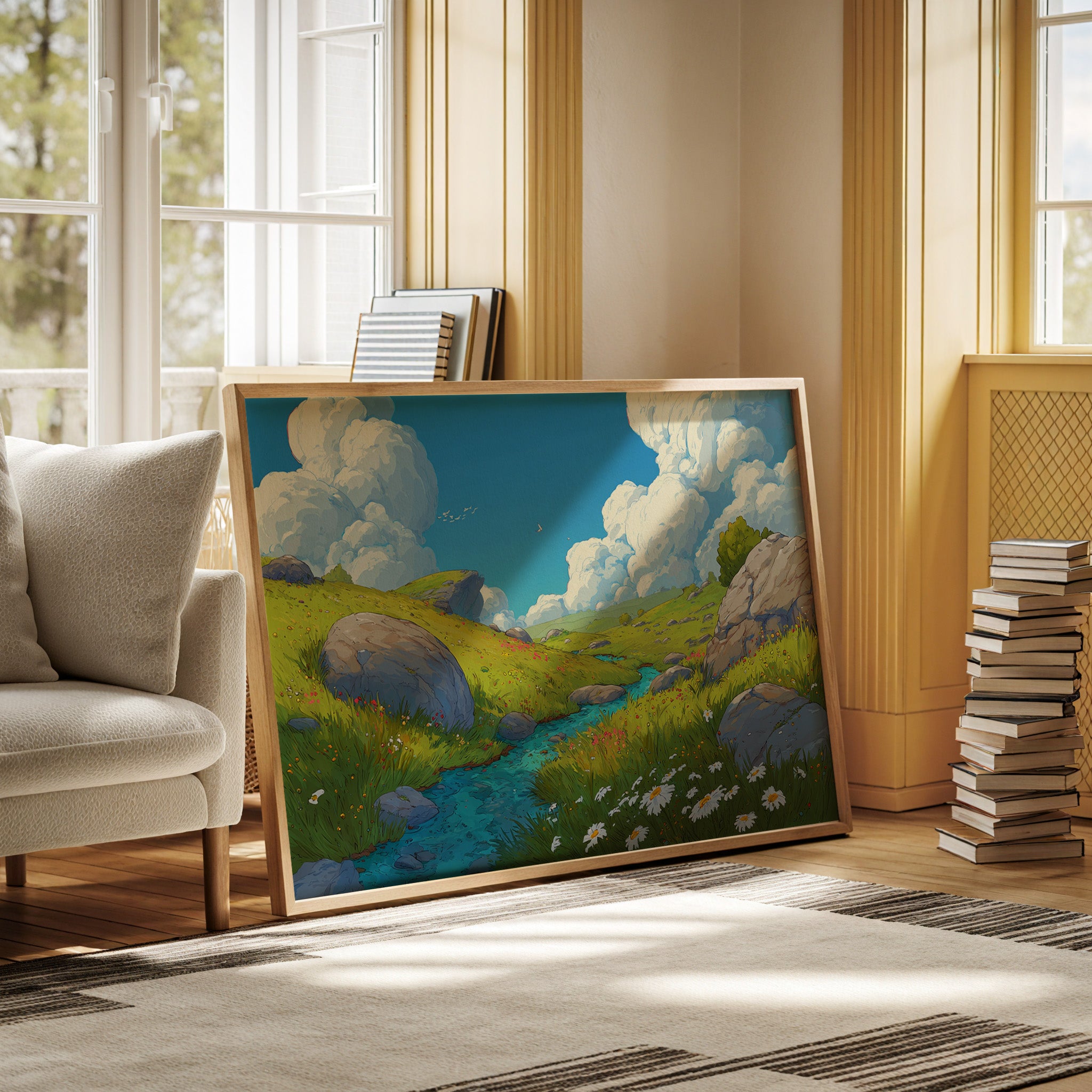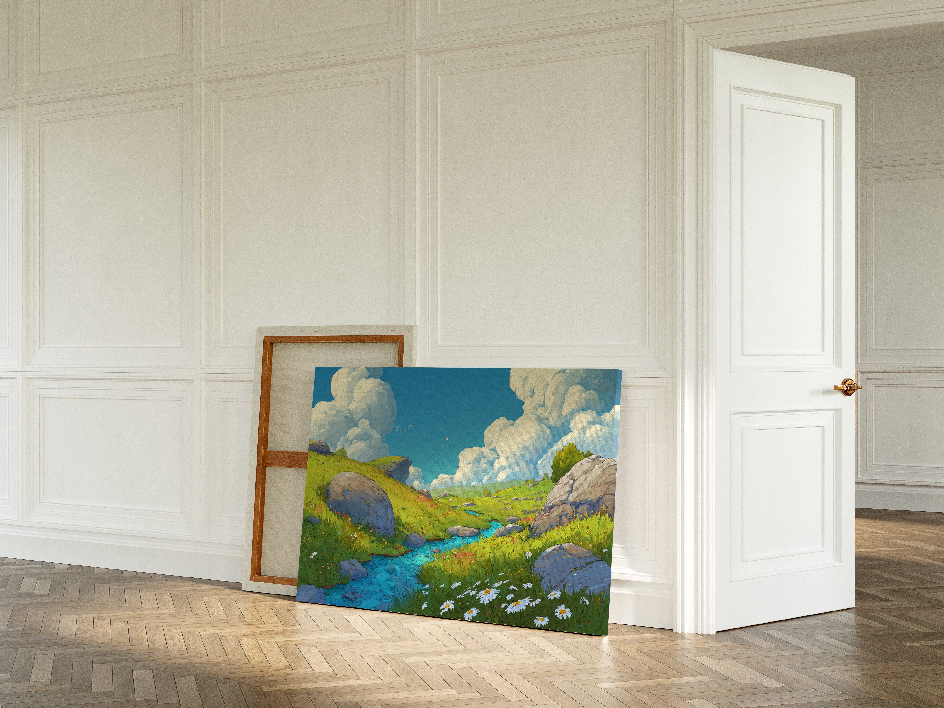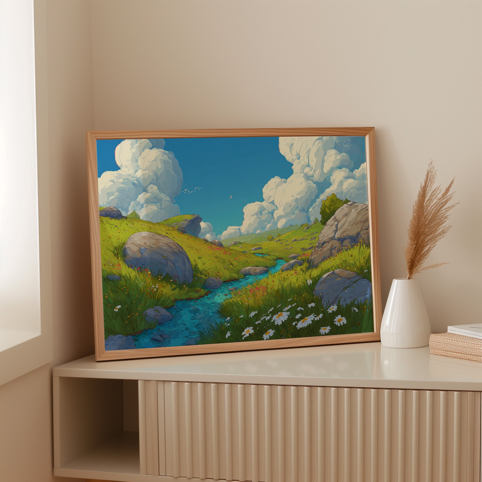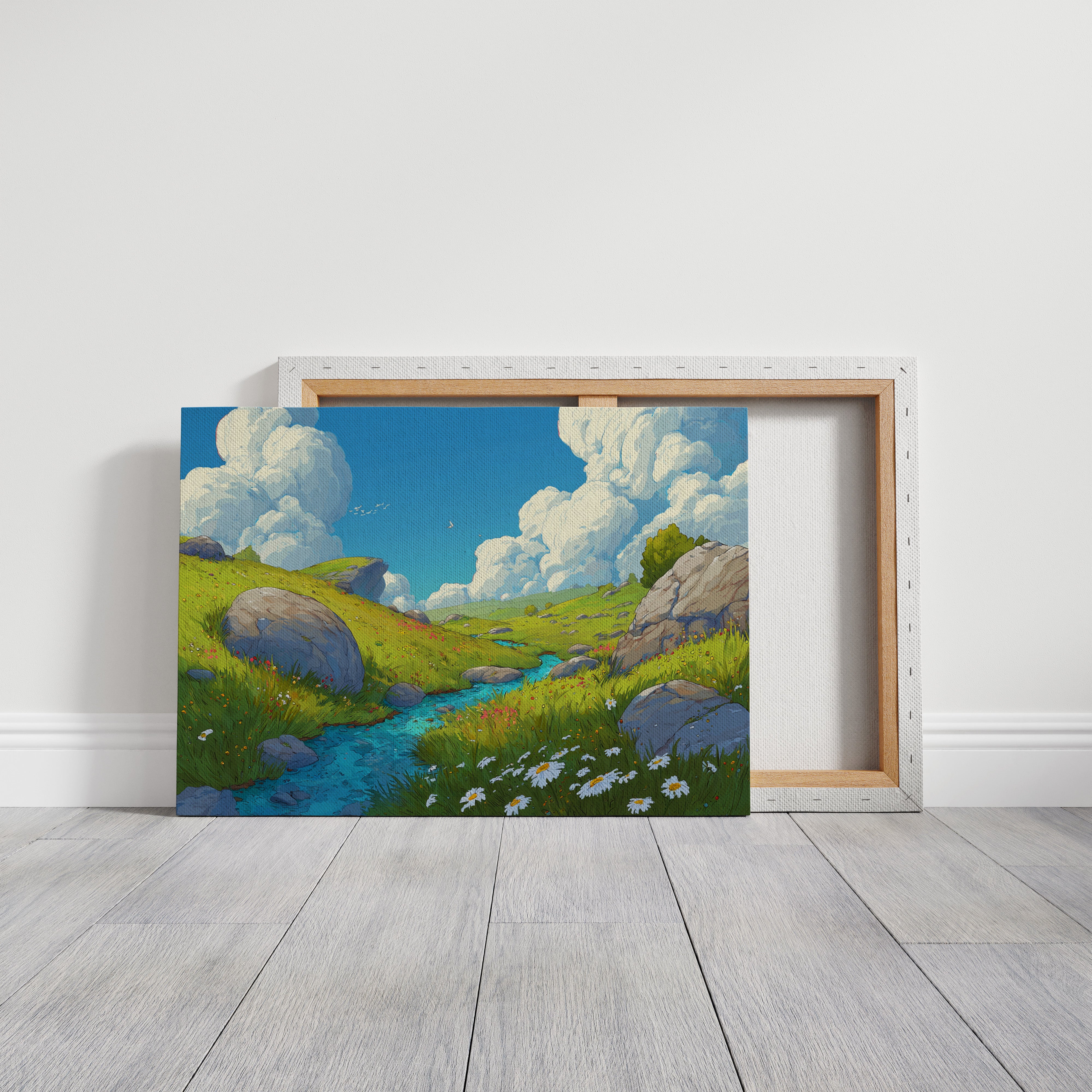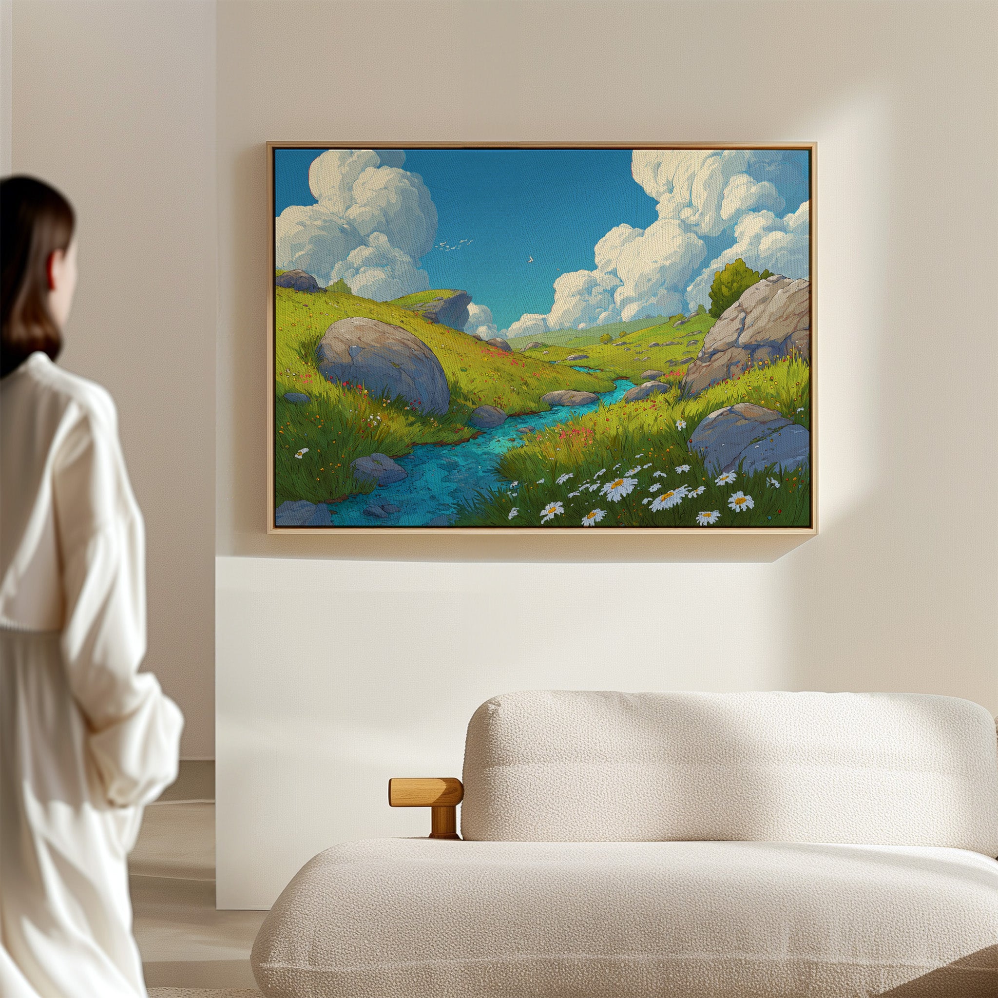 Sunlight dances across a winding blue stream, cutting through emerald meadows dotted with wild daisies and crimson wildflowers. The landscape unfolds like a cherished storybook scene, where granite boulders rest among tall grasses and delicate blooms, their ancient forms softened by nature's gentle touch. Billowing cumulus clouds drift across an azure sky, their pristine white masses creating a cathedral ceiling above this pastoral paradise. This piece captures the pure essence of a perfect summer day, where every element feels intentionally placed yet completely wild and free. Perfect for bringing a sense of serenity and natural wonder to a reading nook, meditation space, or any room seeking connection with the outdoors.
