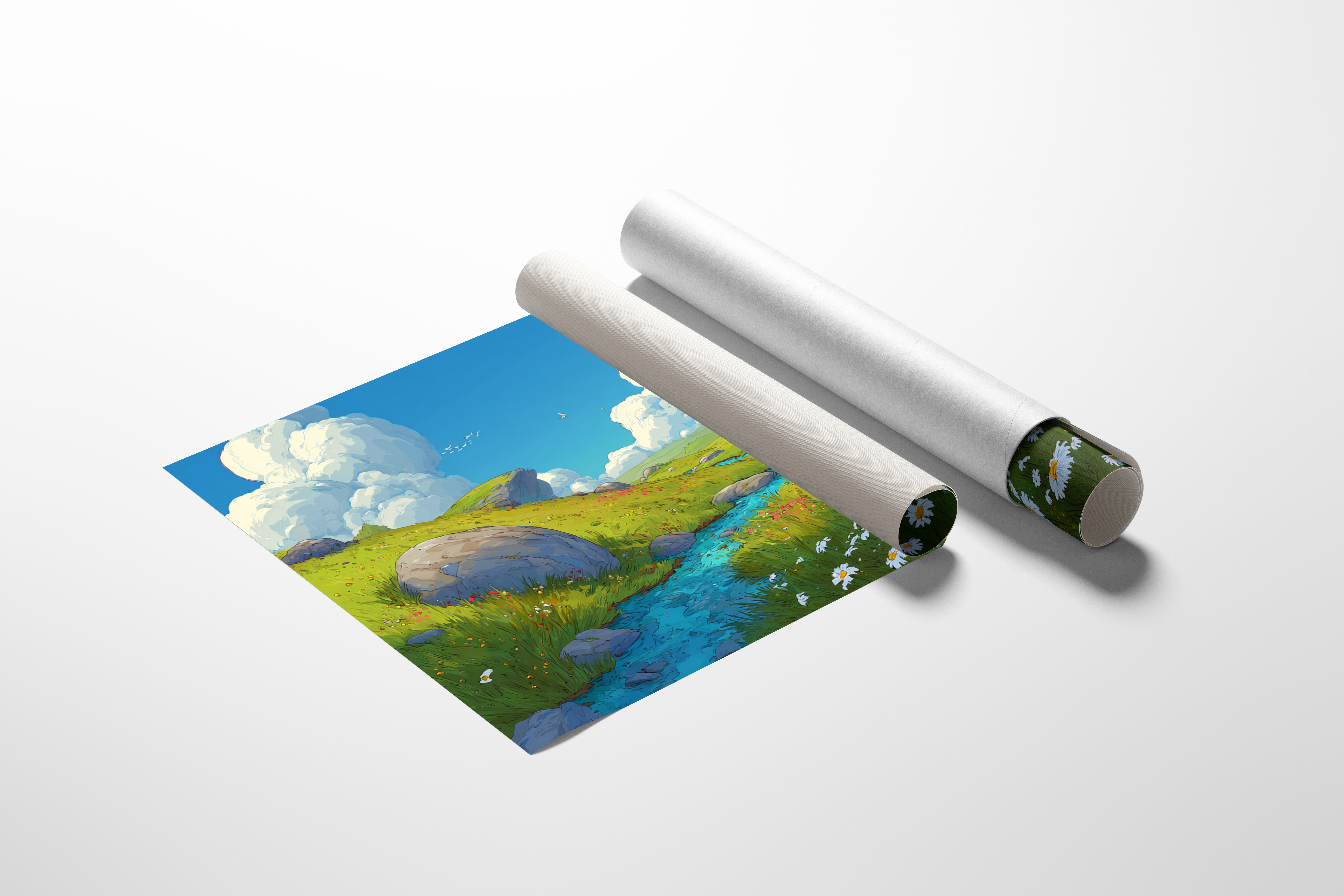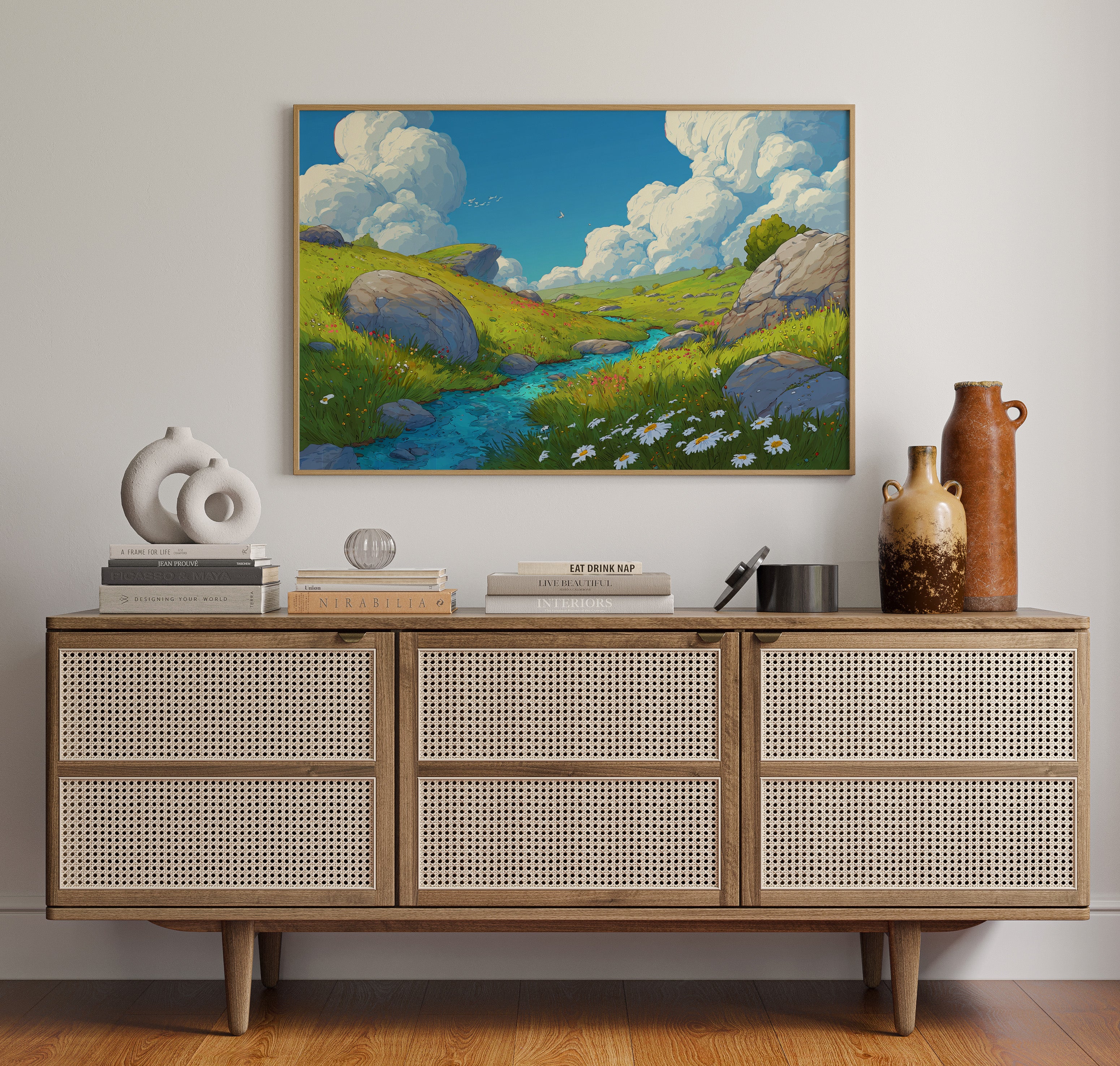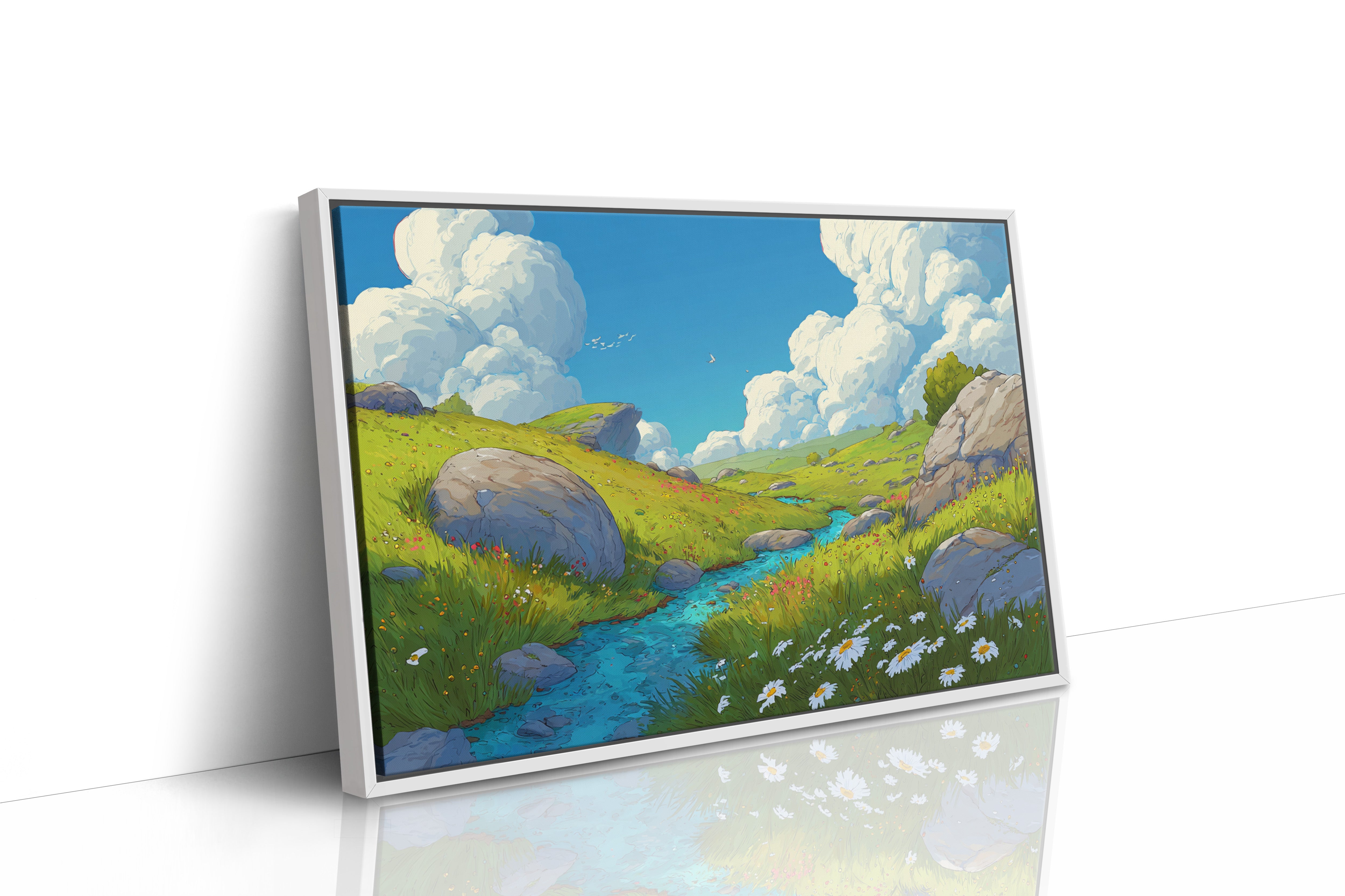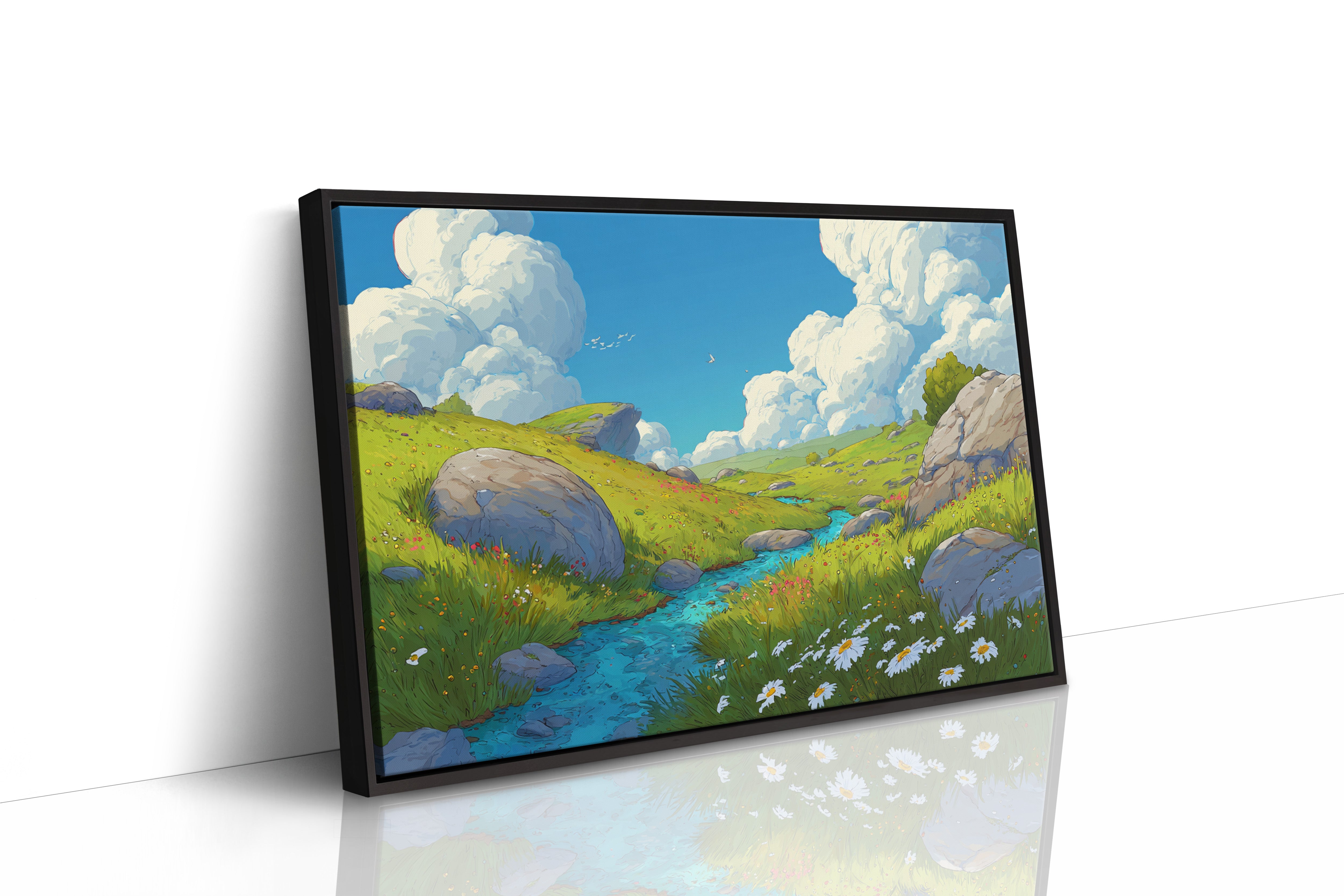Sunlight dances across a winding blue stream, cutting through emerald meadows dotted with wild daisies and crimson wildflowers. The landscape unfolds like a cherished storybook scene, where granite boulders rest among tall grasses and delicate blooms, their ancient forms softened by nature's gentle touch. Billowing cumulus clouds drift across an azure sky, their pristine white masses creating a cathedral ceiling above this pastoral paradise. This piece captures the pure essence of a perfect summer day, where every element feels intentionally placed yet completely wild and free. Perfect for bringing a sense of serenity and natural wonder to a reading nook, meditation space, or any room seeking connection with the outdoors.