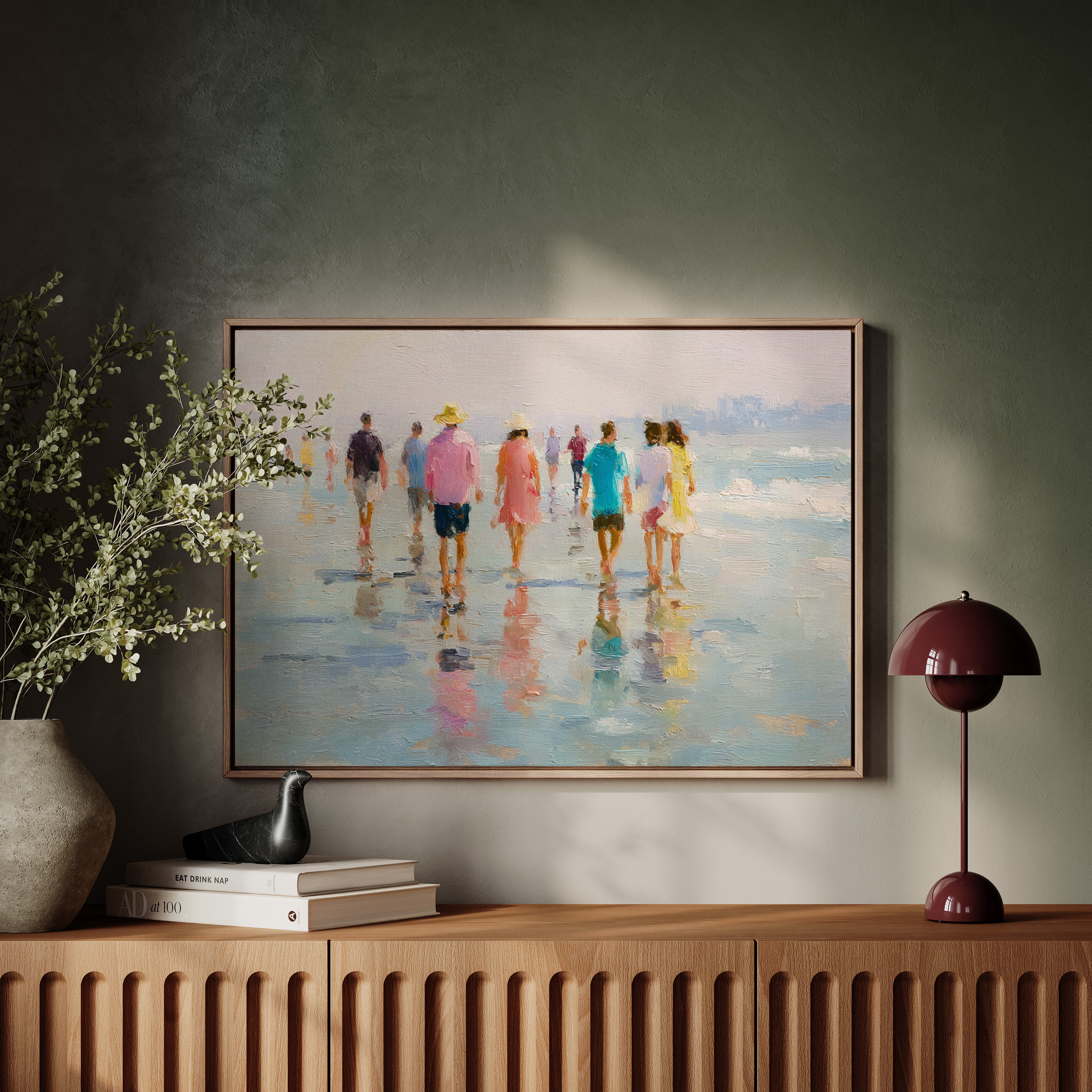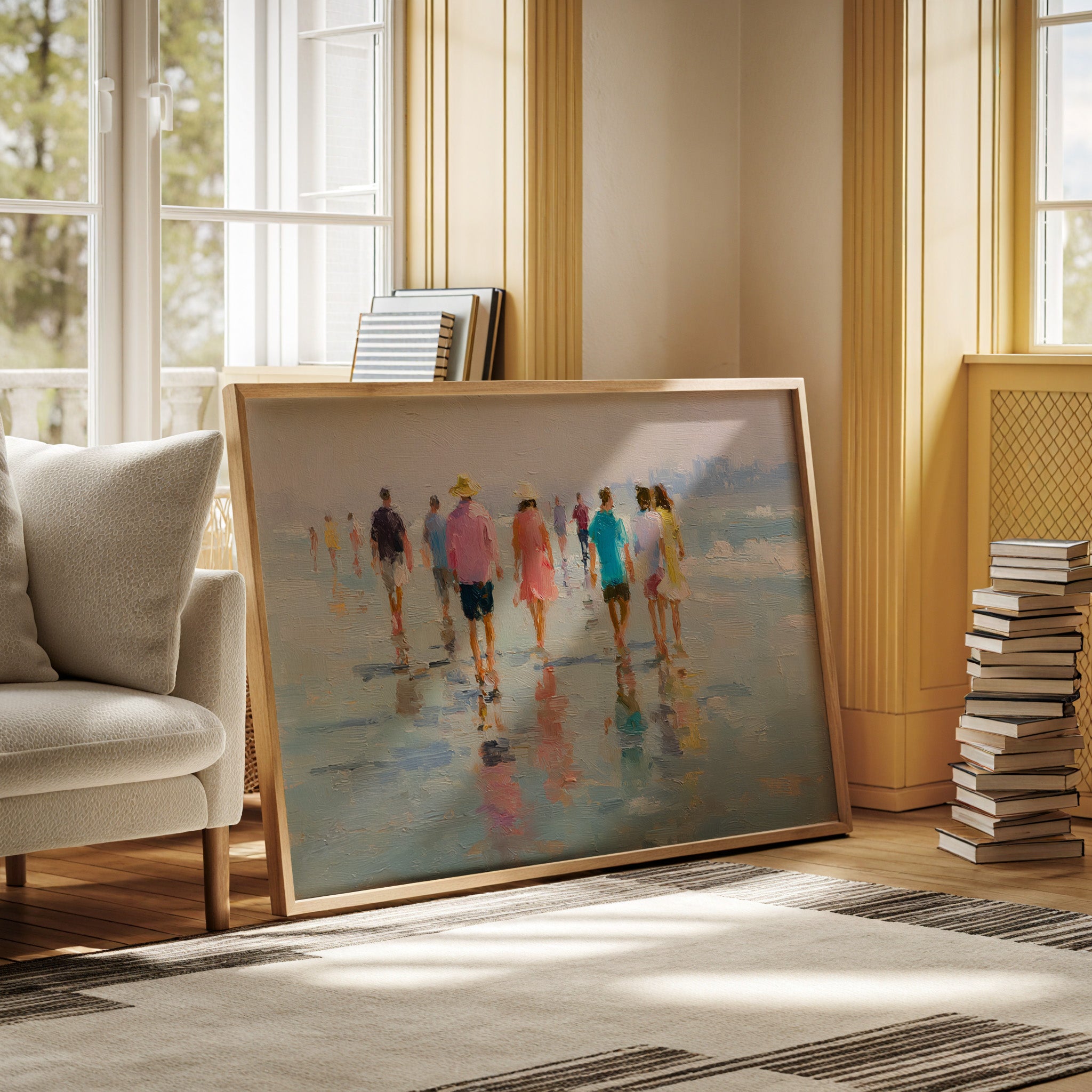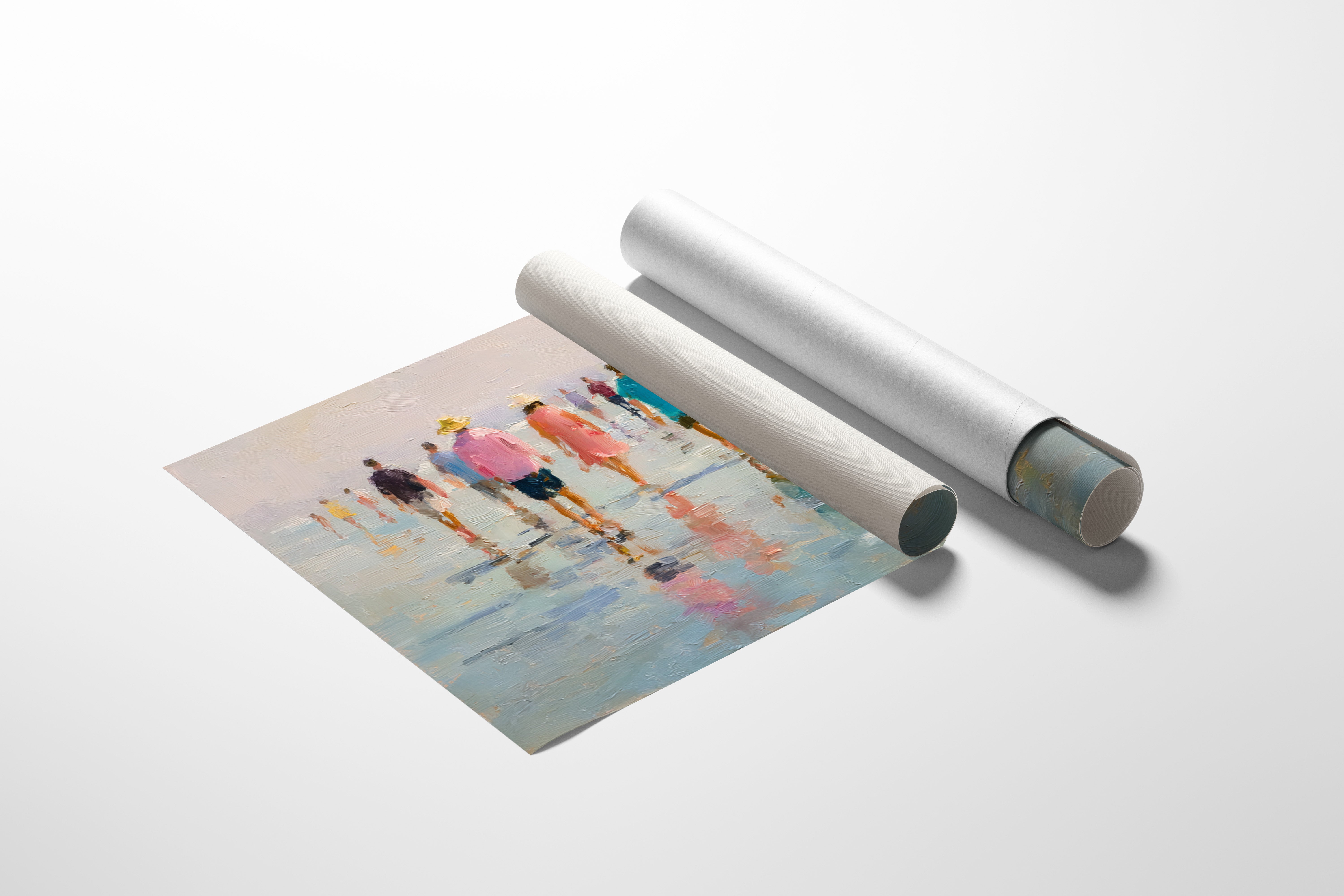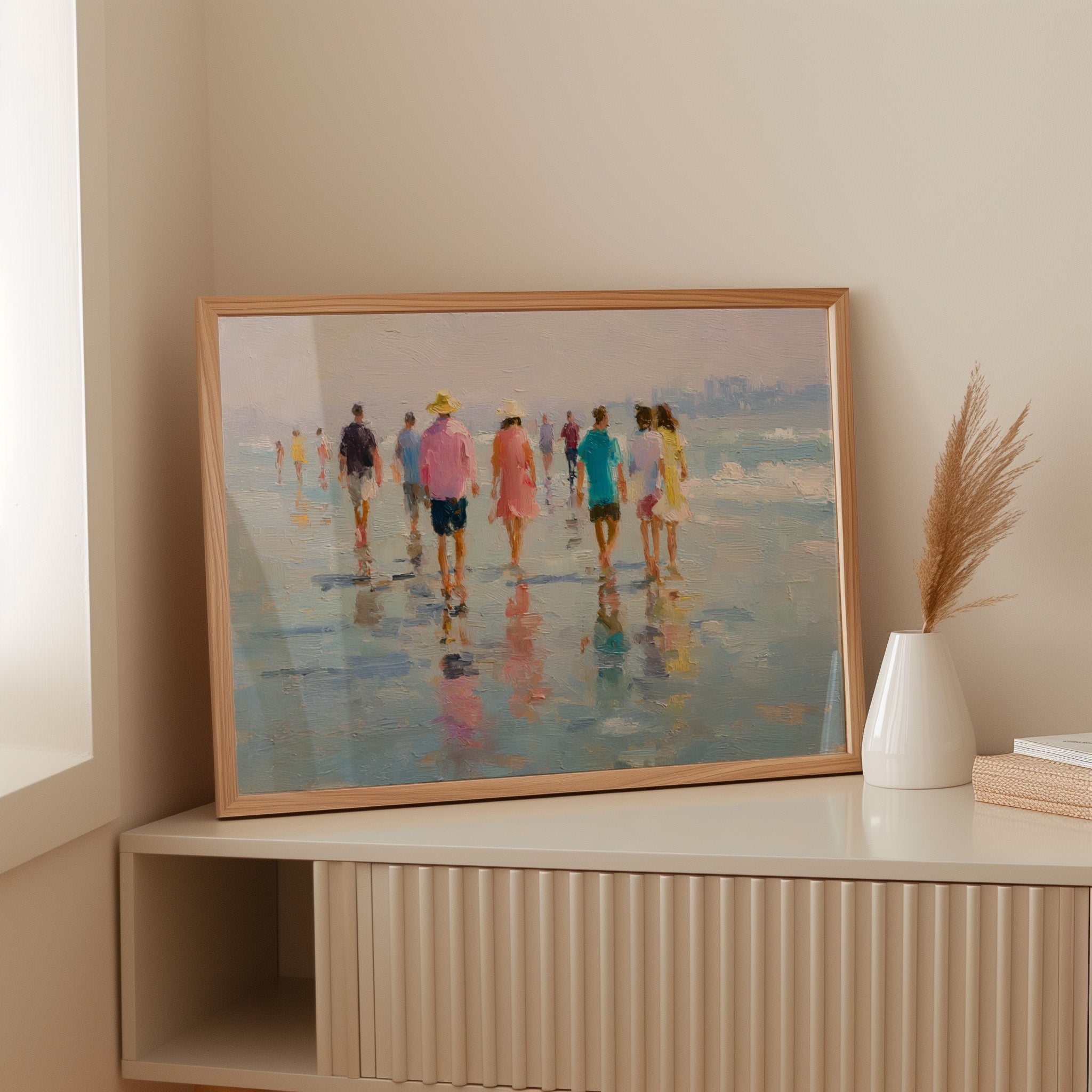 Sunlight dances across the wet sand, creating a mirror that catches the pastel hues of beachgoers in gentle reflection. Figures move unhurried through the shallow waters, their forms softened by the impressionist strokes that capture this fleeting moment of seaside serenity. The palette is a harmonious blend of coral pinks, turquoise blues, and buttery yellows, each color melting into the next like ice cream on a warm day. This scene evokes memories of endless summer afternoons when time seems to slow down and the boundary between sky and sea becomes beautifully blurred.