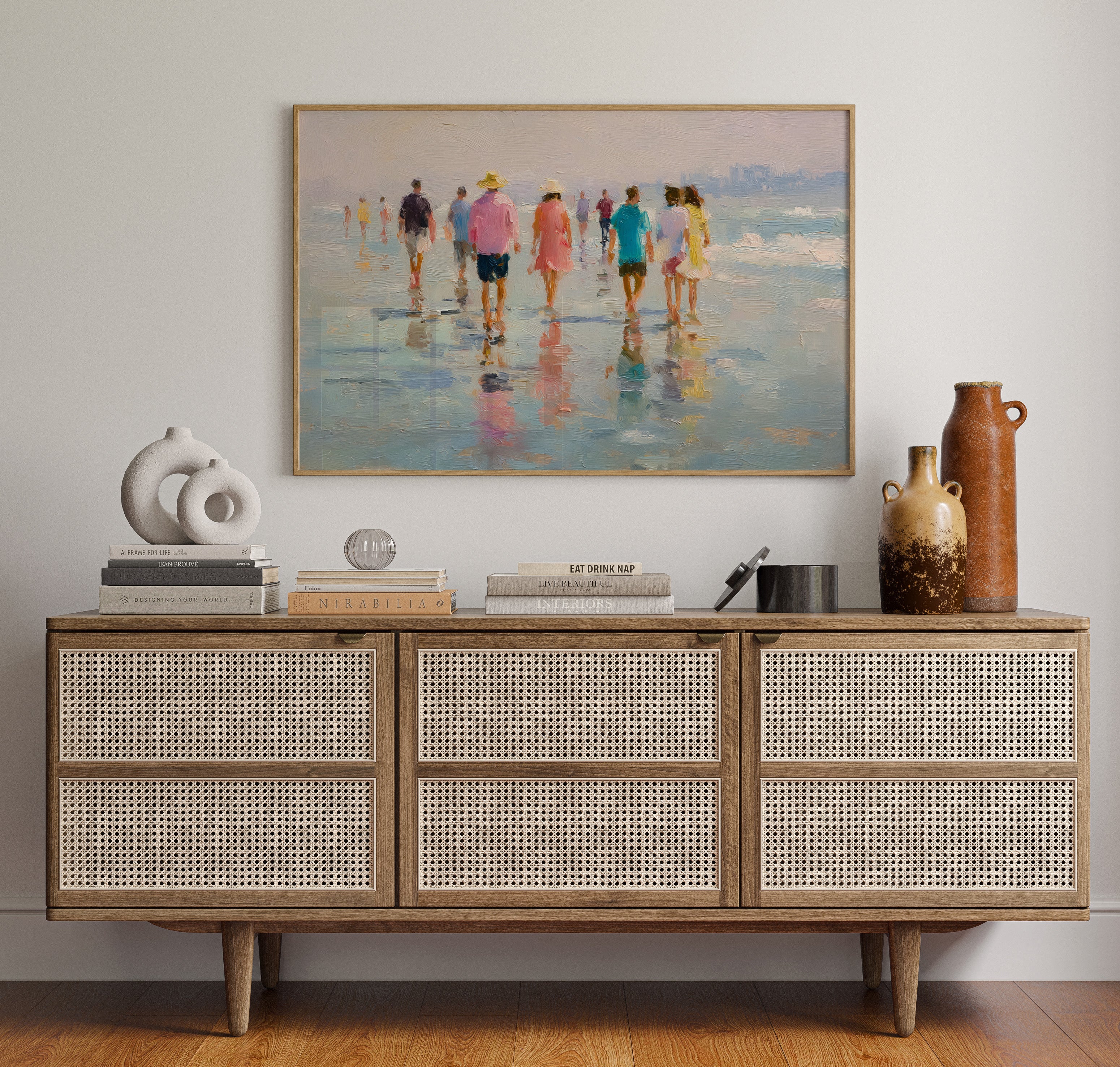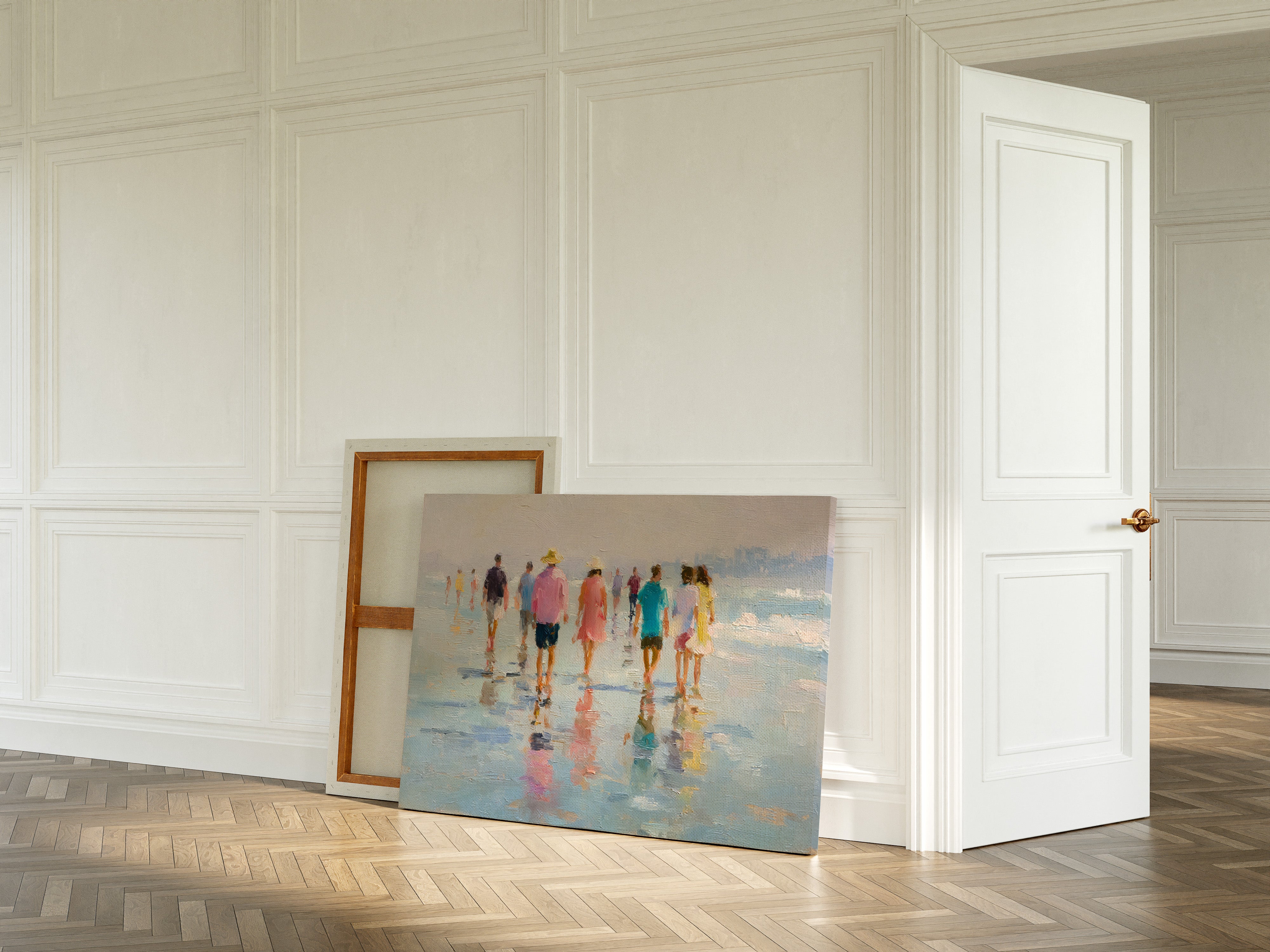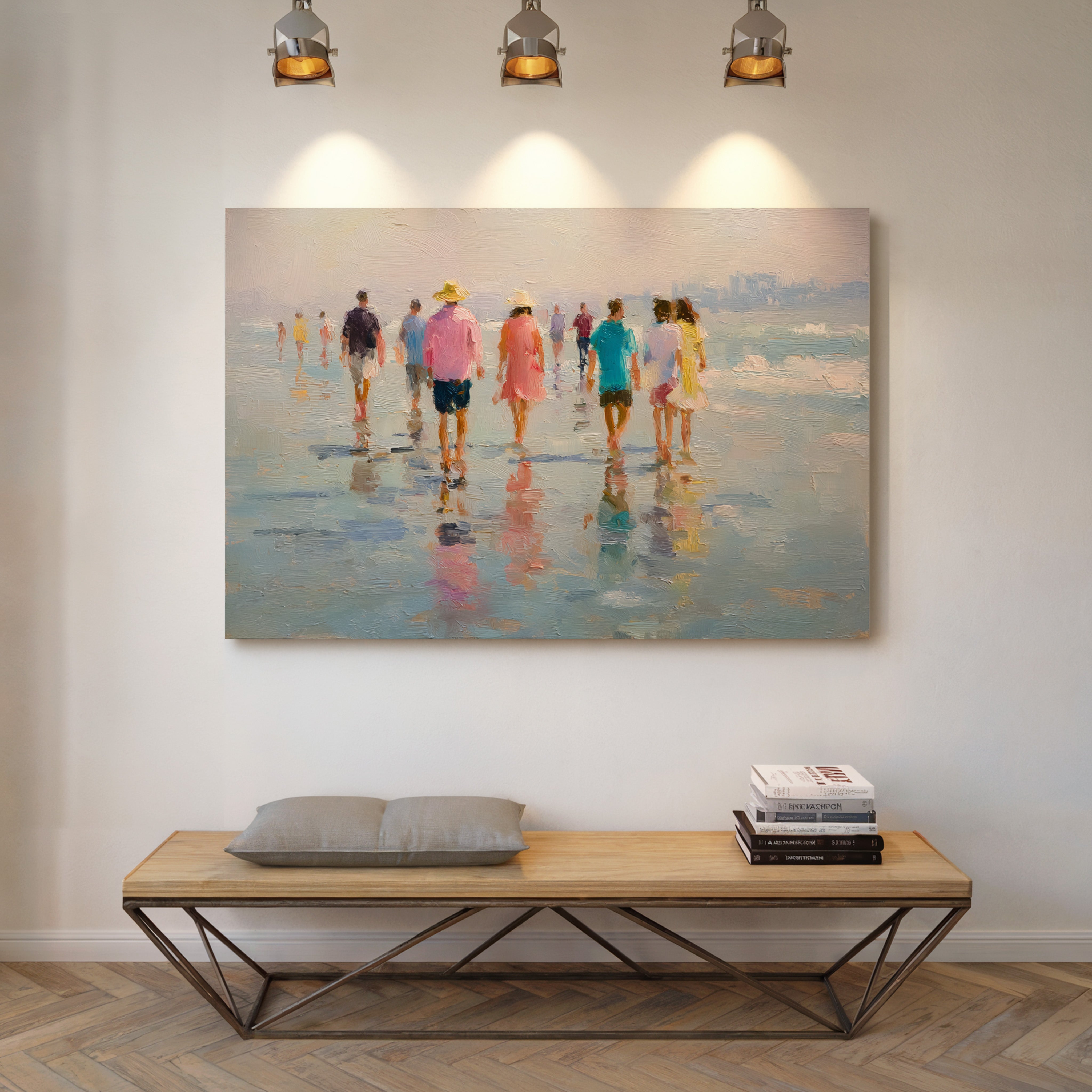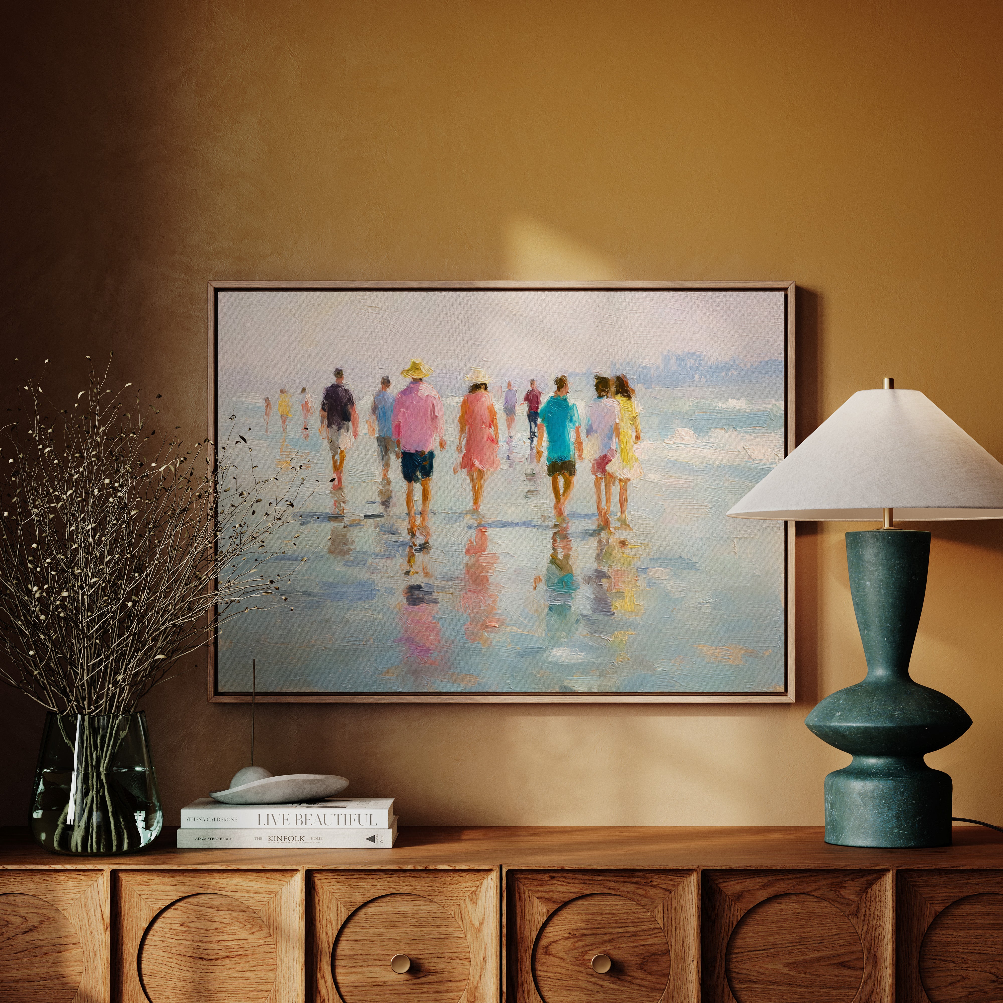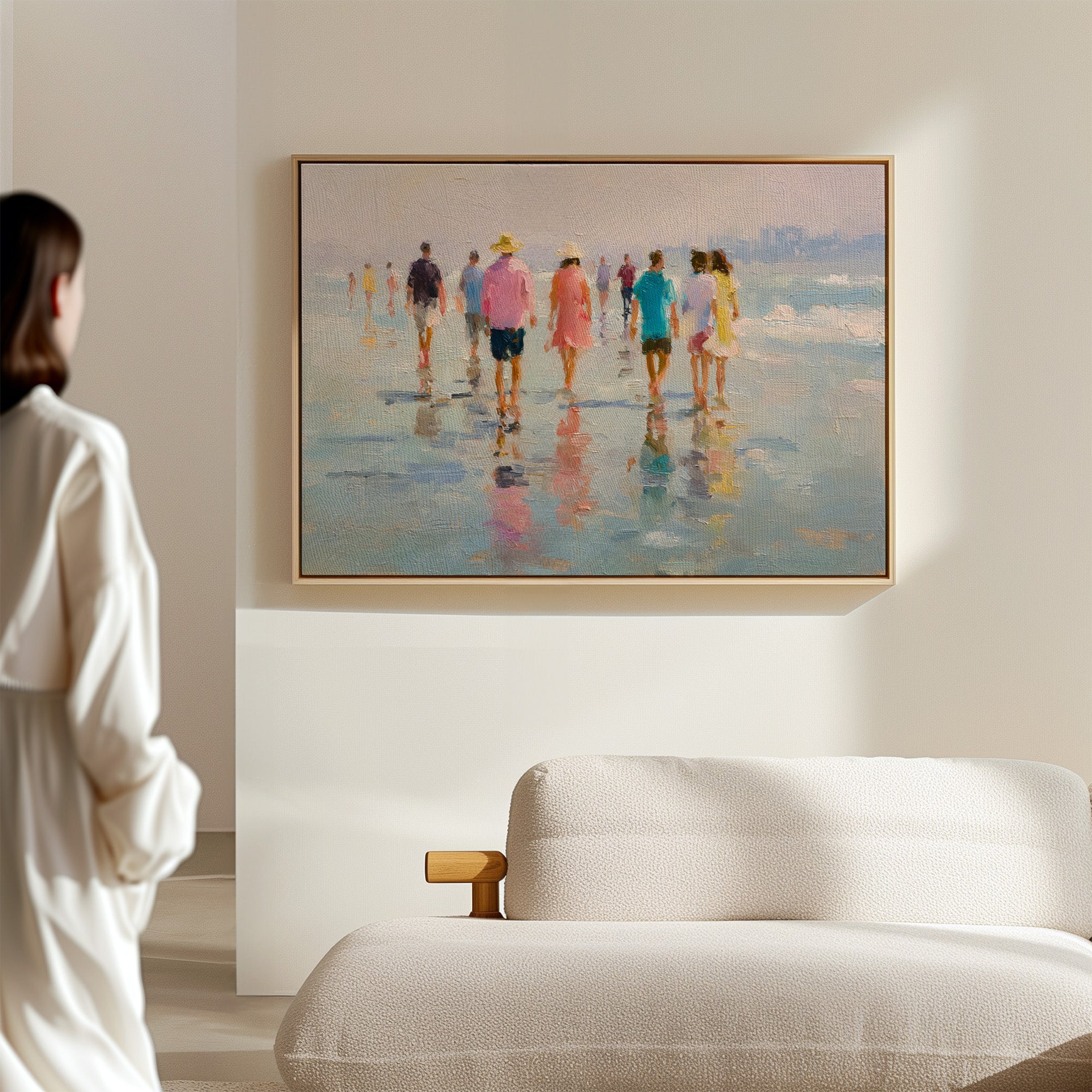 Sunlight dances across the wet sand, creating a mirror that catches the pastel hues of beachgoers in gentle reflection. Figures move unhurried through the shallow waters, their forms softened by the impressionist strokes that capture this fleeting moment of seaside serenity. The palette is a harmonious blend of coral pinks, turquoise blues, and buttery yellows, each color melting into the next like ice cream on a warm day. This scene evokes memories of endless summer afternoons when time seems to slow down and the boundary between sky and sea becomes beautifully blurred.