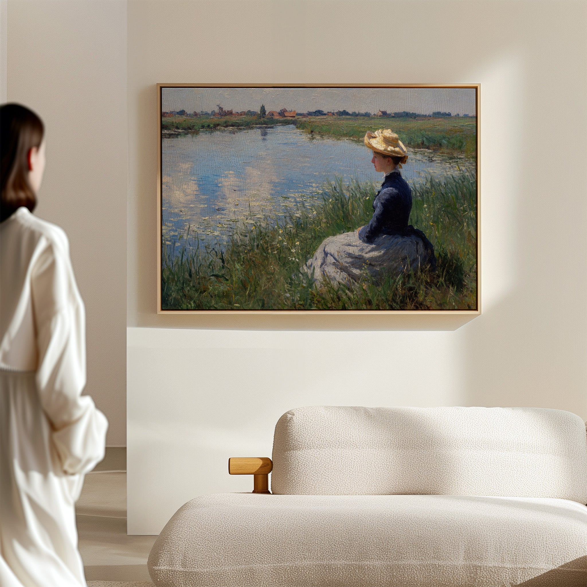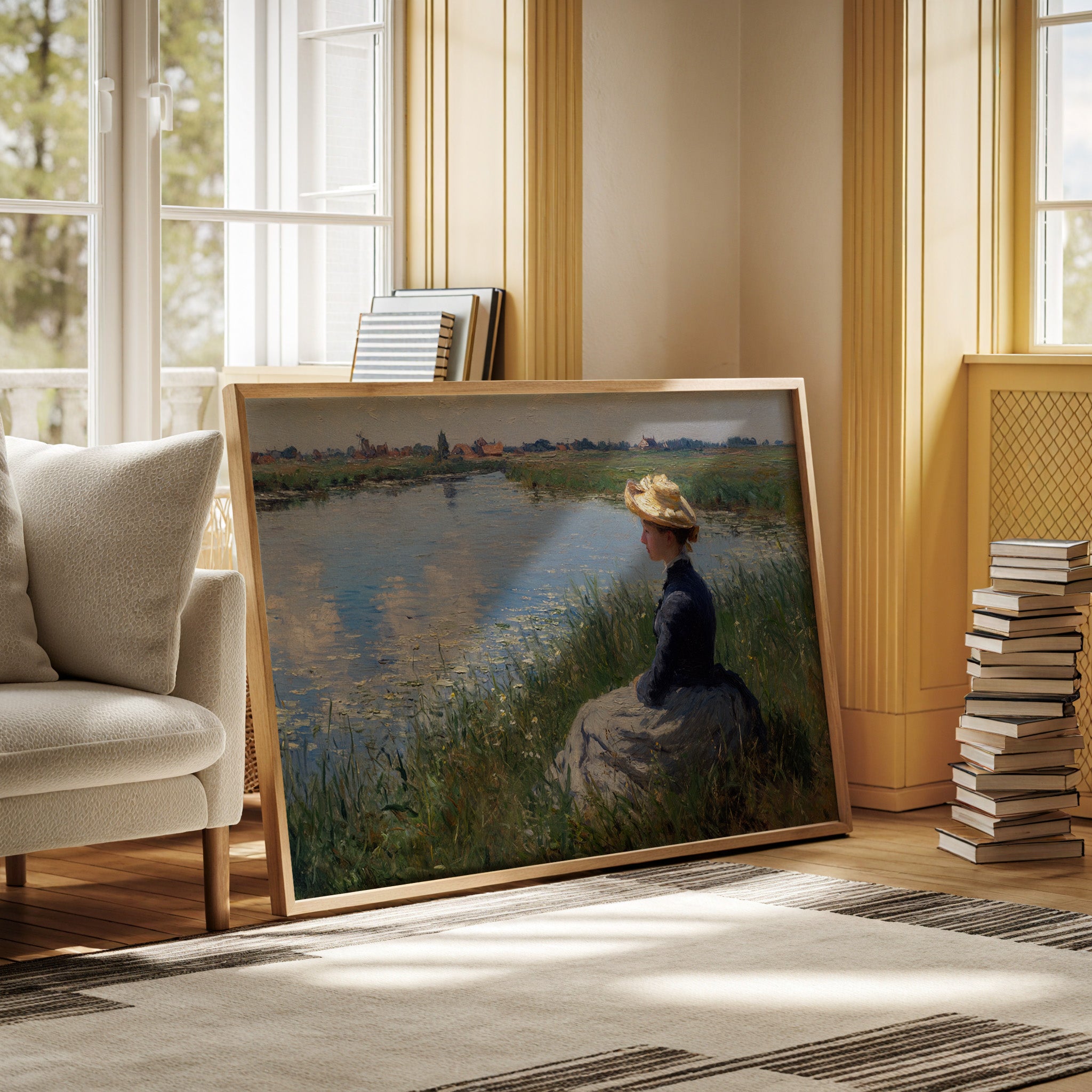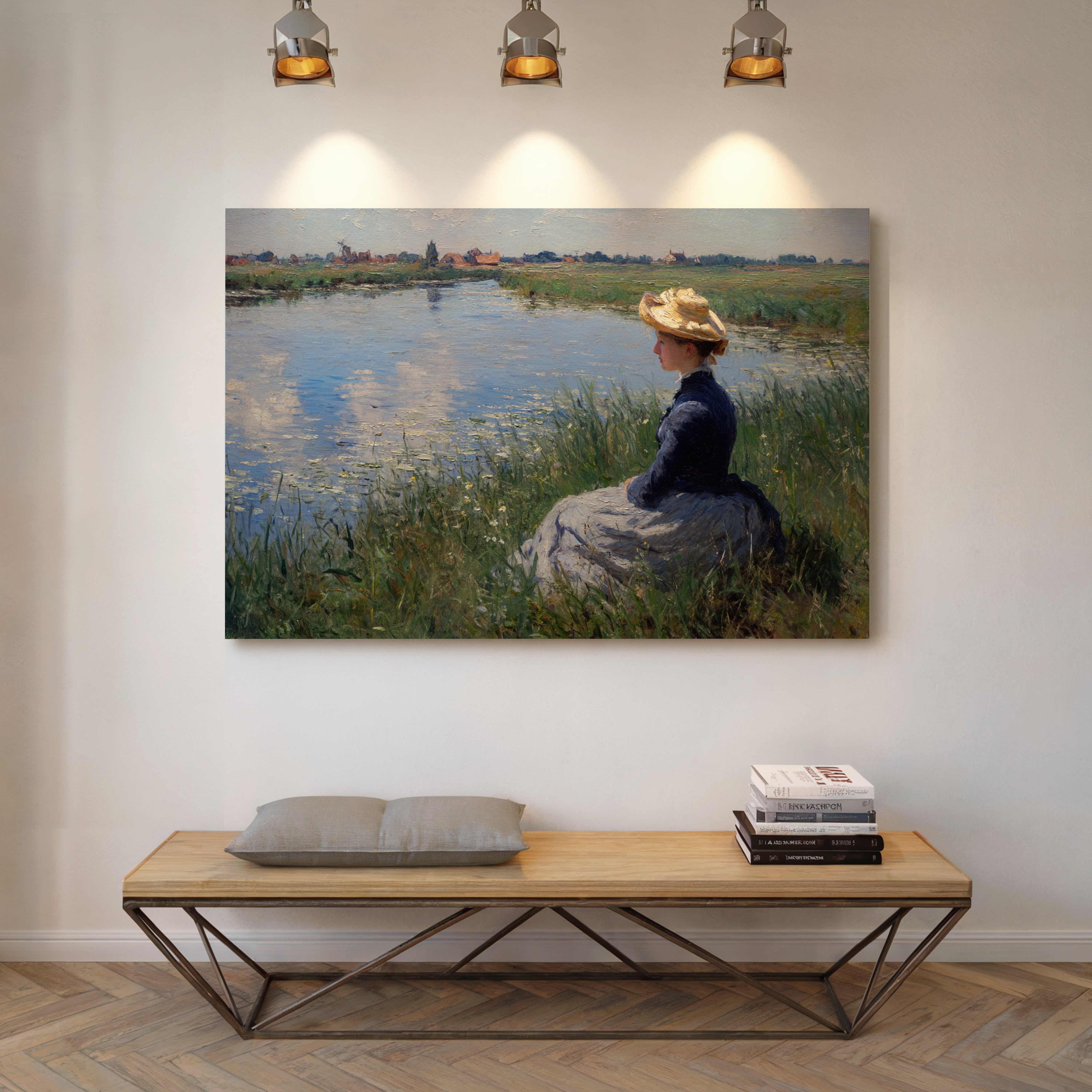 A moment of peaceful contemplation unfolds along a serene riverbank, where wildflowers dance among tall grasses. The composition captures the essence of a summer afternoon, with a figure in elegant Victorian attire gazing across tranquil waters that mirror the soft sky above. Rich brushstrokes bring to life the textural landscape - from the delicate riverbank flowers to the distant village rooftops dotting the horizon. The interplay of light on water creates a dreamy atmosphere that speaks to moments of quiet reflection and inner peace. This piece would bring a timeless grace to a reading nook or formal sitting room, where its contemplative mood can be fully appreciated.