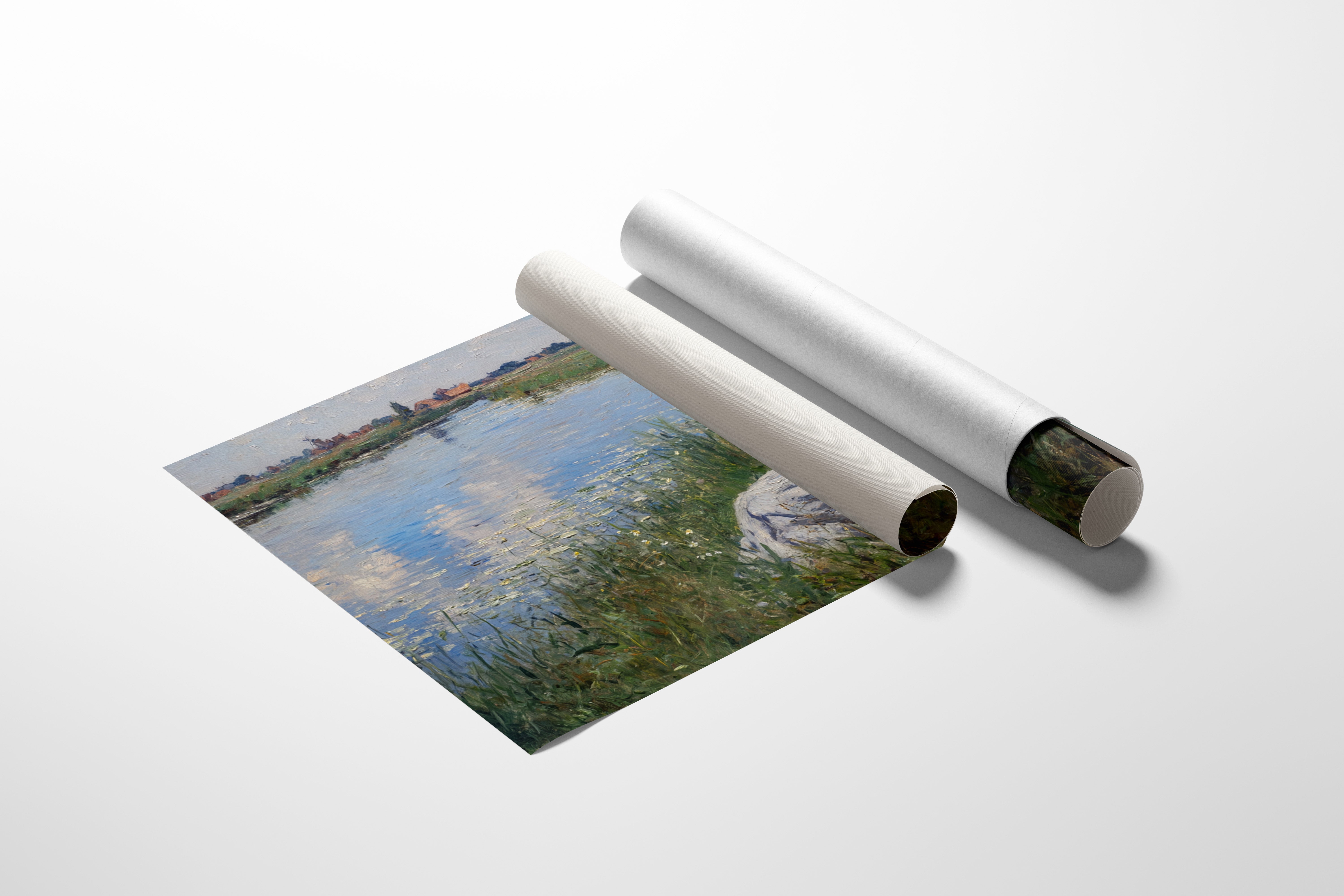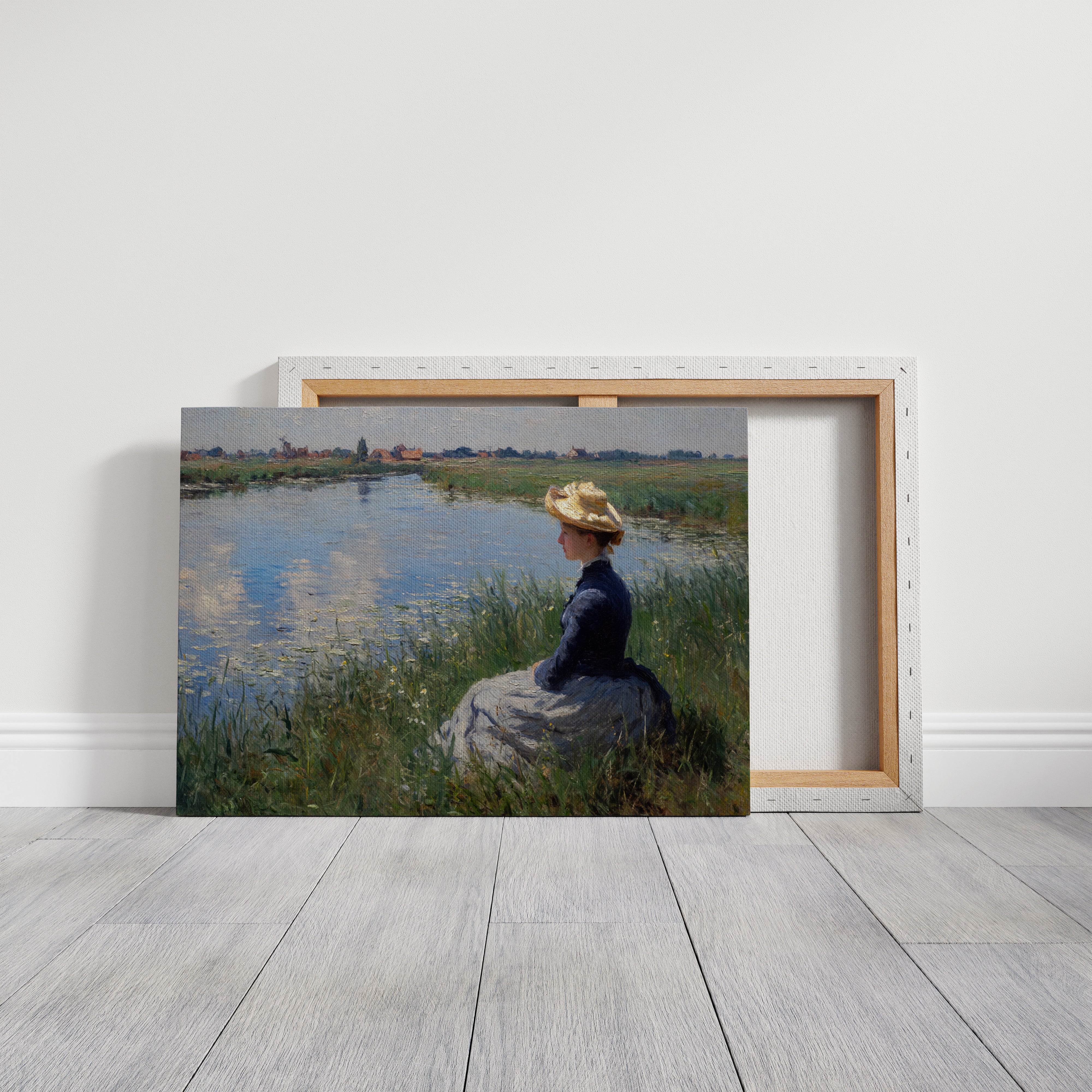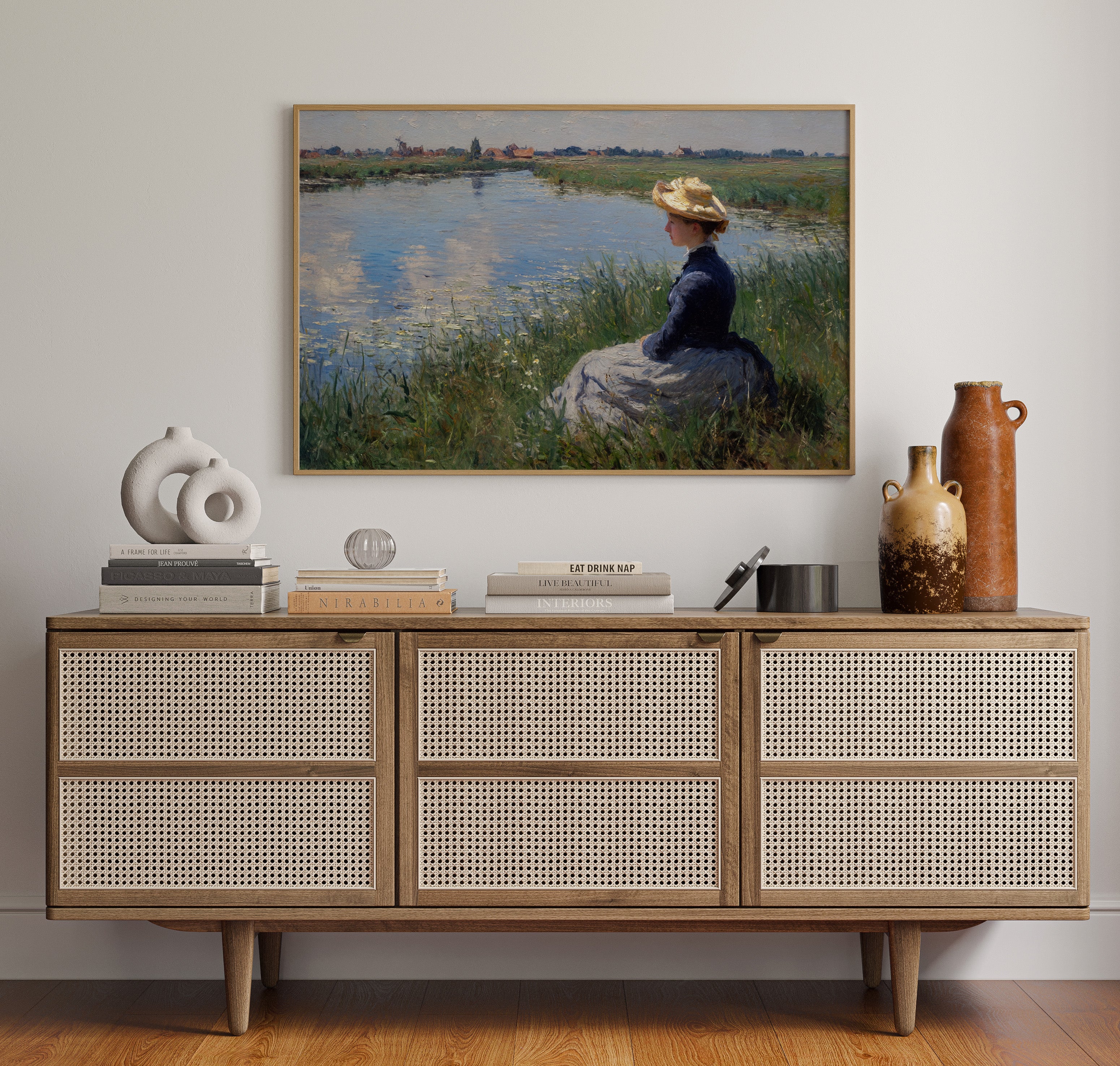 A moment of peaceful contemplation unfolds along a serene riverbank, where wildflowers dance among tall grasses. The composition captures the essence of a summer afternoon, with a figure in elegant Victorian attire gazing across tranquil waters that mirror the soft sky above. Rich brushstrokes bring to life the textural landscape - from the delicate riverbank flowers to the distant village rooftops dotting the horizon. The interplay of light on water creates a dreamy atmosphere that speaks to moments of quiet reflection and inner peace. This piece would bring a timeless grace to a reading nook or formal sitting room, where its contemplative mood can be fully appreciated.