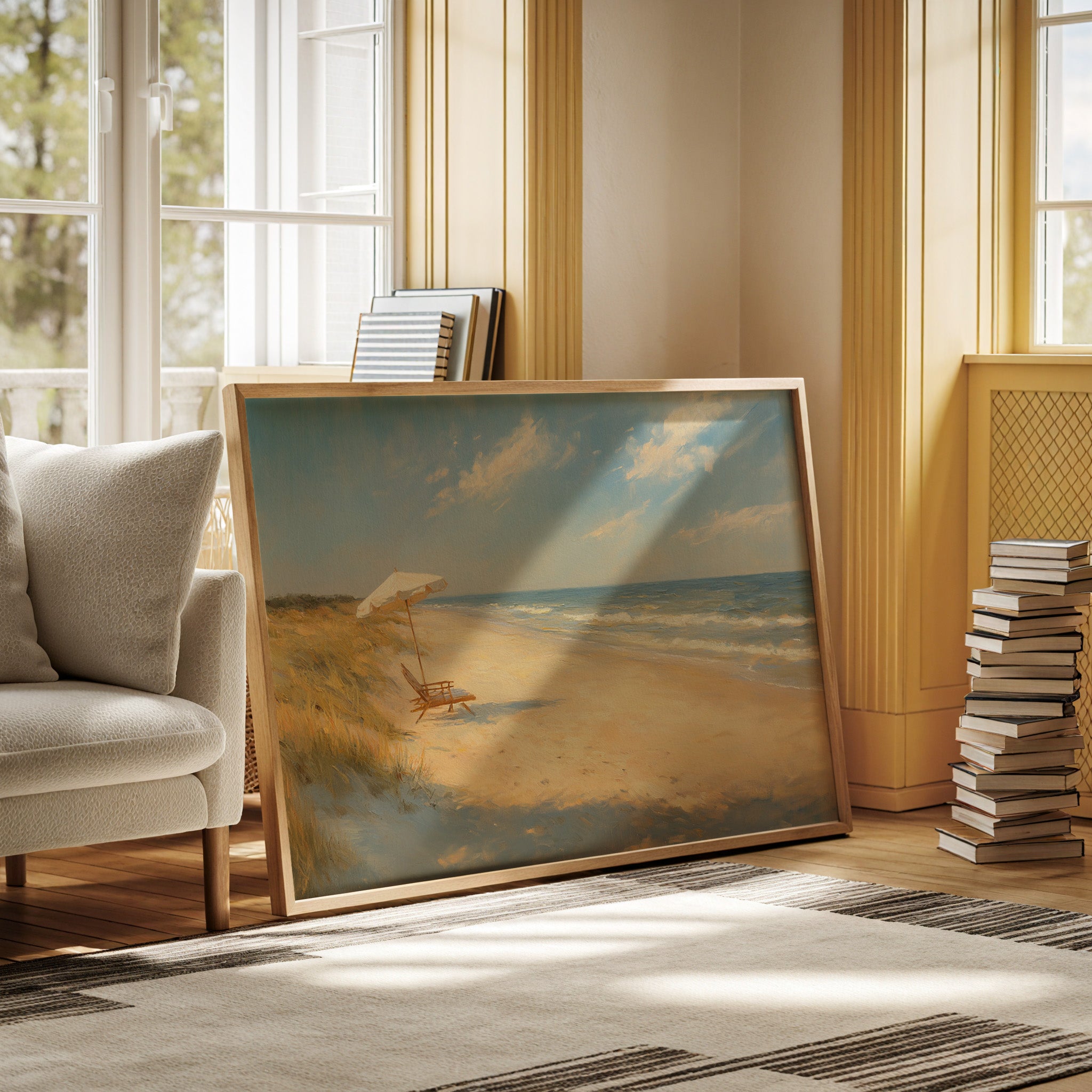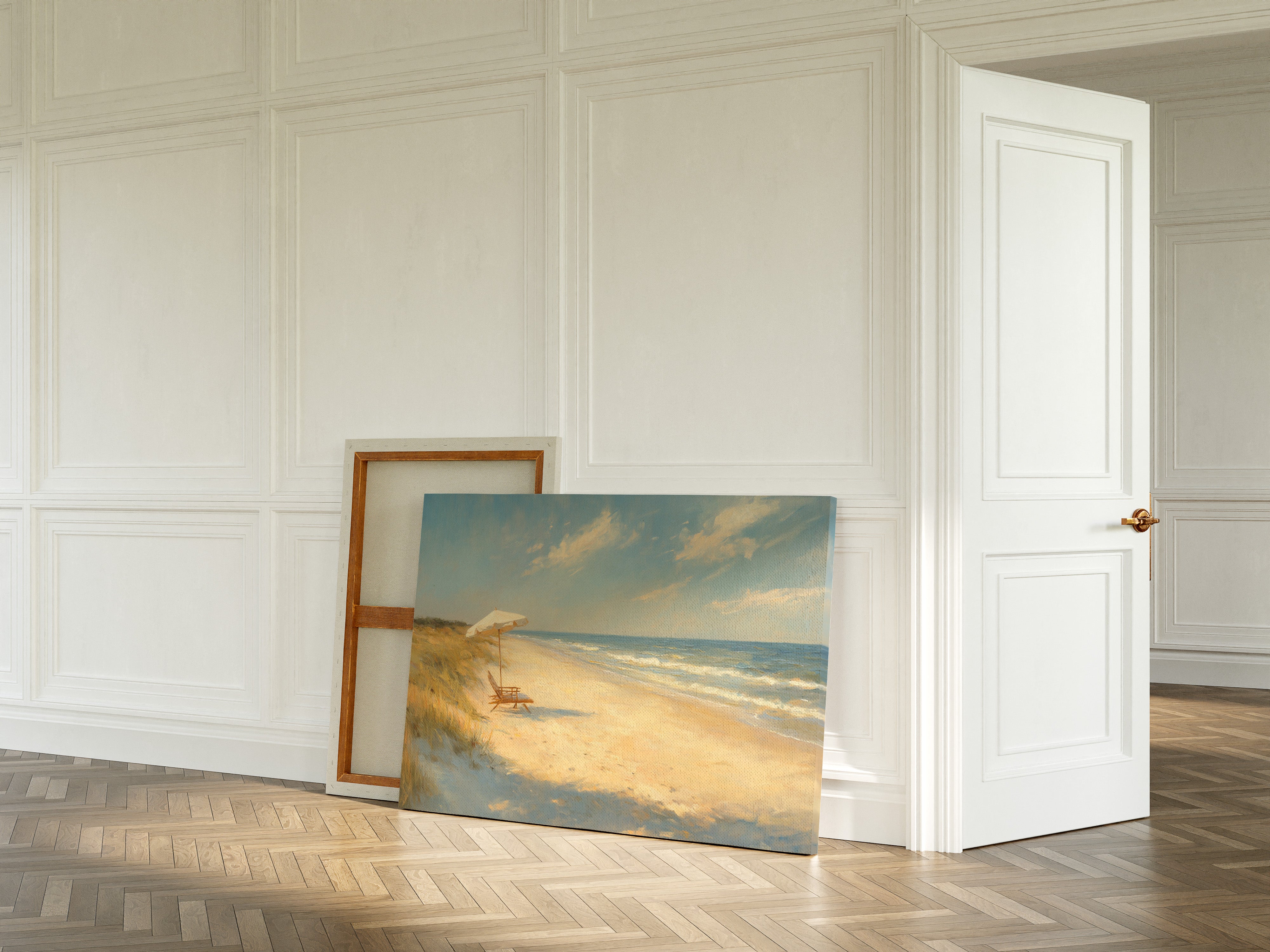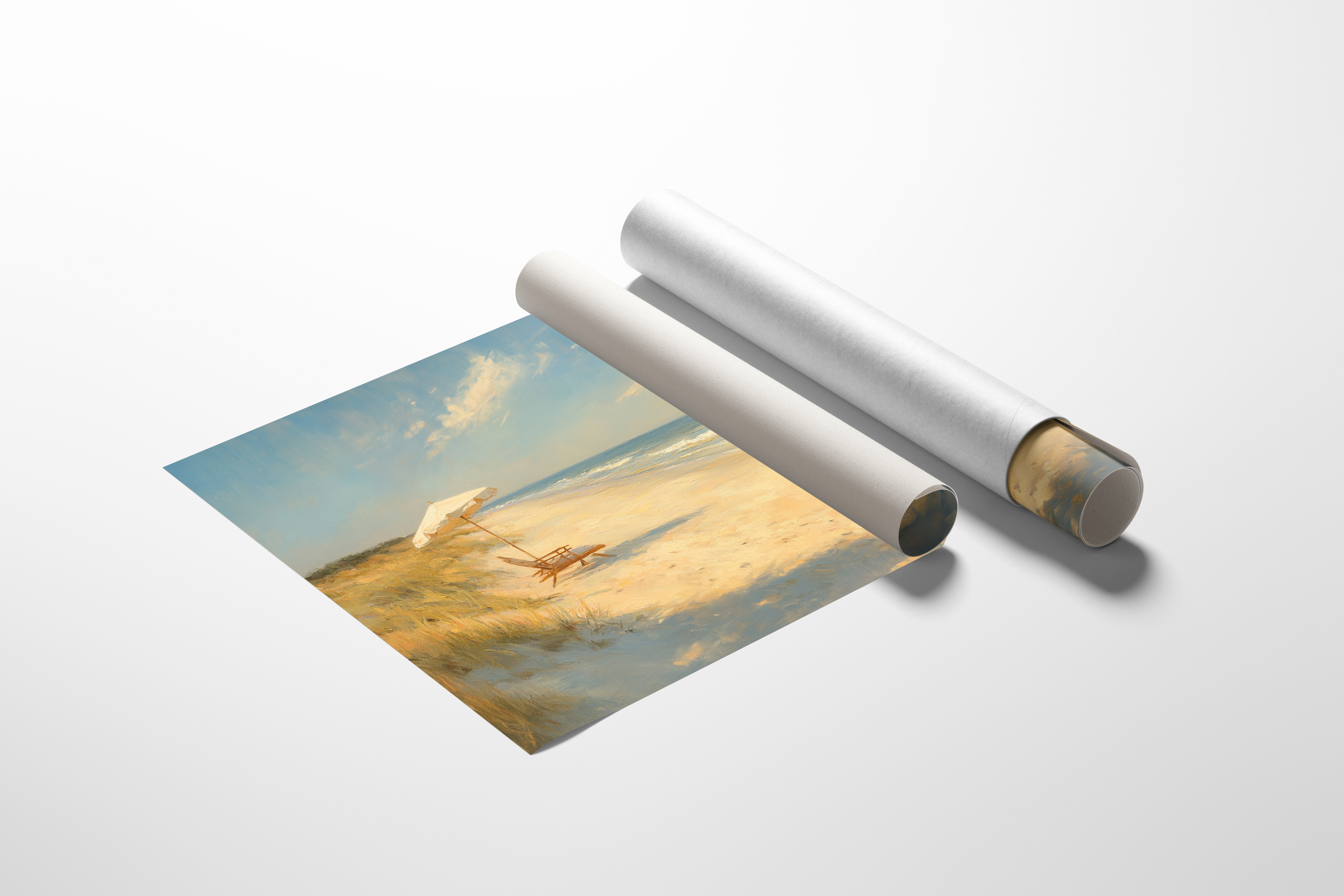 A solitary beach chair and umbrella stand sentinel on pristine shores, casting long afternoon shadows across sun-warmed sand. Golden sea grass dances along dunes that meet an endless horizon, where gentle waves lap at the shoreline in rhythmic succession. The scene captures the essence of coastal serenity - where time slows and worries dissolve into the salt air. The warm, honey-toned palette creates a dreamy atmosphere that speaks of lazy summer days and peaceful solitude.