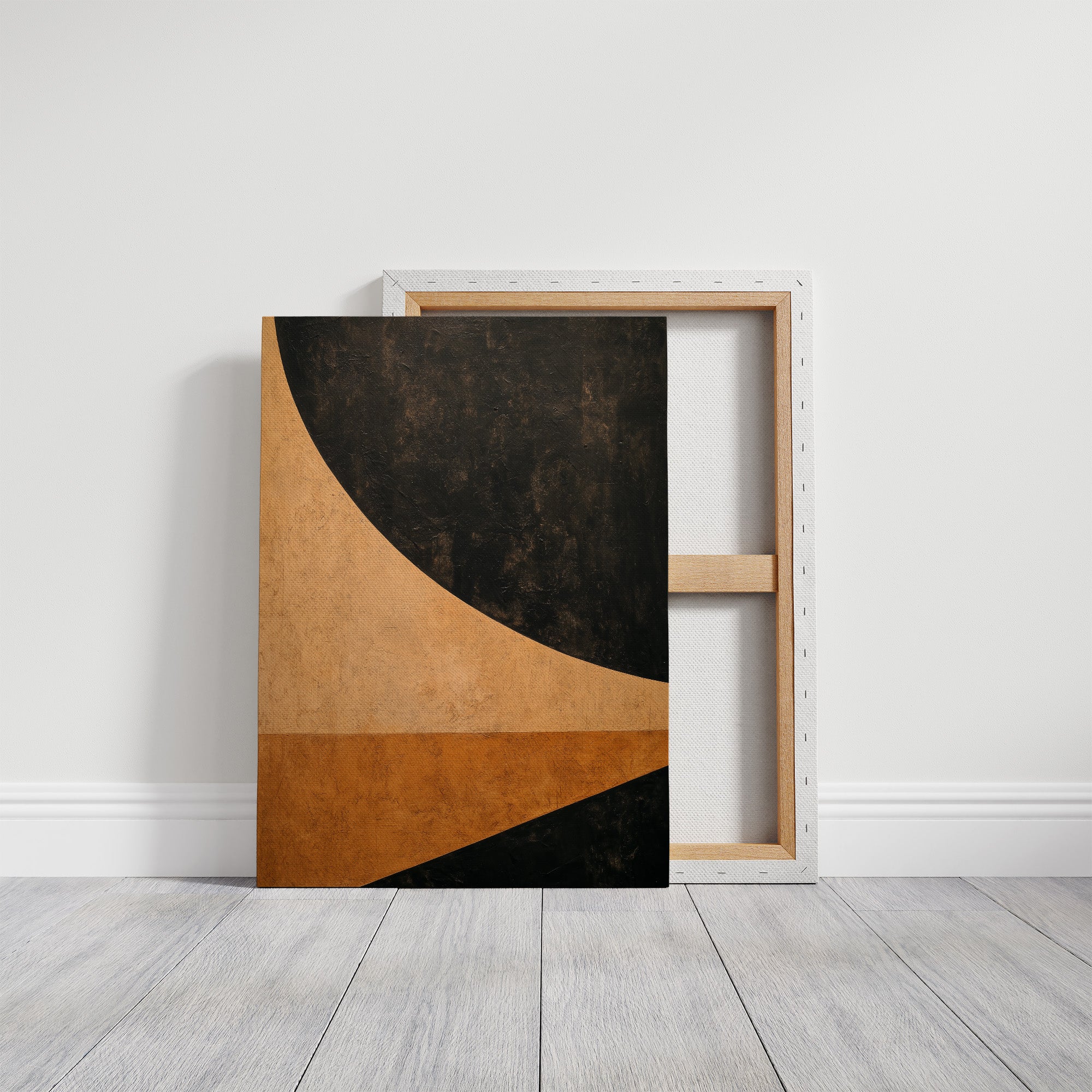 Warm afternoon light spills across a sophisticated living space, highlighting the interplay between geometric forms and organic textures. A striking abstract artwork in earthy copper and deep charcoal tones rests against sleek furniture, while a ribbed ceramic lamp adds subtle dimension. The scene captures the essence of contemporary design where clean lines meet natural materials, creating a harmonious balance between warmth and structure. This space would elevate any modern living room, home office, or creative studio where sophisticated design meets everyday comfort.