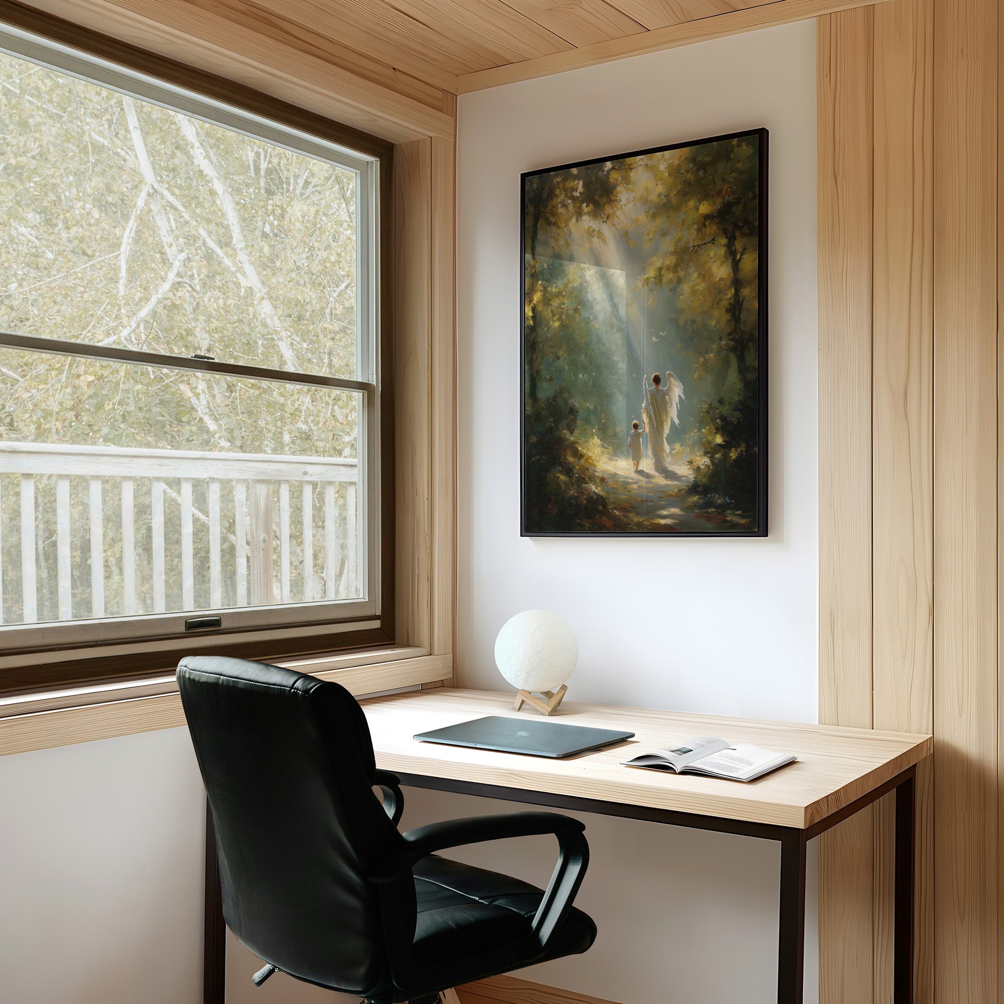 Golden light cuts through a forest canopy, illuminating a path where two figures walk hand in hand. The scene captures a moment of transcendent connection, with dappled sunrays creating an almost ethereal atmosphere among the autumn-tinged leaves. The painting's rich textures blend deep forest greens with luminous golds and soft blues, inviting viewers to contemplate themes of guidance, protection, and spiritual presence. This piece brings a sense of peace and contemplation to a living room or meditation space.