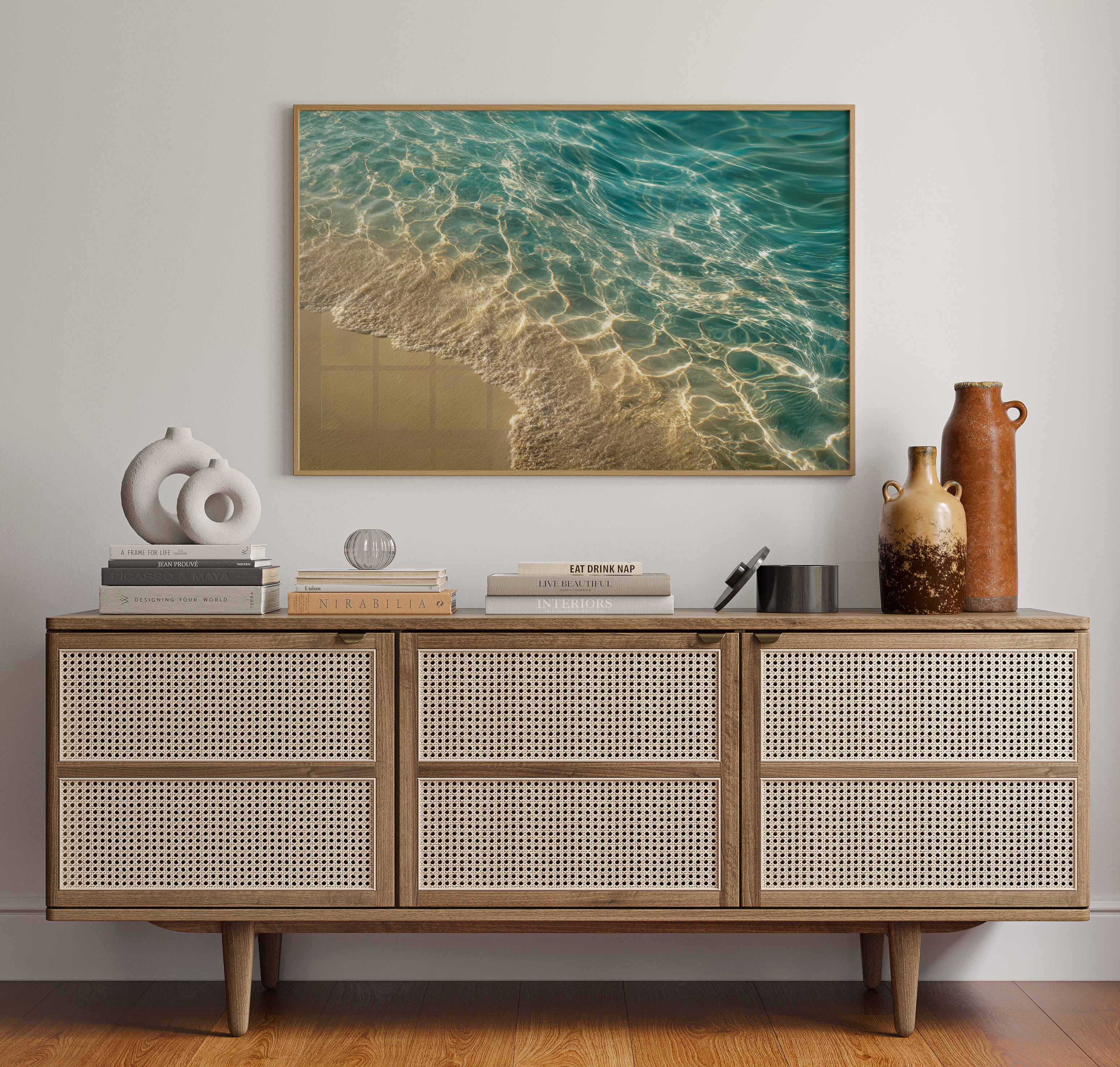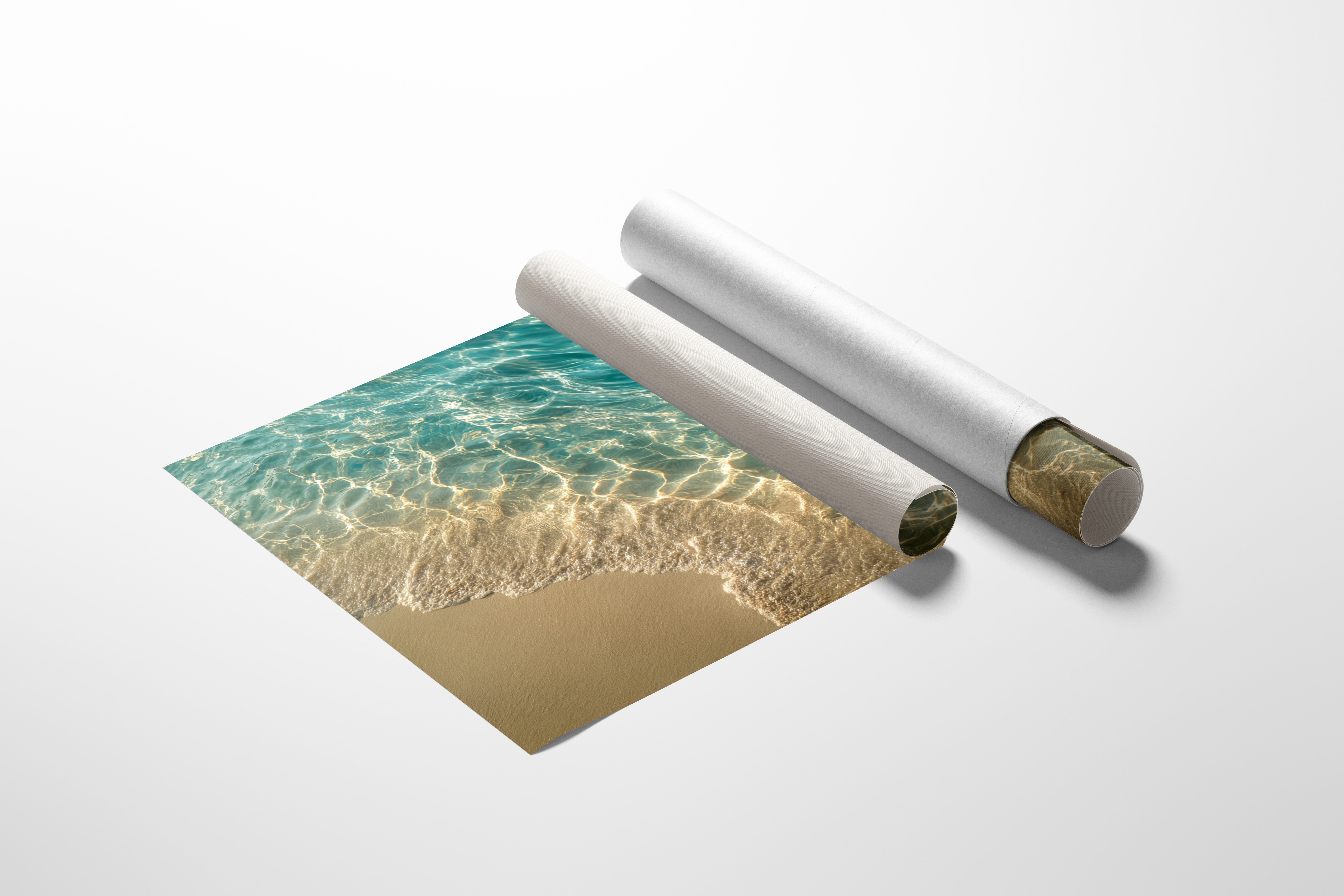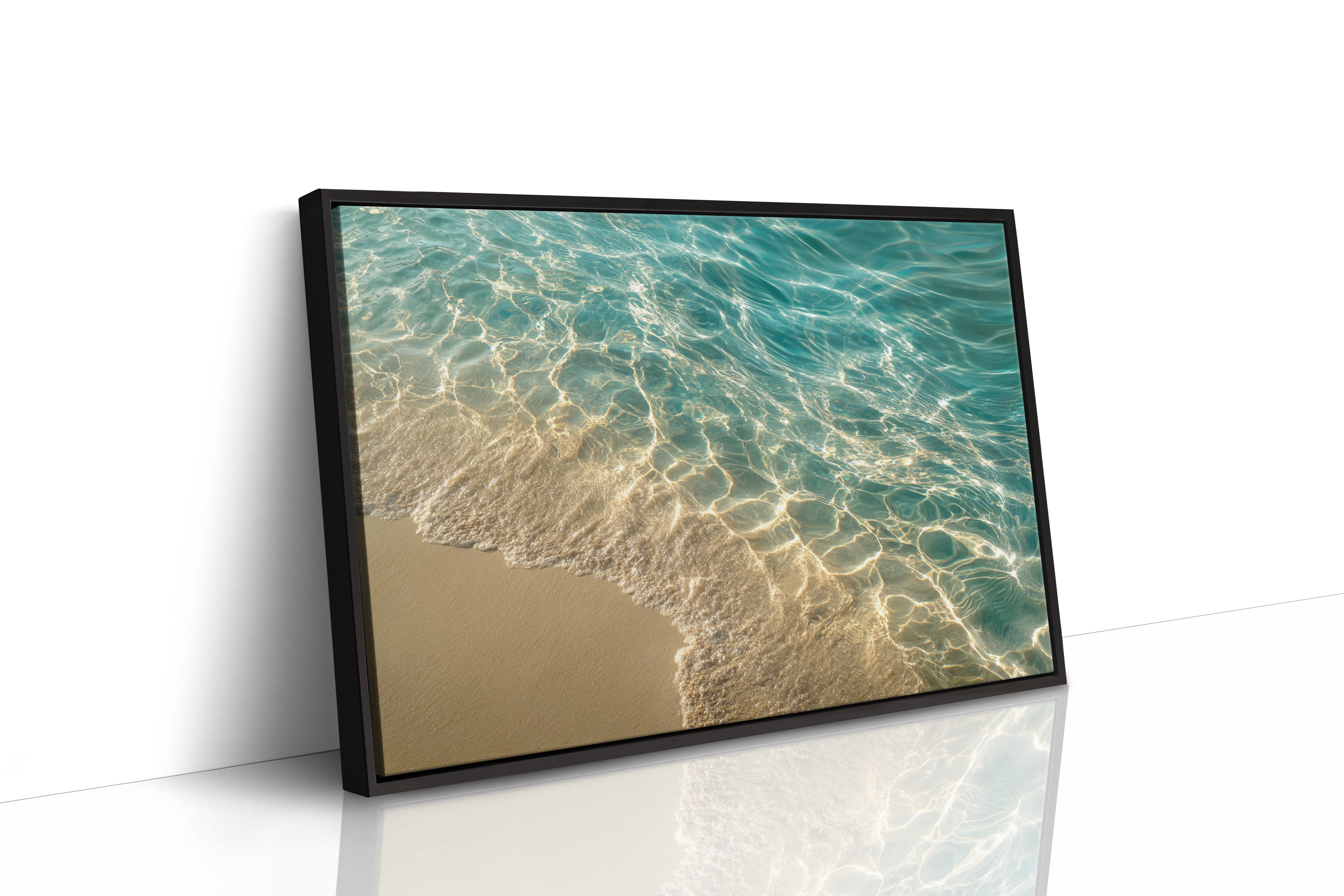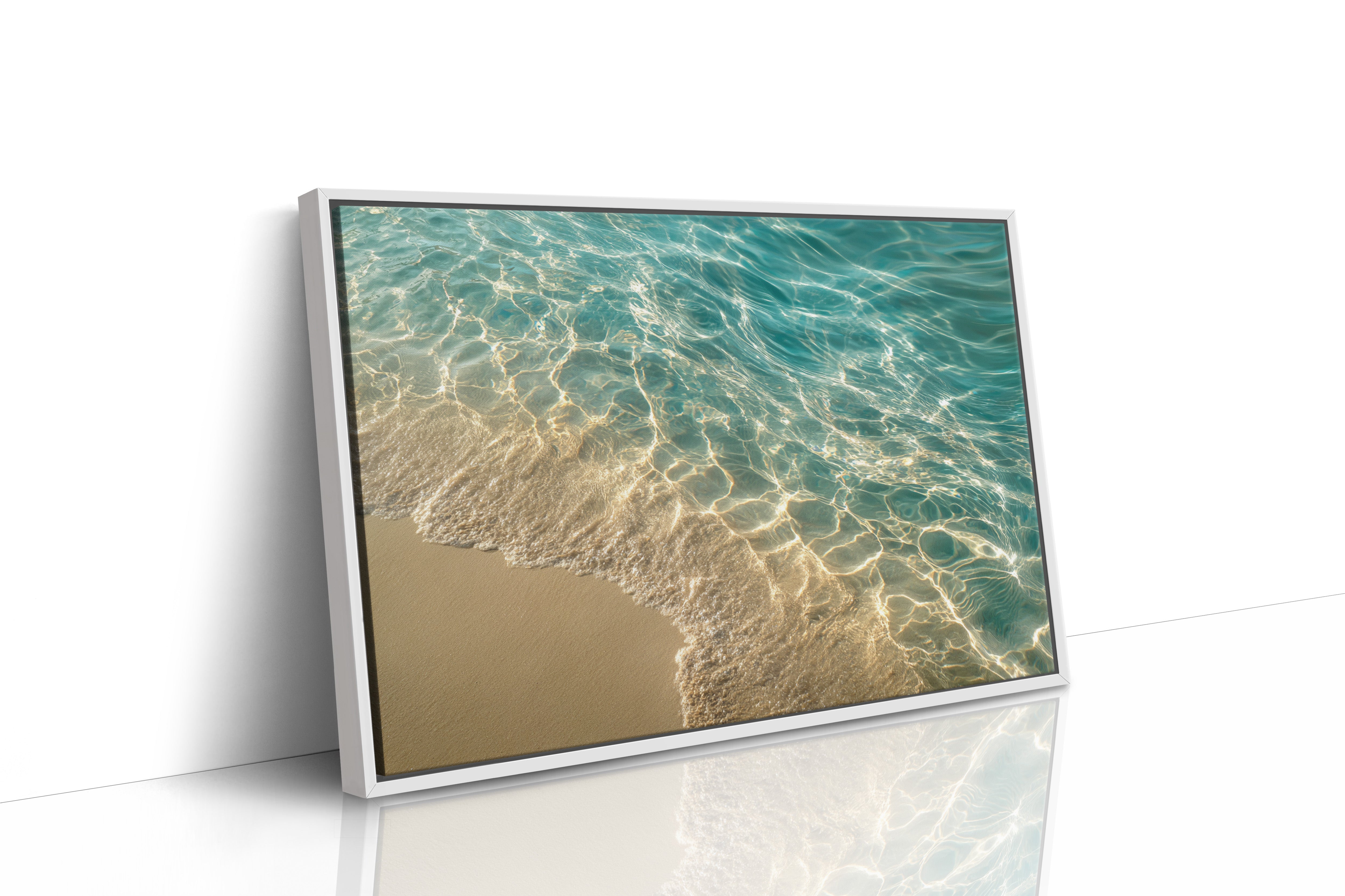Crystal-clear waters lap gently against golden sand, creating a mesmerizing dance of light and shadow. The aquamarine waters shimmer with an almost ethereal quality, their surface decorated with intricate patterns like nature's own stained glass. Sunlight catches each ripple and wave, transforming the ocean into a brilliant display of turquoise and gold, while delicate foam traces lace-like patterns along the shoreline. This piece captures the serene beauty of where land meets sea, offering a moment of pure coastal tranquility.
