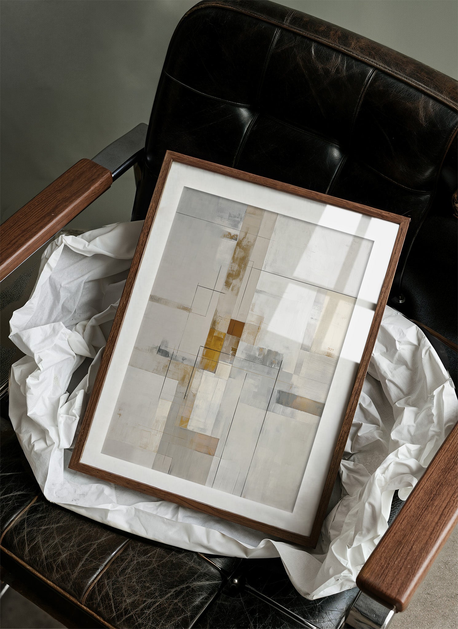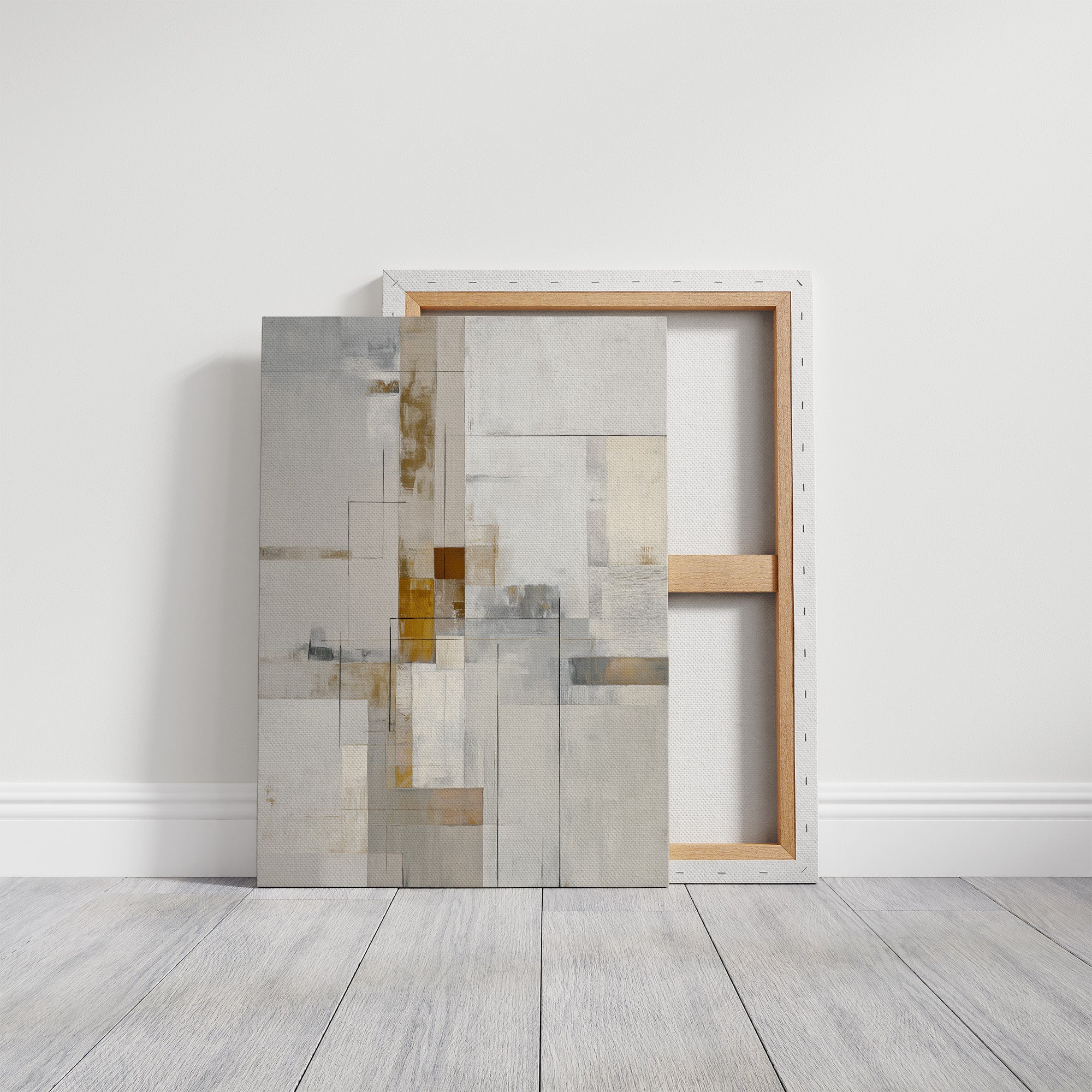 Morning light streams across polished floors, dancing with the minimalist canvas that leans against pristine white walls. The abstract artwork's gentle grays and warm amber tones create a sophisticated dialogue with the contemporary space, while tropical greenery adds organic movement to the scene. This modern sanctuary balances clean lines with natural elements, where geometric forms meet soft textures. Perfect for an airy living room or sophisticated home office where its subtle palette can anchor a minimalist aesthetic while encouraging contemplative moments.