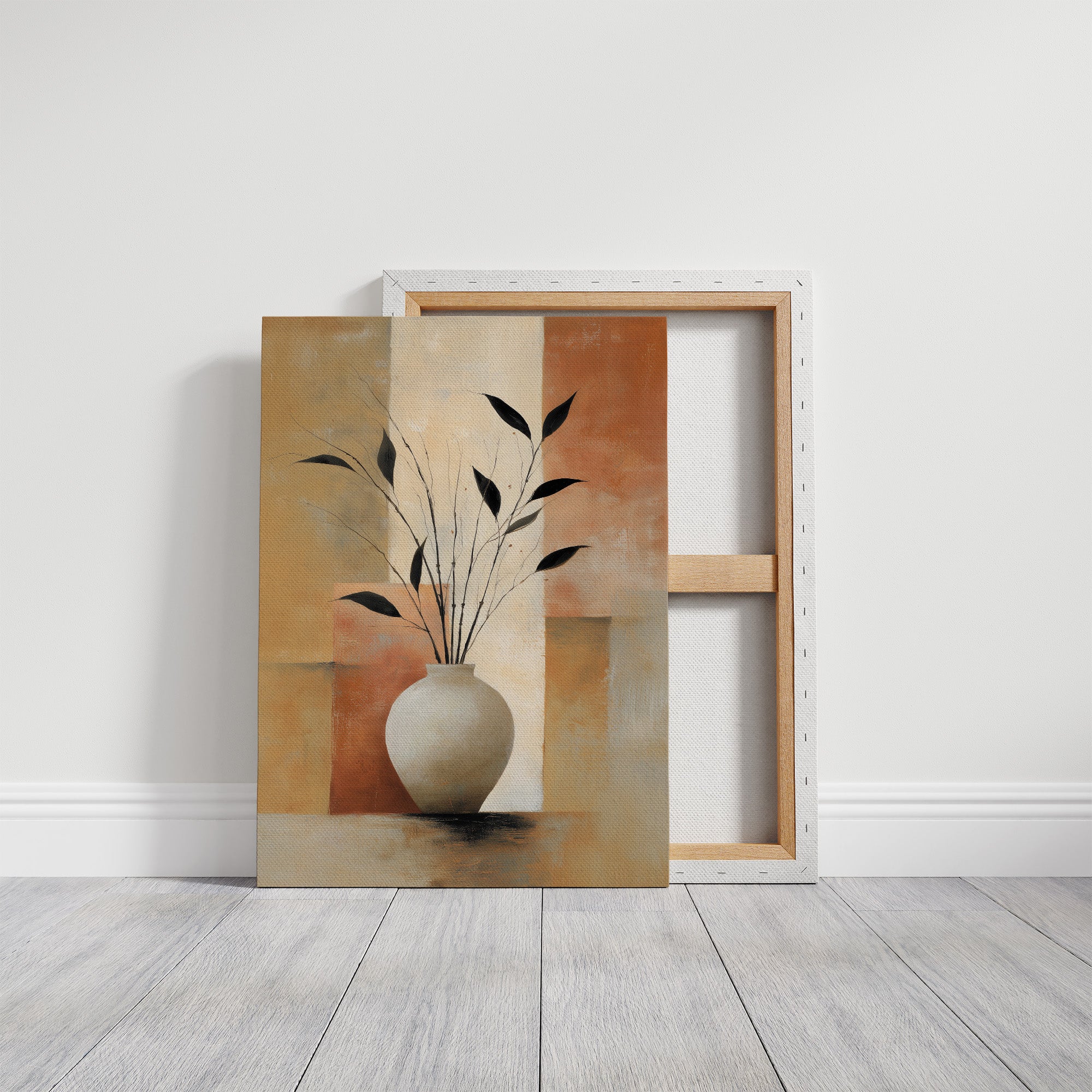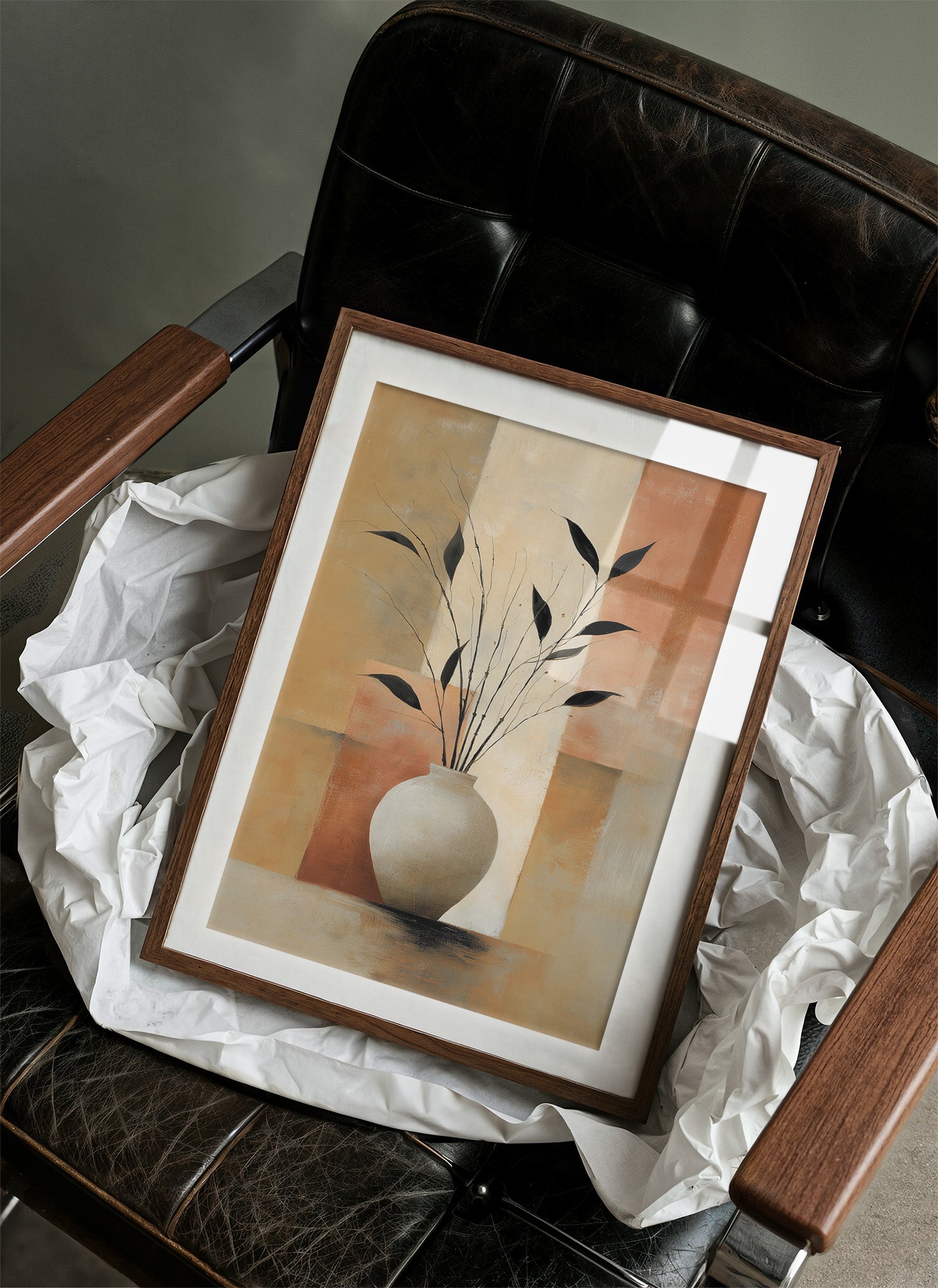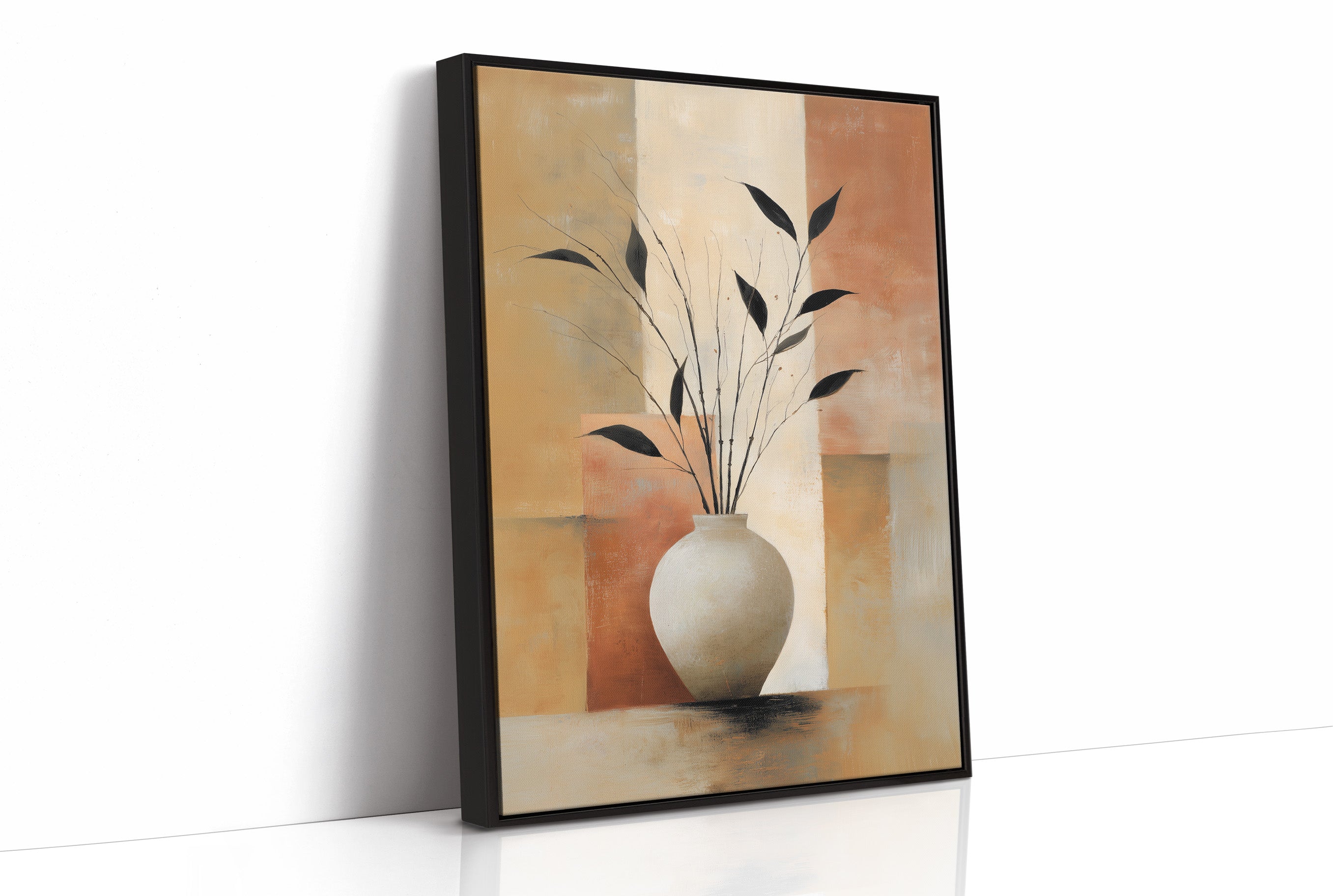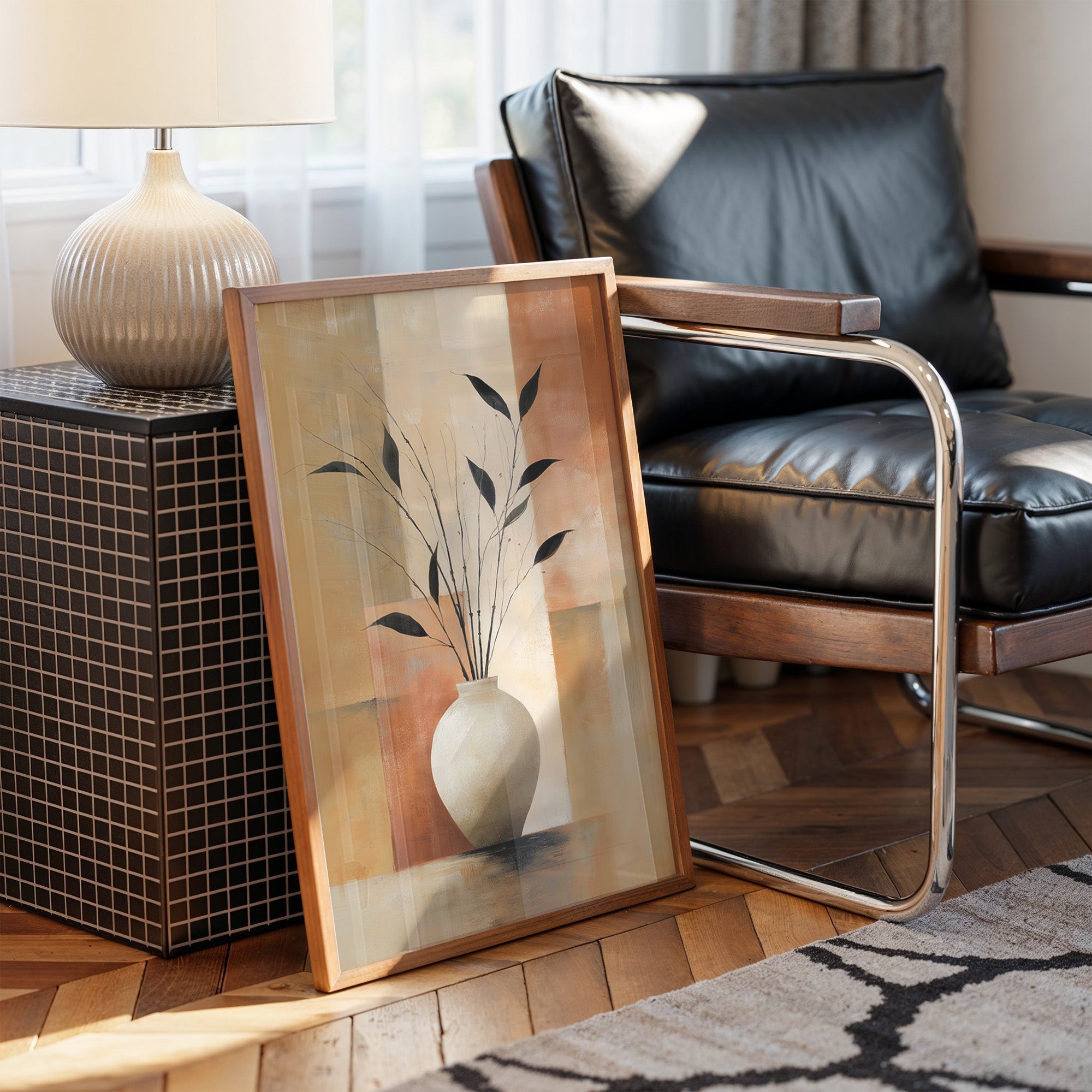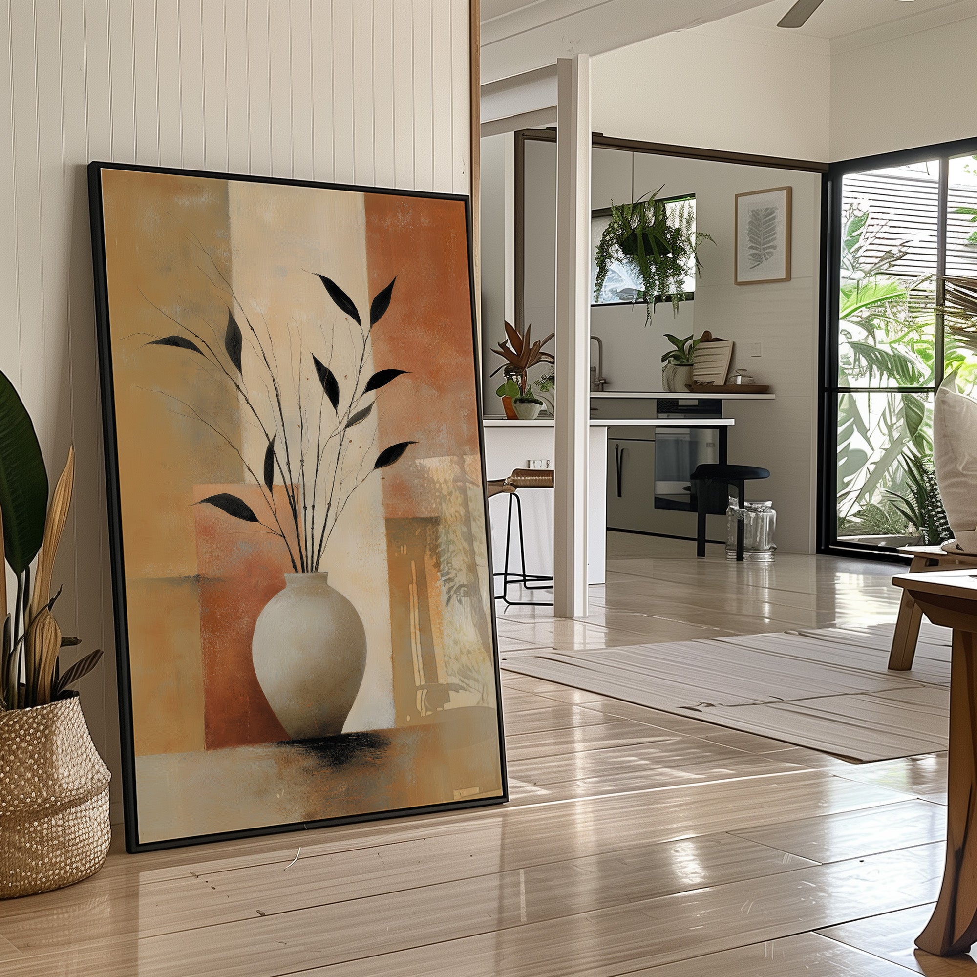 Warm afternoon light streams through industrial windows, casting gentle shadows across a thoughtfully curated home bar scene. A striking minimalist painting featuring black leaves in a neutral vessel commands attention against terracotta-toned walls, while potted plants add living texture to the sophisticated space. The carefully arranged collection of spirits and glassware on an industrial-style bar cart creates an inviting atmosphere that bridges modern utility with artistic sensibility. Perfect for a contemporary living room or dining space where entertaining and aesthetic appreciation naturally merge.