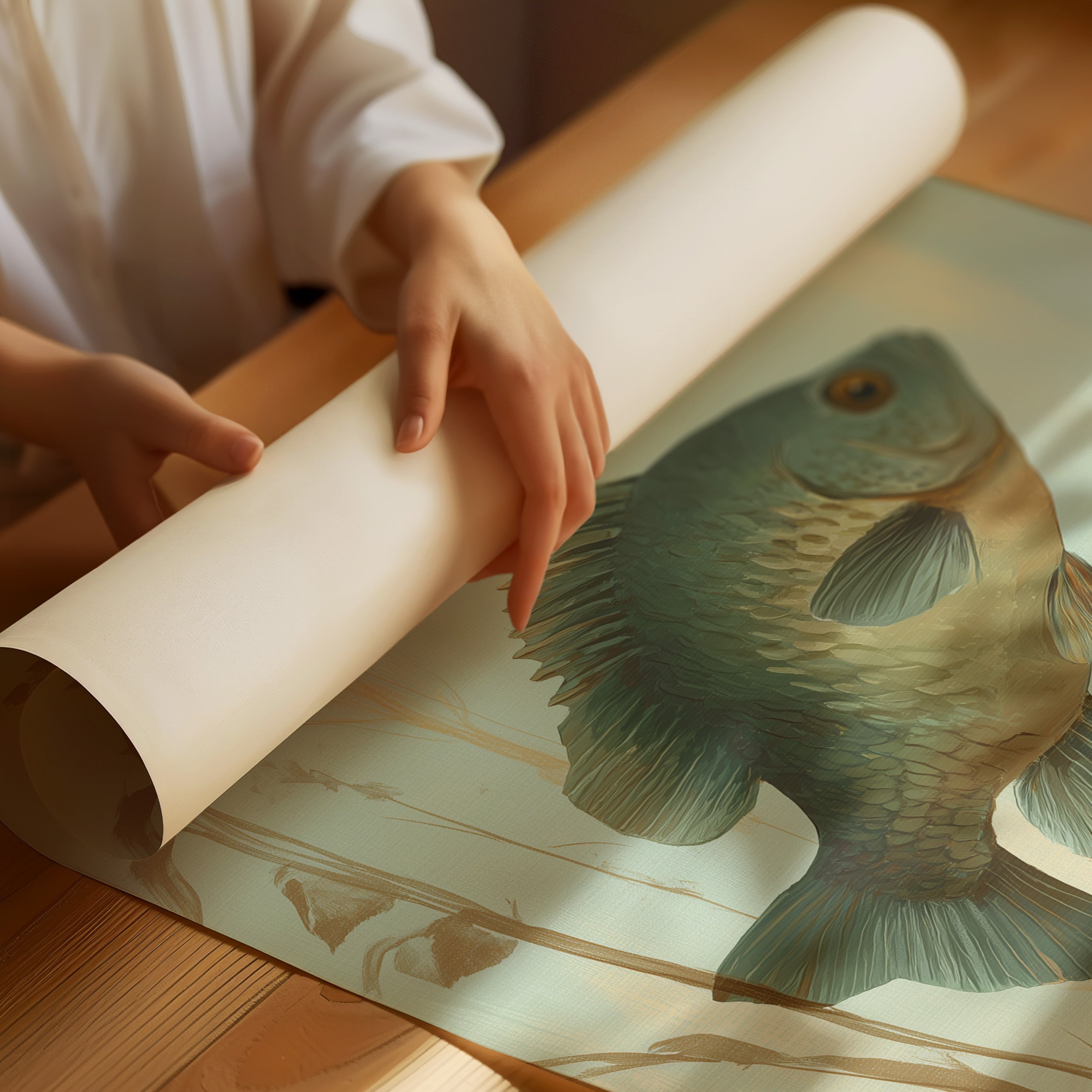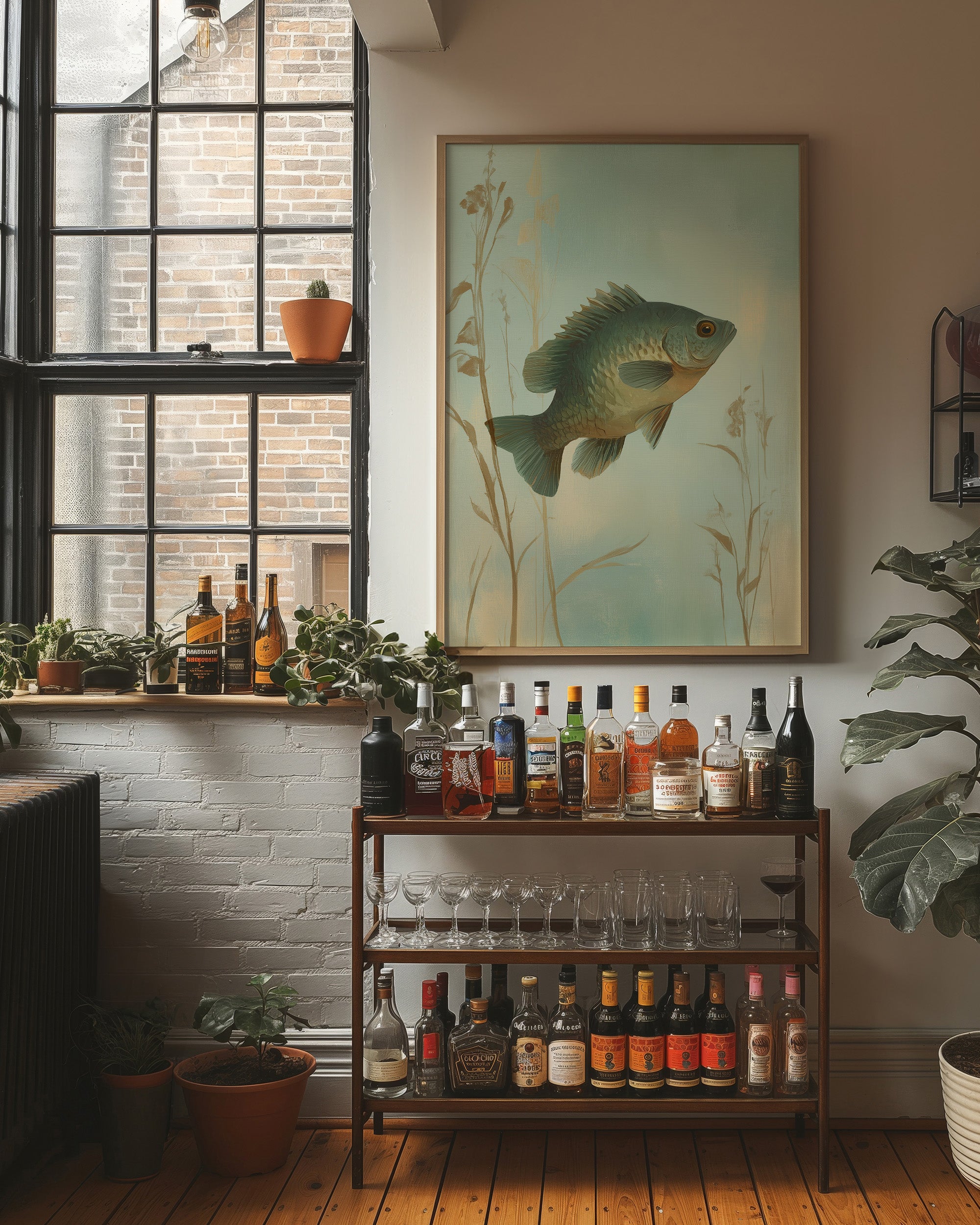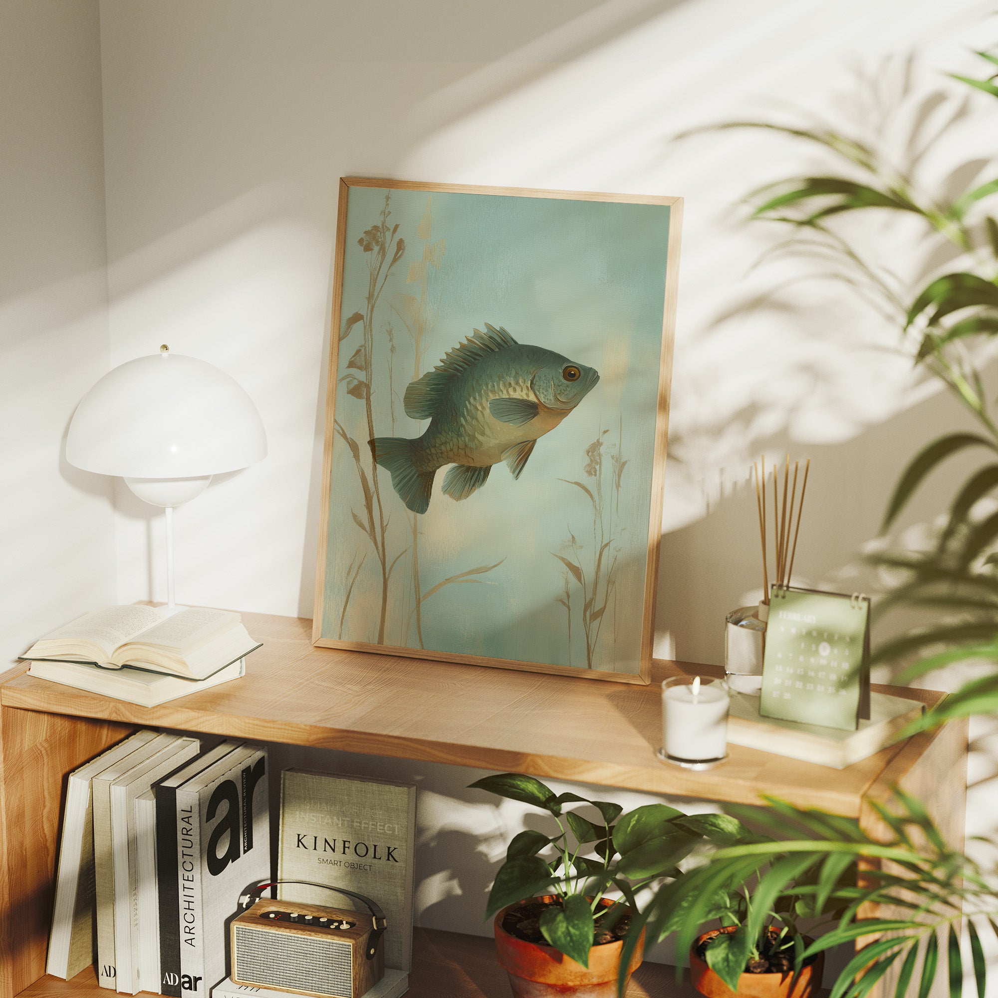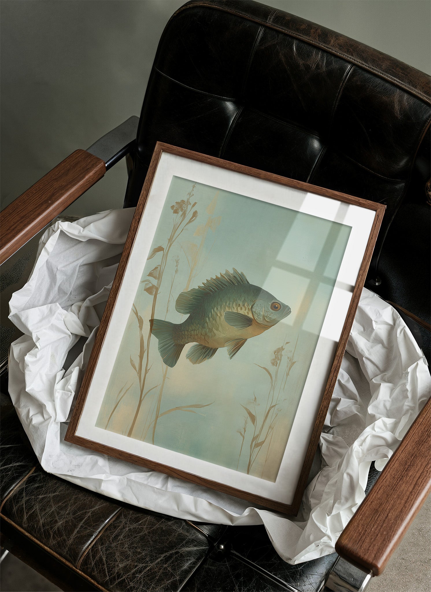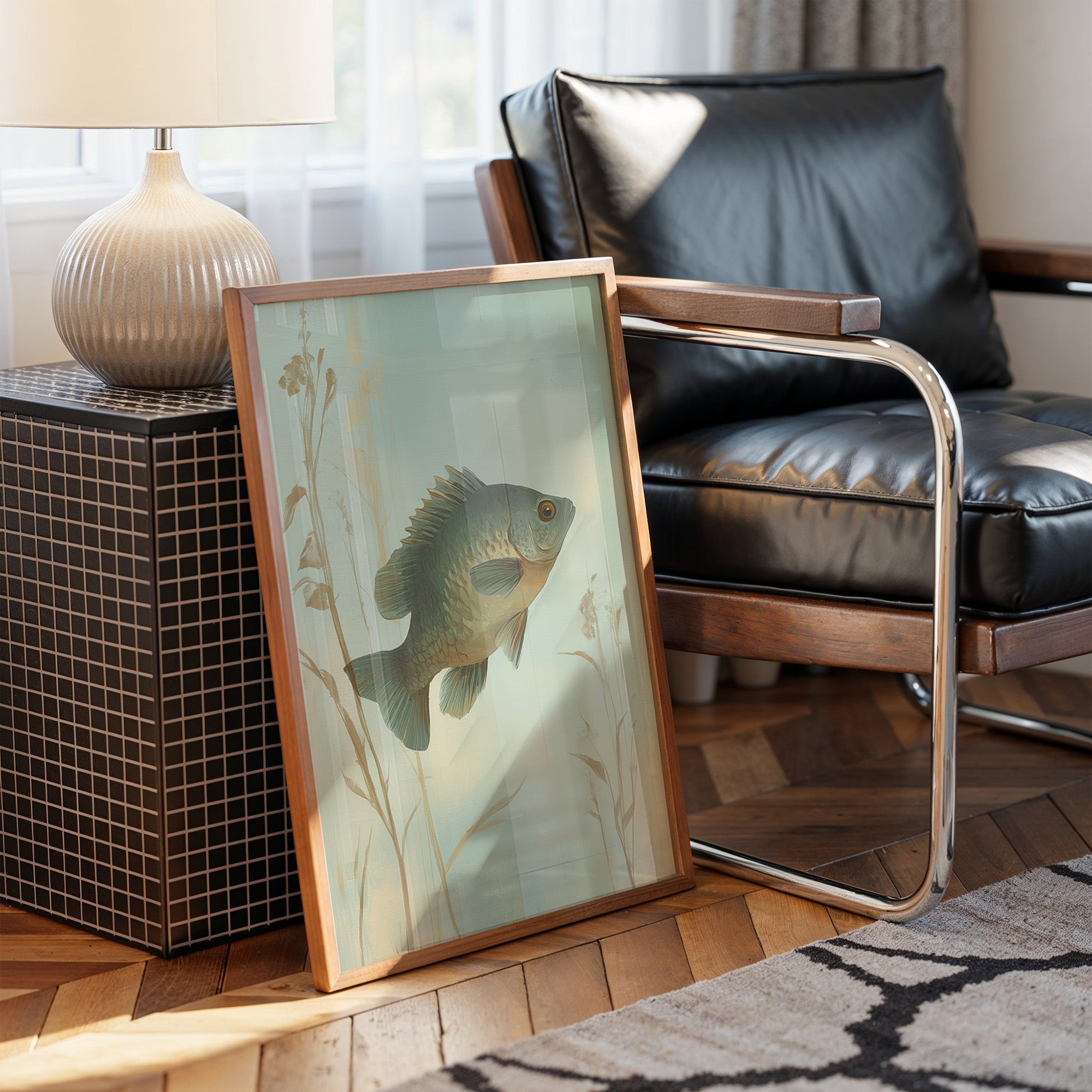 Morning light filters through the delicate illustration of a fish suspended in its watery domain, creating an atmosphere of tranquil nostalgia. The sage-green backdrop and subtle reed silhouettes frame the detailed bass in perfect harmony, evoking memories of peaceful lakeside afternoons. This elegant piece brings a refined touch of nature into the sophisticated modern living space, perfectly complementing the warm wood tones and leather furnishings.
