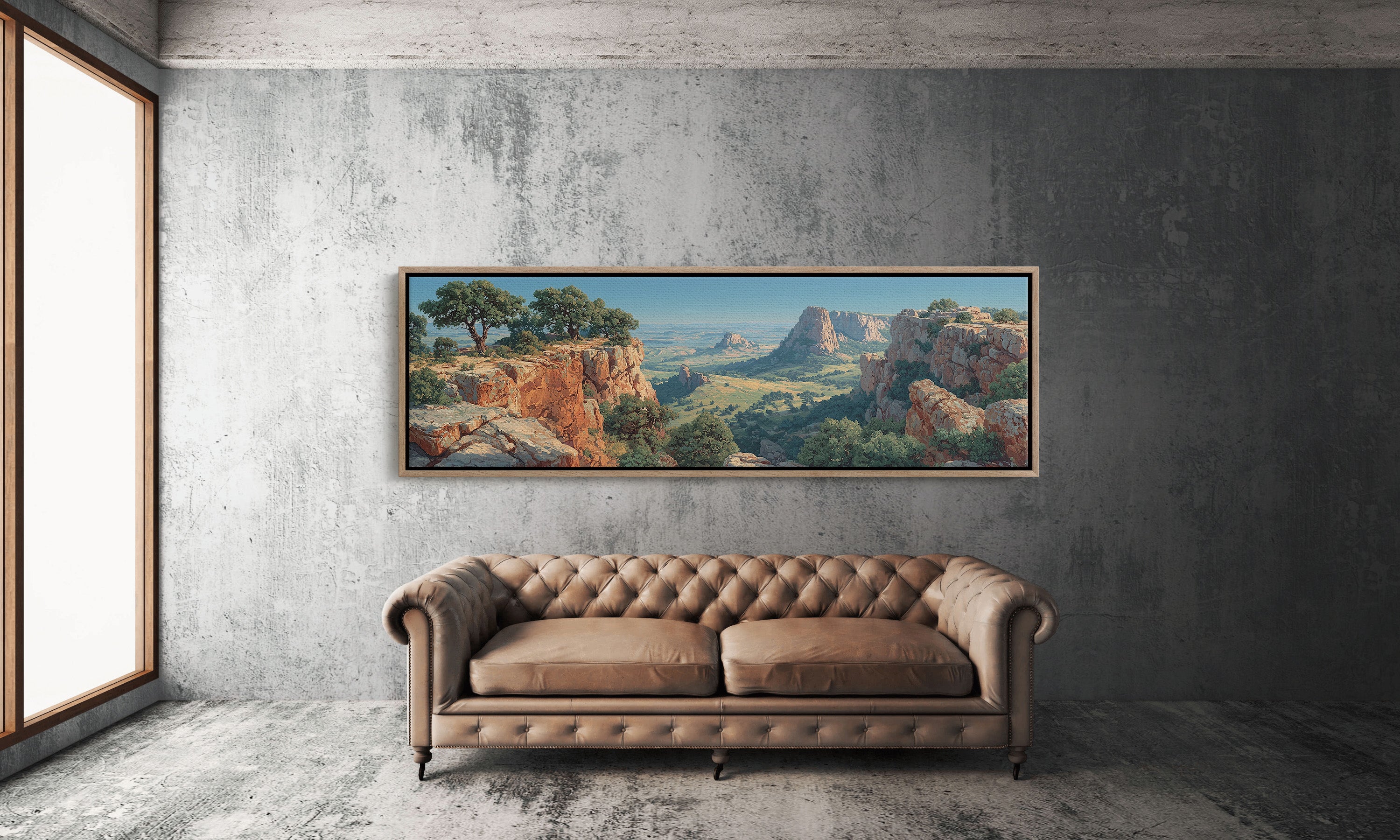 Your artwork should take up 60-75% of wall space above furniture. For standard sofas, choose 24"x36" or larger. When in doubt, go slightly bigger.