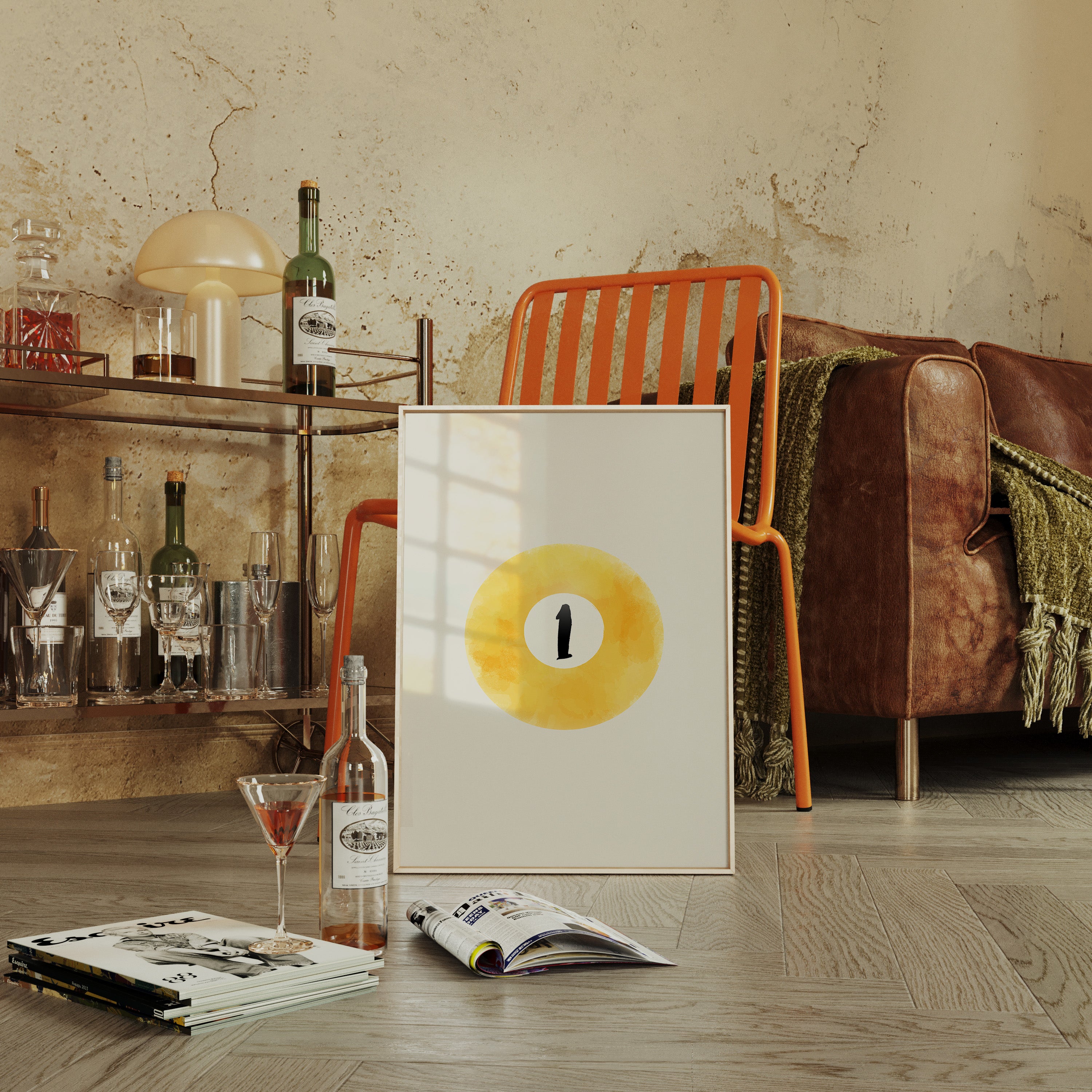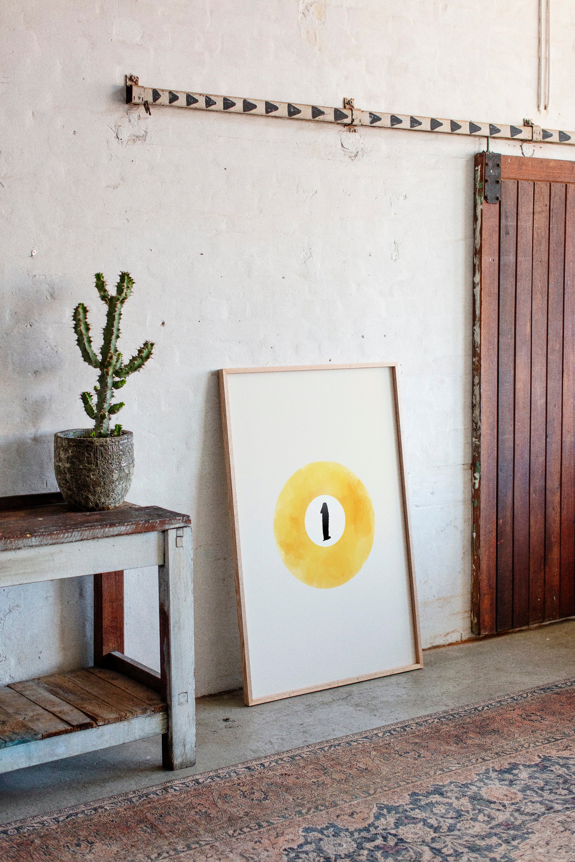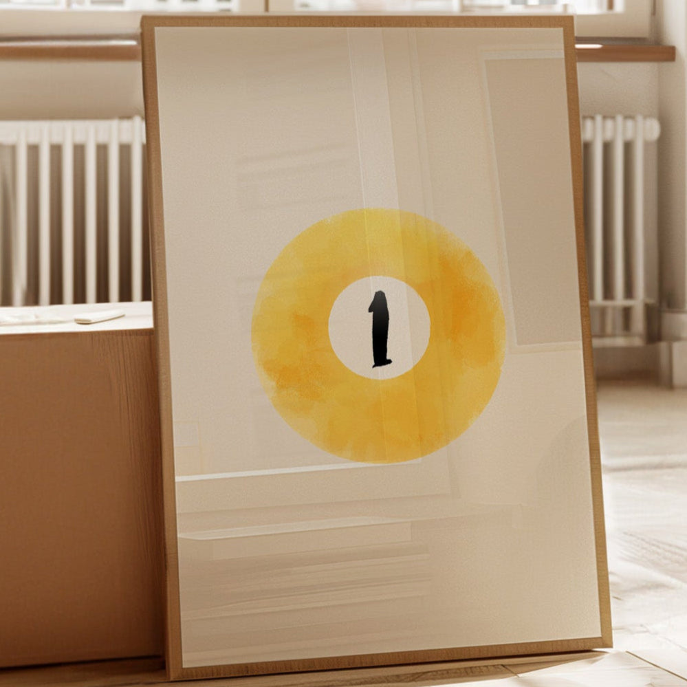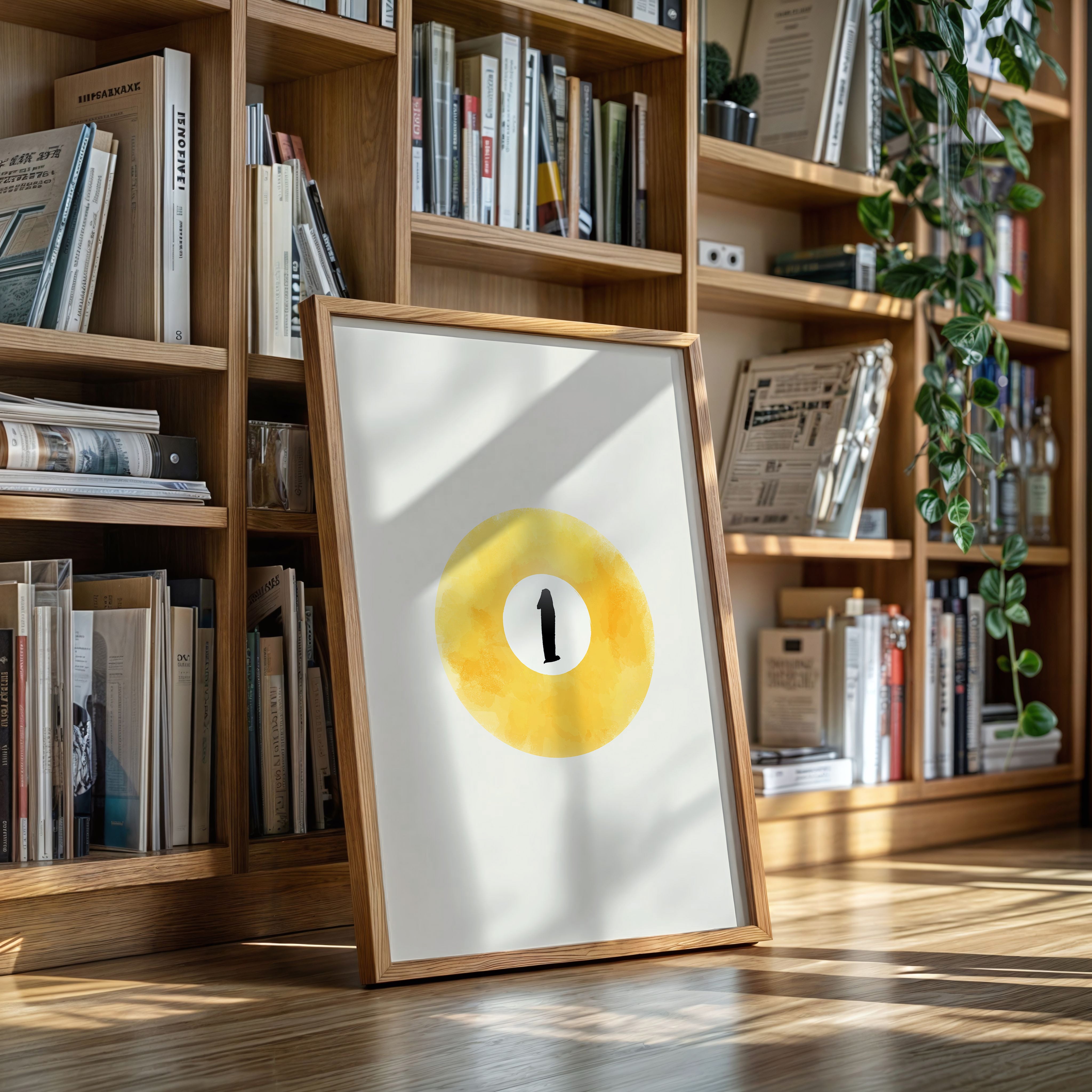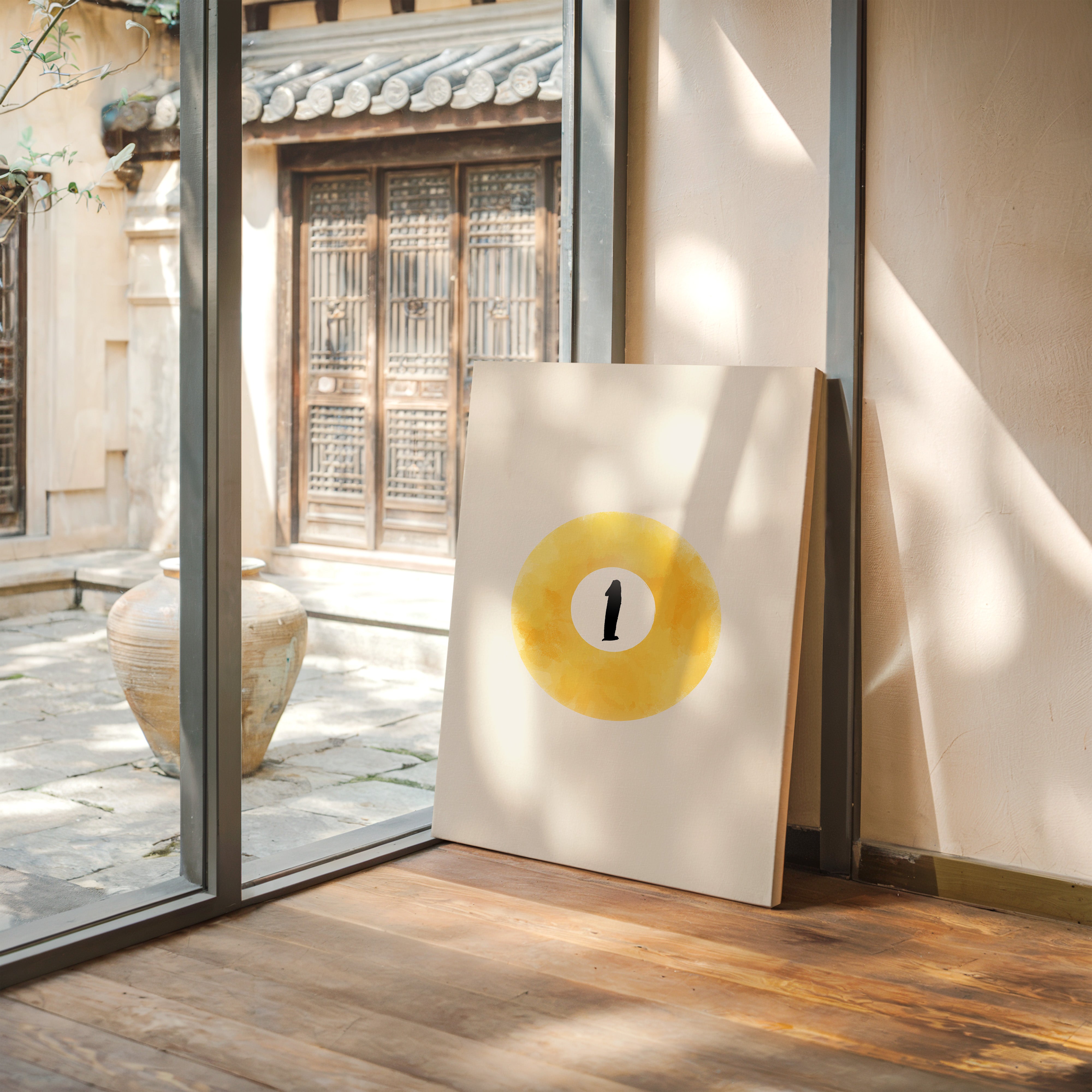 A luminous golden ring radiates warmth against pristine white space, centered by a bold numeral one that commands attention with quiet authority. This piece from our Contemporary collection celebrates the power of minimalist design through essential geometric forms. The watercolor-like texture of the yellow circle creates a soft corona effect, suggesting both solar brilliance and the gentle diffusion of morning light. The stark contrast between the pure white background and the deep black figure speaks to moments of clarity and decisive beginnings. Perfect for modern office spaces or meditation rooms where its clean lines and optimistic energy can inspire fresh starts and focused thinking.