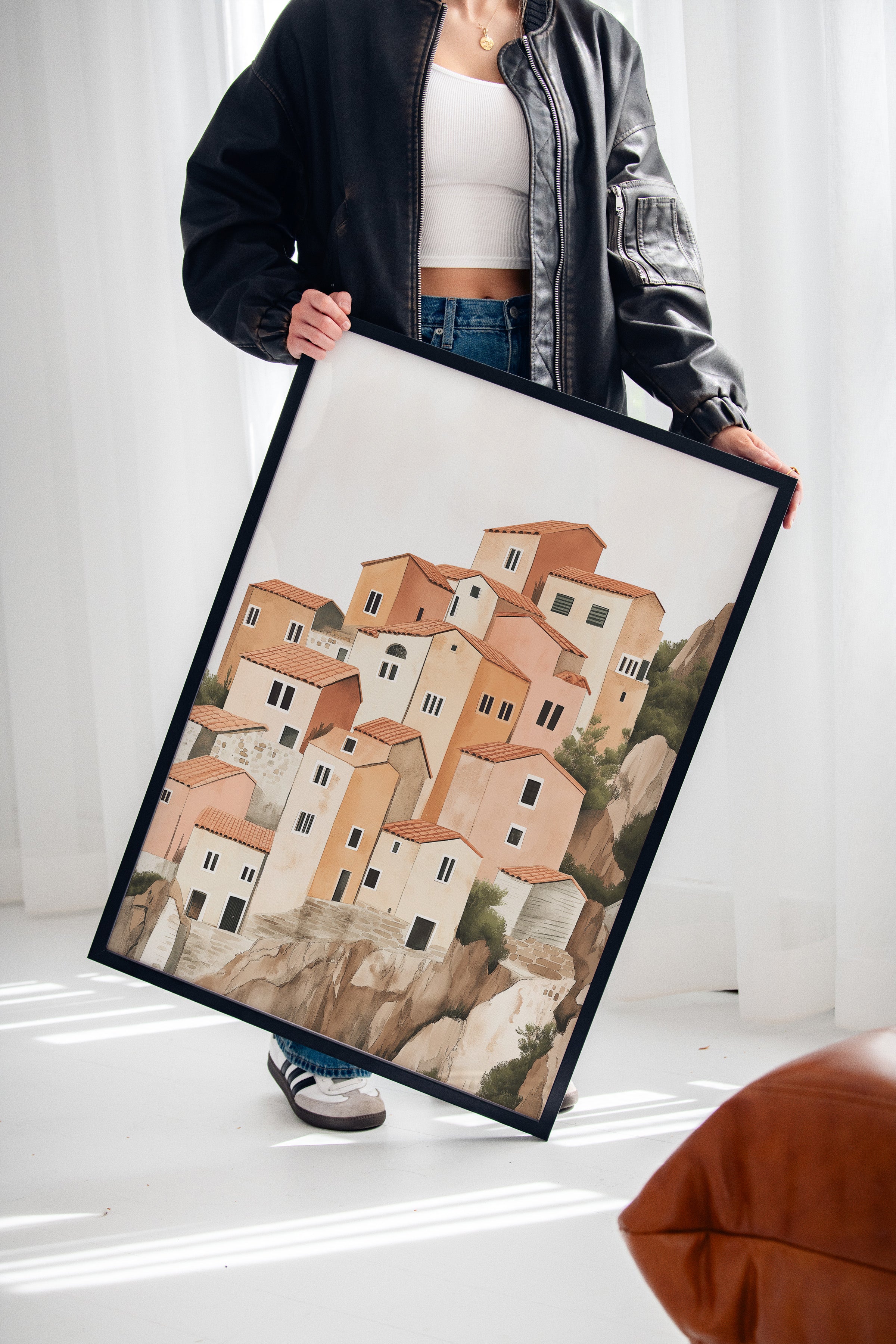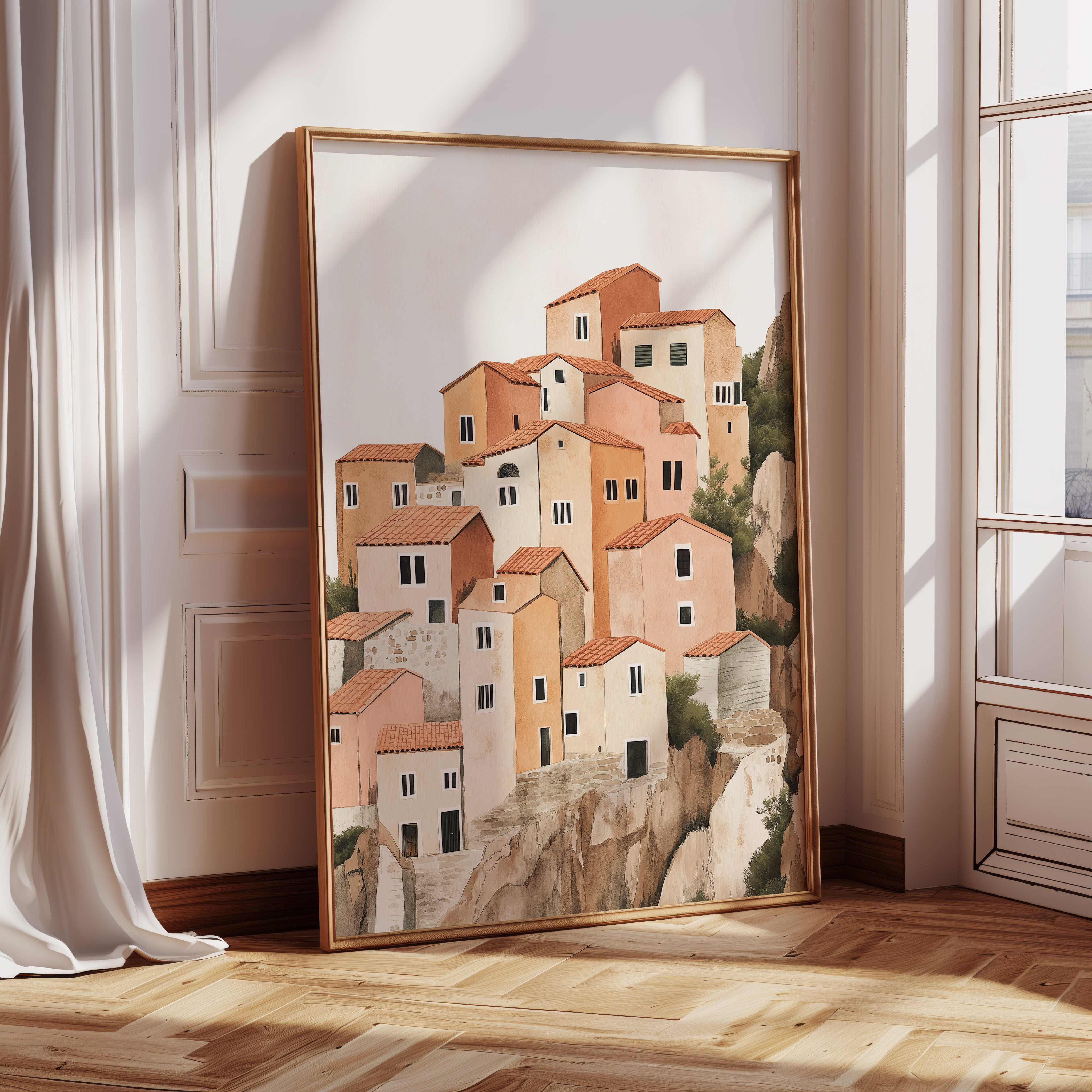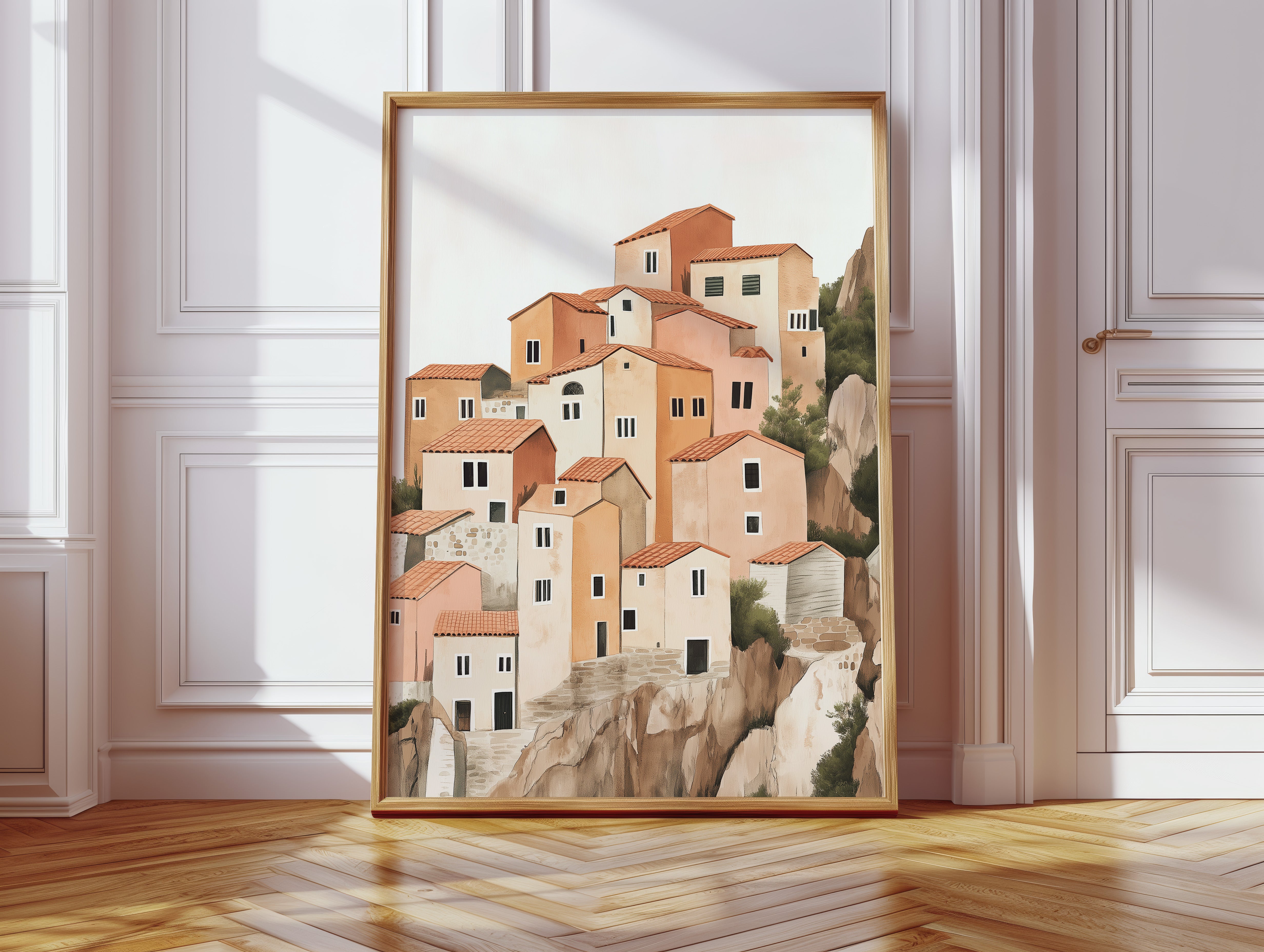 A serene cluster of terracotta-roofed homes clings to a rocky hillside, basking in soft light and gentle shadows. This Mediterranean-inspired watercolor evokes the peaceful charm of a quiet coastal village.