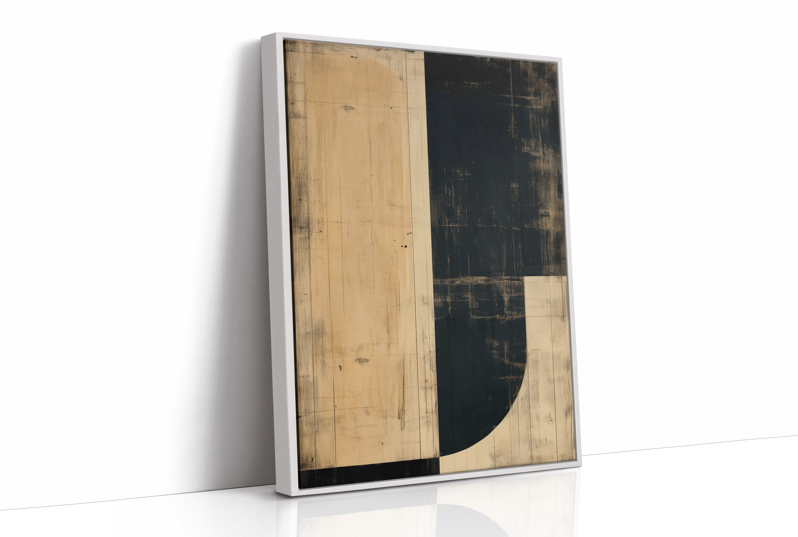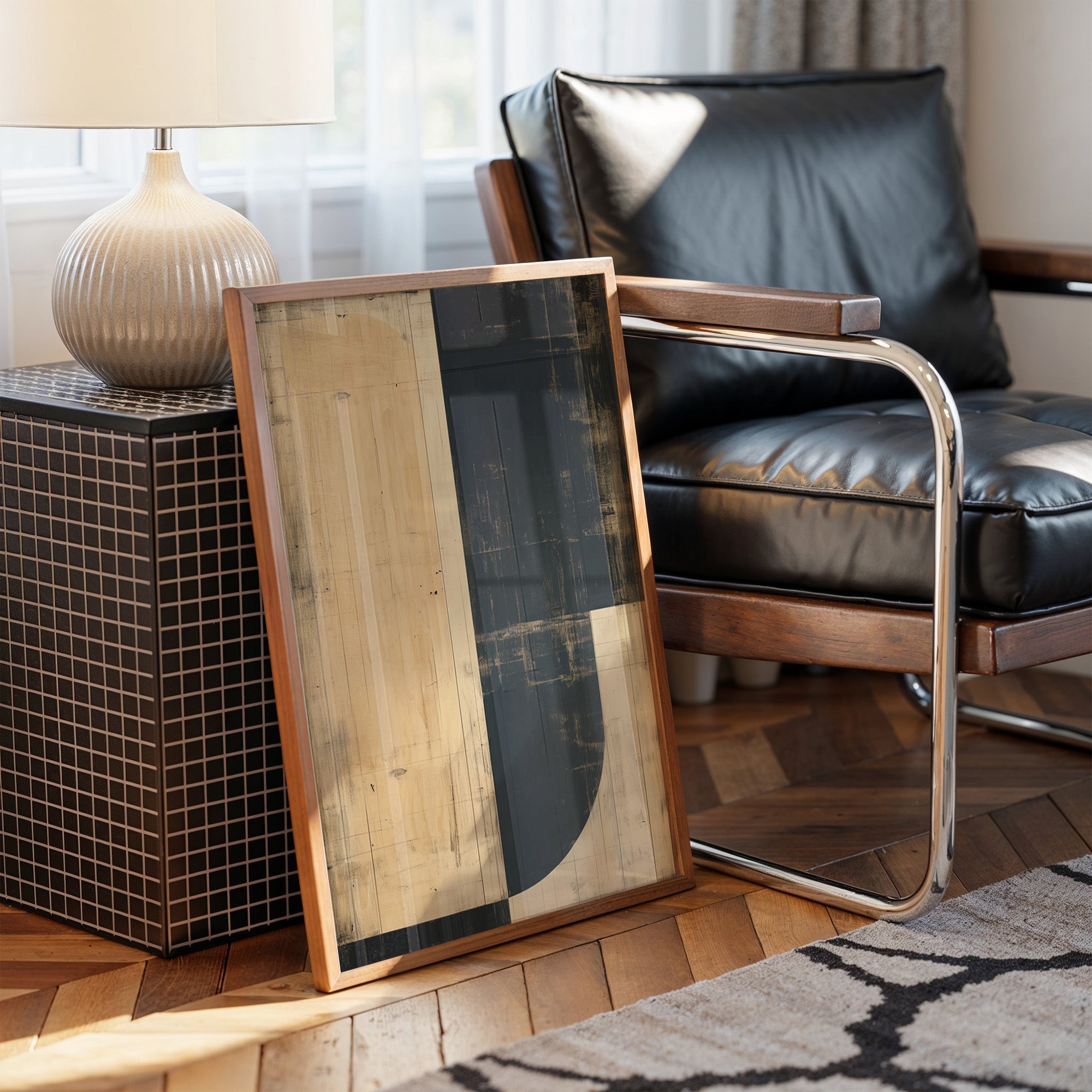 Morning light dances across a minimalist vignette, casting gentle shadows through indoor palms. A striking abstract piece in black and cream commands attention, its geometric simplicity creating perfect harmony with the natural elements surrounding it. The scene unfolds like a carefully curated story - from the dome lamp's clean lines to carefully stacked design books and the soft glow of candles, each element speaks of thoughtful modern living. This peaceful corner would elevate a home office, reading nook, or creative workspace where contemporary design meets natural comfort.