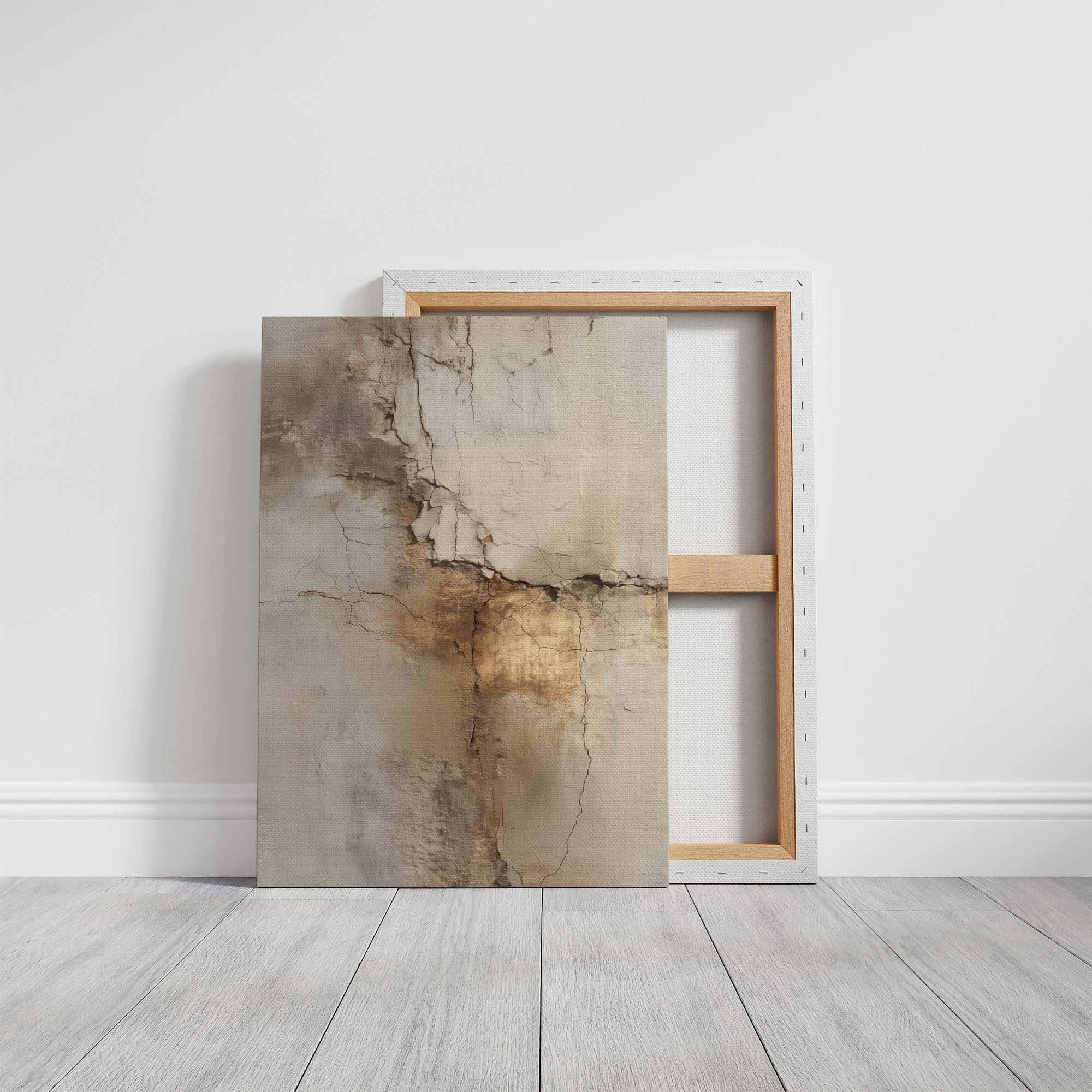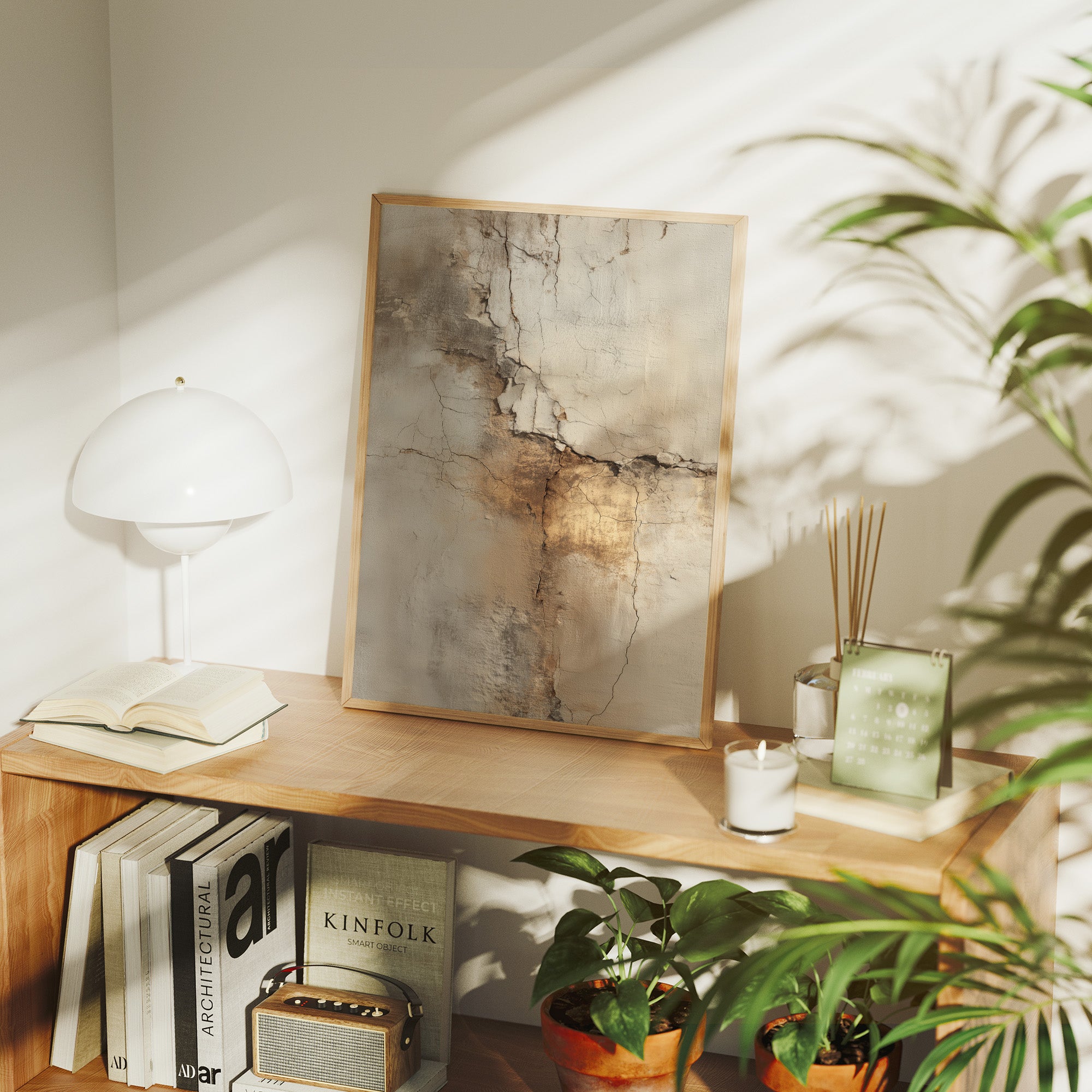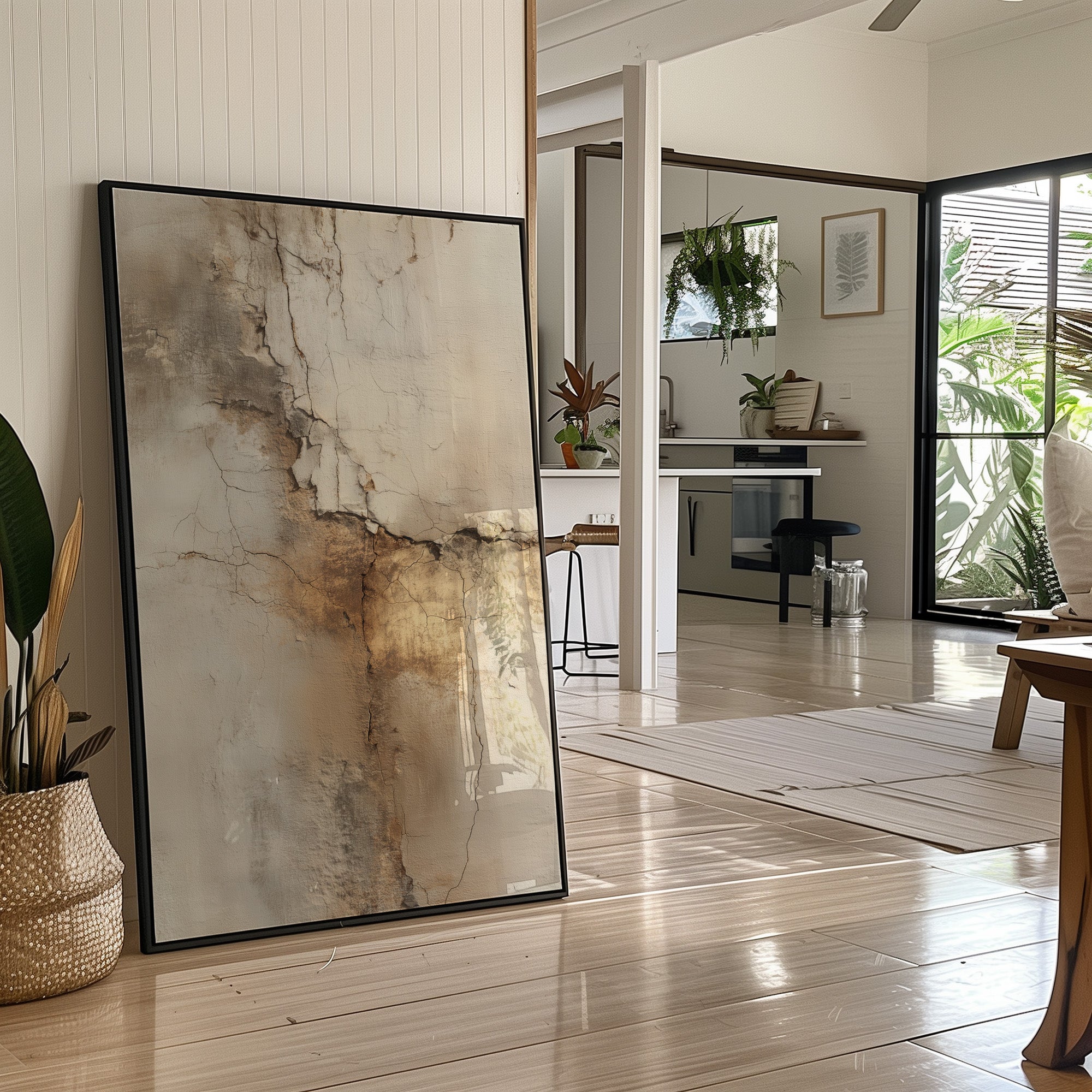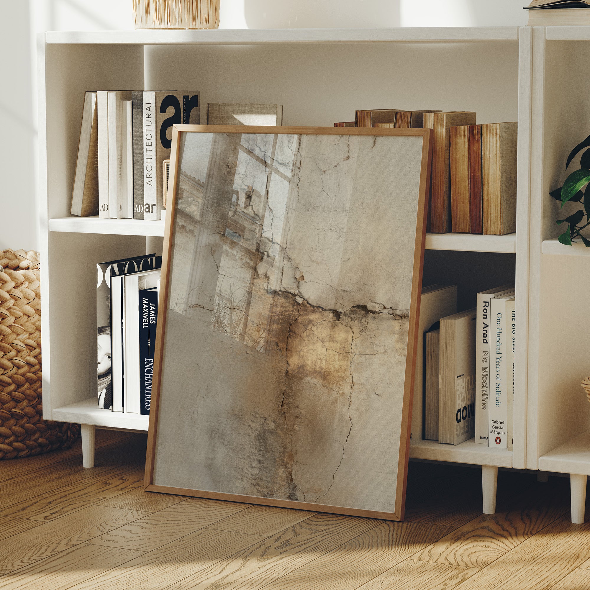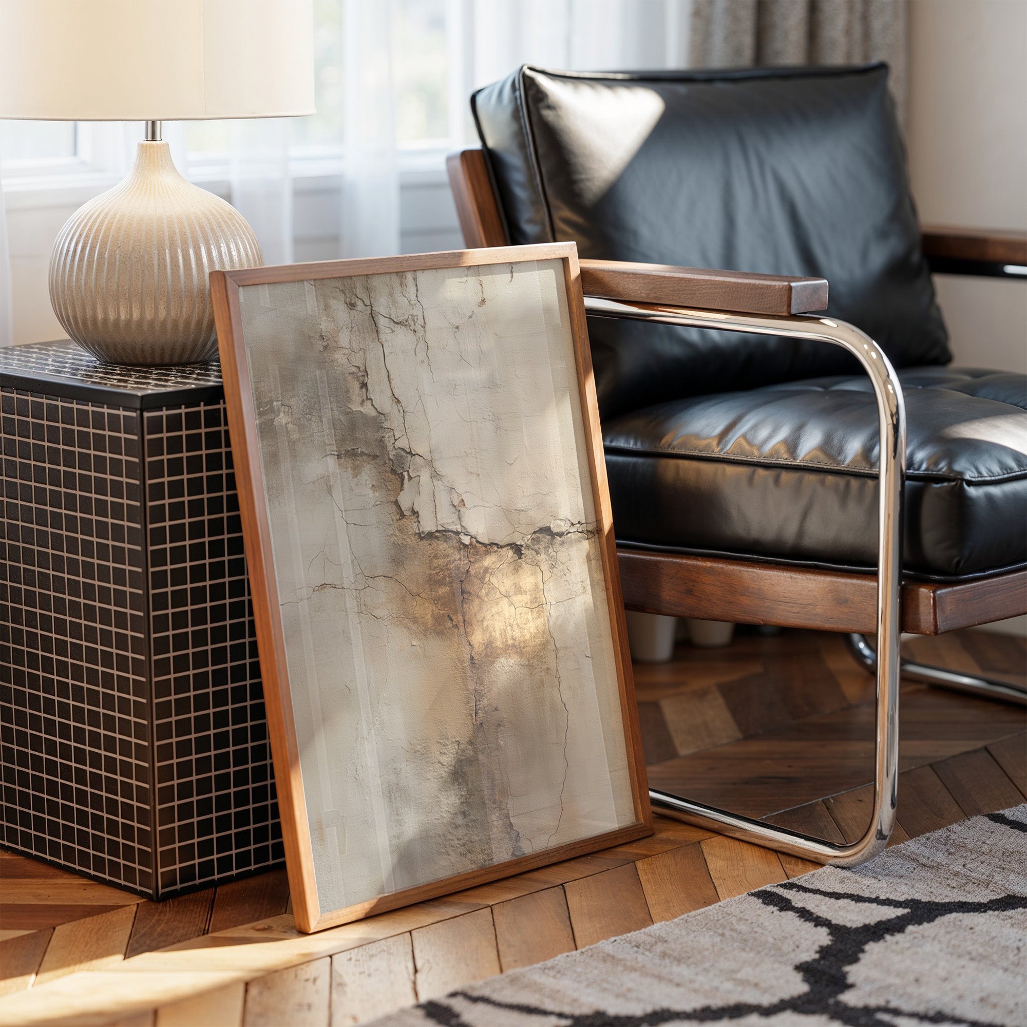 Afternoon light filters through sheer curtains, illuminating a textured abstract piece that speaks of weathered walls and time's gentle erosion. The neutral tones of cream and taupe create a compelling narrative of decay and beauty, with delicate cracks threading through like rivers on an aged map. The wooden frame perfectly complements the modern living space, where sleek leather meets industrial chrome in an elegant dance of materials. This piece would elevate any contemporary space, particularly in a sophisticated living room or study where its subtle textures can be appreciated in natural light.